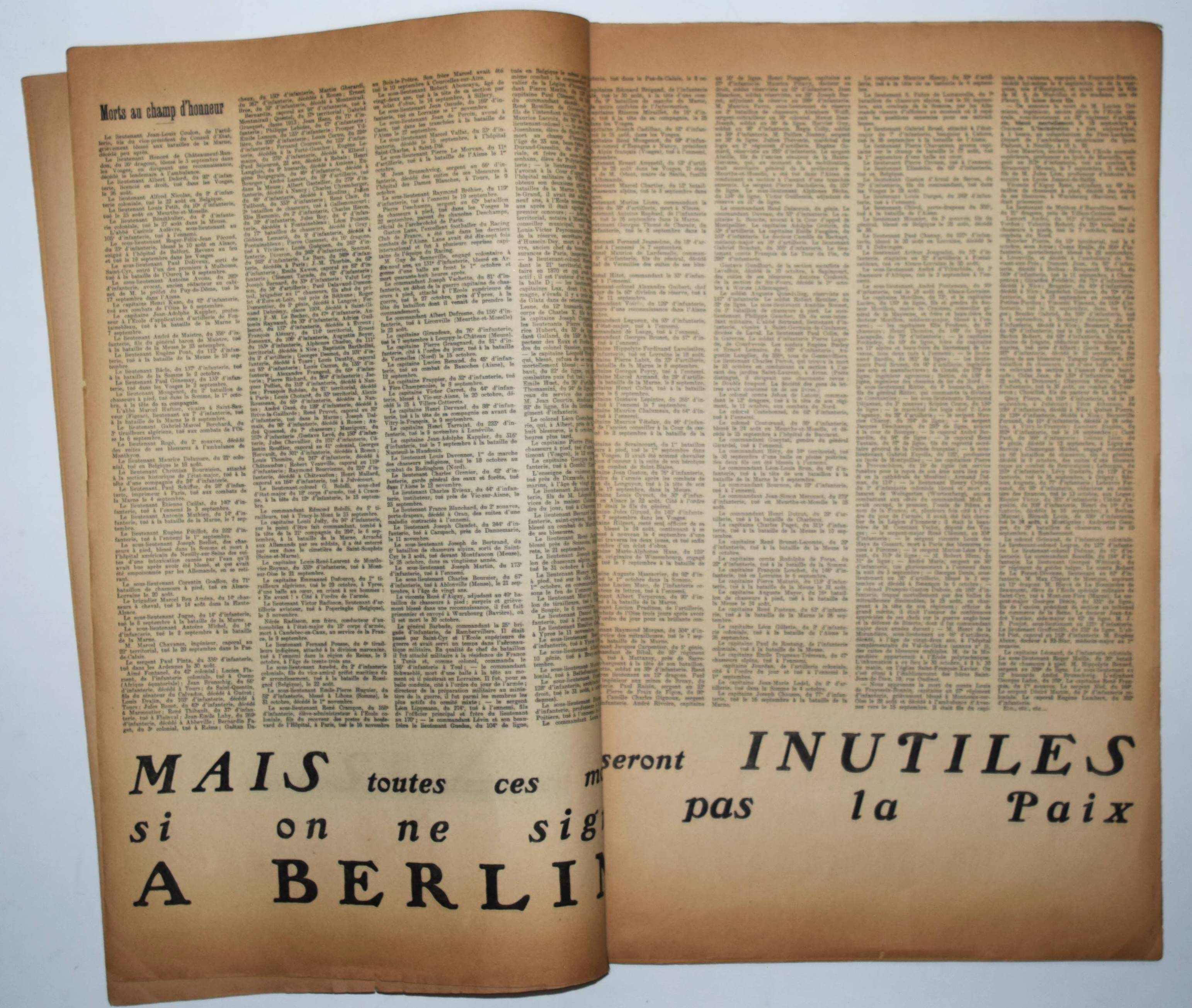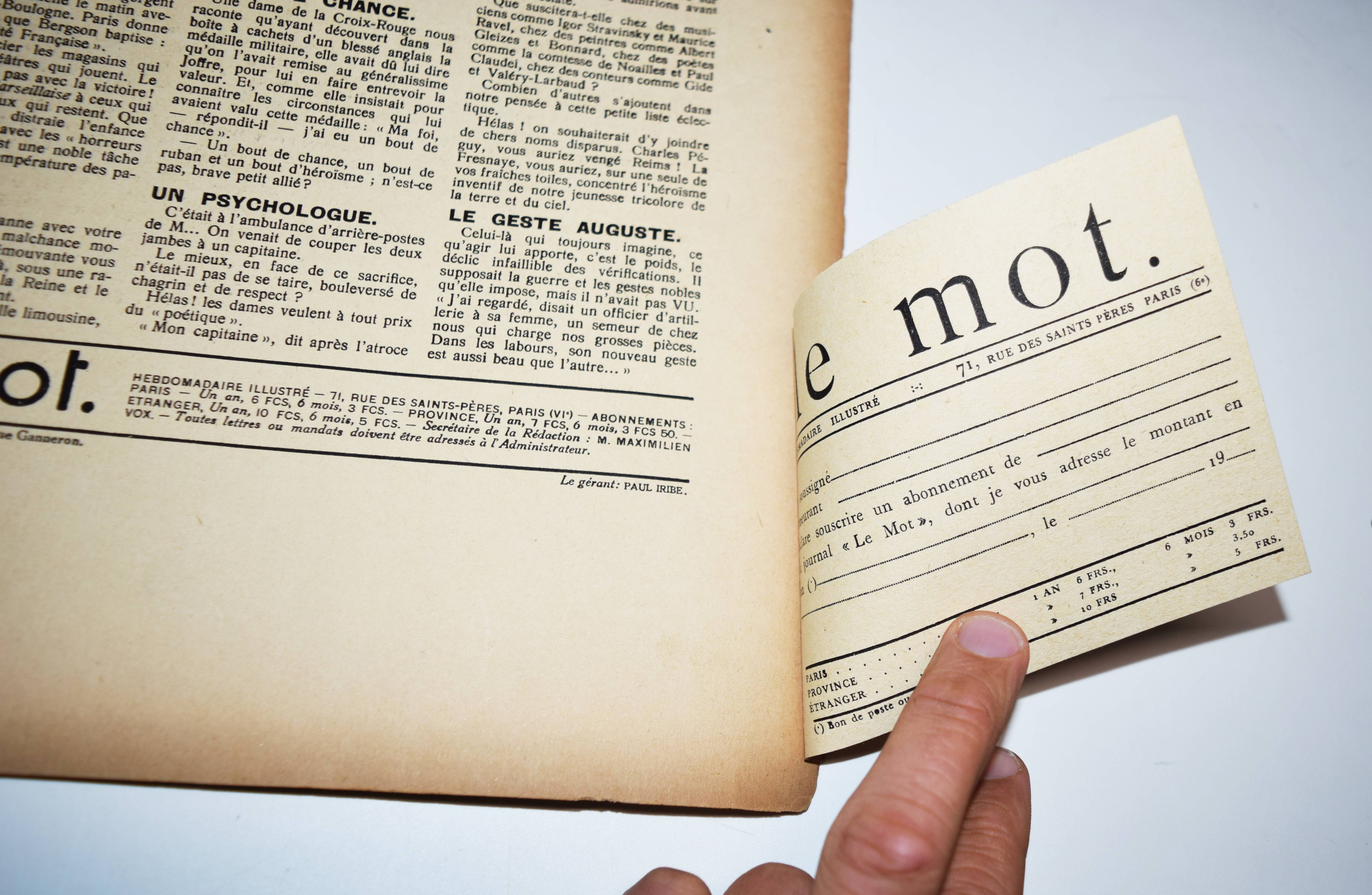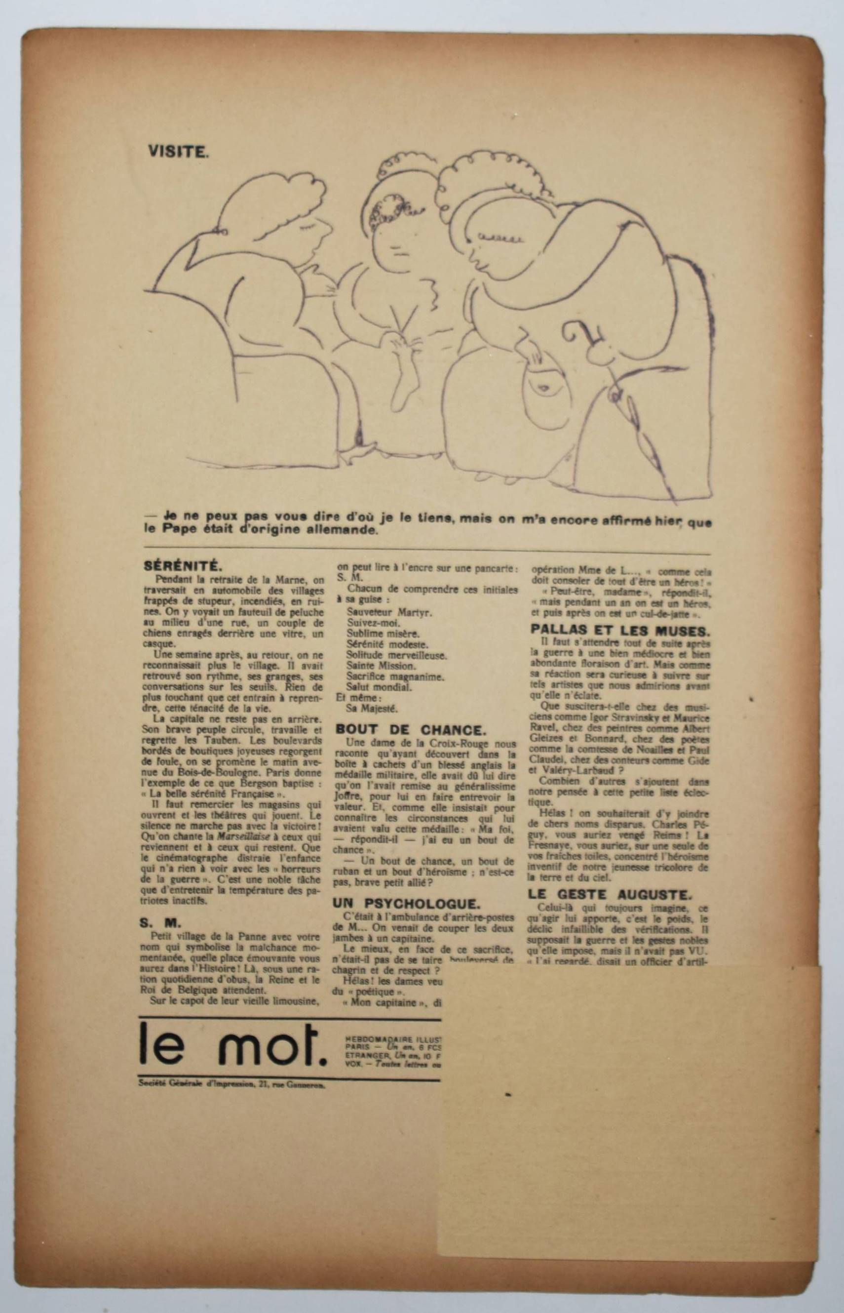 Iribe, (Paul) et (Jean) Cocteau (Ed.). Le Mot. Journal hebdomadaire illustré. Prémiere année, No. 2, Lundi 7. Dec. 1914. Paris, Corbeil, Imprimerie Crété 1914. Folio (43,5 x 28,5 cm.). 8 S. (inkl. Umschlag) mit Titel-Illustration in Rot und Schwarz (″La marche sur Paris“) von P. Iribe und 5 (1 doppelblattgr.) Illustrationen von J. Cocteau (unter dem Pseudonym Jim). Farbig illustr. Broschur-Umschlag. Wichtige französische politisch-literarische Zeitschrift. – Mit einem Gedicht „Au Kronprinz“ und anderen deutsch-kritischen Texten von J. Cocteau, die Illustrationen sind teils mit seinem Pseudonym „JIM“ (der Name seines Hundes) signiert. Die zuerst wöchentlich erschienenen Hefte der Propaganda-Zeitschrift wurden teils an Soldaten gratis abgegeben. – Rücken mit Papierstreifen überklebt, im Blattrand angestaubt und papierbedingt gebräunt.