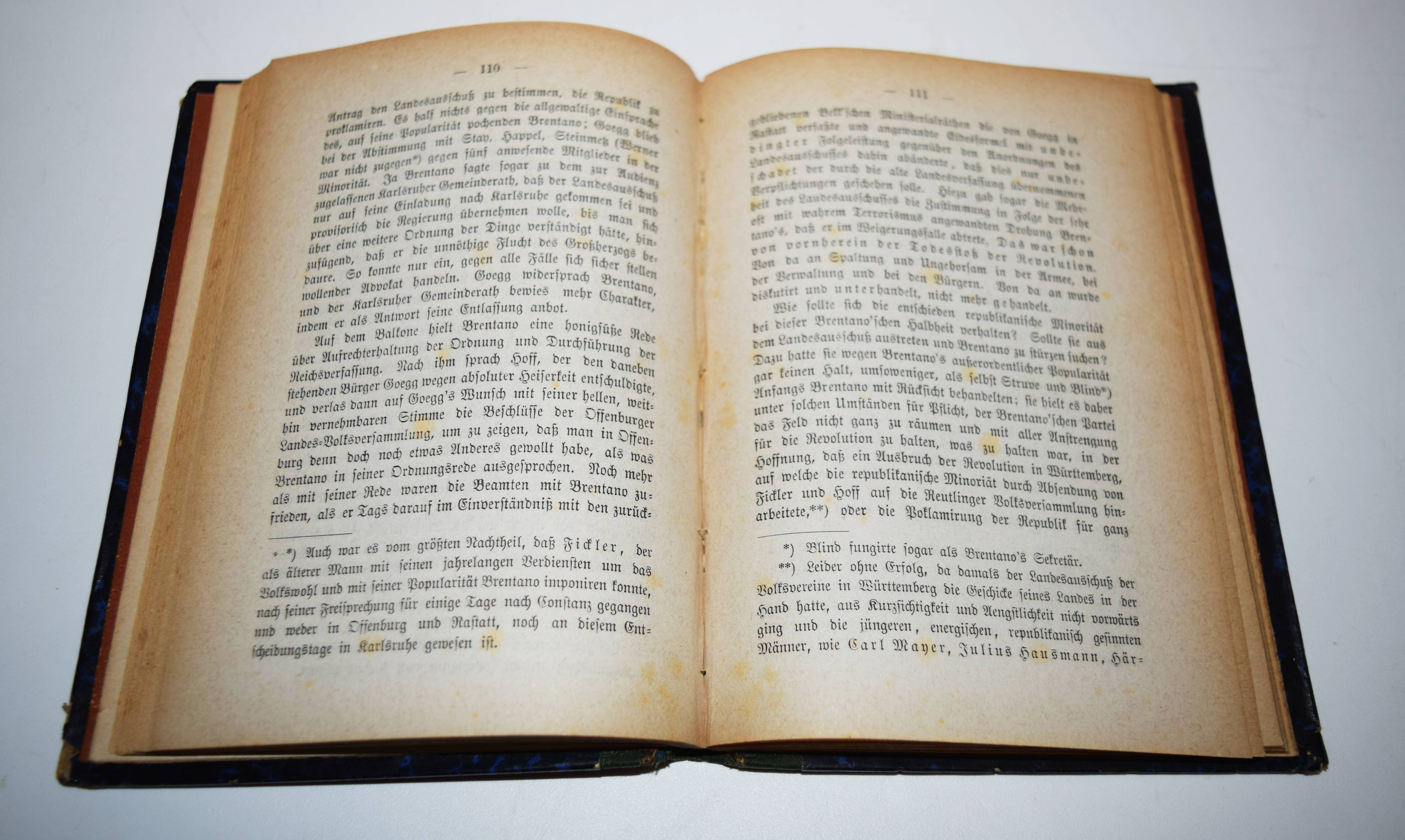 (Goegg, Amand). Nachträgliche authentische Aufschlüsse über die Badische Revolution von 1849, deren Entstehung, politischen und militärischen Verlauf. Nebst einem Nachtrag und als Einleitung eine gedrängte Darstellung der politischen Vorgänge in Baden von 1818 an, unter Hinweisung auf die Hauptereignisse in den übrigen Theilen Deutschlands. Zürich, Verlags-Magazin 1876. Kl.-8°. 192 S. Halbleinenband um 1900 mit handschr. Rückenschild. Kärcher 7154. Lautenschlager 8225. – Einzige Ausgabe, selten. – Der Freiheitskämpfer, Mitglied des badischen Exekutionsausschusses 1848, Politiker und Kaufmann A. Goegg (1820-1897) war „nach dem Stud. der Kameralwissenschaften Beamter des Grossherzogtums Baden. 1848-49 Teilnehmer der Revolution, zuletzt Finanzminister und Mitglied der provisor. Regierung. Nach der Niederlage Flucht in die Schweiz (Zürich und Genf), 1849 und nochmals 1854 ausgewiesen. Bis 1856 in Paris, London und den USA, Beteiligung an Revolutionsprojekten der Emigration. 1856 Gründung einer Spiegelfabrik in Genf. Nach der Amnestie 1862 Leiter einer Glasfabrik in Offenburg (Baden). Ab 1866 wieder in Genf als Leiter einer Londoner Firma, zugleich aktiv im dt. Arbeiterbildungsverein Genf und in der sog. Zentralisation, der Dachorganisation der dt. Arbeitervereine (1869 Mitglied des Zentralkomitees, Mitredaktor des „Felleisens“). 1868 Mitorganisator des Genfer Bauarbeiterstreiks. 1867 Mitbegründer der Internat. Liga für Frieden und Freiheit, Mitglied des Zentralkomitees. Zwischen 1872 und 1882 ausgedehnte Vortrags- und Studienreisen in Nord- und Südamerika sowie in Australien. Ab 1883 in Renchen“ (M. Bürgi in HLS). – Siehe auch ausführlich bei C. F. Lautenschlager, „Amand Goegg, ein badischer Achtundvierziger“, in Zeitschrift für Geschichte des Oberrheins, Band 96, 1948, S. 19 ff. – N.a.V., stellenweise leicht braunfleckig, gutes Exemplar.