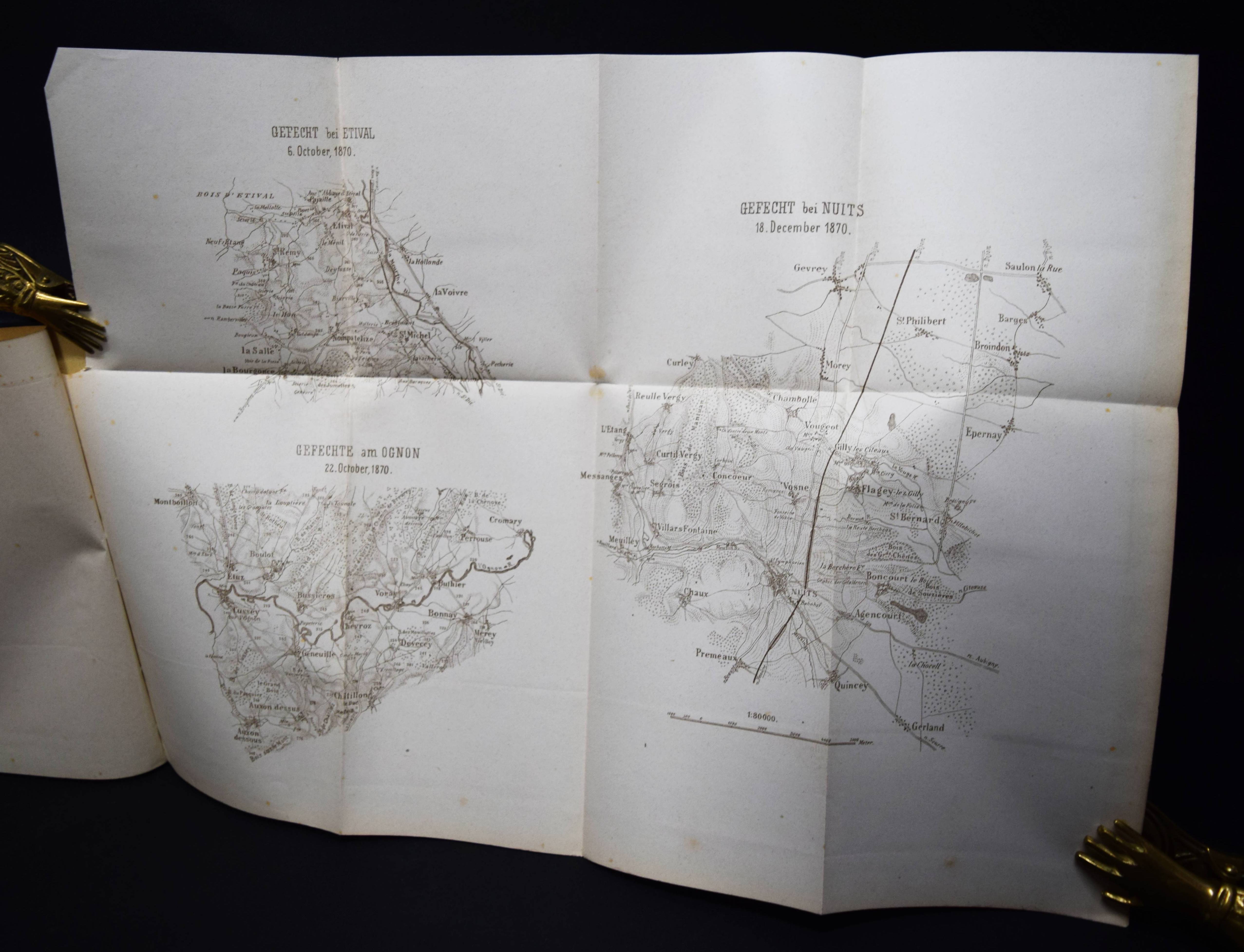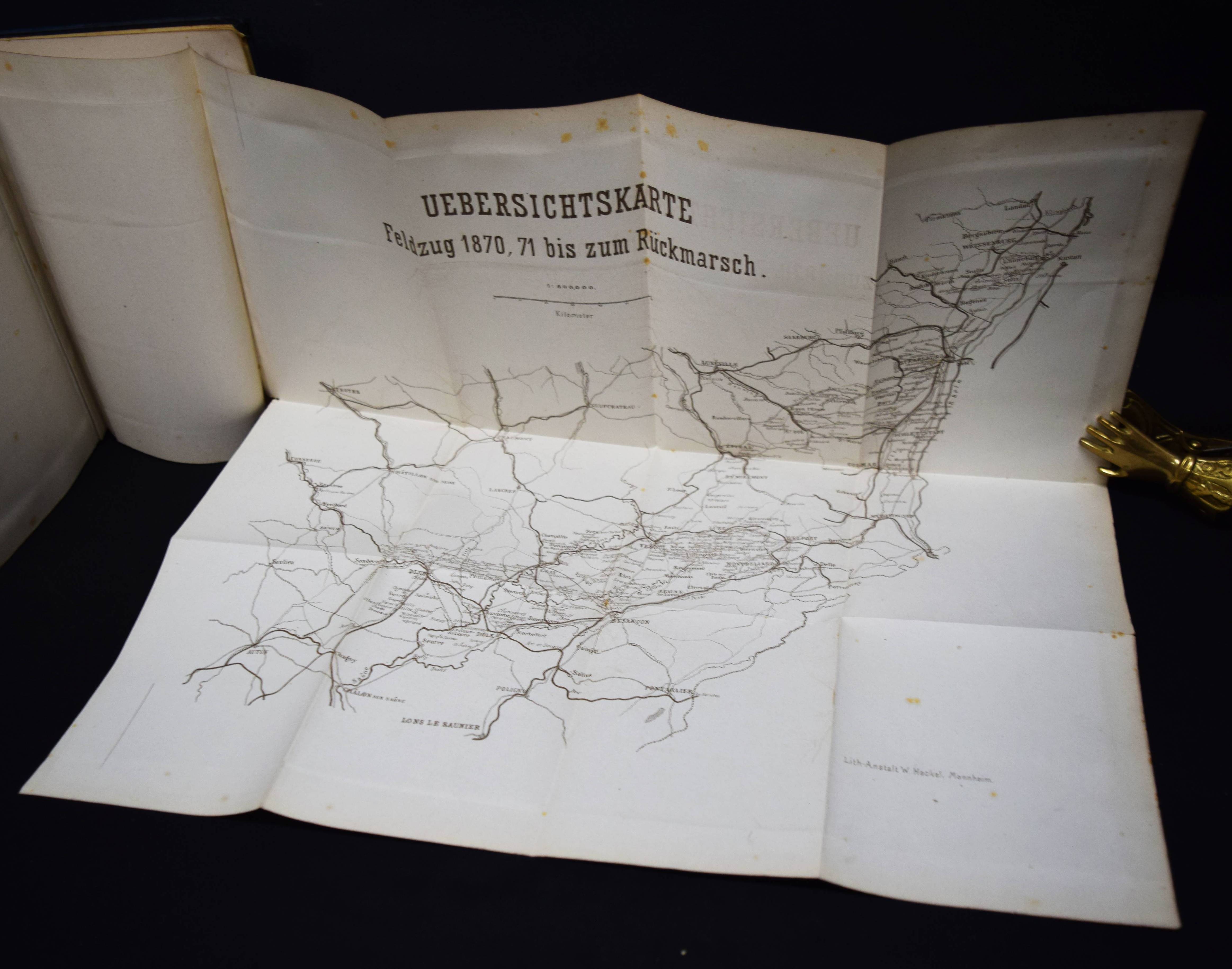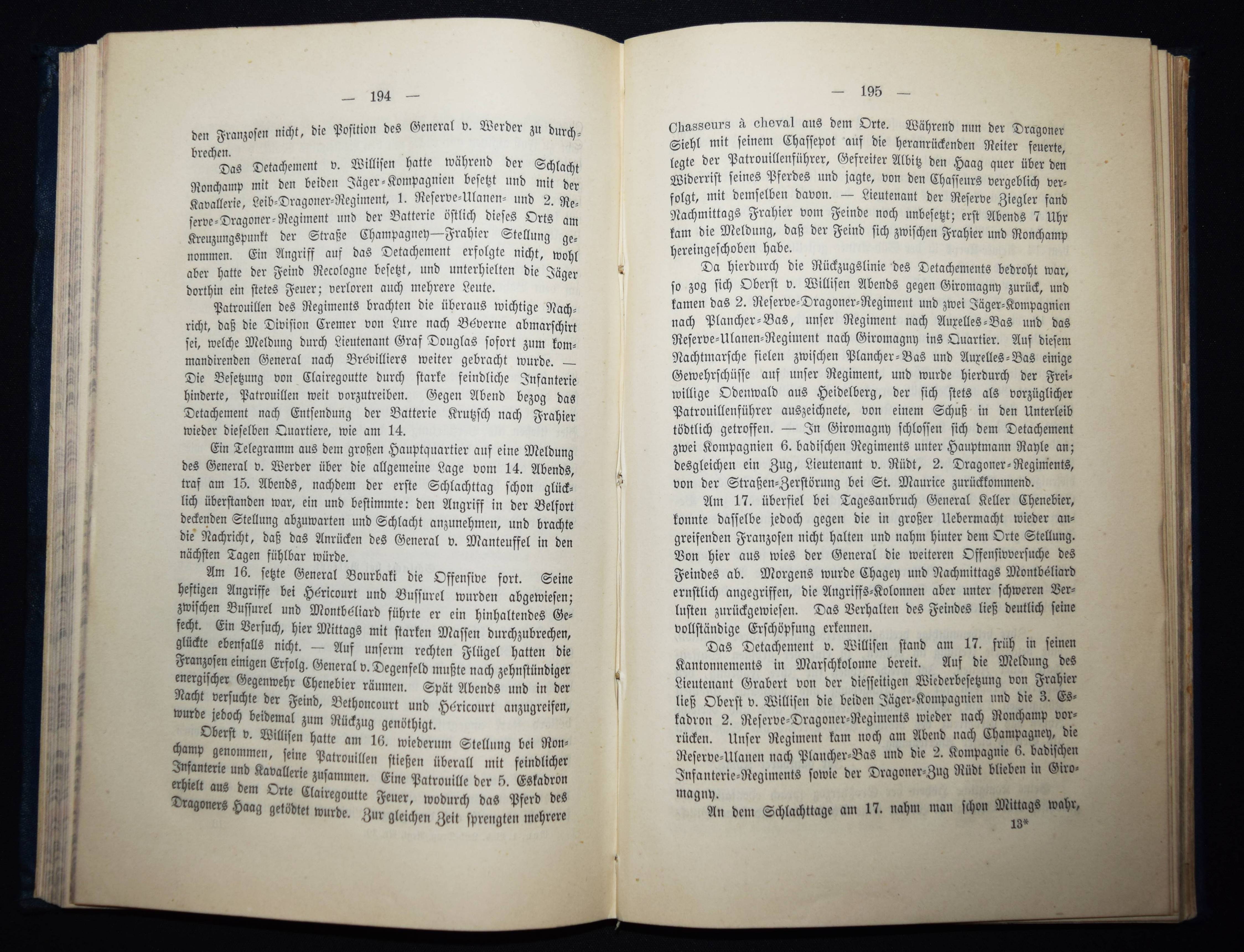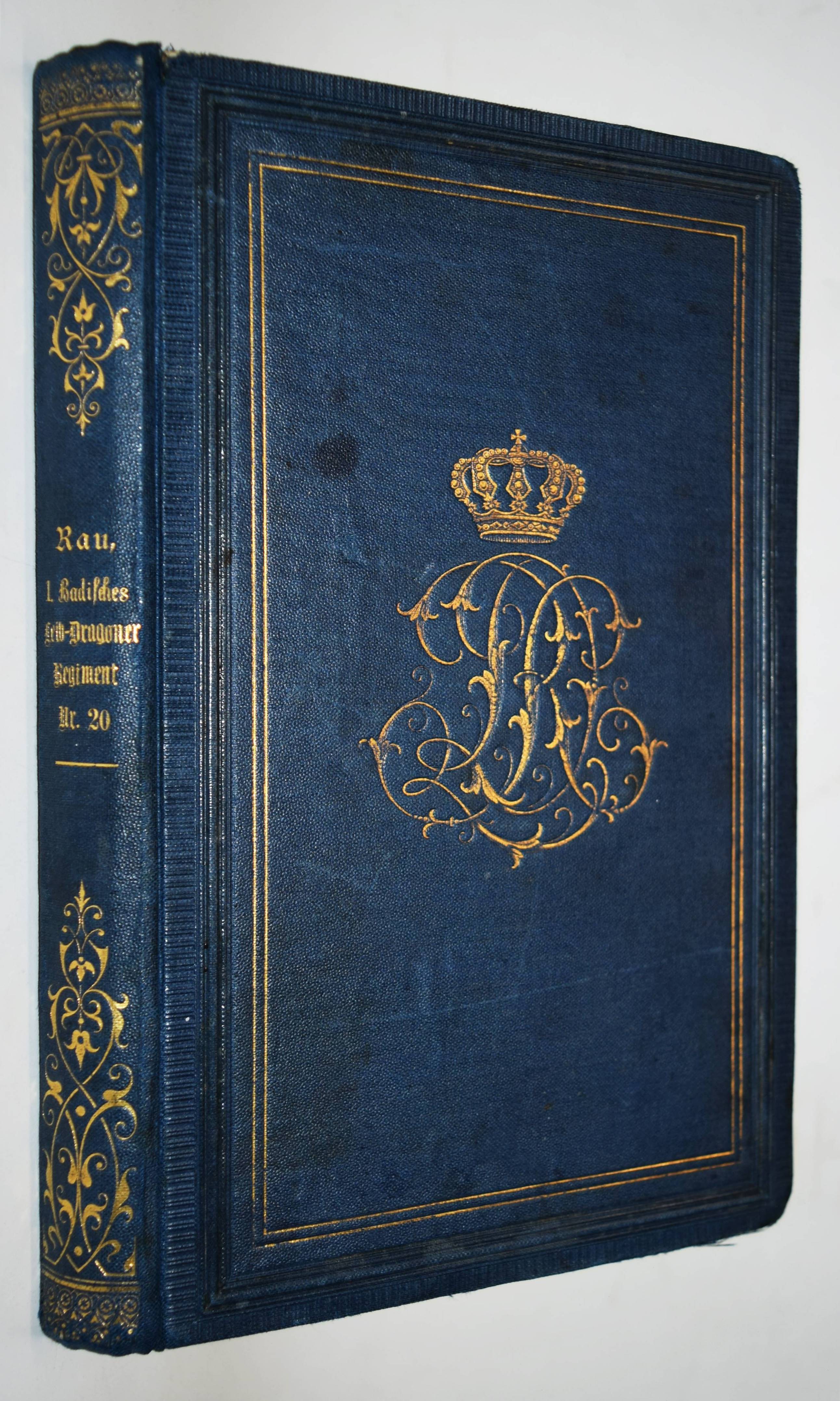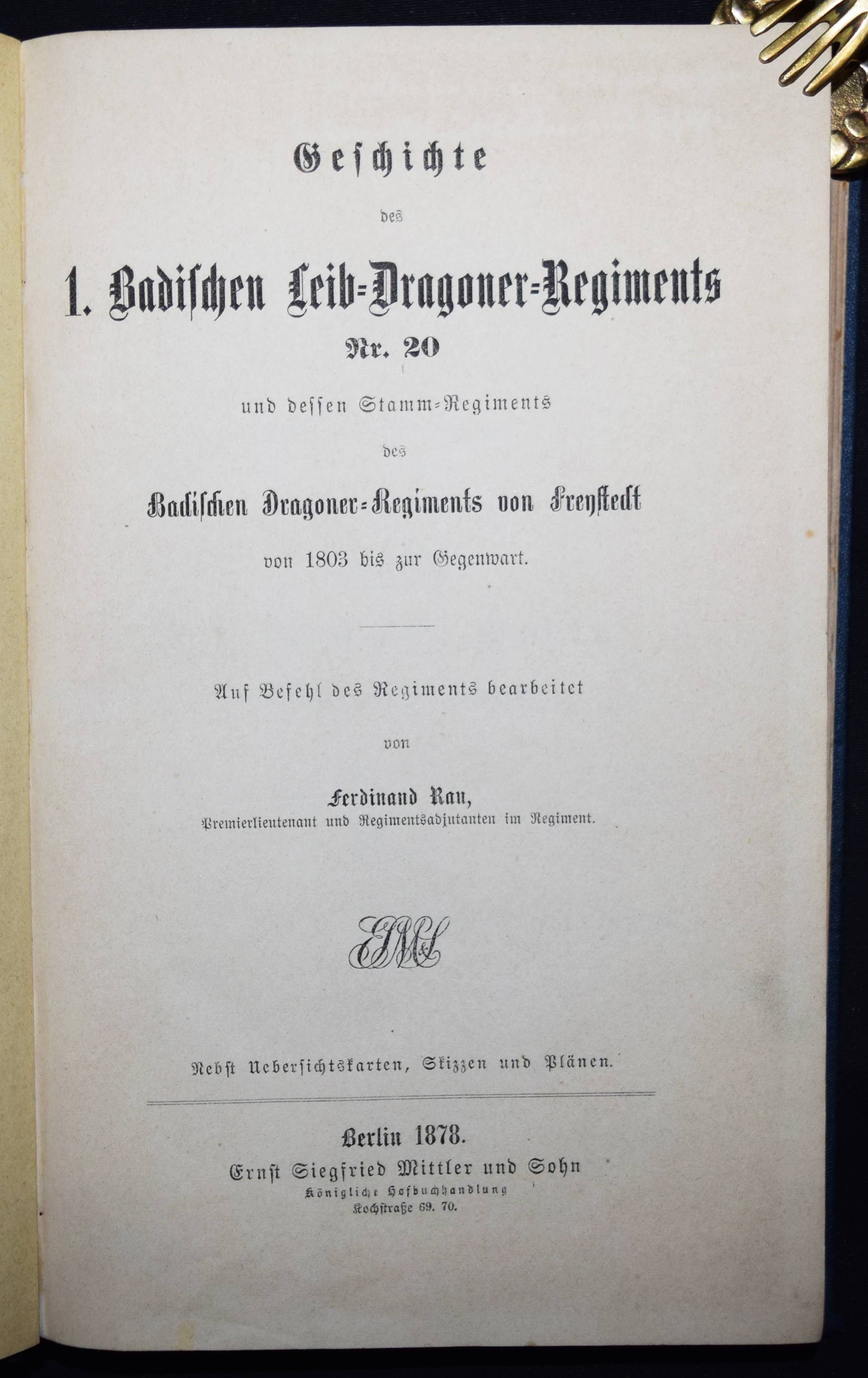 Rau, Ferdinand. Geschichte des 1. Badischen Leib-Dragoner-Regiments Nr. 20 und dessen Stamm-Regiments des Badischen Dragoner-Regiments von Freystedt von 1803 bis zur Gegenwart. Berlin, Mittler und Sohn 1878. 8°. [4] Bl., 297, (1) S. mit 4 gefalt. lithogr. Karten. Orig.-Leinenband mit goldgepr. Rückentitel, Rückenvergoldung, Deckel-Filetten und gekröntem Deckel-Monogramm. Erste Ausgabe, selten. – „Das 1. Badische Leib-Dragoner-Regiment Nr. 20 war ein Kavallerieverband der Großherzoglich-Badischen Armee. Das 1803 aufgestellte Regiment wurde 1871 Teil des badischen Kontingents in der Preußischen Armee und mit dieser 1919 aufgelöst“ (Wikipedia). – Dabei: Orig.-Portrait-Photographie (Albumin-Abzug, 16,5 x 10,5 cm.) eines Lieutenants des Regiments aufgenommen von Hofphotograph Hubert Litt, Mannheim und Stuttgart. – Sehr gutes Exemplar im dekorativen Verlagseinband.