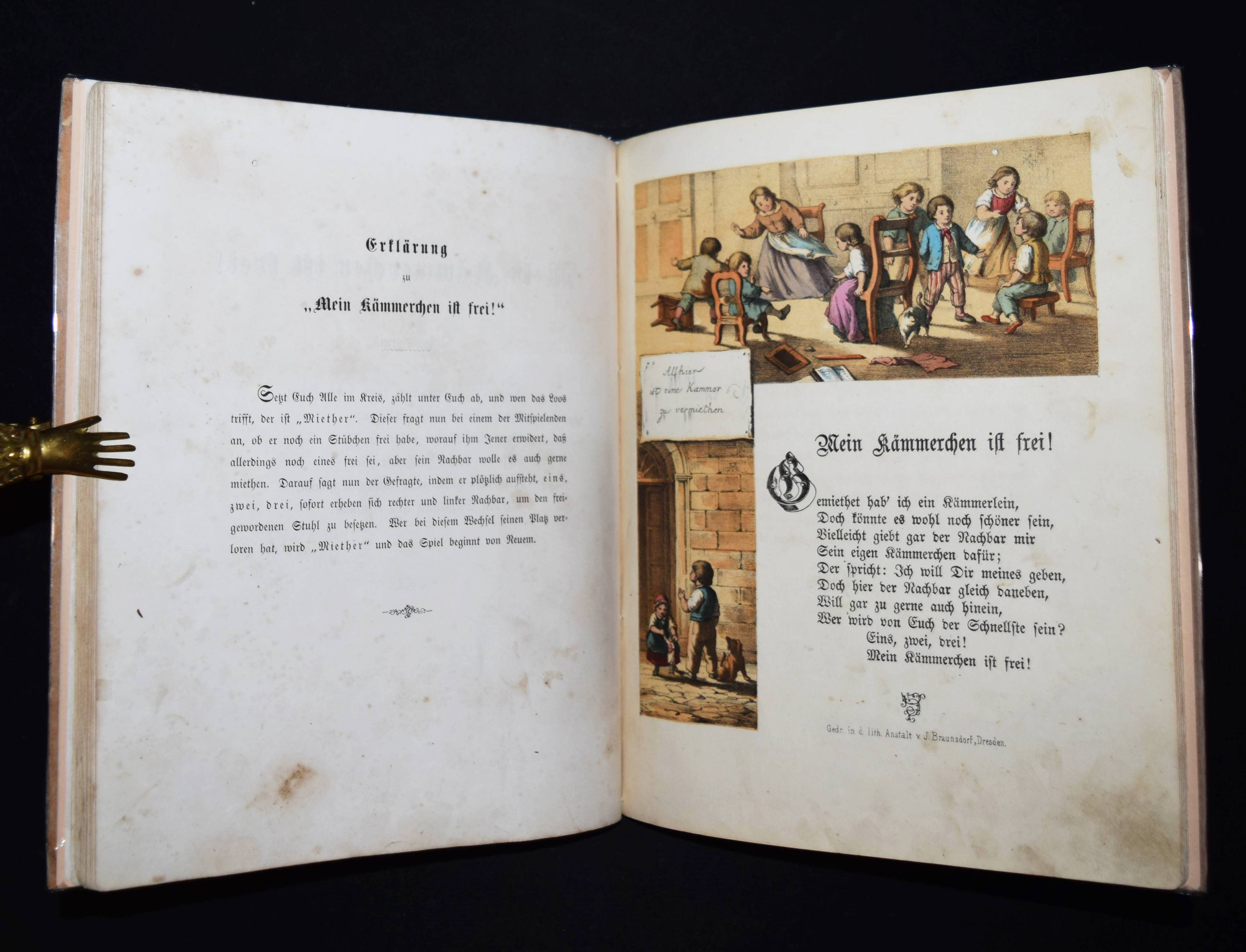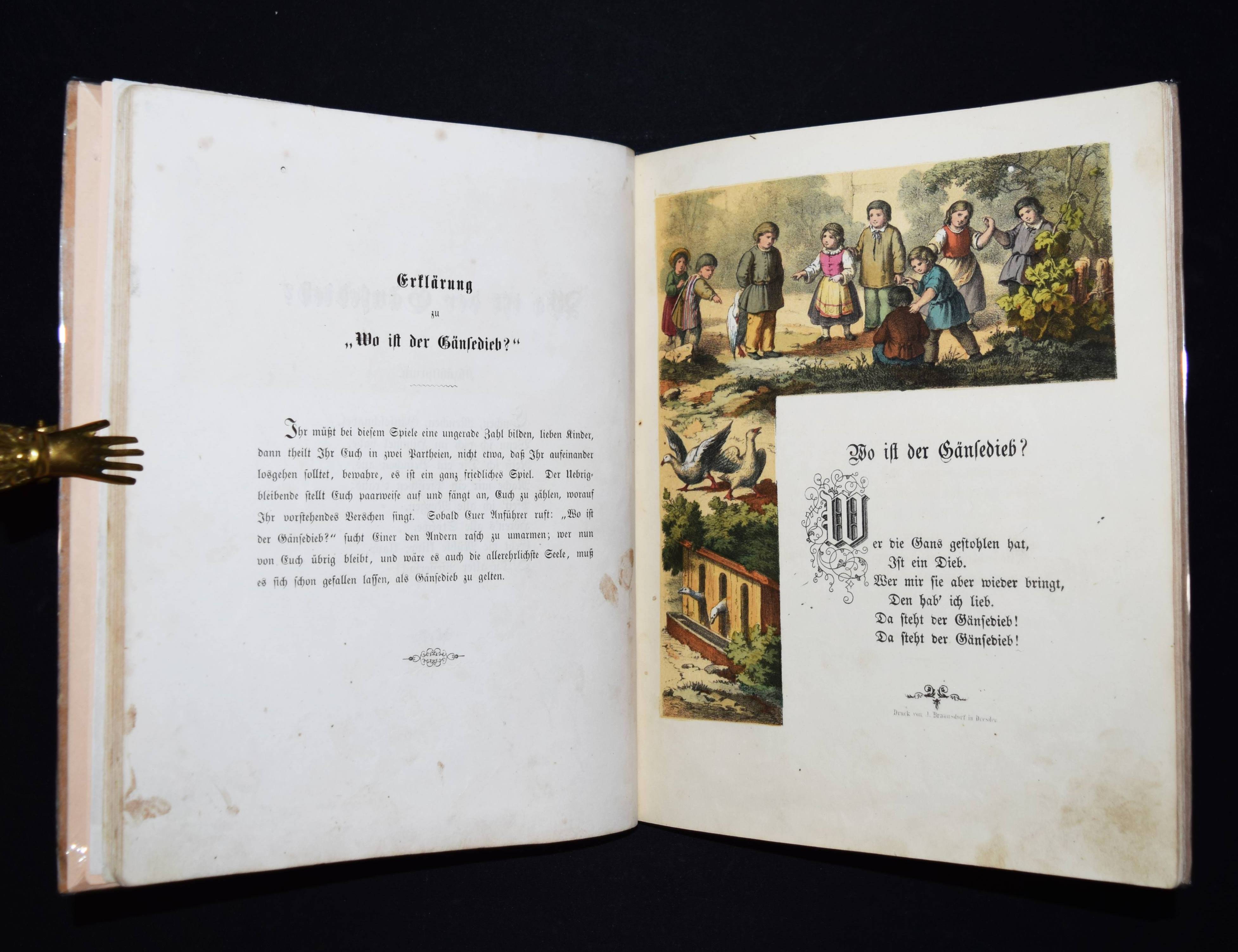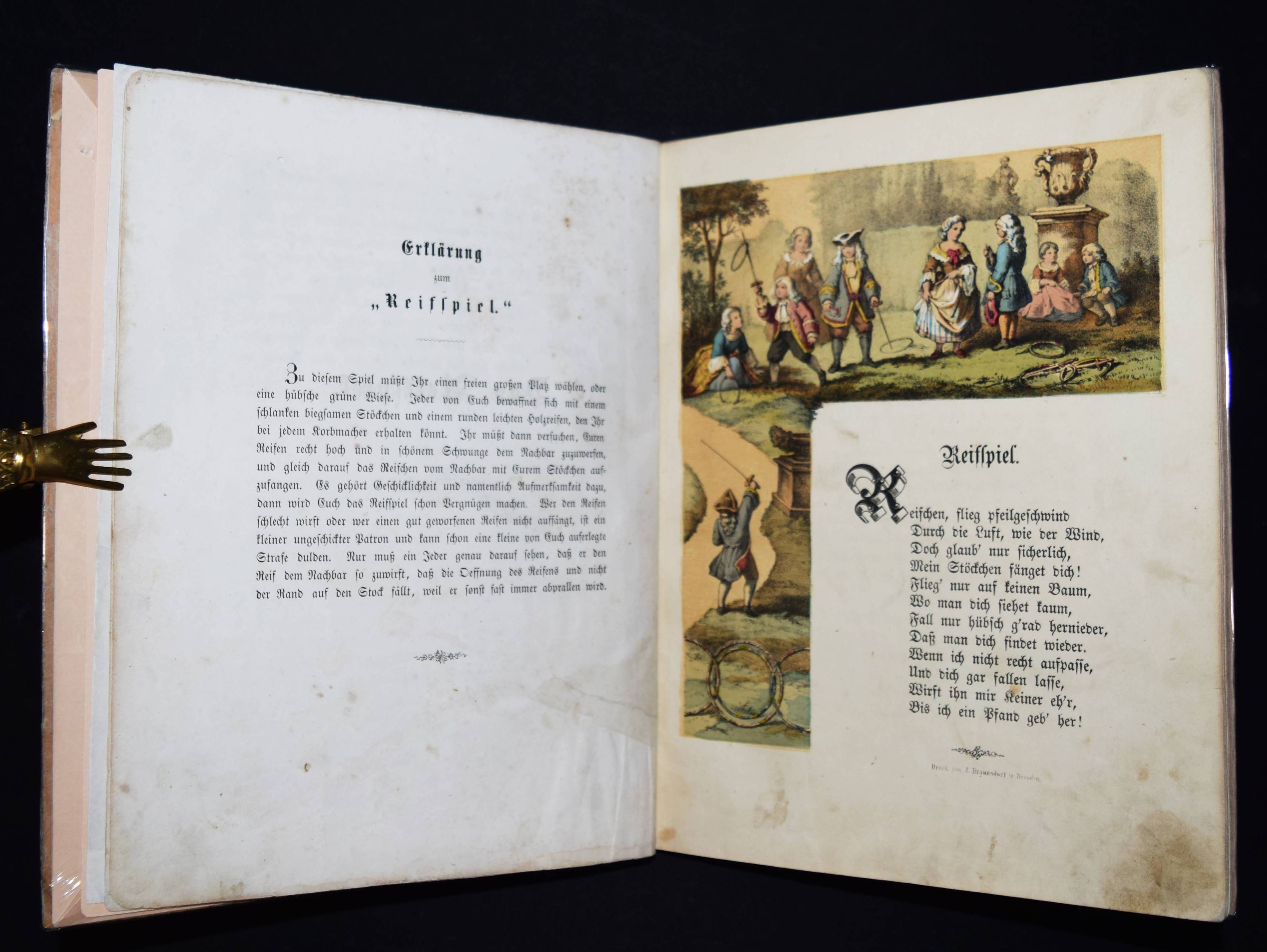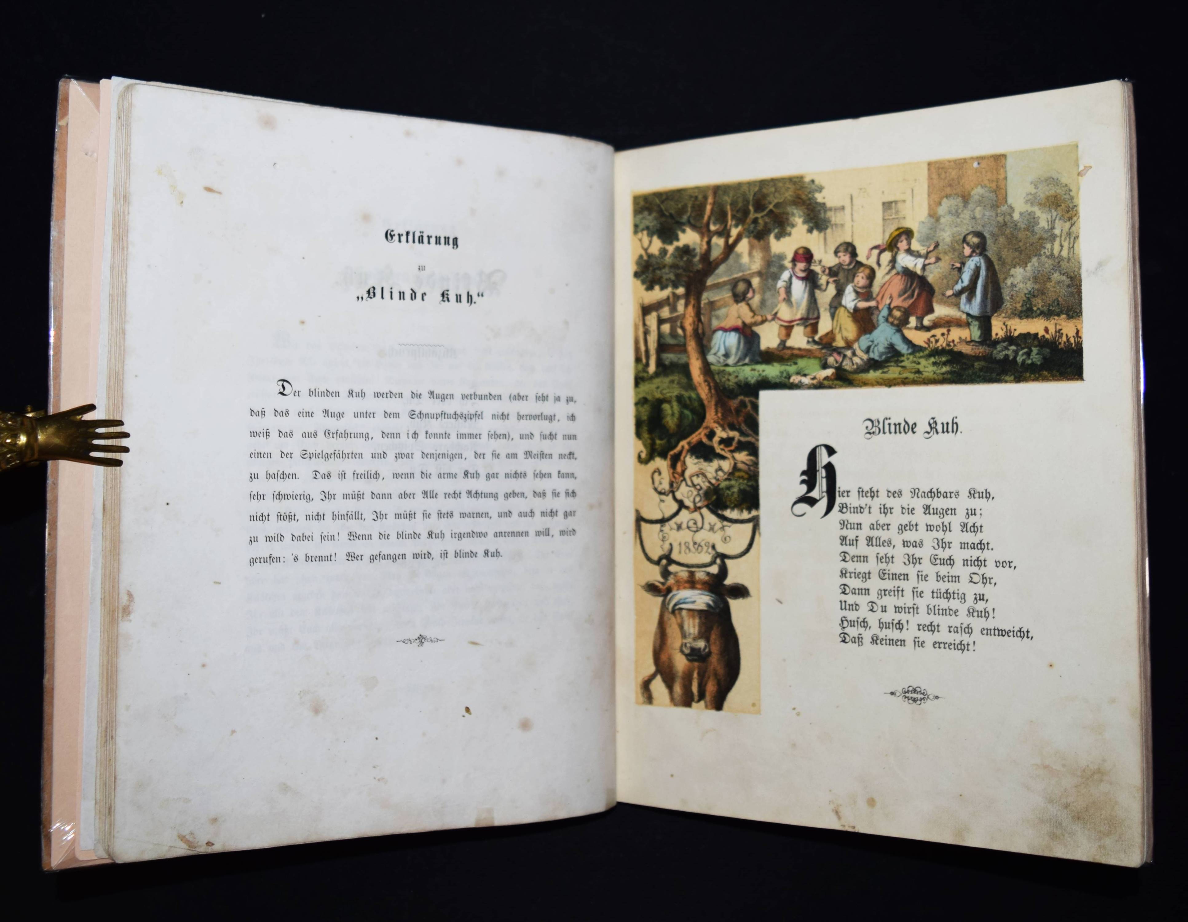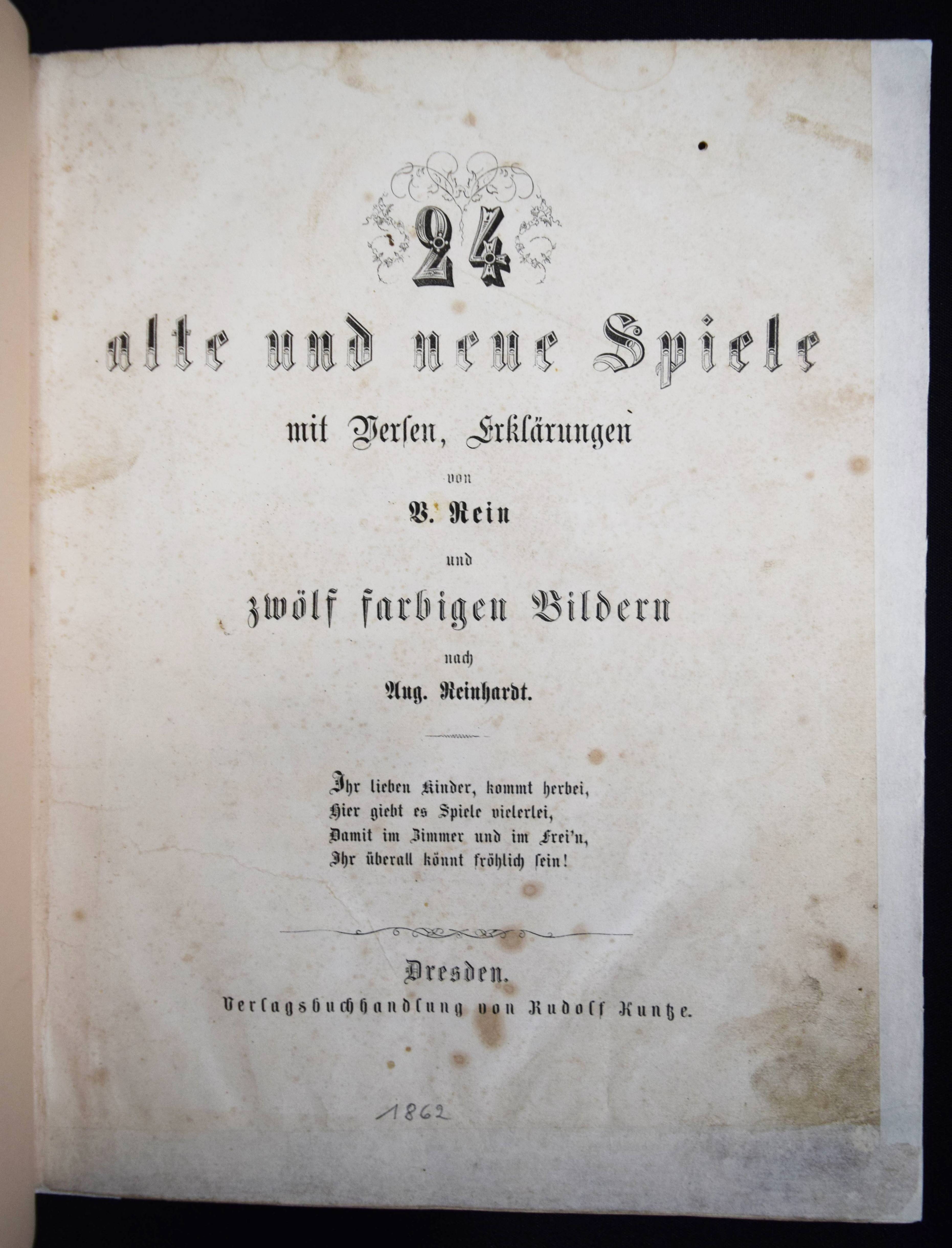 Rein, V(eronika, d. i. V. Reinhardt). 24 alte und neue Spiele. Mit Versen, Erklärungen von V. Rein und zwölf farbigen Bildern nach Aug(ust) Reinhardt. Dresden, Rudolf Kuntze (Deckel: Wilhelm Bock) 1862. 4° (26,6 x 21,5 cm.). [26] Bl. mit 12 farblithogr. Tafeln. Farbig illustr. Orig.-Halbleinenband. Heinsius XIV, 301. Pataky II, 179 (mit dem Titel: „Das Spielbuch für Kinder“). Nicht in den einschlägigen Kinderbuch-Bibliographien. – Wohl einzige Ausgabe, sehr seltene Gemeinschaftsarbeit des Dresdner Ehepaars Veronika (1836-?) und August Reinhardt (1831-1915). Am erfolgreichsten war das erste Bilderbuch „Das Ein mal Eins wird hier gebracht, wie es den Kindern Freude macht“ (Dresden, Bock 1861), das bis 1888 sechsmal aufgelegt wurde. – Beschrieben und dargestellt werden 24 heute meist vergessene Kinderspiele, darunter „Reifspiel“, „Blinde Kuh“, „Brücke bauen“ und „Kränzchen winden“. – Der Leipziger Landschaftsmaler, Zeichner und Illustrator August Reinhardt lebte und arbeitete seit 1859 in Dresden. 1893 bis 1911 war er Zeichenlehrer am Kadettenkorps. – Rückendeckel und Vorsätze fachgerecht erneuert, Titel und das letzte Blatt mit restaurierten Randläsuren, stellenweise etwas braun- und fingerfleckig, gutes Exemplar.