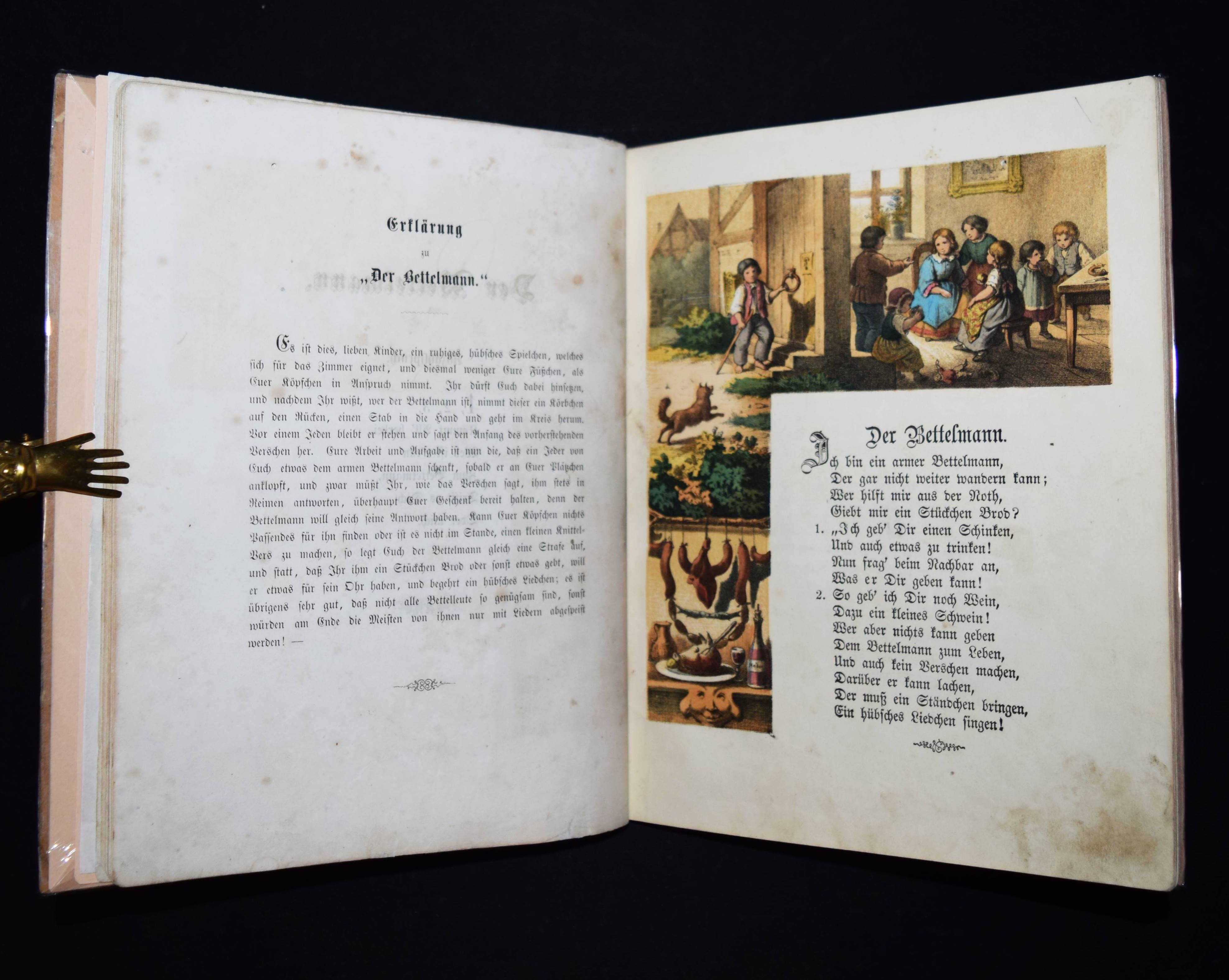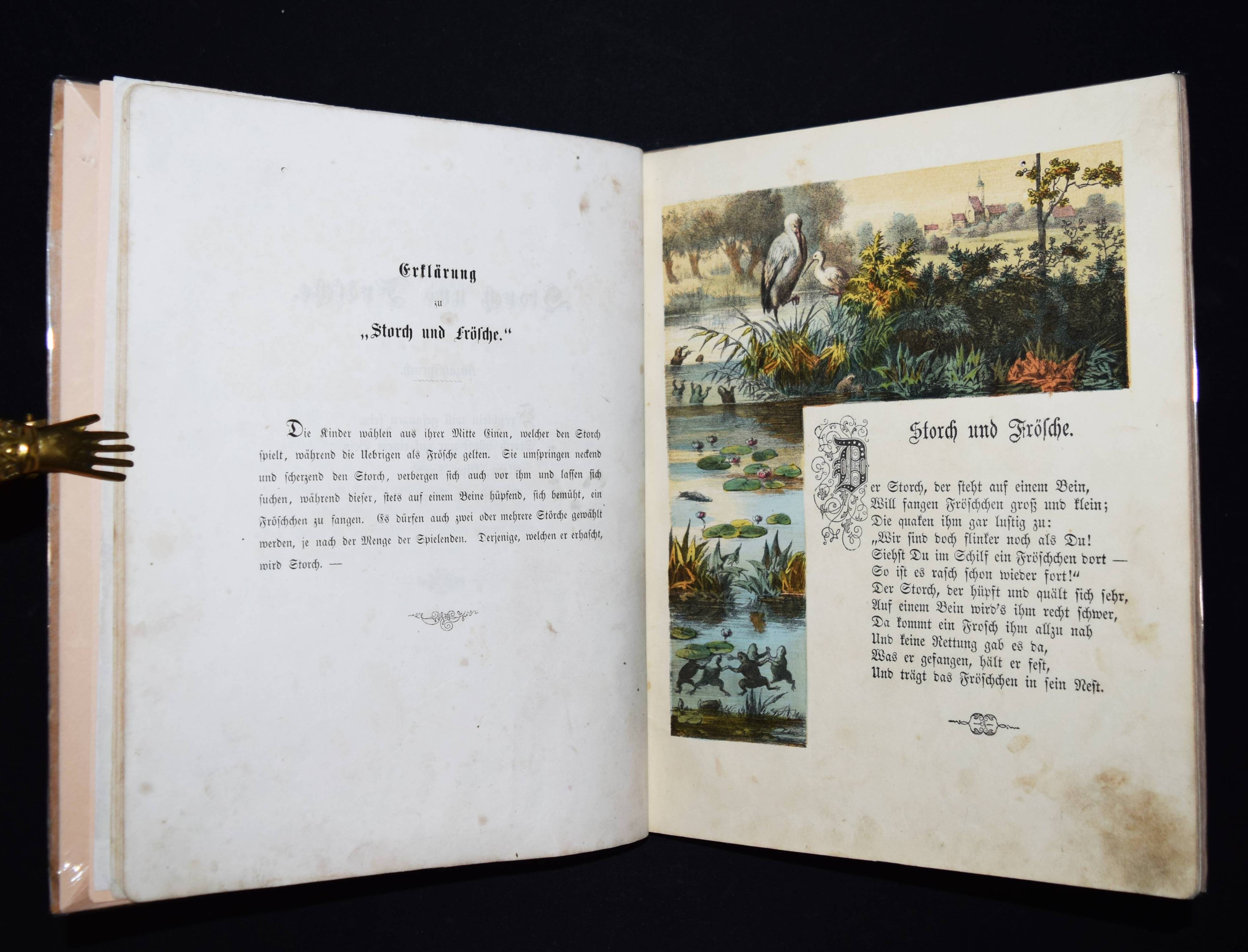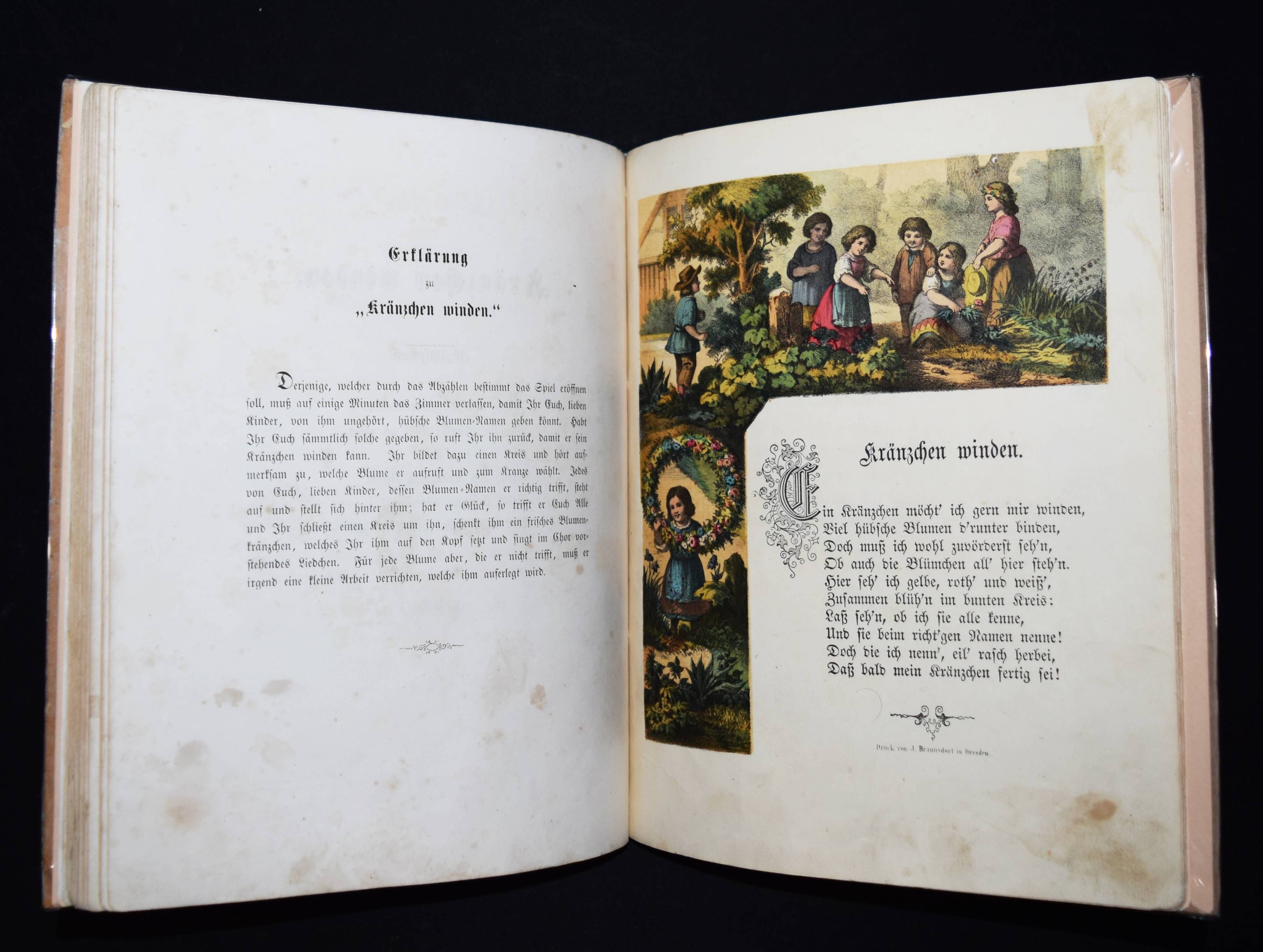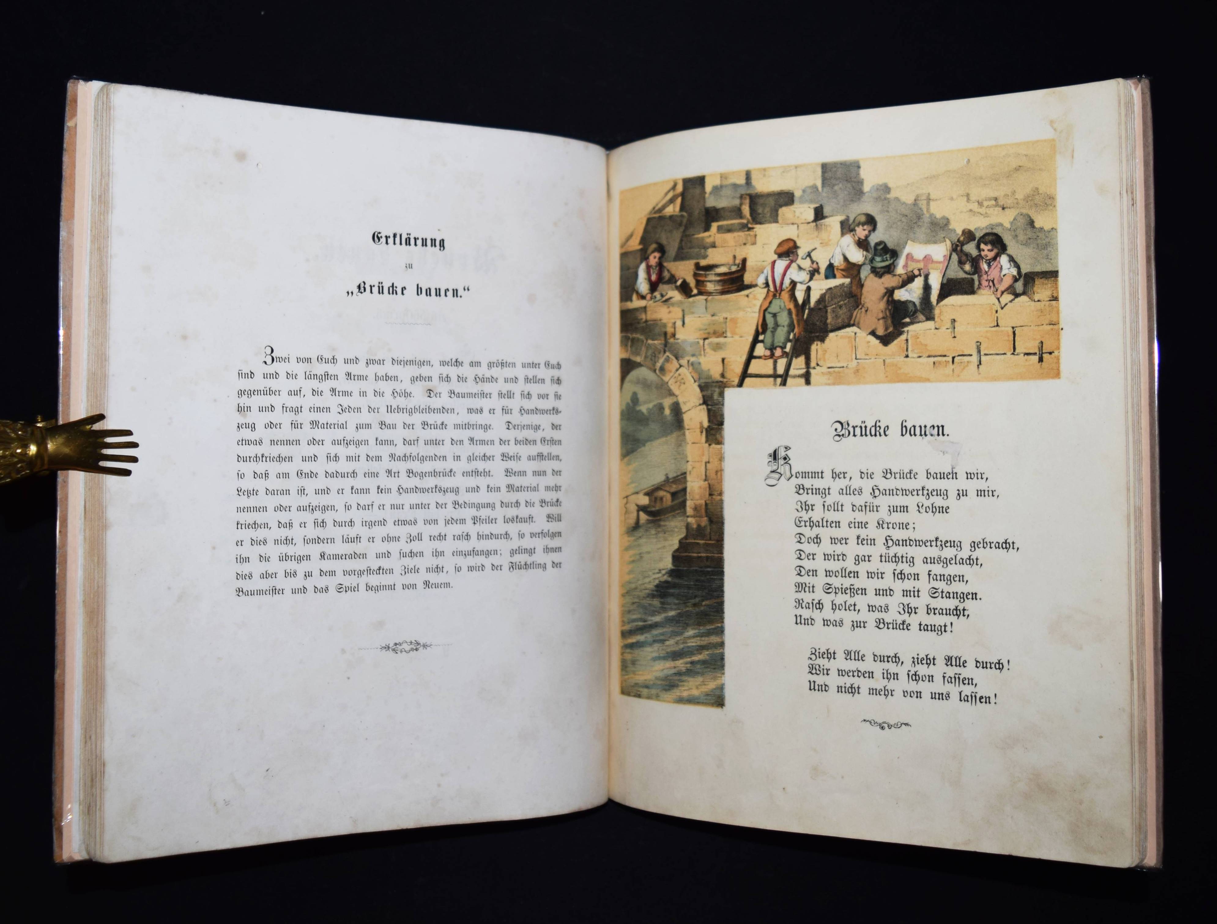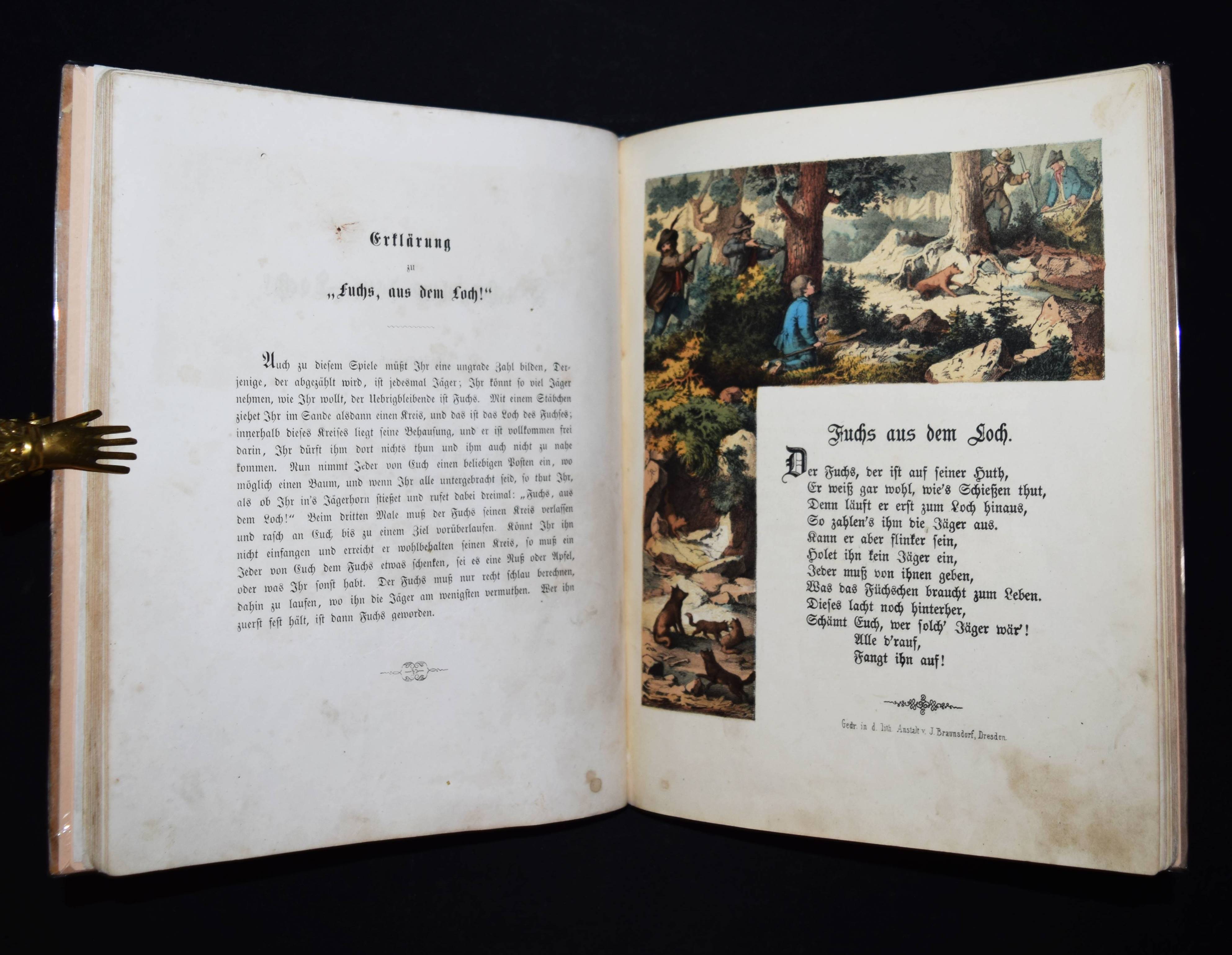Rein, V(eronika, d. i. V. Reinhardt). 24 alte und neue Spiele. Mit Versen, Erklärungen von V. Rein und zwölf farbigen Bildern nach Aug(ust) Reinhardt. Dresden, Rudolf Kuntze (Deckel: Wilhelm Bock) 1862. 4° (26,6 x 21,5 cm.). [26] Bl. mit 12 farblithogr. Tafeln. Farbig illustr. Orig.-Halbleinenband. Heinsius XIV, 301. Pataky II, 179 (mit dem Titel: „Das Spielbuch für Kinder“). Nicht in den einschlägigen Kinderbuch-Bibliographien. – Wohl einzige Ausgabe, sehr seltene Gemeinschaftsarbeit des Dresdner Ehepaars Veronika (1836-?) und August Reinhardt (1831-1915). Am erfolgreichsten war das erste Bilderbuch „Das Ein mal Eins wird hier gebracht, wie es den Kindern Freude macht“ (Dresden, Bock 1861), das bis 1888 sechsmal aufgelegt wurde. – Beschrieben und dargestellt werden 24 heute meist vergessene Kinderspiele, darunter „Reifspiel“, „Blinde Kuh“, „Brücke bauen“ und „Kränzchen winden“. – Der Leipziger Landschaftsmaler, Zeichner und Illustrator August Reinhardt lebte und arbeitete seit 1859 in Dresden. 1893 bis 1911 war er Zeichenlehrer am Kadettenkorps. – Rückendeckel und Vorsätze fachgerecht erneuert, Titel und das letzte Blatt mit restaurierten Randläsuren, stellenweise etwas braun- und fingerfleckig, gutes Exemplar.