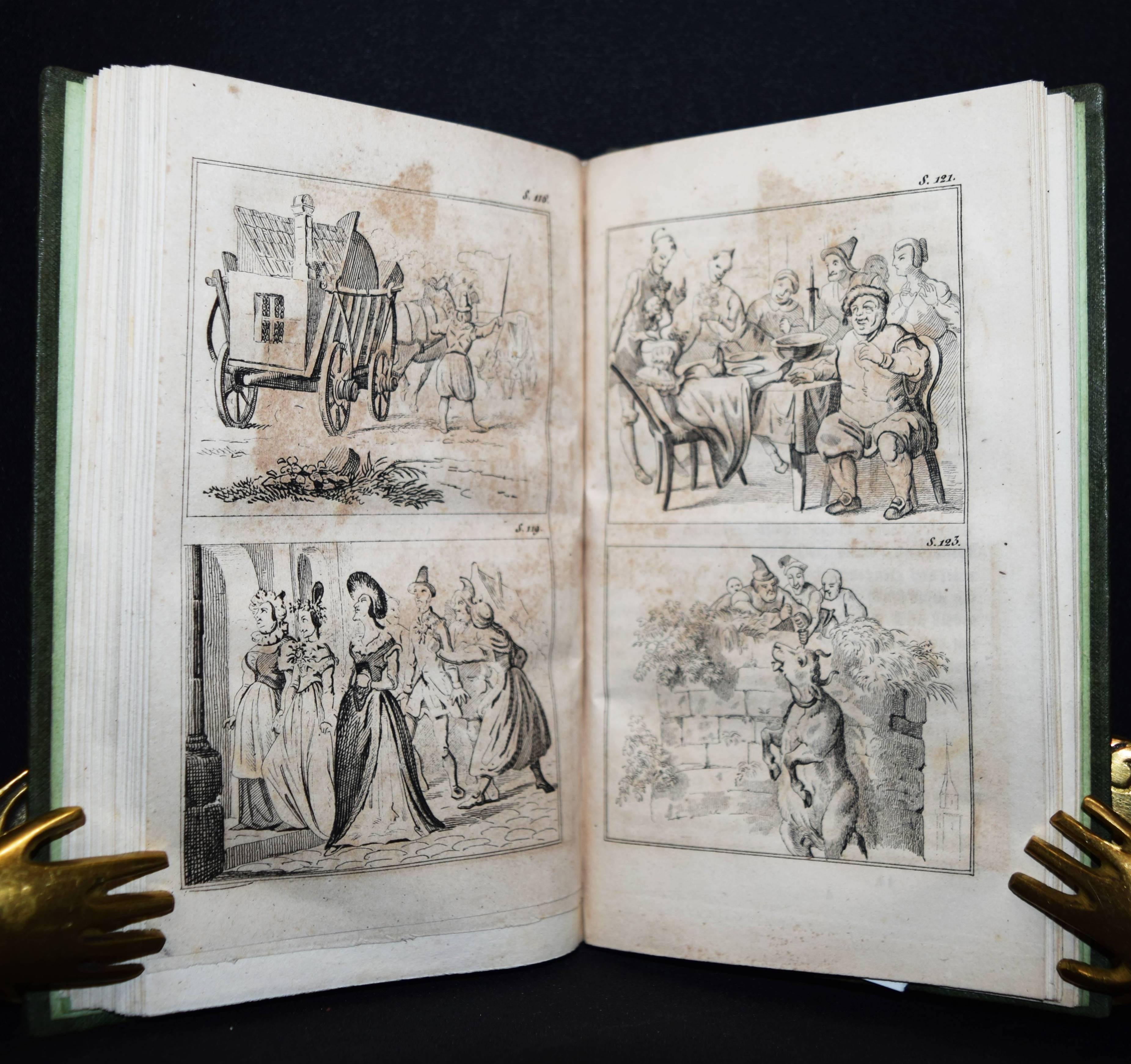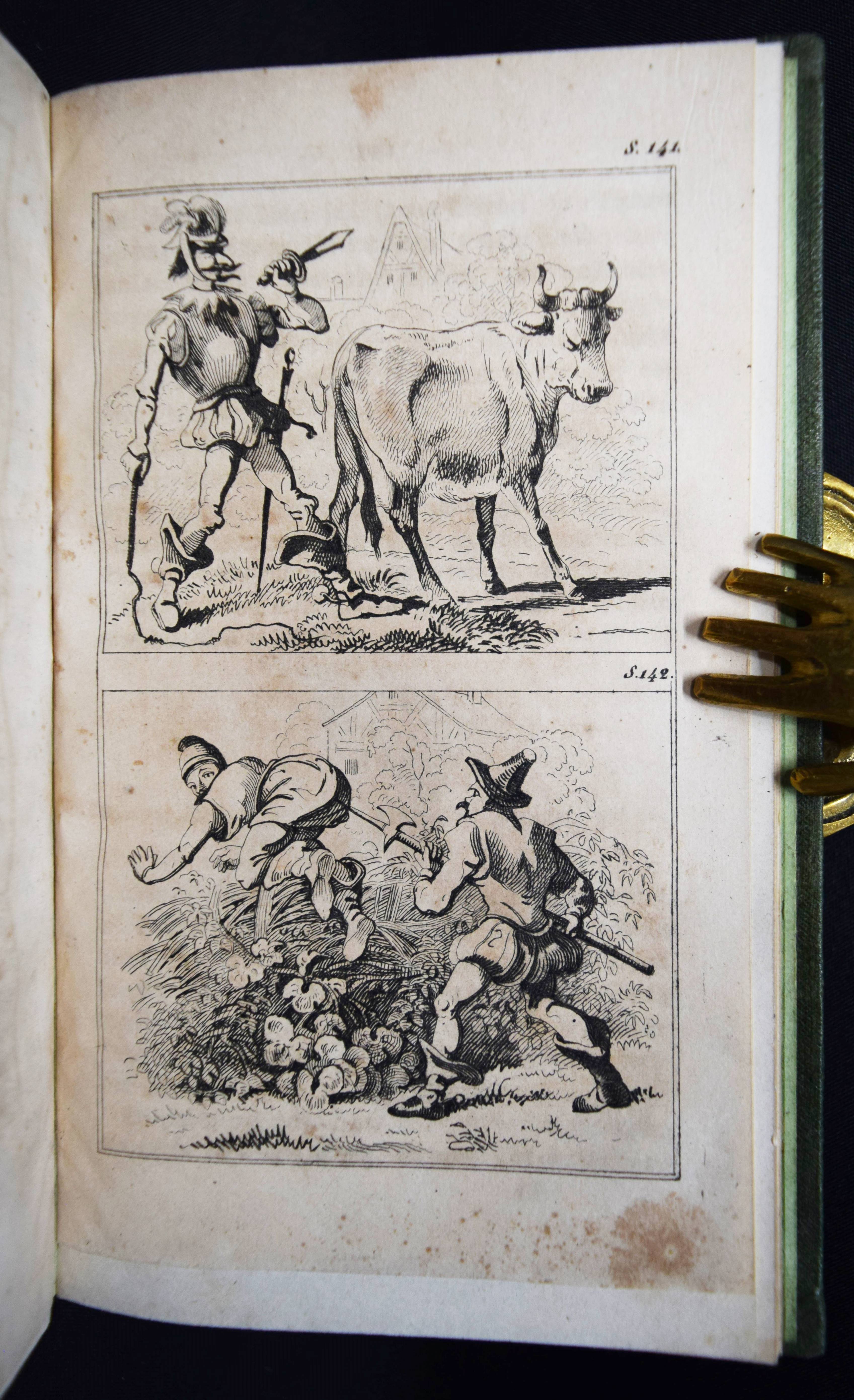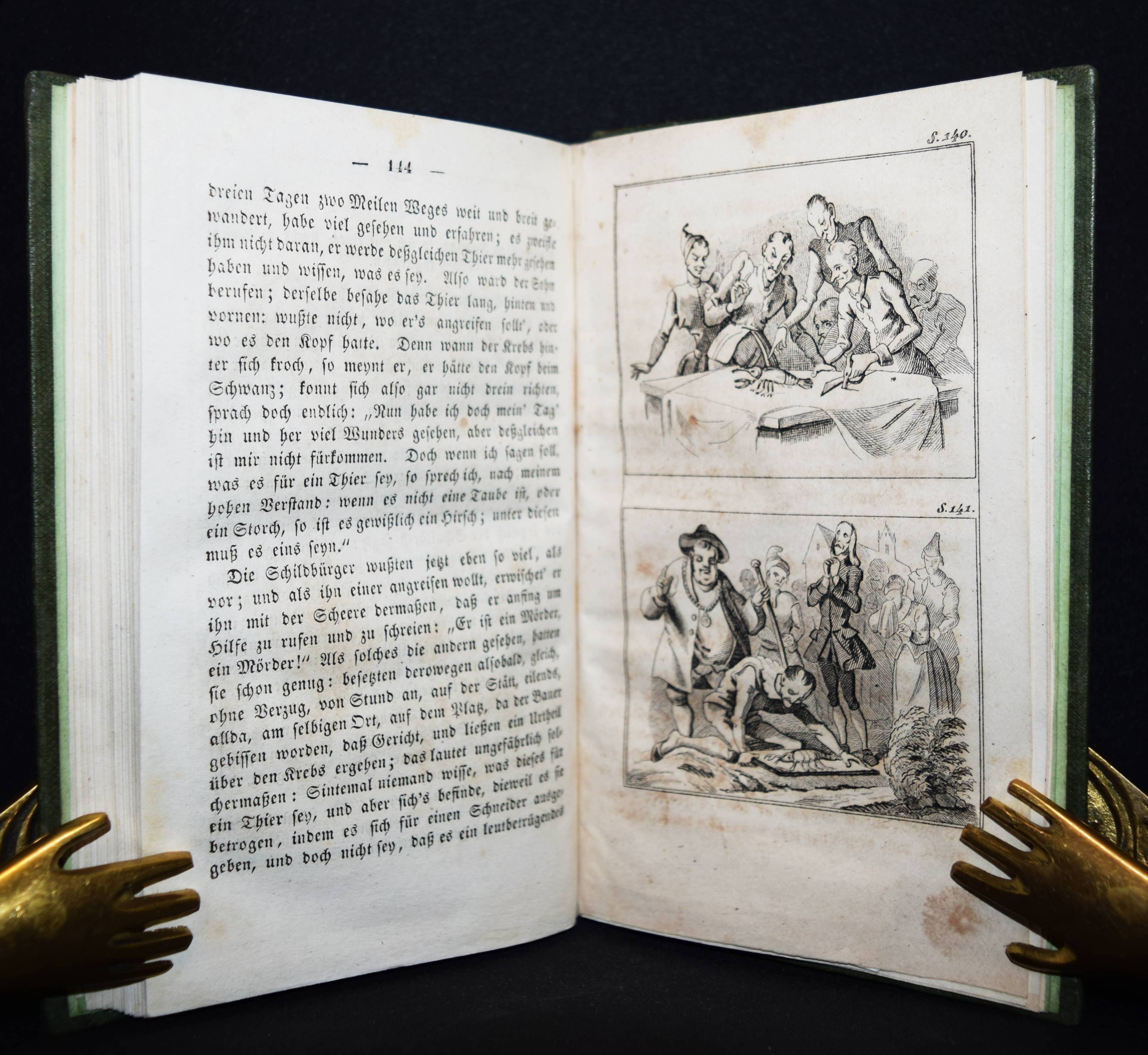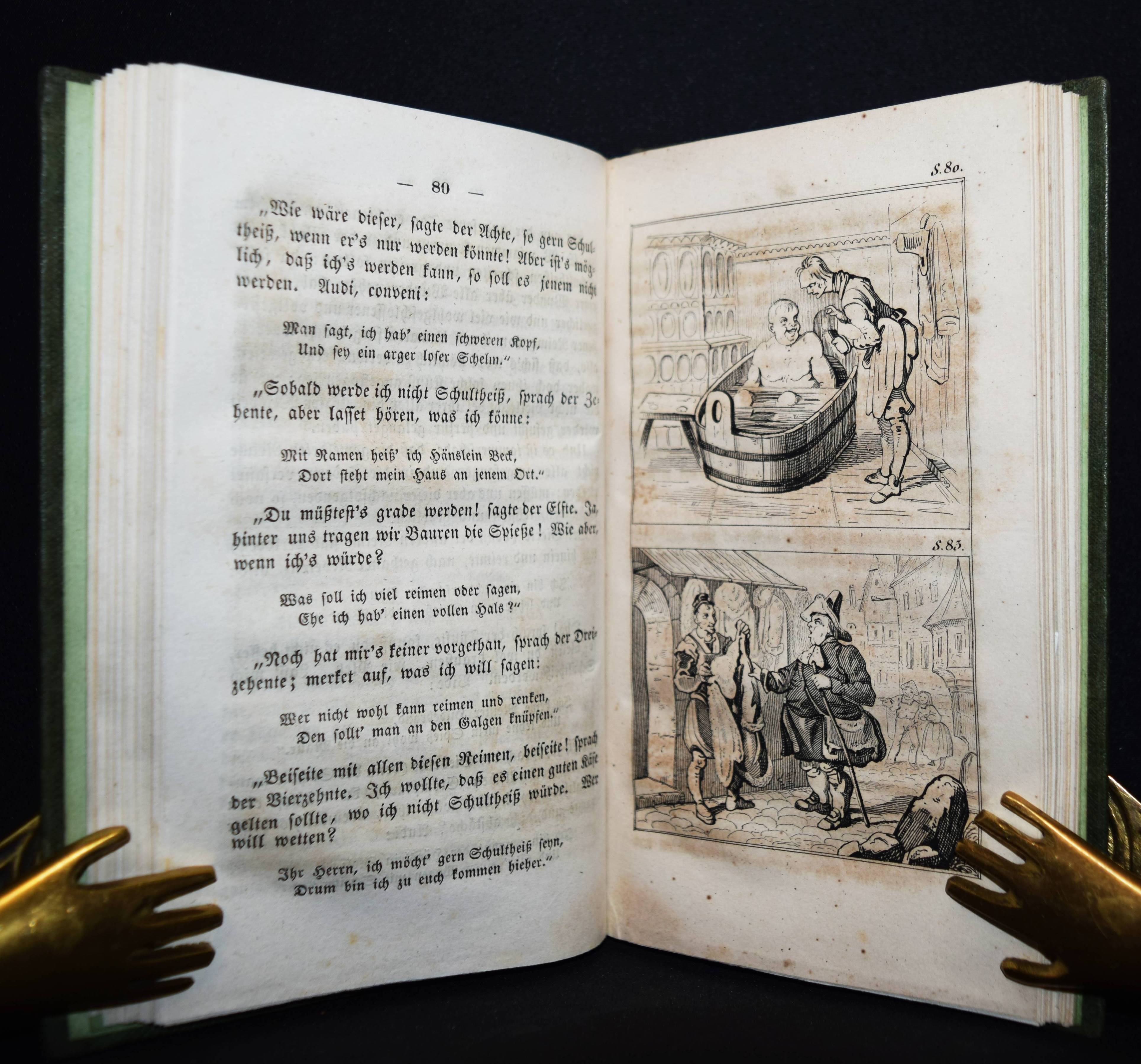 Schildbürger – Aleph Beth Gimel. Das Lalenbuch. Wunderseltsame, abenteuerliche, unerhörte und bisher unbeschriebene Geschichten und Thaten der Lalen zu Lalenburg, in Misnopotamia hinter Utopia gelegen. Jetzund also frisch … in deutsche Sprache gesetzt. Aufs neue gemehrt und gebessert. Gedruckt in Verlegung des Autoris der Festung Misnopotamia (Stuttgart, J. Scheible’s Buchhandlung 1839). 8°. 158 S. mit lithogr. Frontispiz und 50 Abb. auf 25 lithogr. Tafeln (von Willibald Cornelius). Leinenband der Zeit mit goldgepr. Rückentitel und Romantikervergoldung. (Lieblingsbücher in alten und neueren Geschichten, Sagen und Schwänken, Zweiter Theil). Hayn-Got. IX, 528. Rümann, Illustr. Bücher 275, 2. – Erste Ausgabe mit diesen Illustrationen. – Zweiter Teil der seltenen, von Willibald Cornelius (1809-?) herausgegebenen Reihe von Volksbüchern, als Band I erschien 1838 bereits „Der wiedererstandene Eulenspiegel“. Insgesamt erschienen bis 1840 sieben Teile. Das Fronispiz zeigt einen Wanderer mit einem Sack über der Schulter und dem Vers „Wist ihr auch wer ich, der ich bin, / Ich bin ein Mann von hohen Sinn, / Ich bin groß Hans von großen Linden, / Und thu mein Schuh mit Baste binden, / Der Sack ist zwar grausam schwer, / Doch sind mein Gedanken noch viel mehr / Darumb weicht, ich trag ein Sack mit Hopff. / Macht mir nicht unrühig meinen Kopff.“ – Reich illustrierte Ausgabe der Historie von den „Schildbürgern aus Misnopotamia“. Der Erstdruck des aus verschiedenenen Volkserzählungen kompilierten und durch moralische Andeutungen erweiterten utopischen Schwankromans erschien 1597 in Straßburg (vgl. Goed. II, 560 und Hayn-Got. IX, 527). – Einband etwas angestaubt, stellenweise etwas braunfleckig und gebräunt, gutes Exemplar.