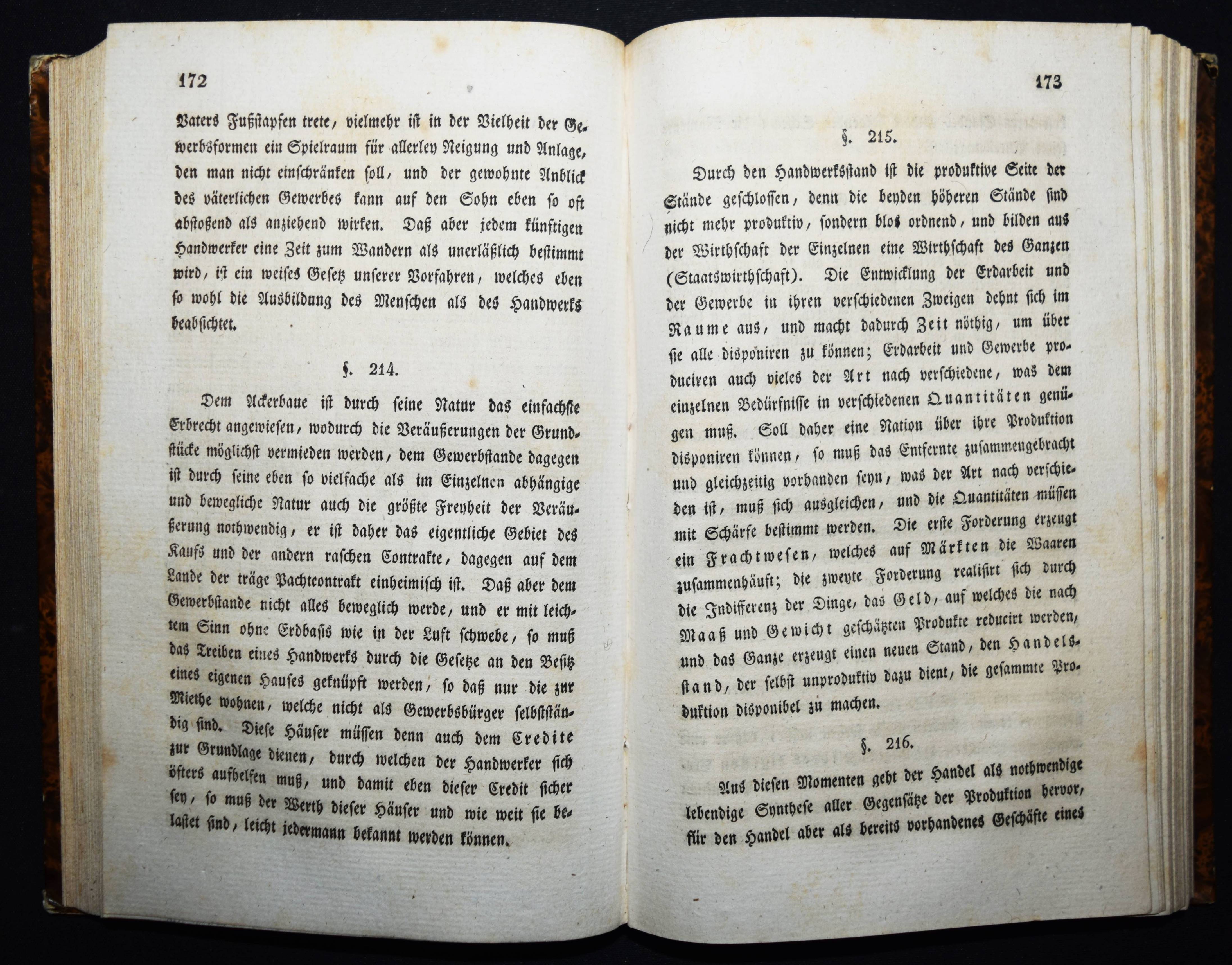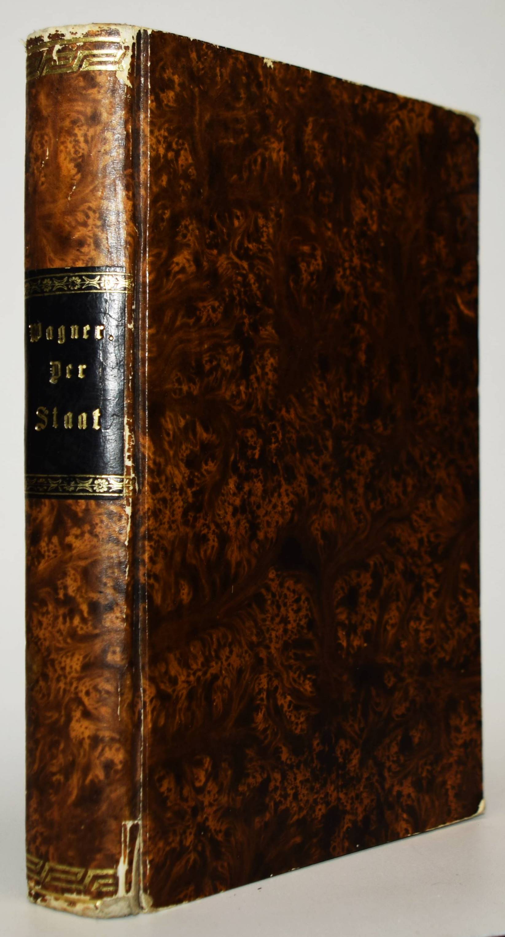 Wagner, Johann Jakob. Der Staat. Würzburg, im Verlage des Verfassers 1815. 8°. XVI, 398 S. Marmorierter Pappband der Zeit mit goldgepr. Rückenschild und dezenter Rückenvergoldung. ADB XL, 510 ff. Goed. V, 12.29.9. Humpert 7855. Ziegenfuß II, 816. – Zweite Variante des erstmals 1811 erschienenen staatsphilosophischen Hauptwerkes des Würzburger Philosophie-Professors J. J. Wagner (1775-1841). – Wagner konstruiert hier ein System von Tetraden, womit er die Triaden Schellings glatt überbietet. – „So suchte er den Gedanken, daß „Mathematik das Gesehbuch der Welt und die Form der Erkenntniß und der Dinge sei“, näher zu begründen und dadurch „die Mathematik aus einer bloßen Größenlehre auf die Stufe der letzten Wissenschaft oder derjenigen Lehre zu erheben, durch welche jedes Wissen erst Wissenschaft“ werde. Die begriffenen mathematischen Sätze sollen zugleich die Kategorien des Denkens und die Formen der Sprache sein. Die Constructionsweise nach Tetraden d. h. nach der Verbindung des absoluten und relativen Gegensatzes, die er hier schon als Weltgesetz im Gegensatz zu dem triadischen Schema des Identitätssystems hatte nachweisen wollen, wandte er weiter an in seinem Werke „Der Staat“ (Würzb. 1815, 2. Aufl. Ulm 1848), das trotz alles Gedankenreichthums den von ihm erhofften Beifall nicht fand“ (Max Heinze in ADB). – Kapital und Fuß etwas berieben, N.a.V., stellenweise etwas braunfleckig, gutes Exemplar.