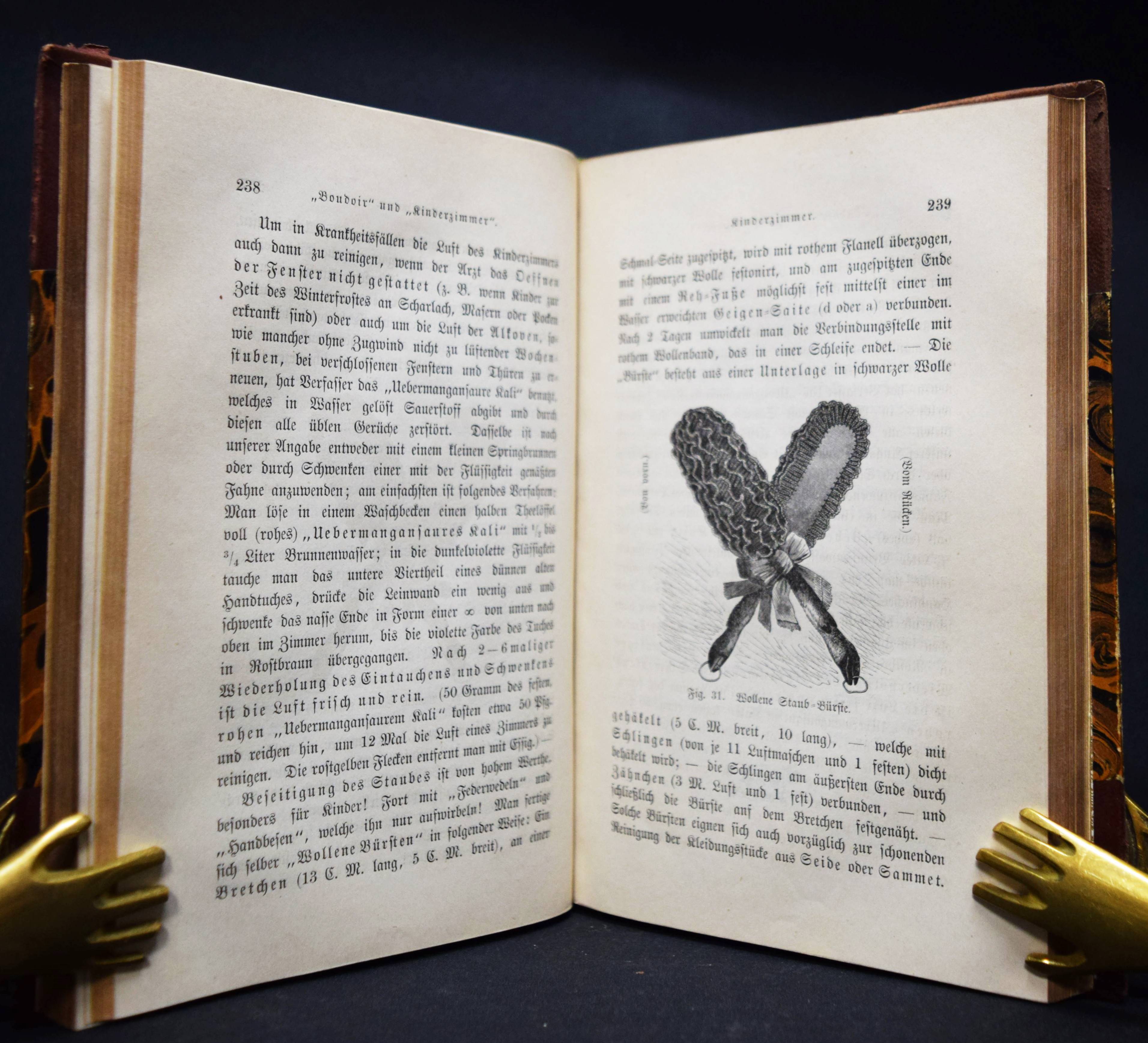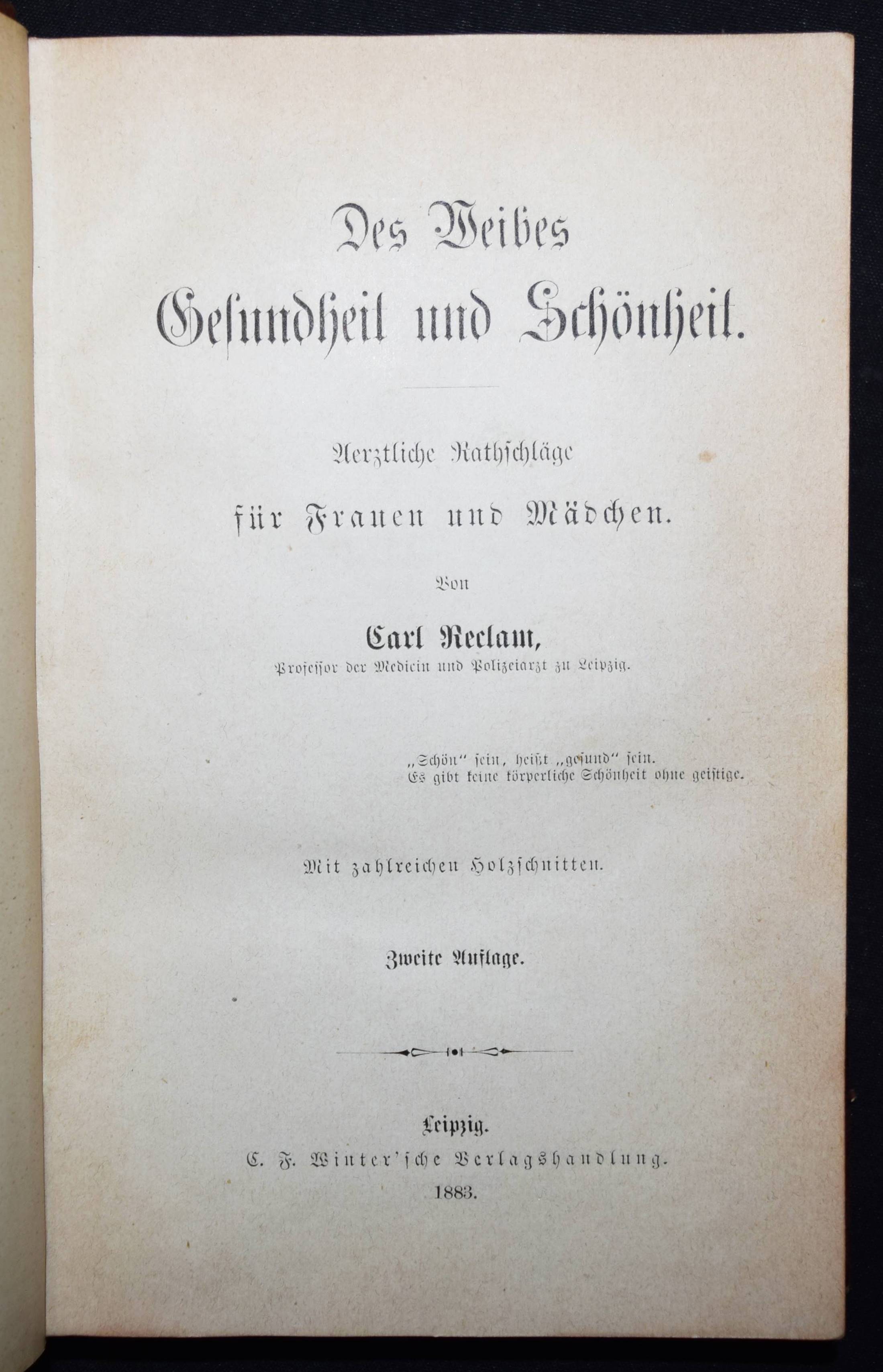 Reclam, Carl (Heinrich). Des Weibes Gesundheit und Schönheit. Aerztliche Rathschläge für Frauen und Mädchen. 2. Auflage. Leipzig und Heidelberg, C.F. Winter’sche Verlagshandlung 1883. 8°. X, 472 S. mit 40 Holzschnitten im Text. Orig.-Halblederband mit goldgepr. Rückentitel und Rückenvergoldung. ADB LIII, 246. – Erste illustrierte und erweiterte Ausgabe; erschien zuerst 1868. – Inhalt: „1. Weiber – Damen – Frauen. – 2. Schönheitslehre. – 3. „Mager“ oder „voll“? – 4. Diätische Winke für Küche und Küchenzettel. – 5. Boudoir und Kinderzimmer. – 6. Geistespflege. – 7. Arbeitslehre. – 8. Die Frauen-Stellung. – 9. Vergnügungen. – 10. Heirath und Ehe. – 11. Krankheiten der Mädchen und Frauen. – 12. Alphabetisches Register. – K. H. Reclam (1821-1887) war seit 1868 Professor für Medizin und seit 1877 auch Polizeiarzt in Leipzig. – Rücken etwas aufgehellt, gutes Exemplar im dekorativen Verlagseinband.