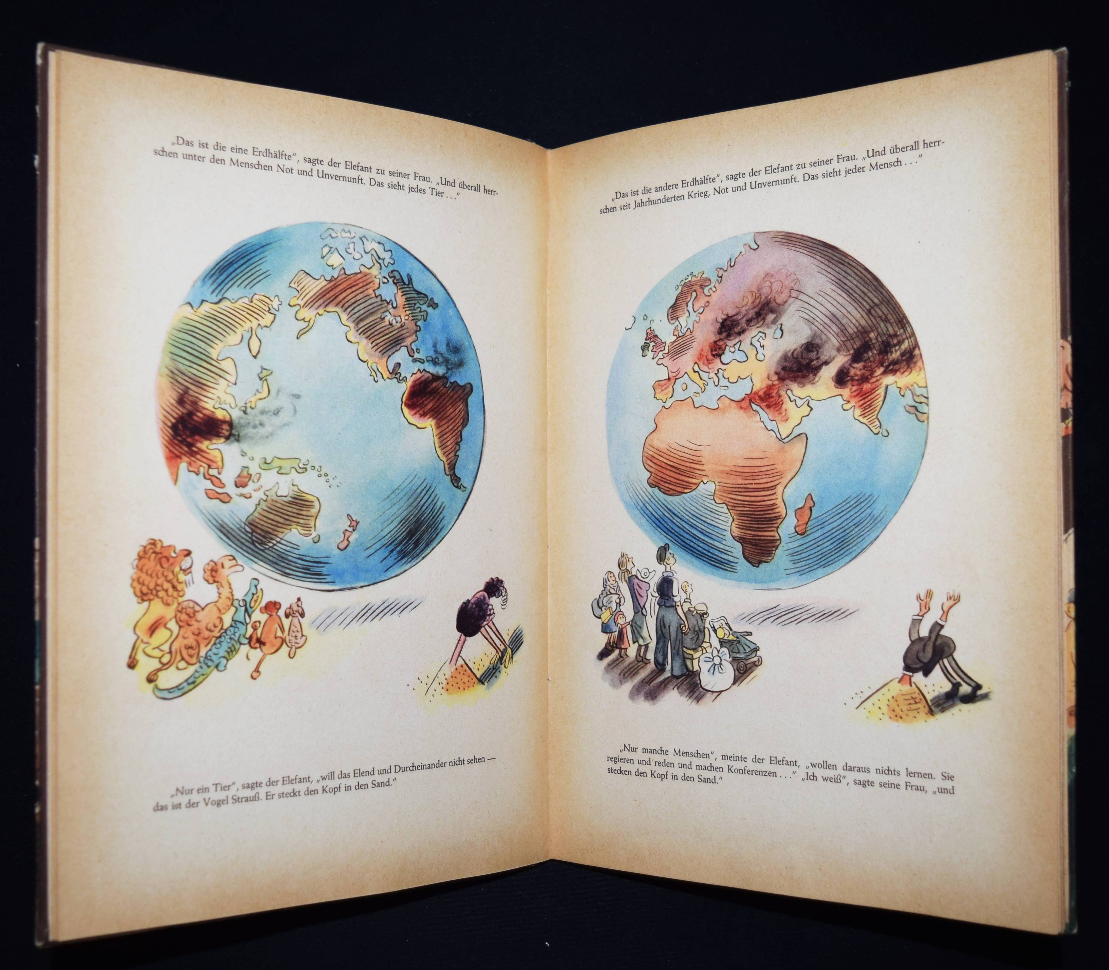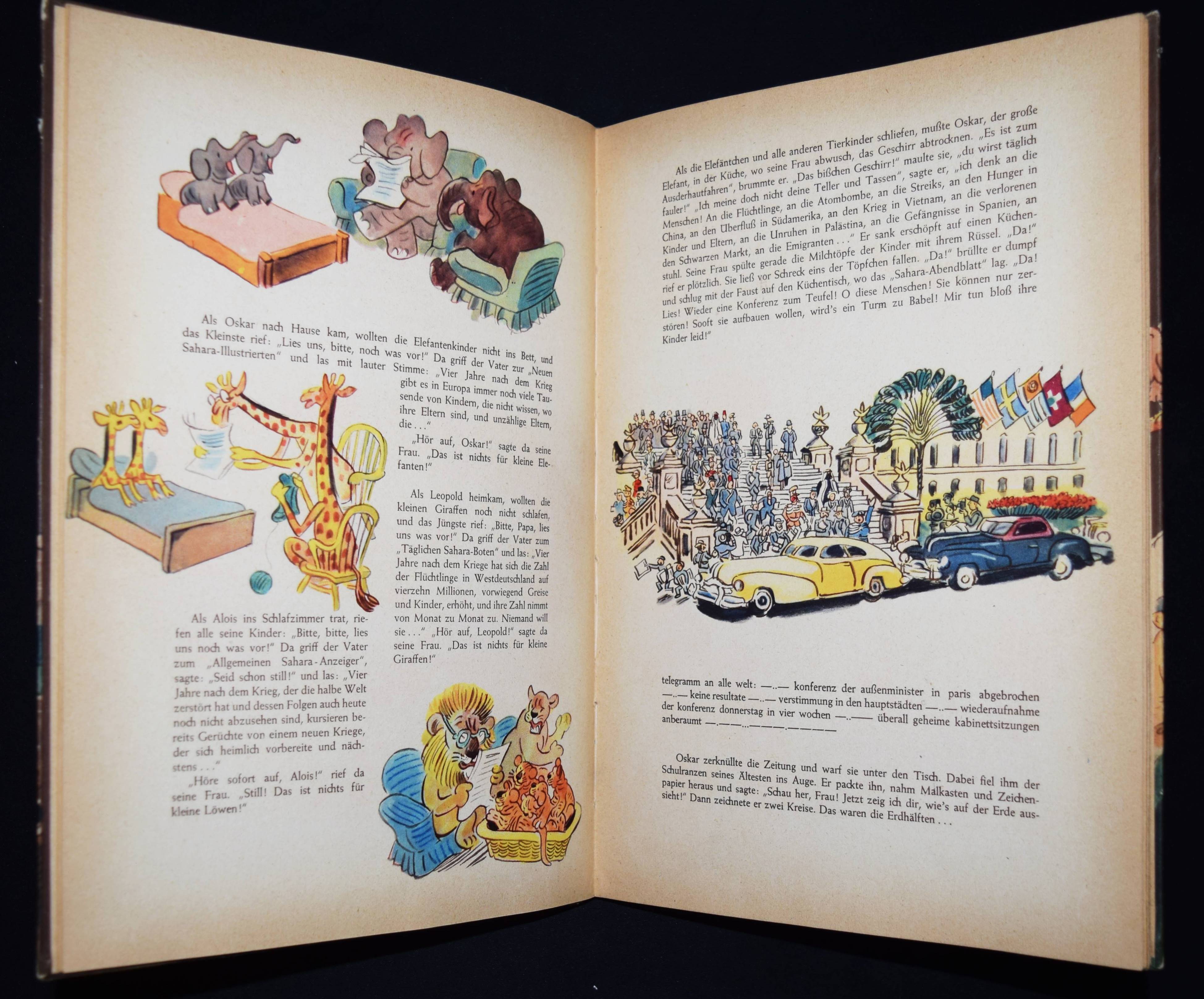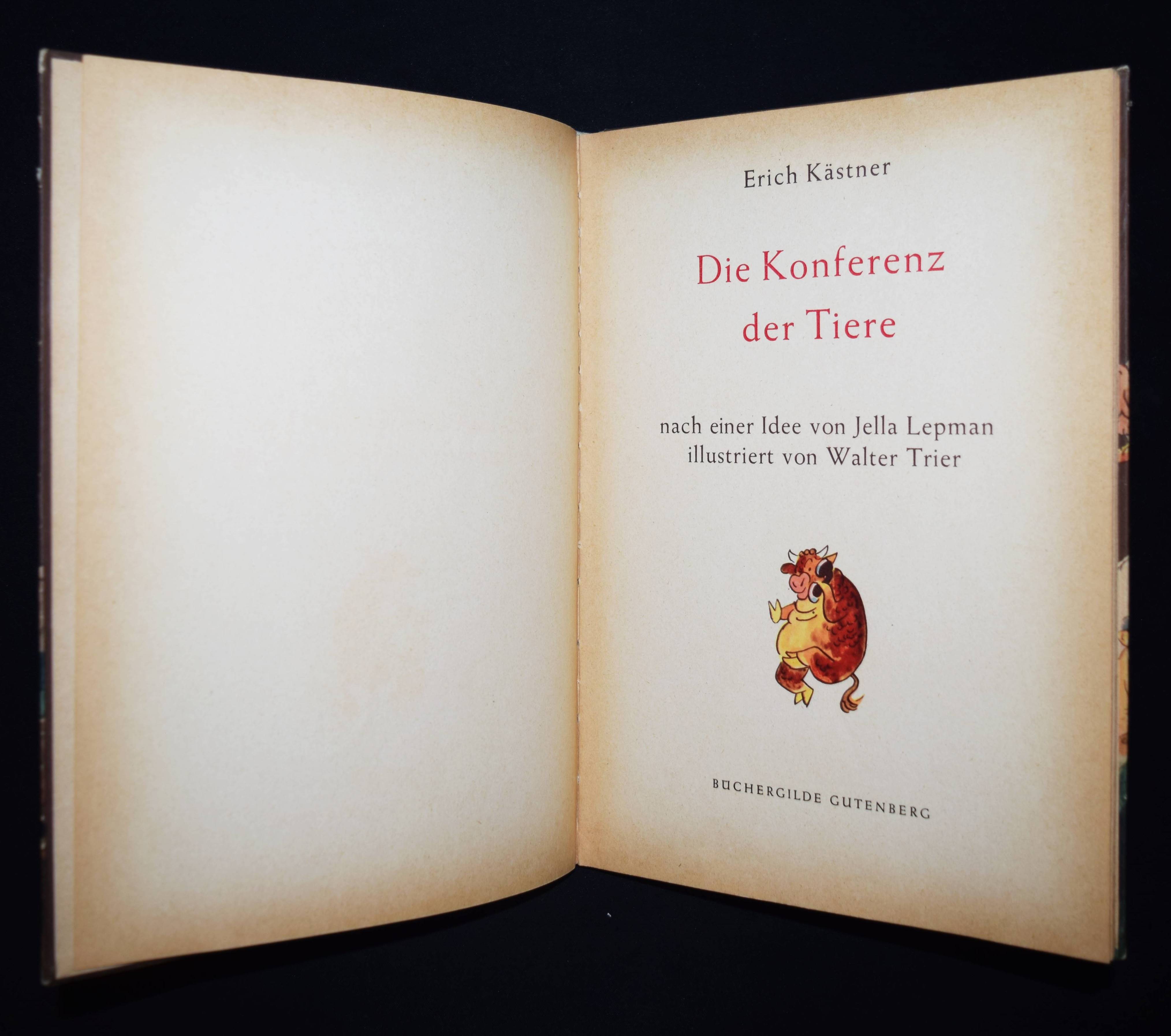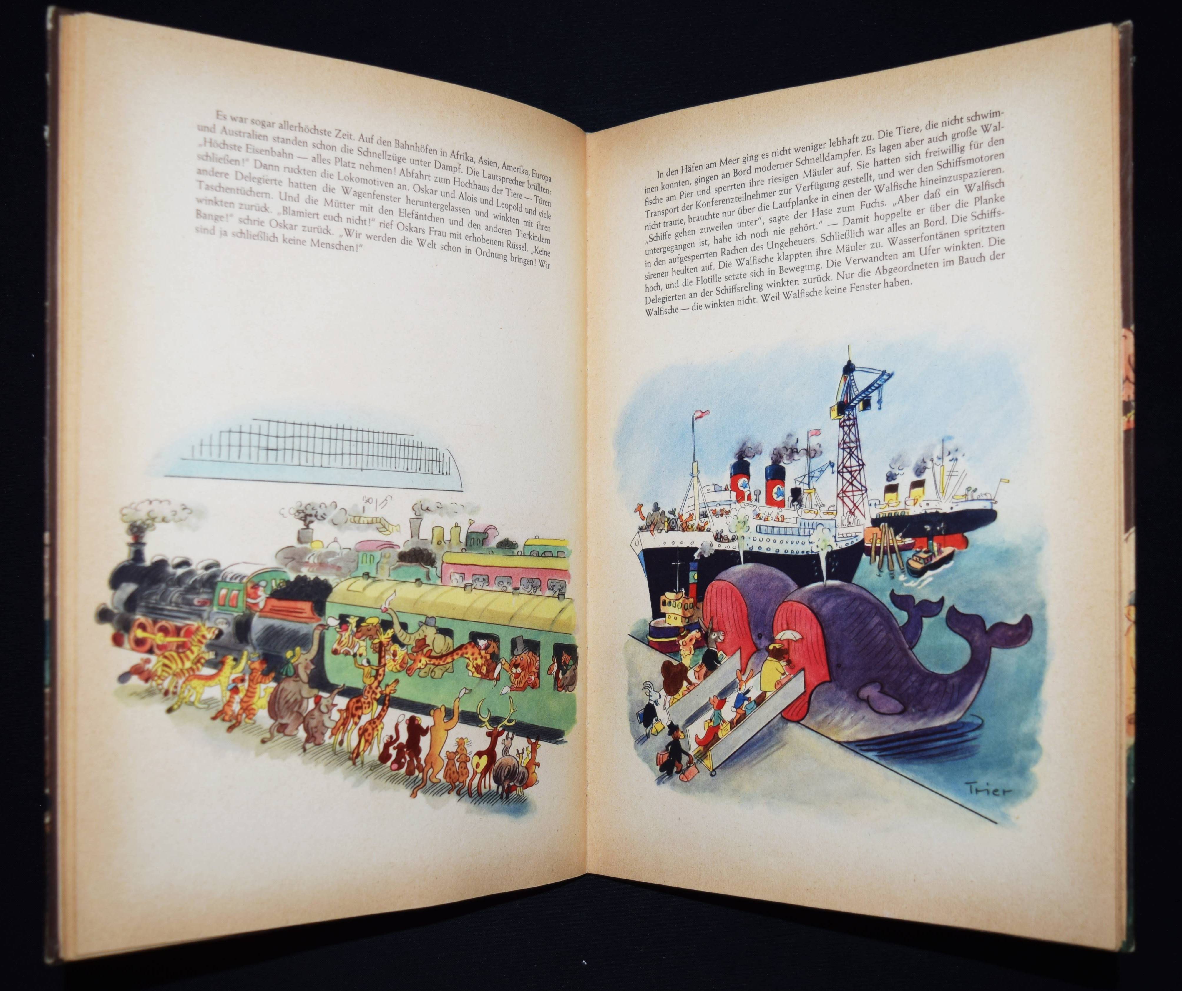 Kästner, Erich. Die Konferenz der Tiere. Nach einer Idee von Jella Lepmann illustriert von Walter Trier. (Typographische Gestaltung: Maja von Arx). (Frankfurt am Main), Büchergilde Gutenberg (ca. 1950). 4°. 64 unbez. S. mit 106 farb. Illustrationen. Farbig illustr. Orig.-Halbleinenband. Vgl. Bilderwelt 685. Hatry 25 u. 124. Slg. Hürlimann 1816. Klotz 3208/85. LKJ II, 127 u. III, 562. Muck II, 3544. Seebaß II, 987. – Erschien zuerst 1949 im Europa Verlag, Zürich, Wien und Konstanz. – Erich Kästner wurde zu diesem pazifistischen Märchen von Jella Lepman, der Gründerin der Internationalen Jugendbibliothek in München, angeregt (vgl. LKJ II, 344). – „Das Buch ist eine amüsante Satire in Gestalt eines Kinderbuches mit hervorragenden Illustrationen“ (K. Flemming in Bilderwelt). – „In diesem Buch regt sich kein Zeigefinger, schreitet keine als Märchentante verkleidete Weltanschauung einher, wohl aber schlägt das Herz, funkelt der Geist, lächelt der Humor…“ (Neue Zeitung, München). – Papierbedingt gebräunt, sehr gutes Exemplar.