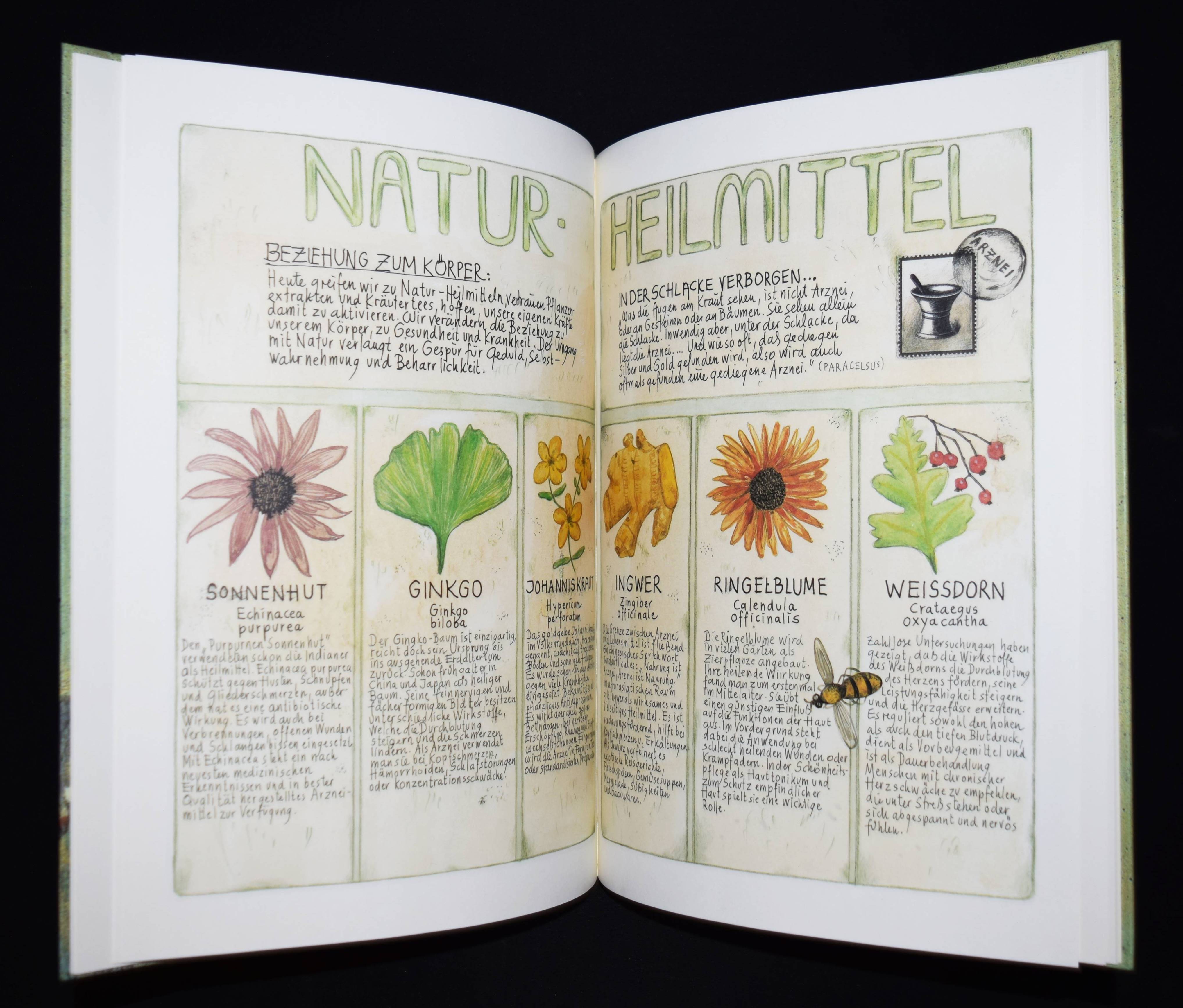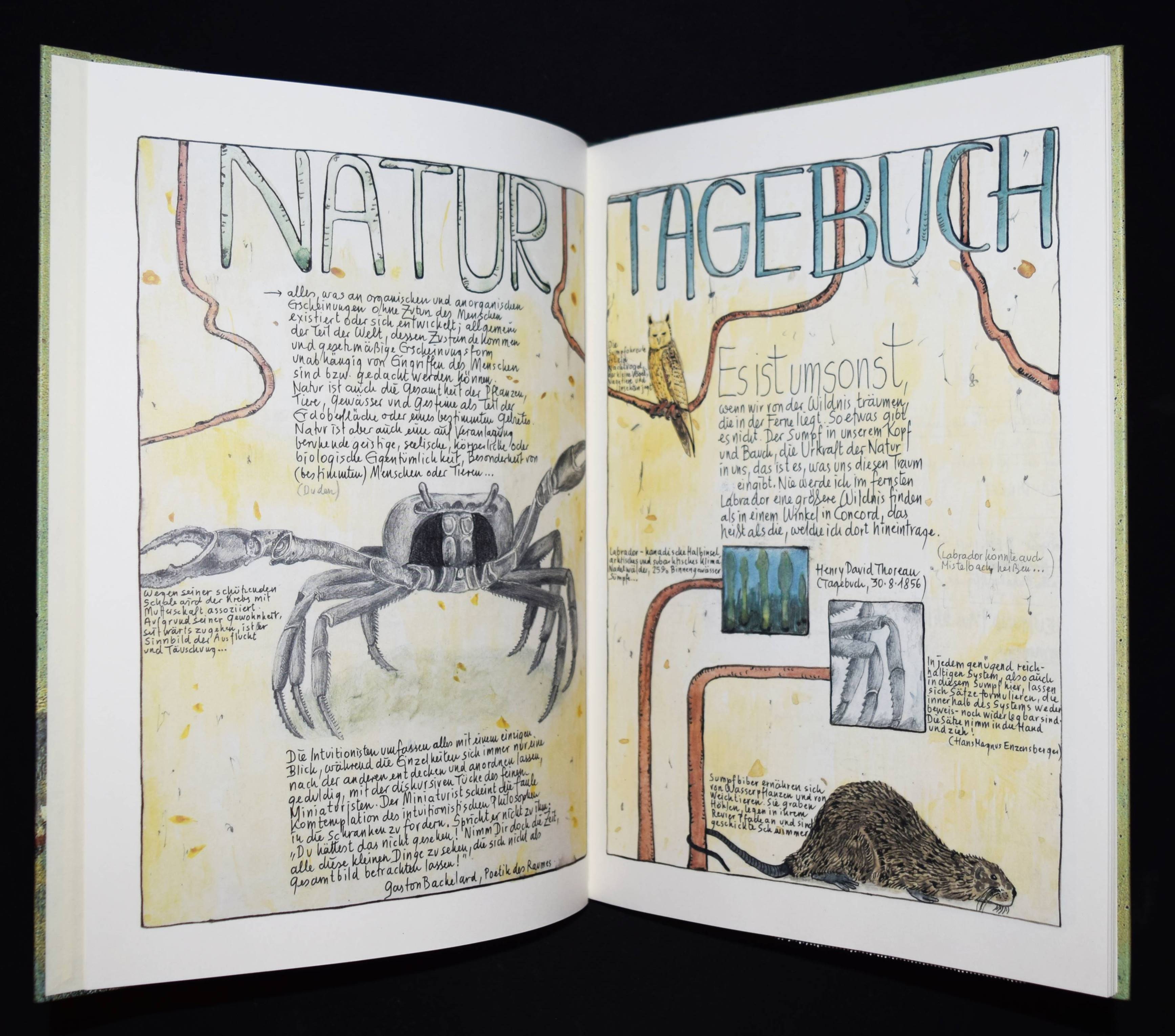 | Puchner, Willy. Tagebuch der Natur. 2. Auflage. St. Pölten, Wien, Linz, NP-Buchverlag (2002). 4°. [45] S. mit farb. Illustrationen. Farbig illustr. Orig.-Pappband. Mit eigenhändiger Widmung von Willy Puchner. – „In einem Schulheft reportierte der Schüler Willy Puchner, was er beobachten konnte auf der Wiese: dass die Farben von Löwenzahn, Sauerampfer, Hahnenfuß, Glockenblume u. a. m., auch des Schmetterlings, auffallen. Der Erwachsene behielt sich seine kindhafte Sehweise und die Lust am Sammeln, am Kombinieren von Fundstücken und setzt sie künstlerisch um.“ (Oberösterreichische Nachrichten). – „Manche Seiten muten wie der Inhalt von Kinderrucksäcken nach einem Herbstausflug an, andere wiederum hätten Antoine de St. Exupéry und seinen Prinzen hell auflachen lassen. In diesem Tagebuch findet ein stetes Fließen zwischen Wiedergabe von Gesehenem und den Kapriolen der Phantasie statt, nicht aber den Blick auf die Realität zu verlieren.“ (Der Standard). – „Einerseits erzählen die Heftseiten vom Wunsch, die Eindrücke zu ordnen, buchstäblich zu verarbeiten. Andererseits dokumentieren sie die Aussichtslosigkeit, die Welt auf den Punkt zu bringen. Denn wie jeder Sammler, so wird auch Puchner, der Sammler von Visionen und Erlebnissen, der Welt keineswegs gerecht. Er kreiert vielmehr eine neue: seine eigene.“ (Frankfurter Allgemeine Zeitung). – Neuwertiges Exemplar.