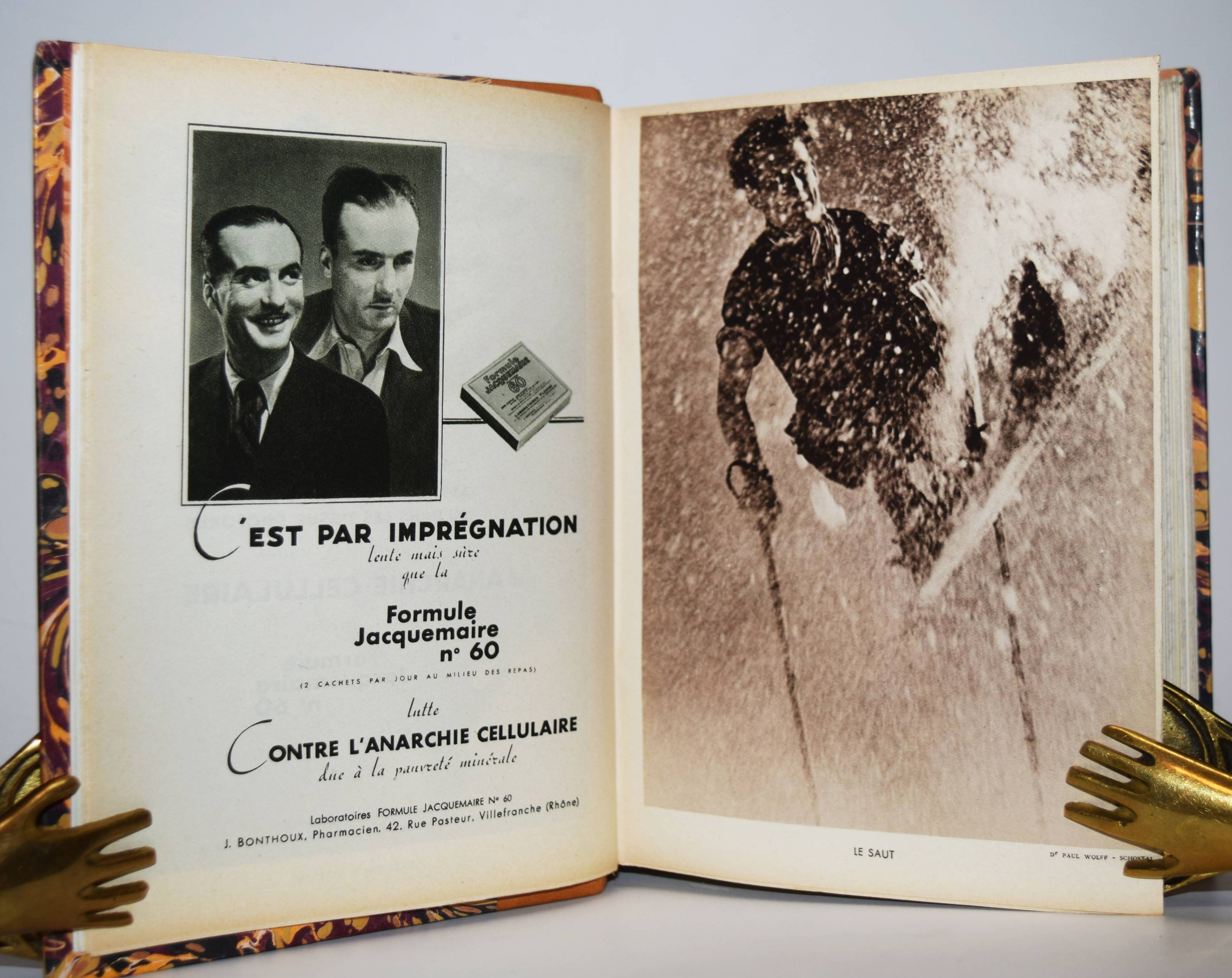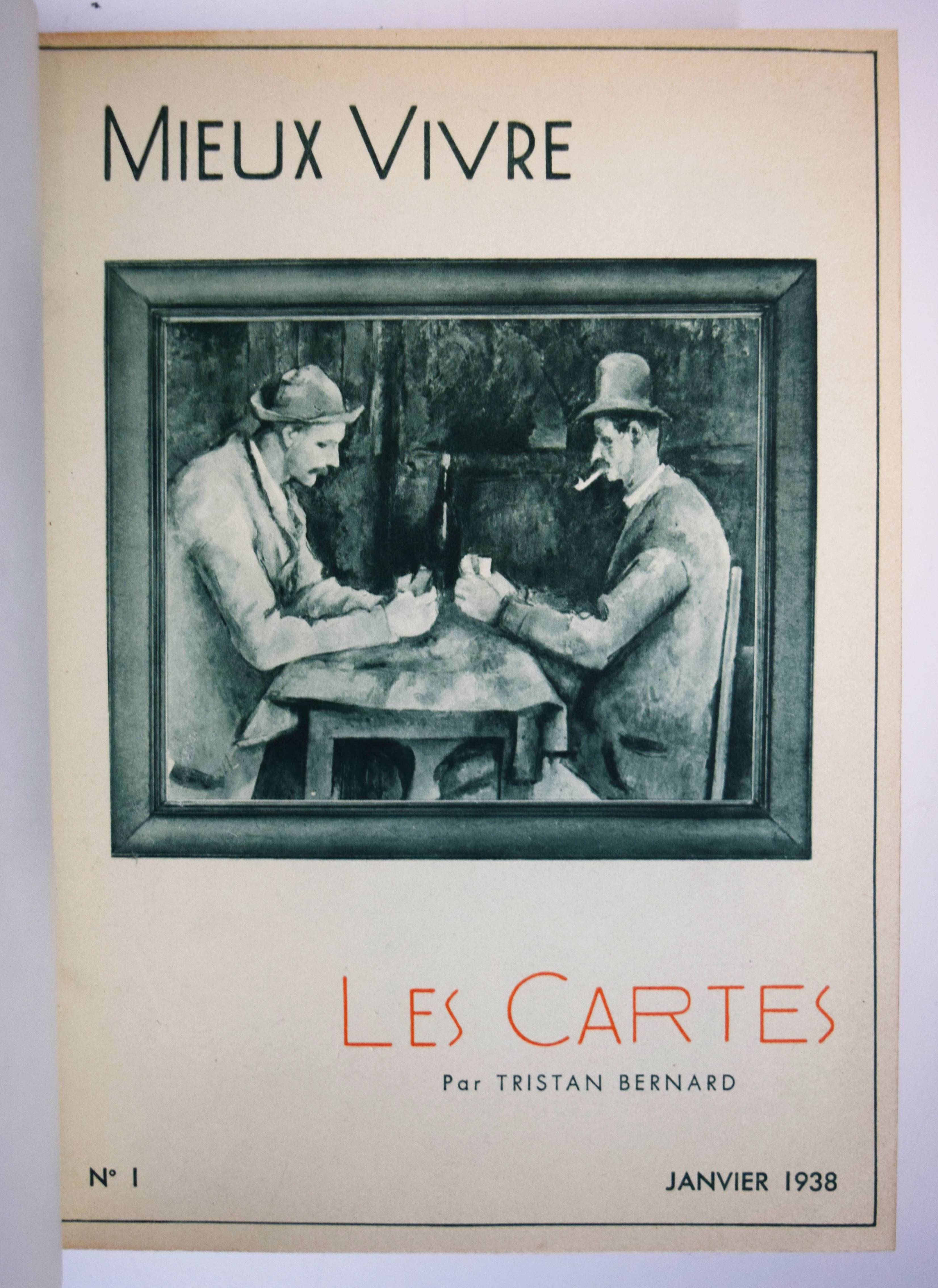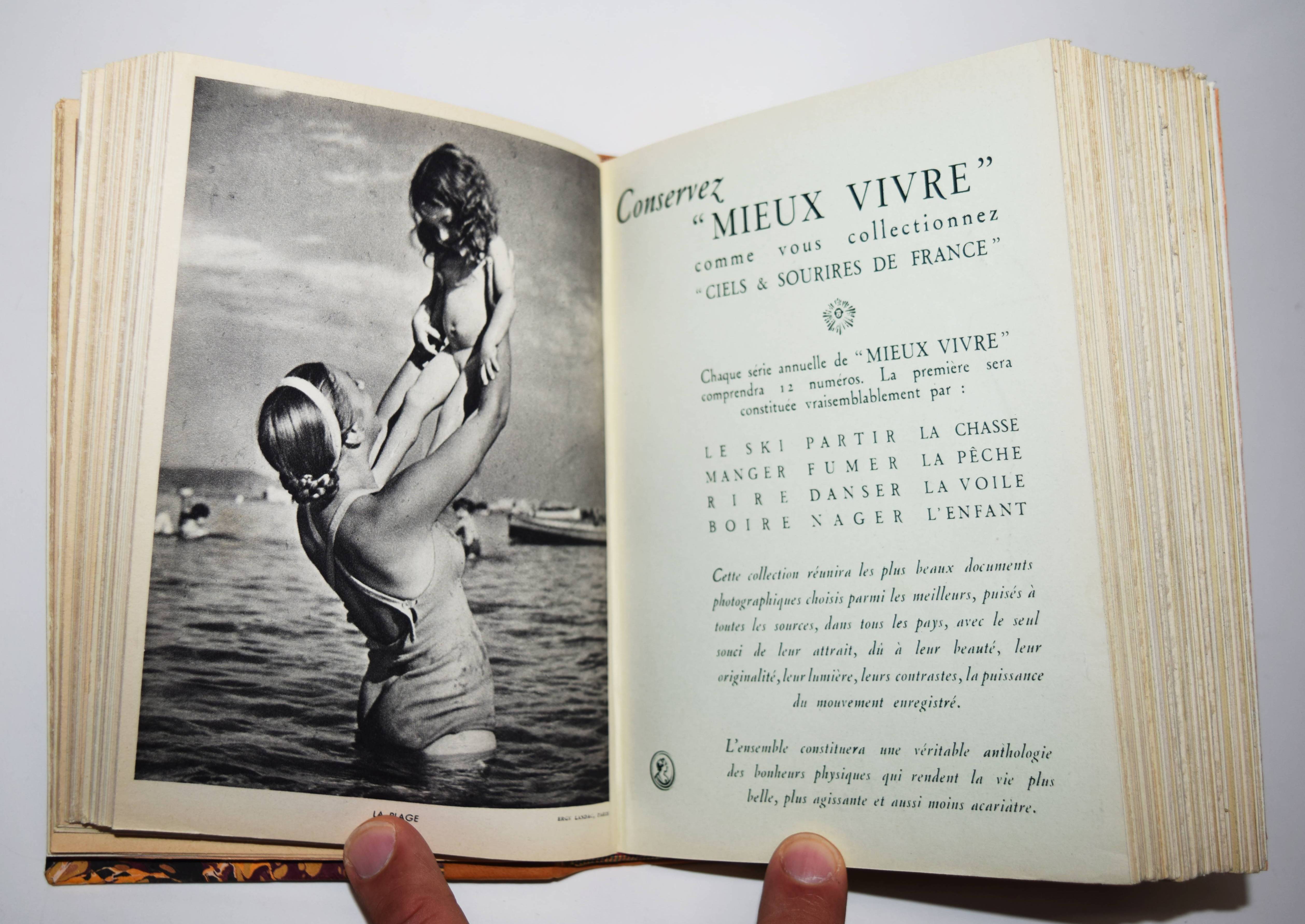 Besson, George (Direction Artistique). Mieux Vivre. Revue mensuelle. (Prémiere à quatrième année, janvier 1936 à septrembre 1939 et un numéro hors-série. 46 fascicules en 2 volumes. Villefranche (Rhône), Socièté Publirex 1936-1939. 8°. Avec de nombreuses illustrations et planches en héliogravure. Reliure en demi-cuir de l’époque avec des étiquettes dorées sur le dos. Série complète de la revue joliment décorée. – Avec des contributions de Marcel Aymé, Tristan Bernard, Jean-Richard Bloch, Francis Carco, Colette, Georges Duhamel, Élie Faure, Louis Guilloux, Francis Jourdain, Paul Léautaud, Georges Lecomte, Charles-Ferdinand Ramuz, Tristan Rémy, Pierre Scize, Emmanuel Sougez, Kees Van Dongen, Maurice de Vlaminck, Charles Vildrac, Henri Wallon et autres. Et avec des photographies de Denise Bellon, Blanc et Demilly, Brassaï, André Kertesz, Ergy Landau, Roger Schall, Emmanuel Sougez, Maurice Tabard, René Zuber et autres. – Chaque cahier traite d’un thème, par exemple: Le Ski, Manger, Boire, Dancer, La Music, Le Football, Les Fleurs, Lire, La Photographie (par Emmanuel Sougez) etc. – Exemplaire très bien conservé et propre. – Complete series of the beautifully decorated magazine. – With contributions by Marcel Aymé, Tristan Bernard, Jean-Richard Bloch, Francis Carco, Colette, Georges Duhamel, Élie Faure, Louis Guilloux, Francis Jourdain, Paul Léautaud, Georges Lecomte, Charles-Ferdinand Ramuz, Tristan Rémy, Pierre Scize, Emmanuel Sougez, Kees Van Dongen, Maurice de Vlaminck, Charles Vildrac, Henri Wallon and others. And with photographs by Denis Bellon, Blanc et Demilly, Brassaï, André Kertesz, Ergy Landau, Roger Schall, Emmanuel Sougez, Maurice Tabard, René Zuber and others. – Each issue deals with a theme, for example: Skiing, Eating, Drinking, Dancing, Music, Football, Flowers, Reading, Photography (by Emmanuel Sougez) etc. – A very well preserved and clean copy.