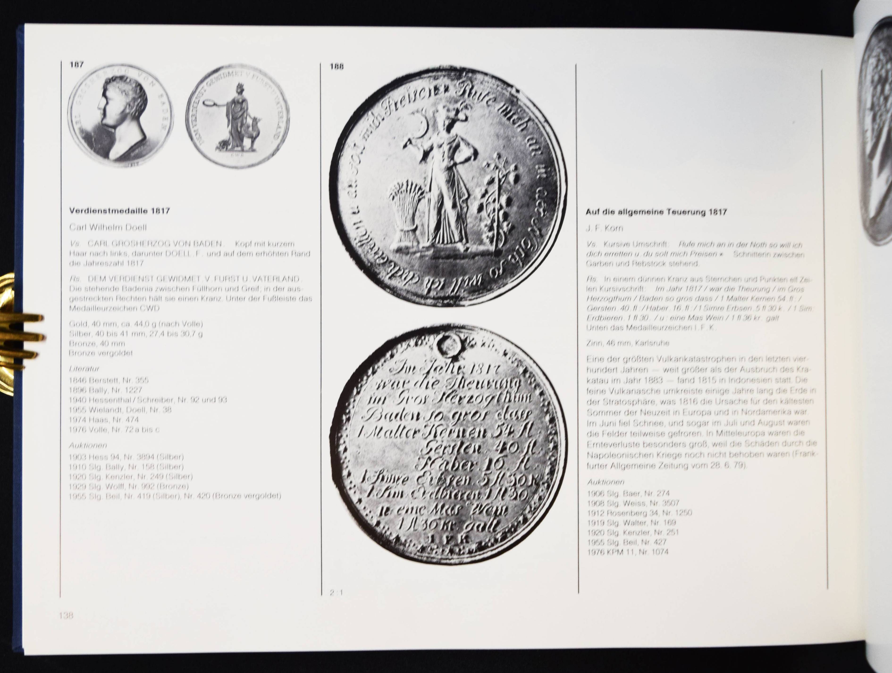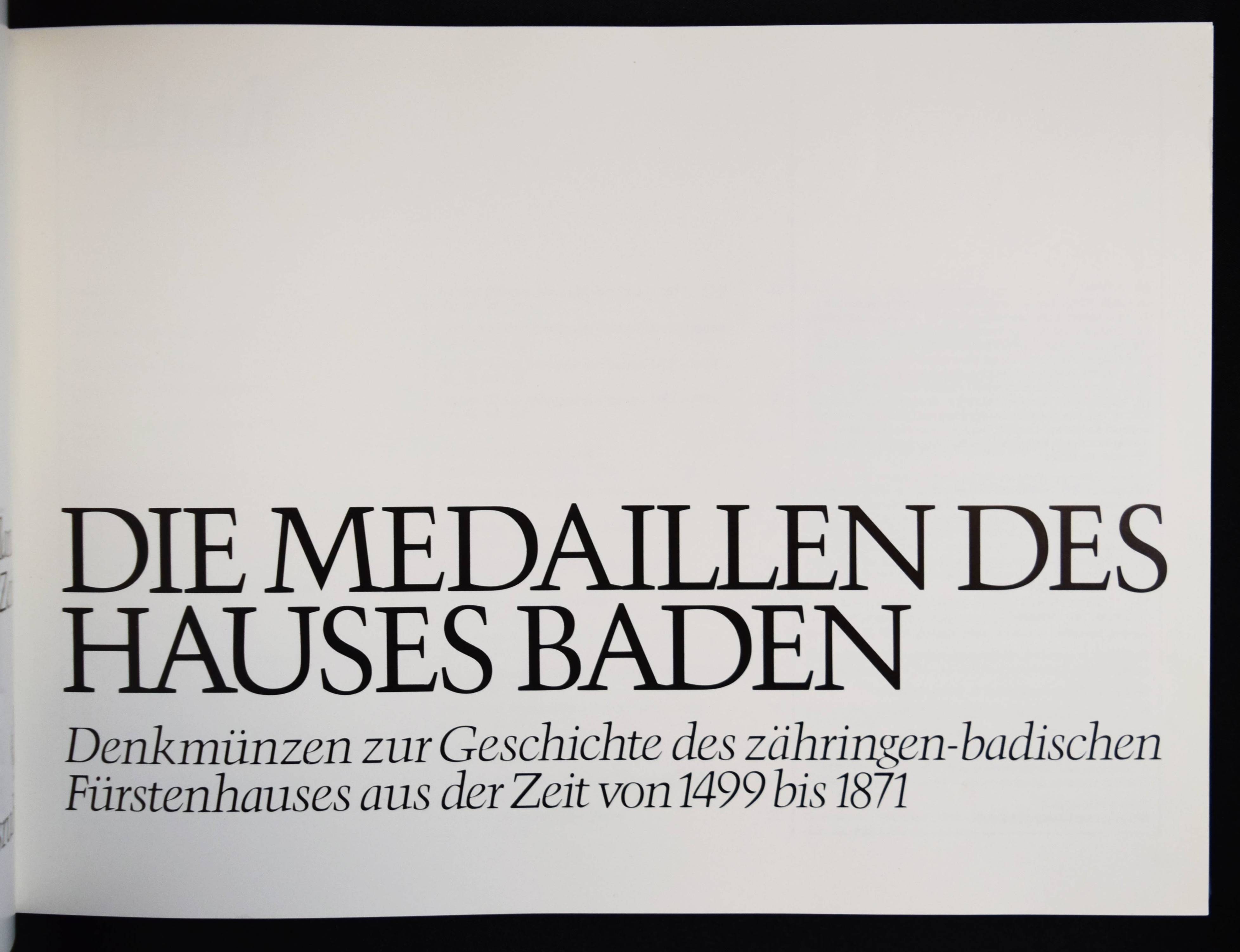 Wielandt, Friedrich und Joachim Zeitz. Die Medaillen des Hauses Baden. Denkmünzen zur Geschichte des zähringen-badischen Fürstenhauses aus der Zeit von 1499 bis 1871. (Karlsruhe, Braun 1980). Quer.-4°. 212 S. mit zahlr. Textabb. und 1 Stammtafel. Orig.-Leinenband. Mit eigenhändiger Widmung von Joachim Zeitz. – Gutes Exemplar.