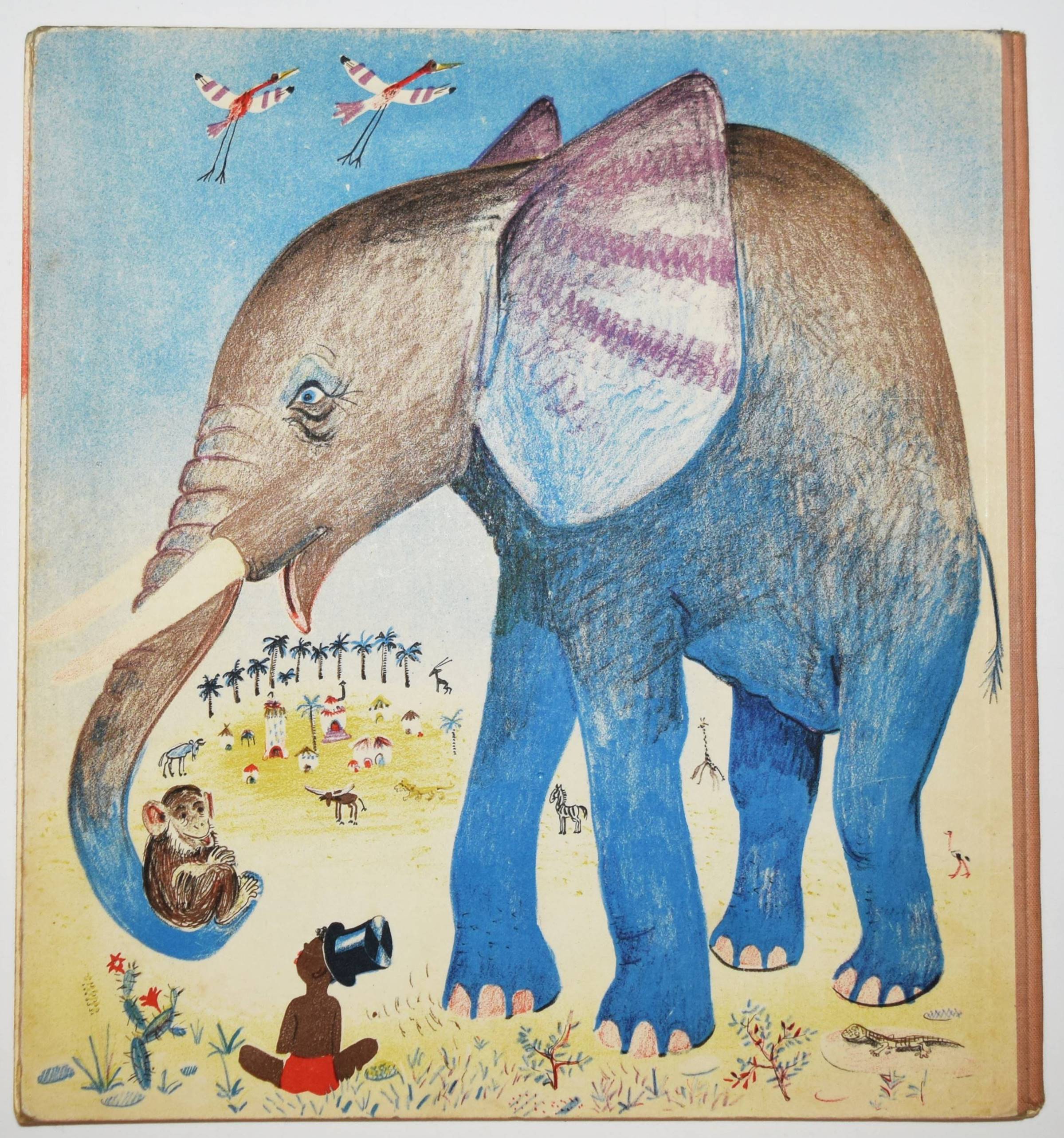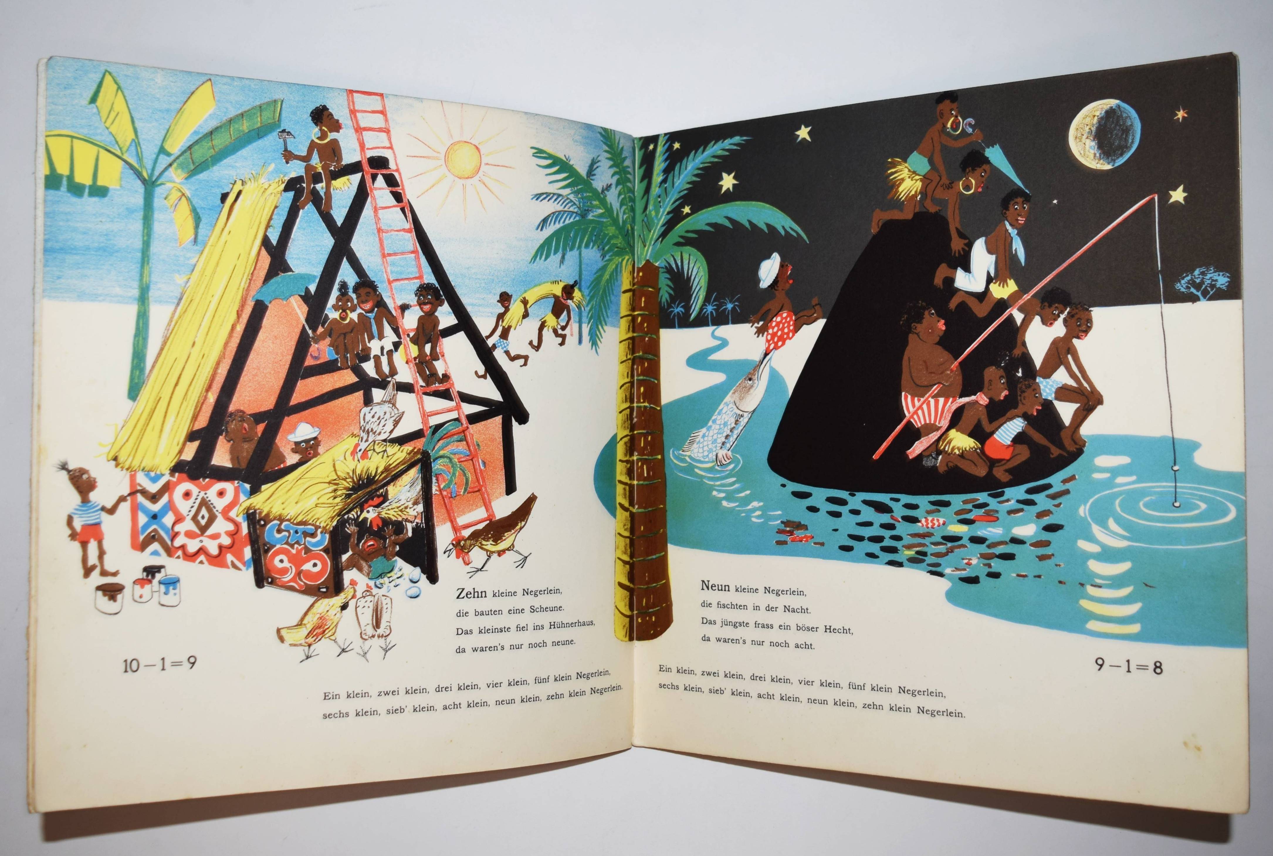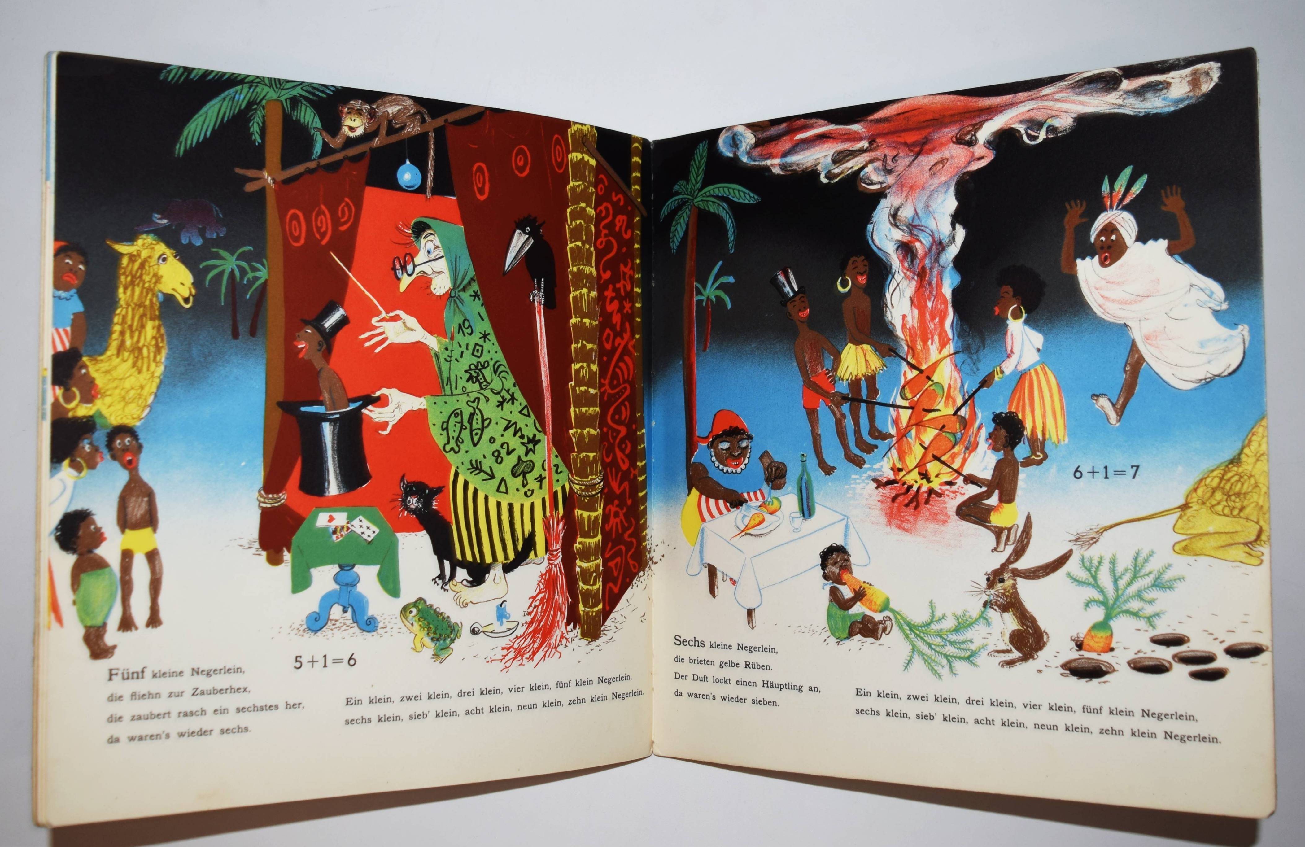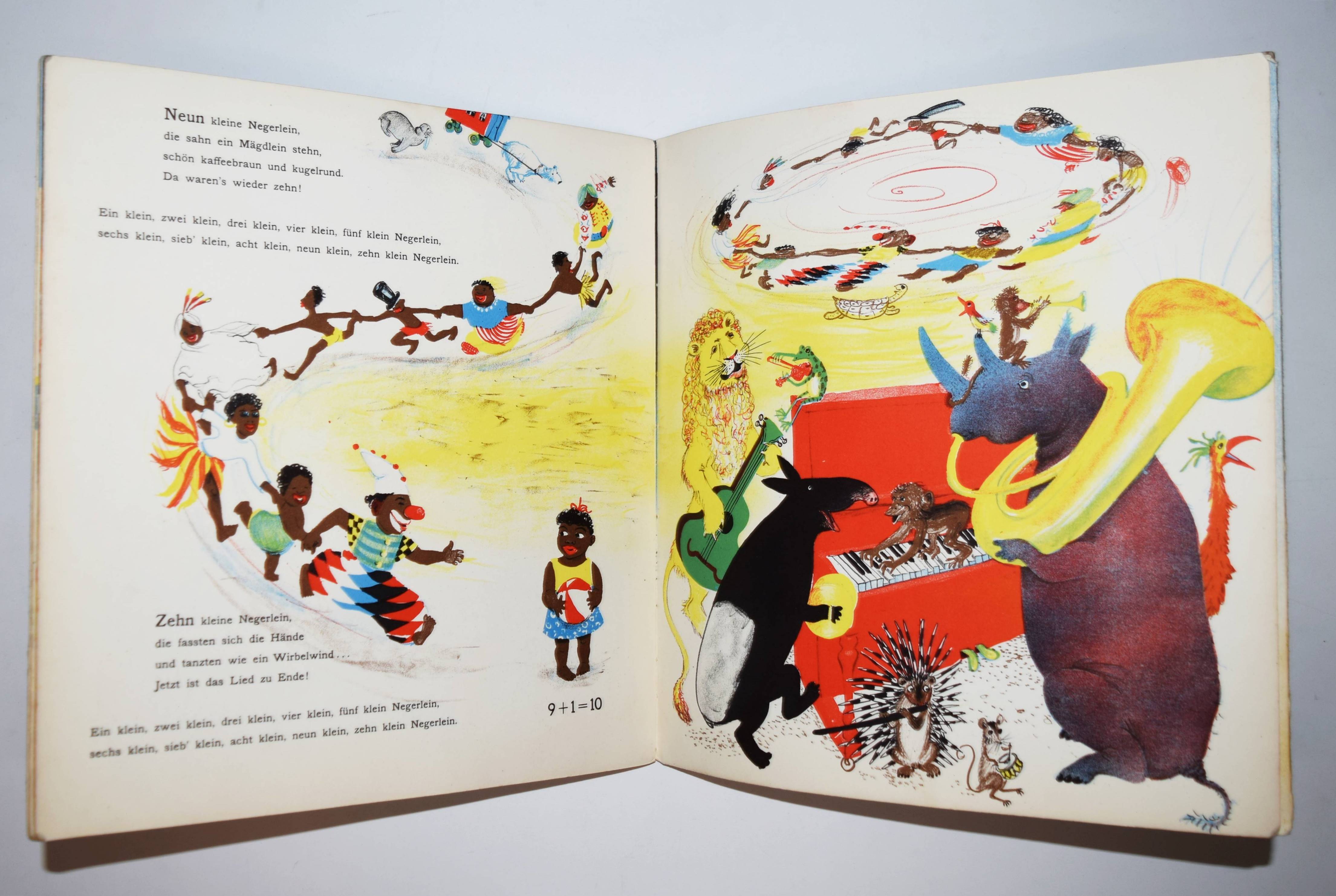 Widmer, Walter. Zehn kleine Negerlein. Bilder von Heinrich Strub. Zürich, Edition Carlit (1950). 4°. 12 Bl. mit farblithogr. Illustrationen. Farbig illustr. Orig.-Halbleinenband. Kaiser S. 90 f. Muck II, 7566. SBI 1115 u. S. 76. – Erste Ausgabe. – Versuch einer nicht diskriminierenden Version des bekannten Kettenverses. – „Strub’s „Negerlein“, however black, actually are nothing else but disguised Swiss contemporaries. Elements such as painted lips and eyes, large earrings, and the masses of rings around the neck are hardly exotic or tropical – they are clearly inspired by fashion caricature of the forties (″Schoenenbergerli“). Strub spoils the reader with multitude of visual effects and inventions such as the animal-band which accompanies the tale and presents it as a ballad (″Schnitzelbank“).“ (M. Kaiser). – Kanten und Ecken etwas bestoßen und berieben, vereinzelt etwas fingerfleckig, gutes Exemplar.