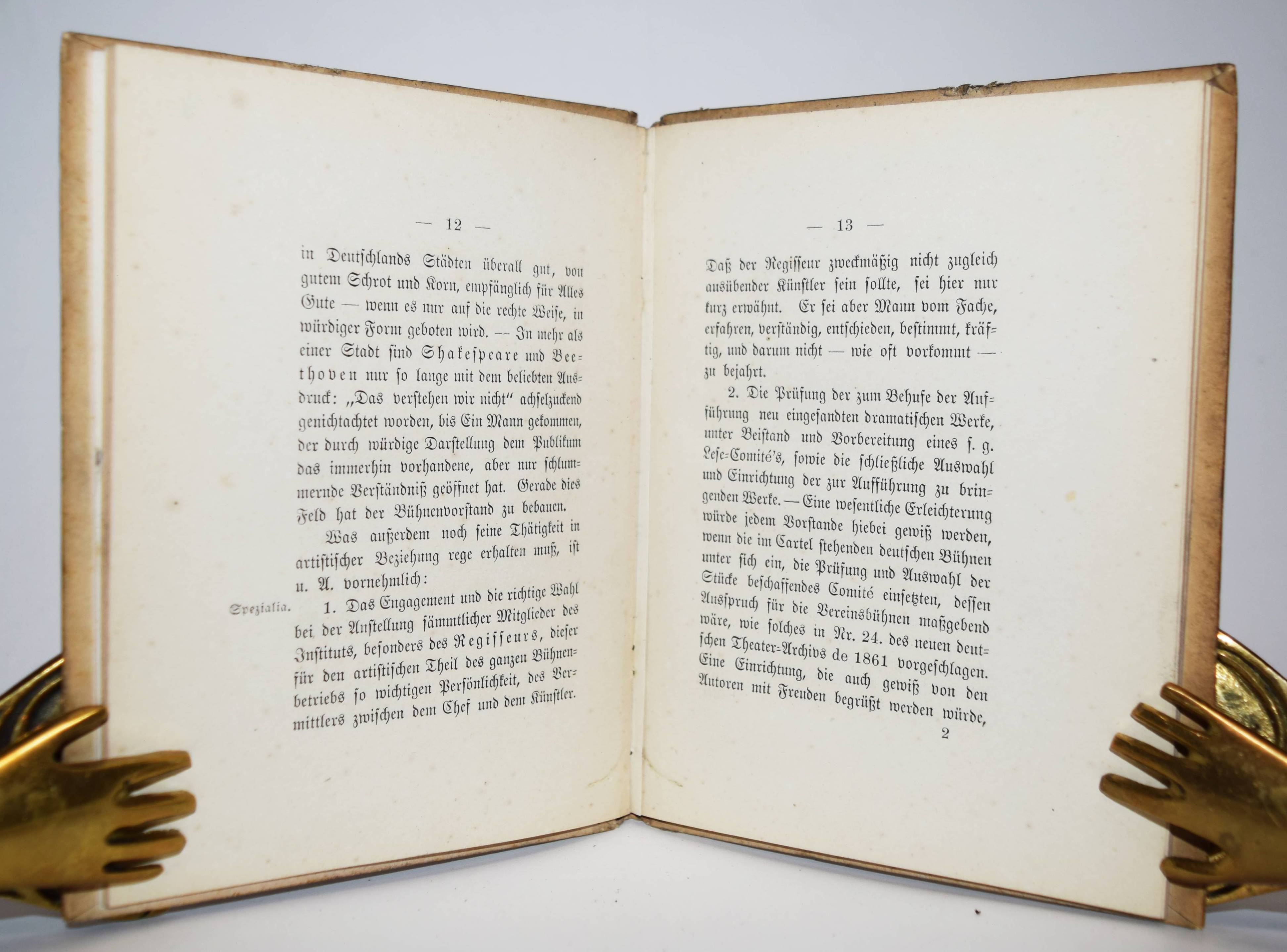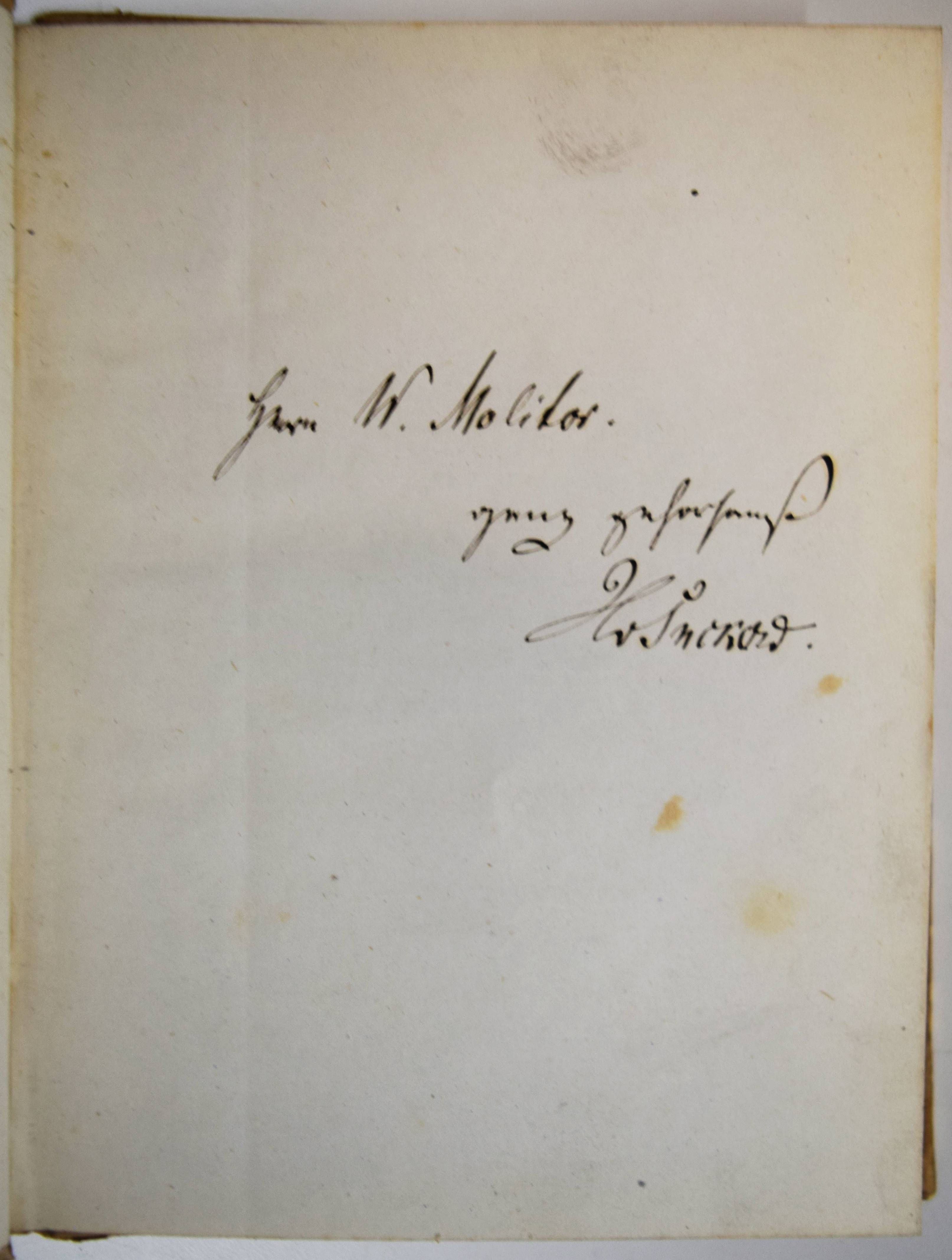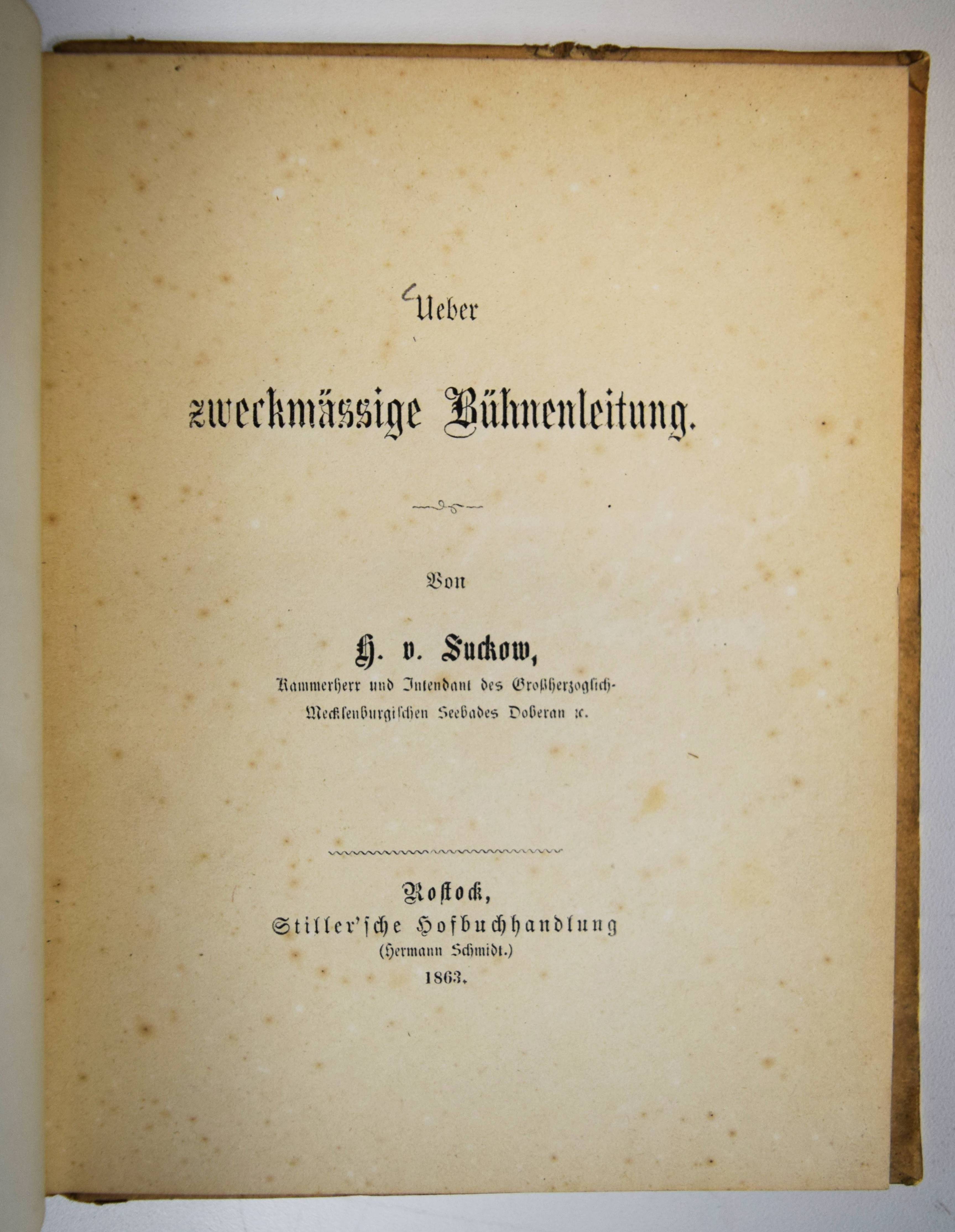 Suckow, H(ermann Ernst Adolf Wilhelm) v. Ueber zweckmäßige Bühnenleitung. Rostock, Stiller 1863. Kl.-8° (15,5 x 11,5 cm.). 42 S. Typogr. Orig.-Pappband. Grewolls, Wer war wer in Mecklenburg und Vorpommern S. 9927. – Erste Ausgabe der ersten und einzigen Buchveröffentlichung. – Mit eigenhändiger Widmung von H. v. Suckow für den Pfälzer Dichter Wilhelm Molitor (1819-1880). – H. v. Suckow (1820-1895), Großherzoglich Mecklenburg-Schwerinscher Kammerherr und Intendant des Seebads Heiligendamm, besuchte 1864 Bischof Nikolaus von Weis in Speyer. Infolge seiner Unterredung mit dem Bischof legte er in Speyer das katholische Glaubensbekenntnis ab. Hier widmete er wohl auch das vorliegende Buch dem Pfälzer Theologen und Dichter W. Molitor. – Einband angestaubt, Vorderdeckel mit Bibliotheks-Signatur, sonst gut erhalten.