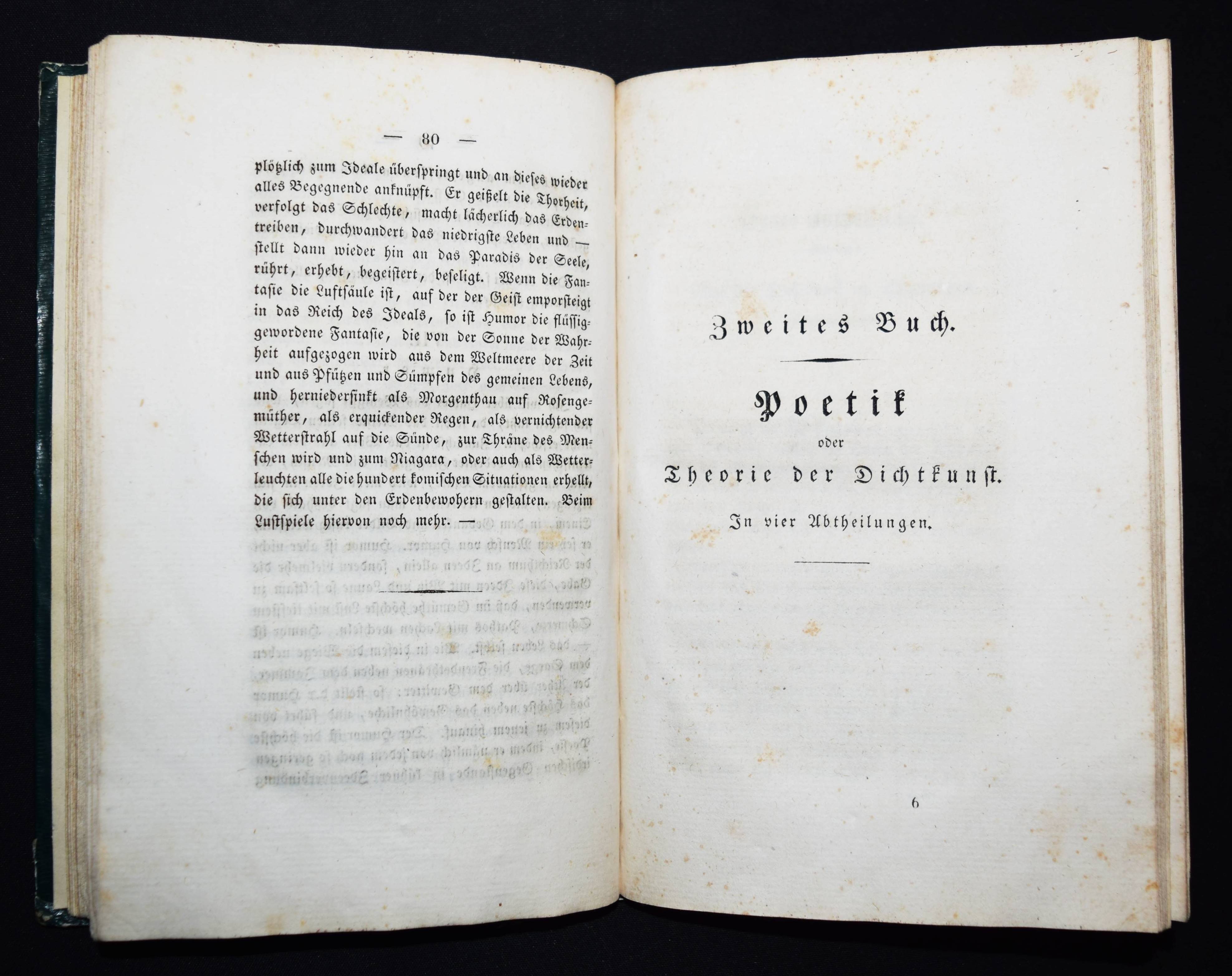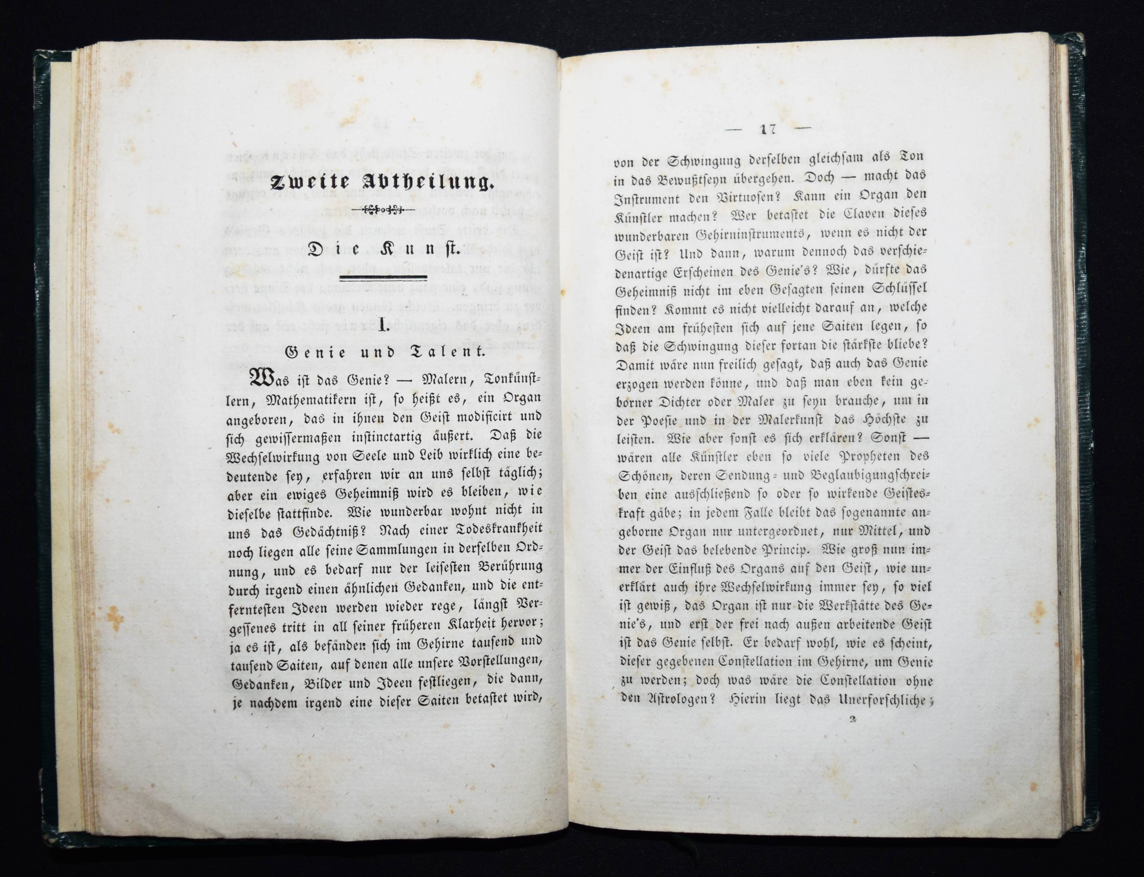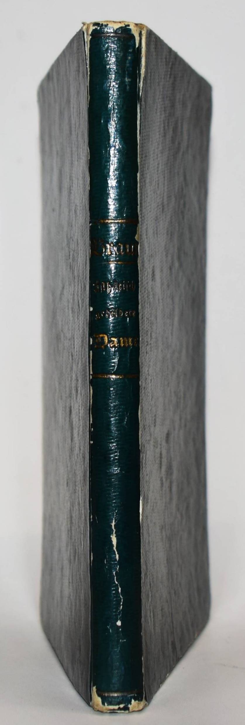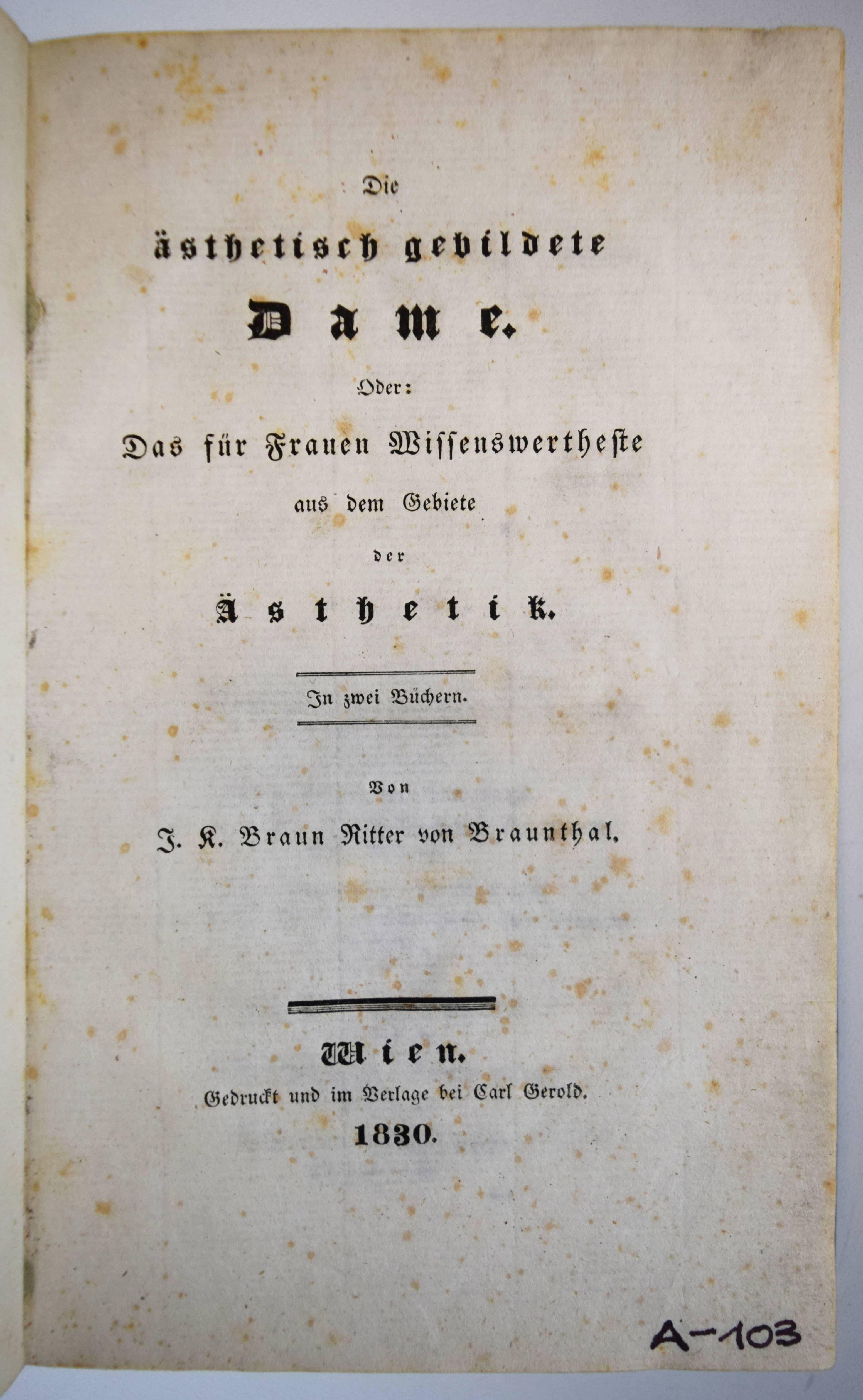 Braun von Braunthal, Karl Johann. Die ästhetisch gebildete Dame. Oder das für Frauen Wissenswertheste aus dem Gebiete der Ästhetik. In zwei Büchern. 2 Teile in 1 Band. Wien, Carl Gerold 1830. 8°. XII, 127, (1) S. Pappband der Zeit mit goldgepr. Rückentitel. NDB II, 557 f. – Erste Ausgabe. – Seltene Ästhetik für Frauen mit einer interessanten Einleitung zur Stellung der modernen Frau, die zwar noch nicht alle von Hippel geforderten Rechte genieße, aber bereits viel mehr Möglichkeiten zur Bildung habe, als noch im 18. Jahrhundert. – Der österr. Schriftsteller K. J. Braun v. Braunthal (1802-1866) „hat sich auf allen literarischen Gebieten umgesehen, z. T. mit starkem Publikumserfolg, als (religiöser) Lyriker wenig originell aber nicht unecht, als Dramatiker eigenwillig und mit unrecht vergessen (Faust 1836 – Don Juan 1842). Als Autor gesellschaftskritischer Romane mit grellen, auch erotischen Effekten, ist er der einzige österreichische Weggefährte des „Jungen Deutschland“ (Donna Quixote, oder Leben und Meinungen einer scharfsinnigen Edlen aus Jungdeutschland, 1844 u. a.). Traurige Berühmtheit erlangte der menschlich nicht sympathische Literat durch seine (Zensur-) Affaire mit ?Anastasius Grün (Spaziergänge eines Wiener Poeten) und seine eitle kritische Ablehnung Goethes, Schillers, Lessings und Mozarts. B. schrieb auch das Textbuch zu Conradin Kreutzers „Nachtlager von Granada“ (1844)“ (Kurt Vancsa in NDB). – Gelenke und Kanten etwas berieben, N.a.V., stellenweise etwas braunfleckig.