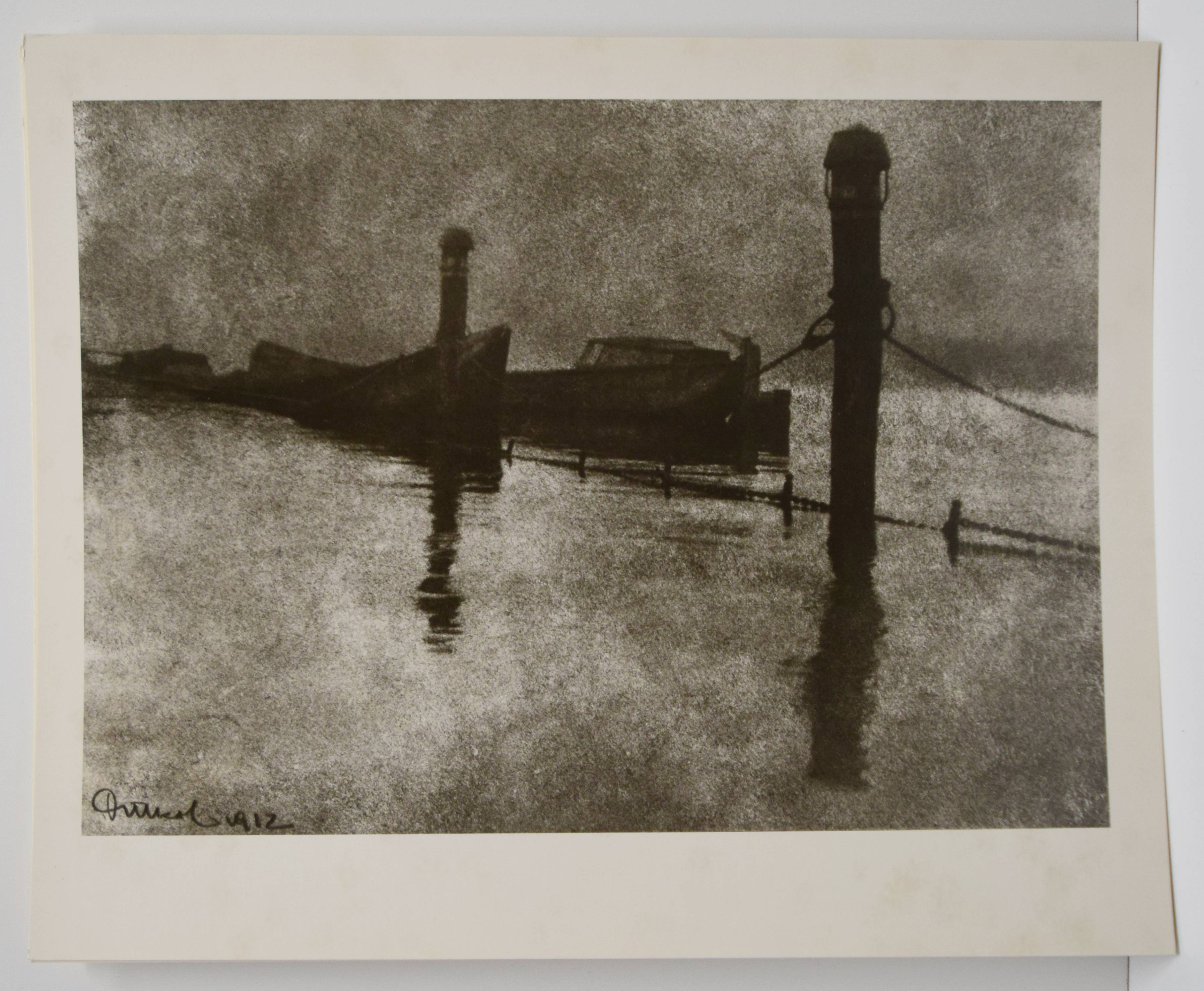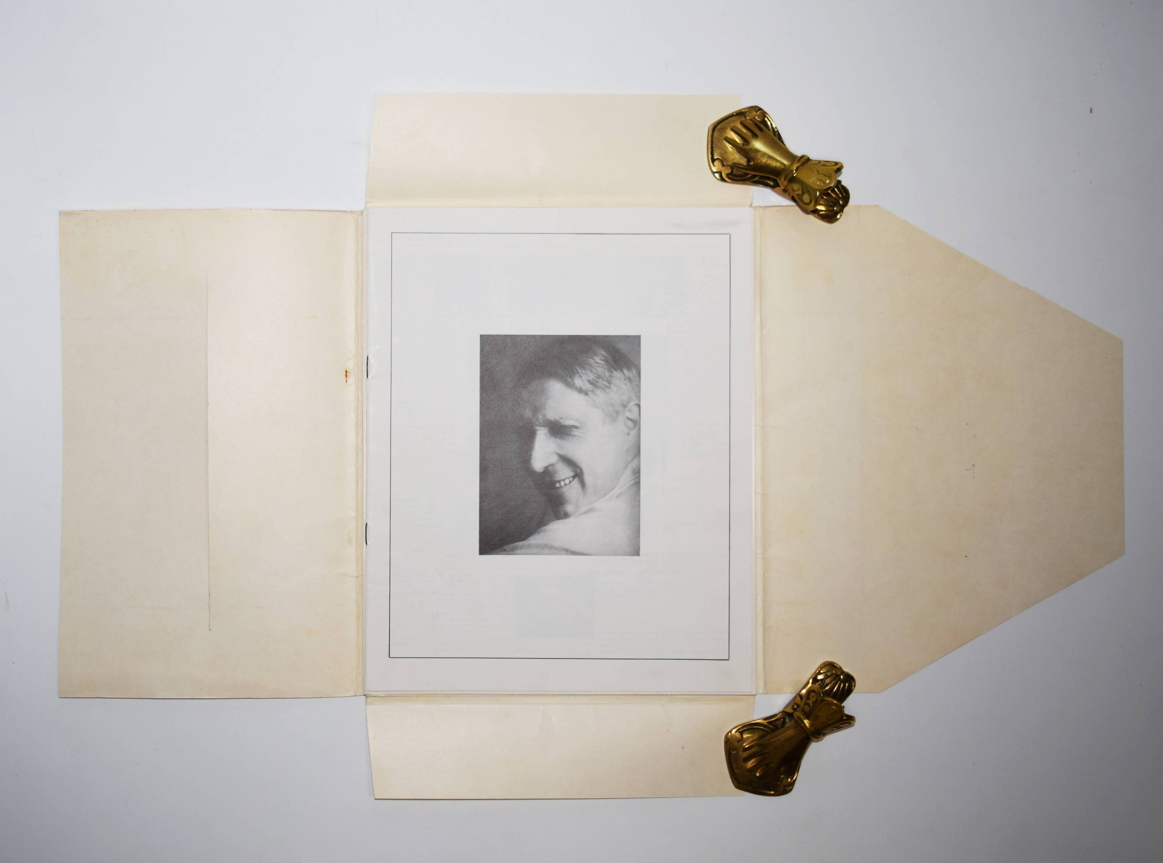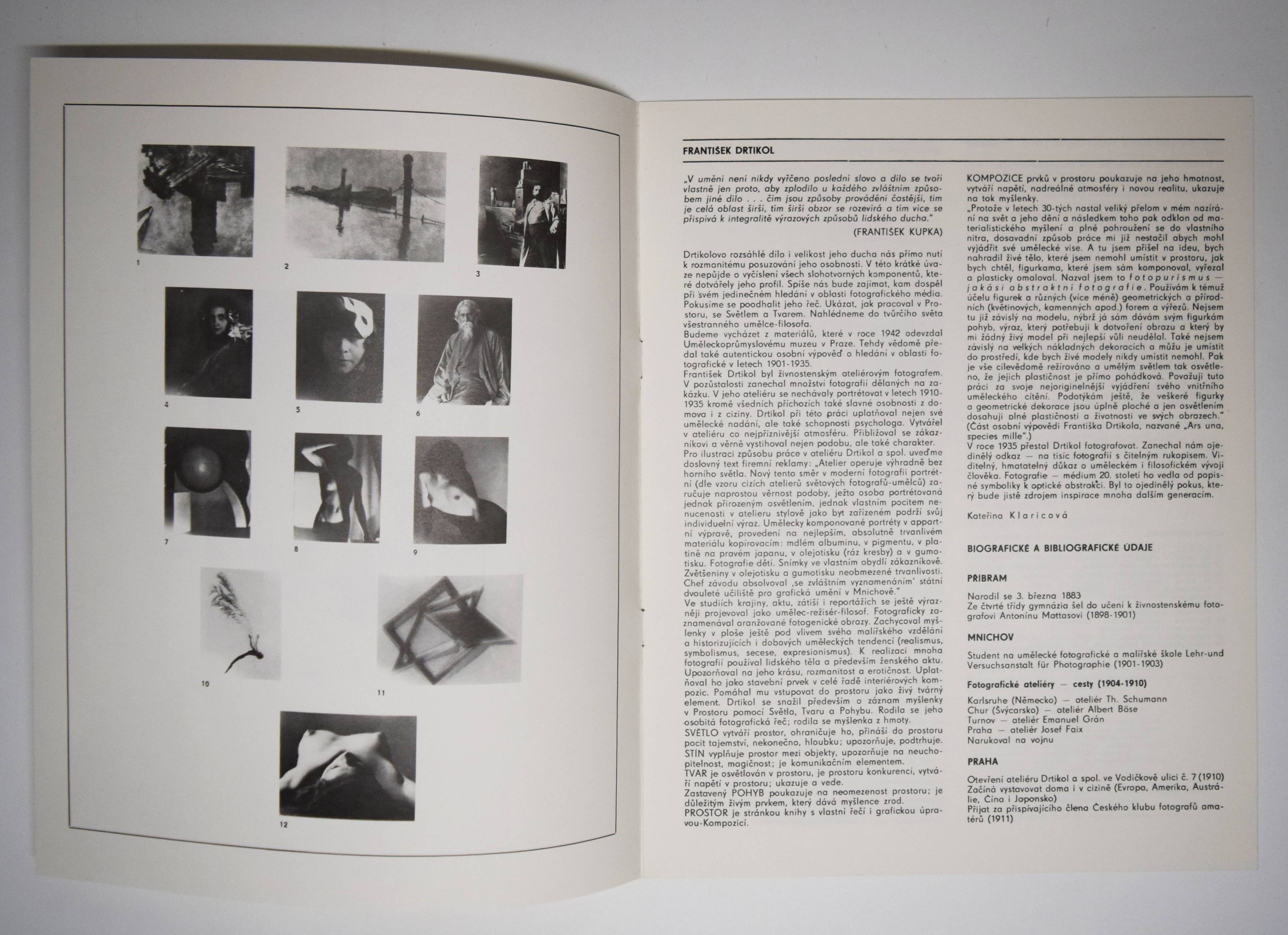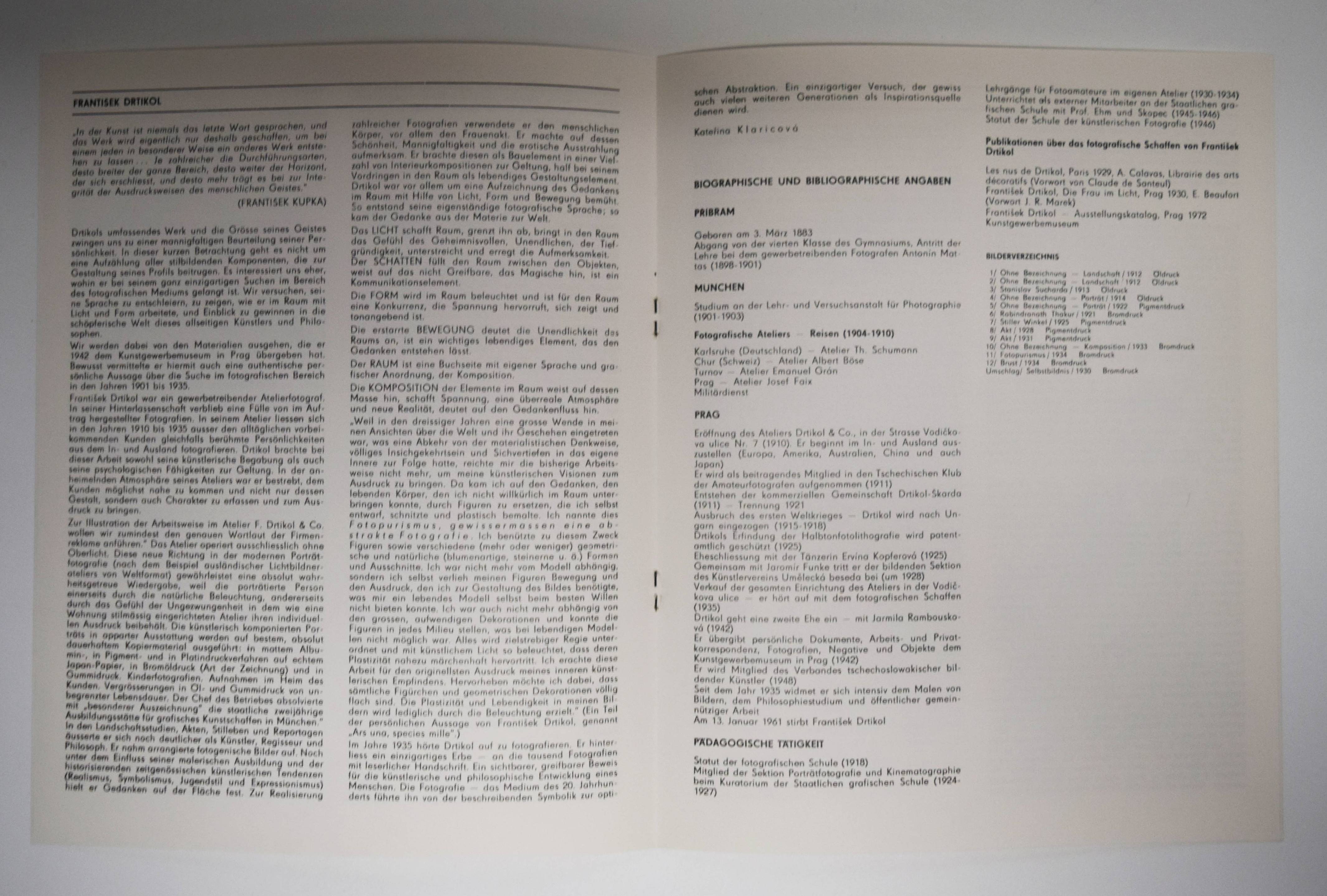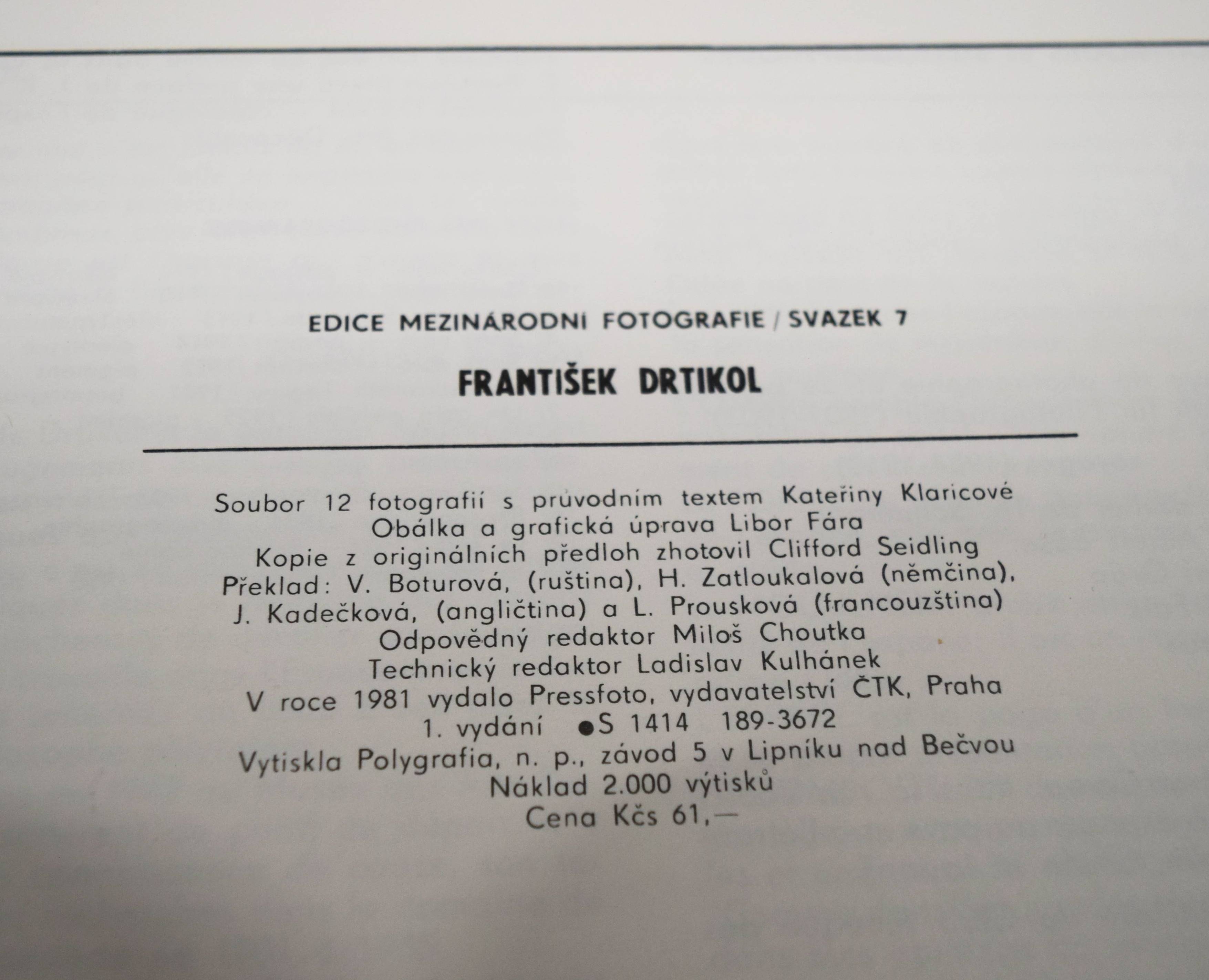 Drtikol – Klaricové, Kateriny. František Drtikol. (Saubar 12 fotografii s pruvodnim textem Kateriny Klaricové, Grafický návrh Libor Fara). Praha, Pressfoto (1981). 4°. Portfolio, [12] p. and 12 photographs in oil print (1-4), pigment print (5, 7, 8) and bromoprint (6, 10-12). Illustrated original wing folder (Self-portrait, 1930, bromoprint). (Edice mezinárodní fotografie, 7). Vgl. Koetzle, Fotografen A-Z 102. Nicht bei Heiting, Czech and Slovak Photo Publications 1918-1989. – Texts in Czech, Russian, German, English and French. – With the photographs: 1. Without title – landscape, 1912. – 2. Without title – landscape, 1912. – 3. Stanislav Sucharda, 1913. – 4. Without title – portrait, 1914. – 5. Without title – portrait, 1922. – 6. Rabindranath Thakur, 1921. – 7. Quit Corner, 1925. – 8. Nude Study, 1928. – 9. Nude Study, 1931. – 10. Without title – composition, 1933. – 11. Photopurismus, 1934. – 12. Breast, 1934. – „Drtikol studied photography in Munich, and set up a highly commercial studio in Prague in 1910, specializing in portraits and nudes. ‚Zena ve svetle‘ is a typical of his Art Deco phase, and just as Art Deco proper derived from Art Nouveau, the photographer’s earlier nudes were Photo Secessionist in style, favouring heavily worked bromoil and gum prints. The only thing that changed when he went ‚modernist‘ was the creation of geometrically shaped plywood sets composed of angular and circular forms, which he lit dramatically with a single arc lamp. He shot his models from dynamic viewpoints, and sometimes his imagery plays arround with mock-Cubist effects, but usually he gives us the style rather than the substance of modernism. … Drtikol remained a consistent and obsessive photographer of the female nude, his artistic persona managing to convey both a muscular heterosexuality and a formalist asexuality. These are quite clearly ‚artistic‘ nudes, and remain extremely popular to this day“ (Parr/Badger zu „Zena ve Svetle“). – „Paradox muss erscheinen, dass sich unter jenen, die auf dem Weg am sezessionistischen Piktorialismus zur Avantgarde am weitesten vordrangen, Frantisek Drtikol befindet, der in den 20er Jahren häufig für einen konservativen Vertreter des Symbolismus und der Sezession gehalten wurde. Heute sehen wir, dass Drtikol, obwohl im Radikalismus und linke Utopien der meisten Avantgarde-künstler ebenso fremd waren wie ihre Neigung zum Experiment, in vielen seiner Werke der Avantgarde näher stand, als deren Vertreter bereit waren zuzugeben“ (V. Birgus in Koetzle). – Flügelmappe etwas angestaubt, sonst gut erhalten. – Folder slightly dusty, otherwise in good condition.