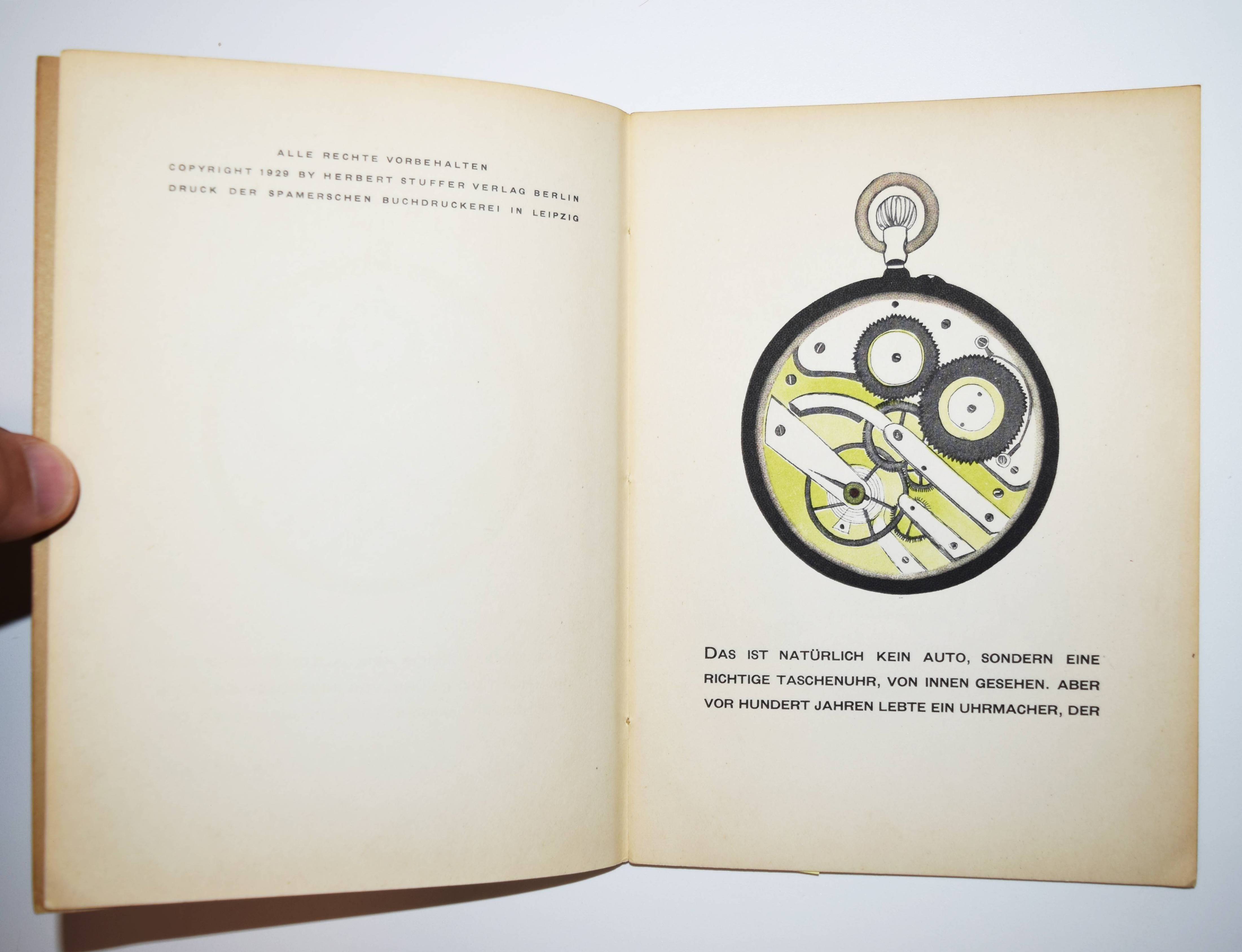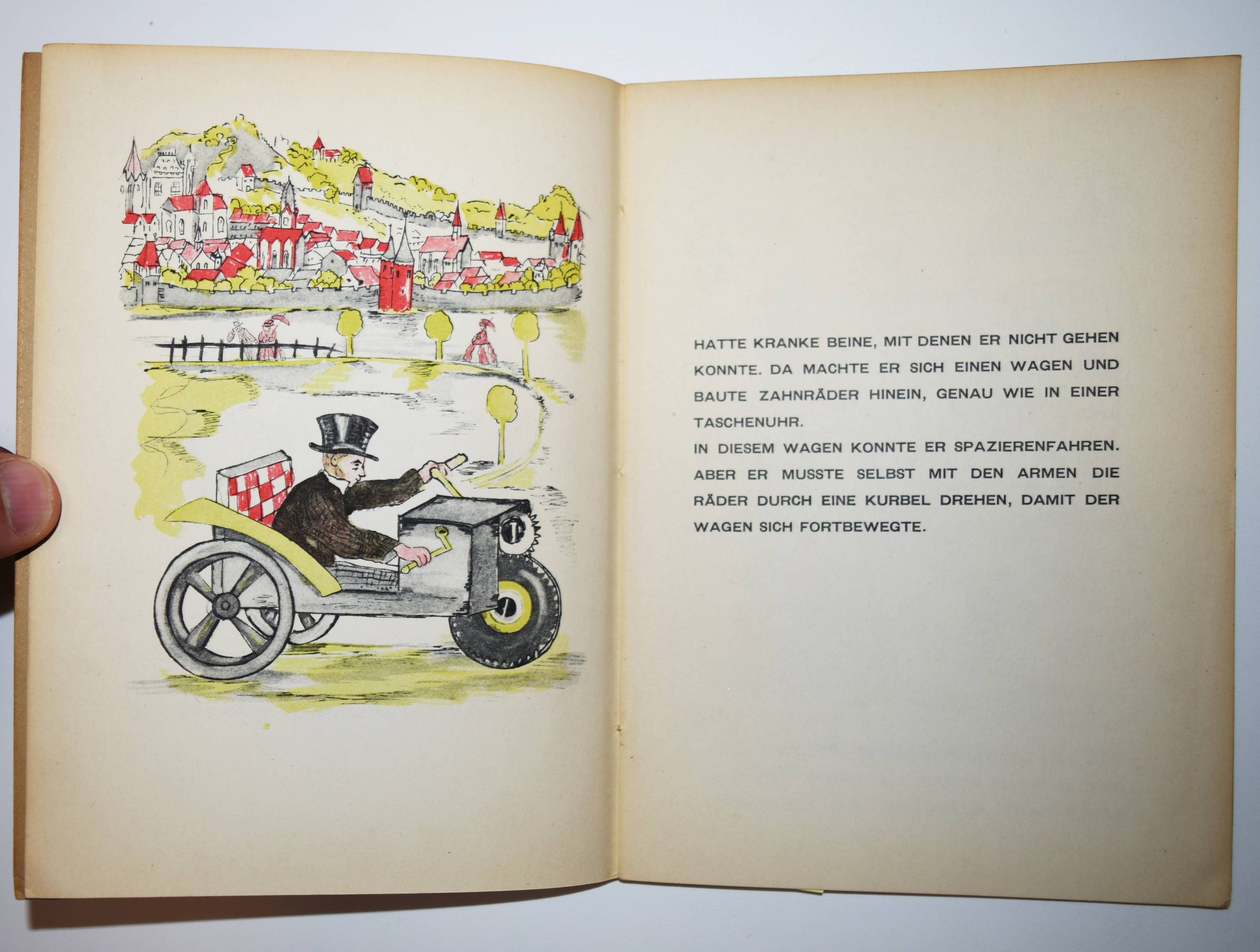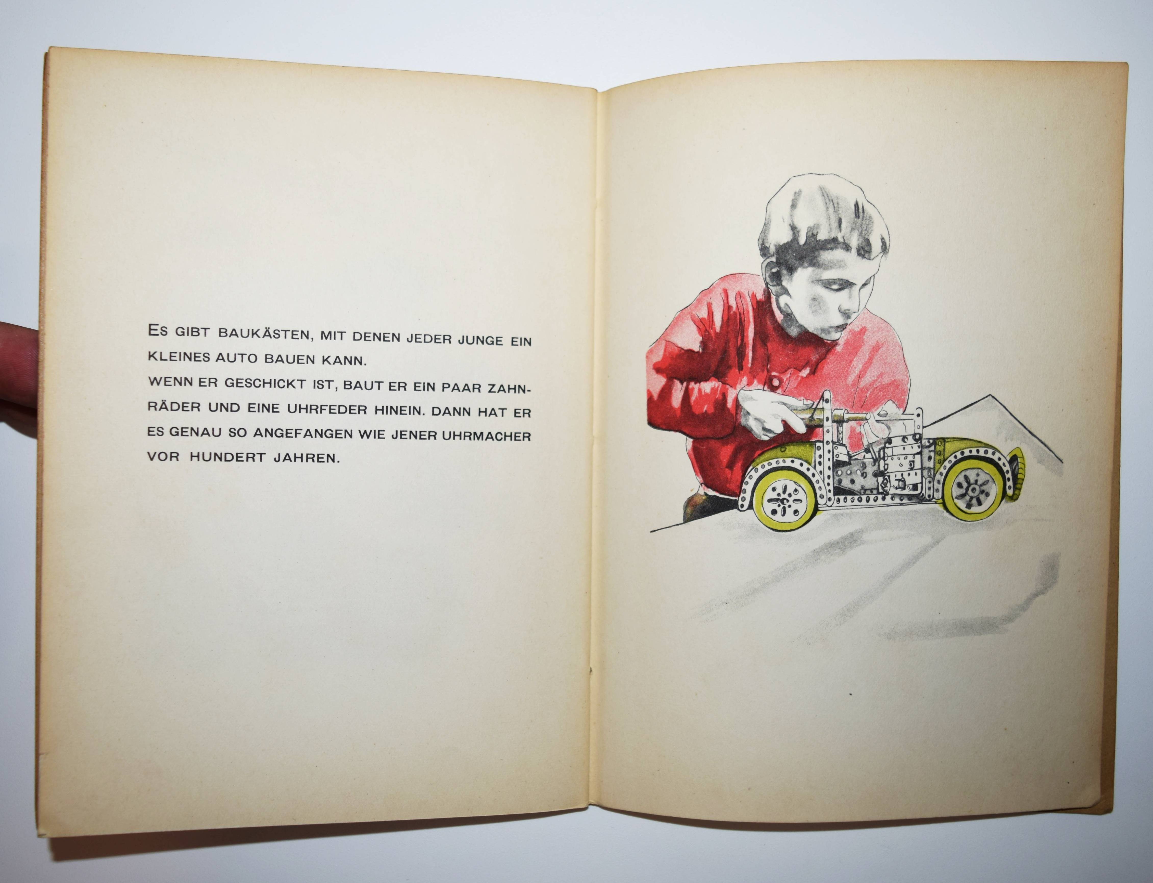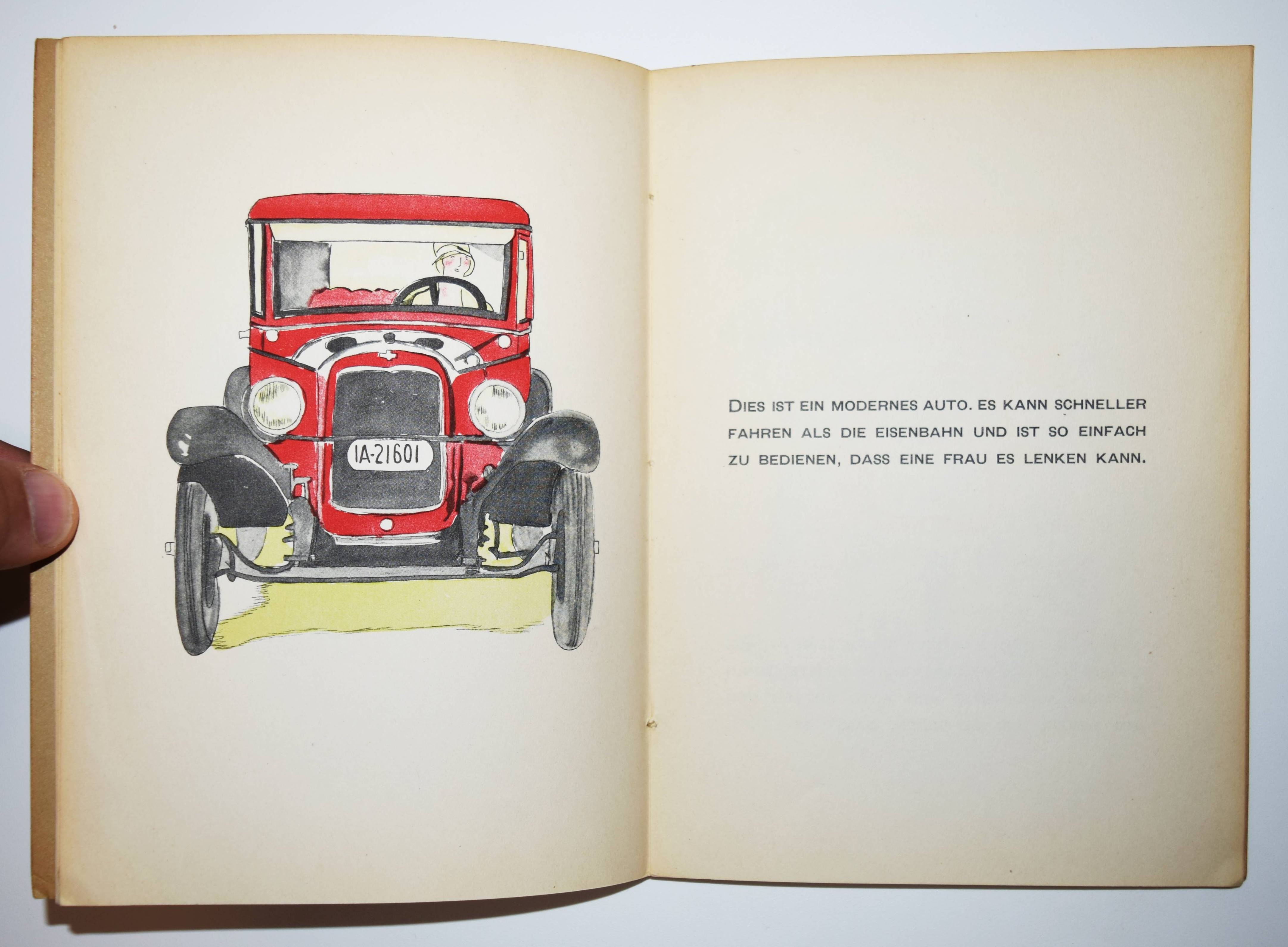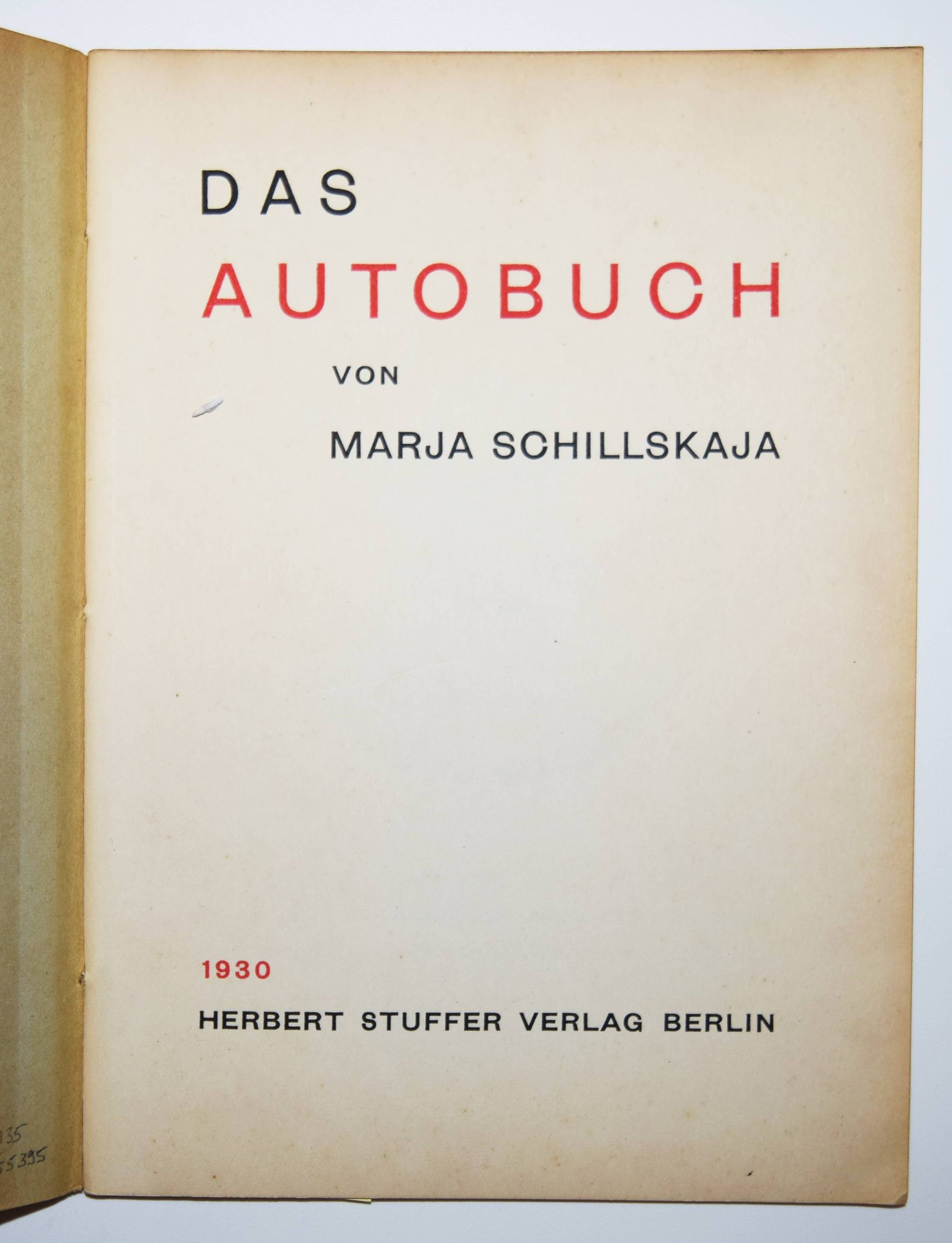 Schillskaja, Marja. Das Autobuch. Berlin, Herbert Stuffer 1930. octavo. [12] Bl mit 12 (10 ganzs., 11 farb.) Illustrationen. Farbig illustr. Orig.-Pappband. Murken, Stuffer 8. Stuck-Villa II, 287 (beide abw. 20 S.). – Einzige Ausgabe, selten. – Eine kleine Entwicklungsgeschichte des Autos für Kinder. – „Auch ohne daß man den Namen der Malerin und Verfasserin, Maria Schillskaja, nennt, lenkt „Das Autobuch“ die Gedanken der Betrachter zurück auf die Ausstellung russischer Kinderbücher, die vor zwei Jahren bei uns gezeigt wurde (vgl. „Kindergarten“, Juni 1928). „Sachlichkeit“ hier wie dort; auch das „Aurobuch“ mutet uns zunächst fremd an, doch man sieht sich hinein wird gefangen von den nach Art kindlicher Tuschversuche kolorierten Federzeichnungen, blättert und kehrt zurück zu dem Bilde des Motorpfluges auf dem Felde“ (Margot Melchior in Kindergarten, 71. Jahrgang, Nr. 2, Leipzig 1930, S. 56). – „Der moderne Ansatz, Kindern Anderes zu bieten als altvertraute Geschichten und liebliche Bildchen, wurde honoriert: Der Verleger machte sich rasch einen guten Namen in der Bilderbuchszene“ (B. Murken). – „Stuffer war bekannt für seine fairen Konditionen, seine intensive Zusammenarbeit mit den Autoren und den pflegsamen Umgang mit seinen Projekten, bis hin zu den sorgfältig gestalteten Verlagsprospekten. Mit einem sicheren Gefühl für Originalität und künstlerische Leistung verpflichtete er vor allem zeitgenössische Autoren und Illustratoren“ (H. Karrenbock, Kinder- und Jugendbuchverlage. In: Geschichte des deutschen Buchhandels im 19. und 20. Jahrhundert, Band 2 Weimarer Republik. Berlin 2012, S. 210). – Rücken etwas berieben, Deckel angestaubt, sonst gut erhalten.