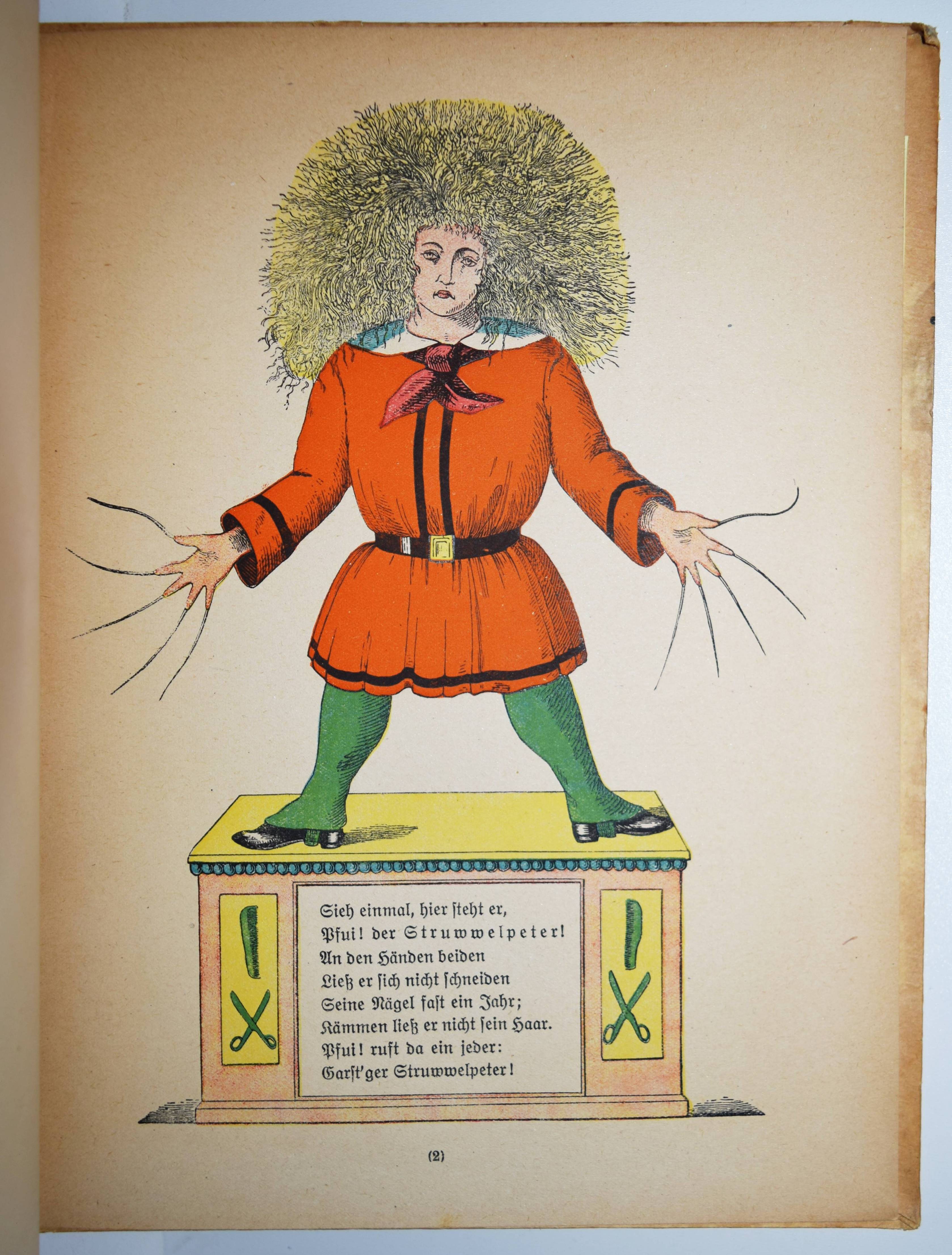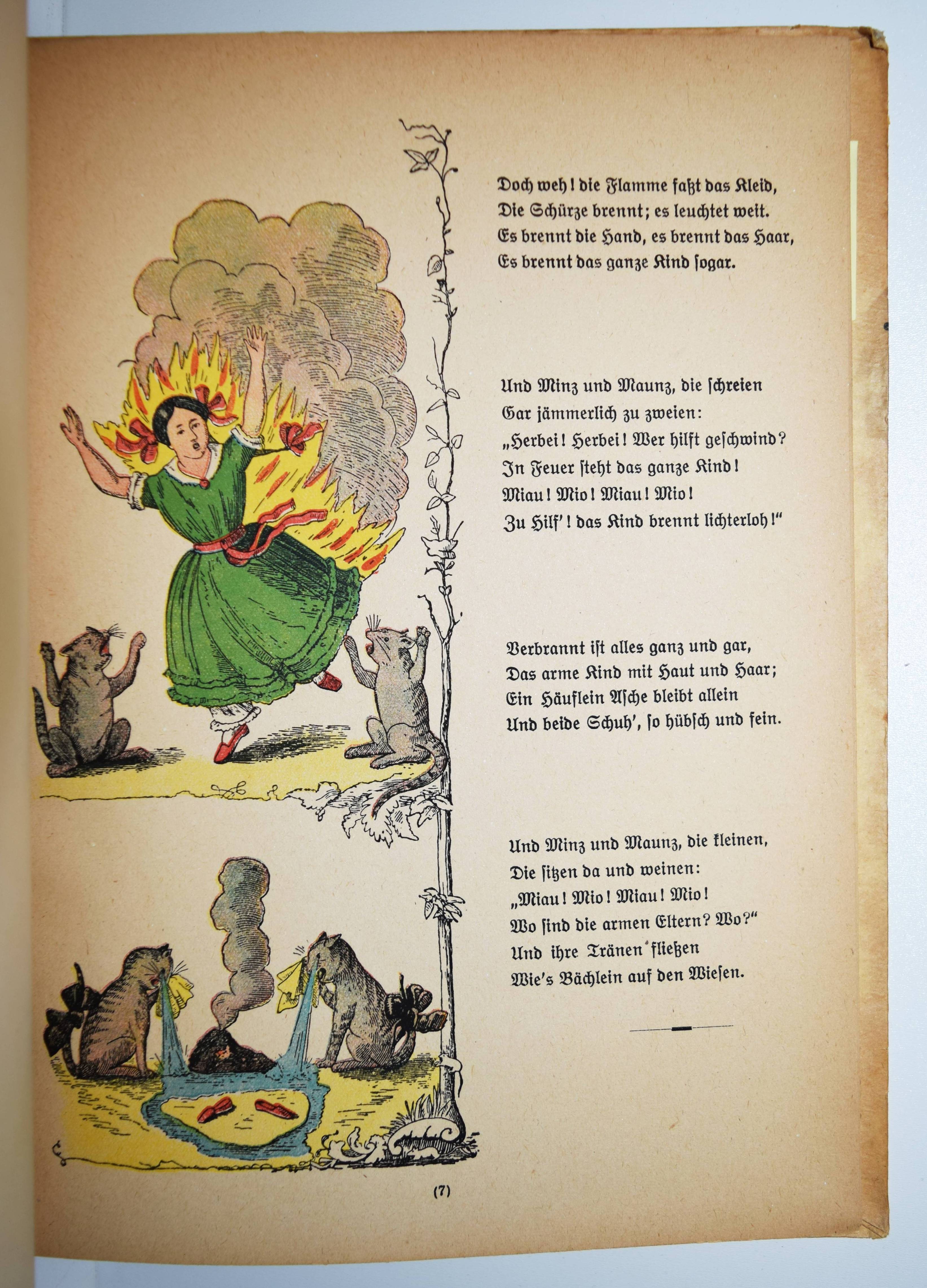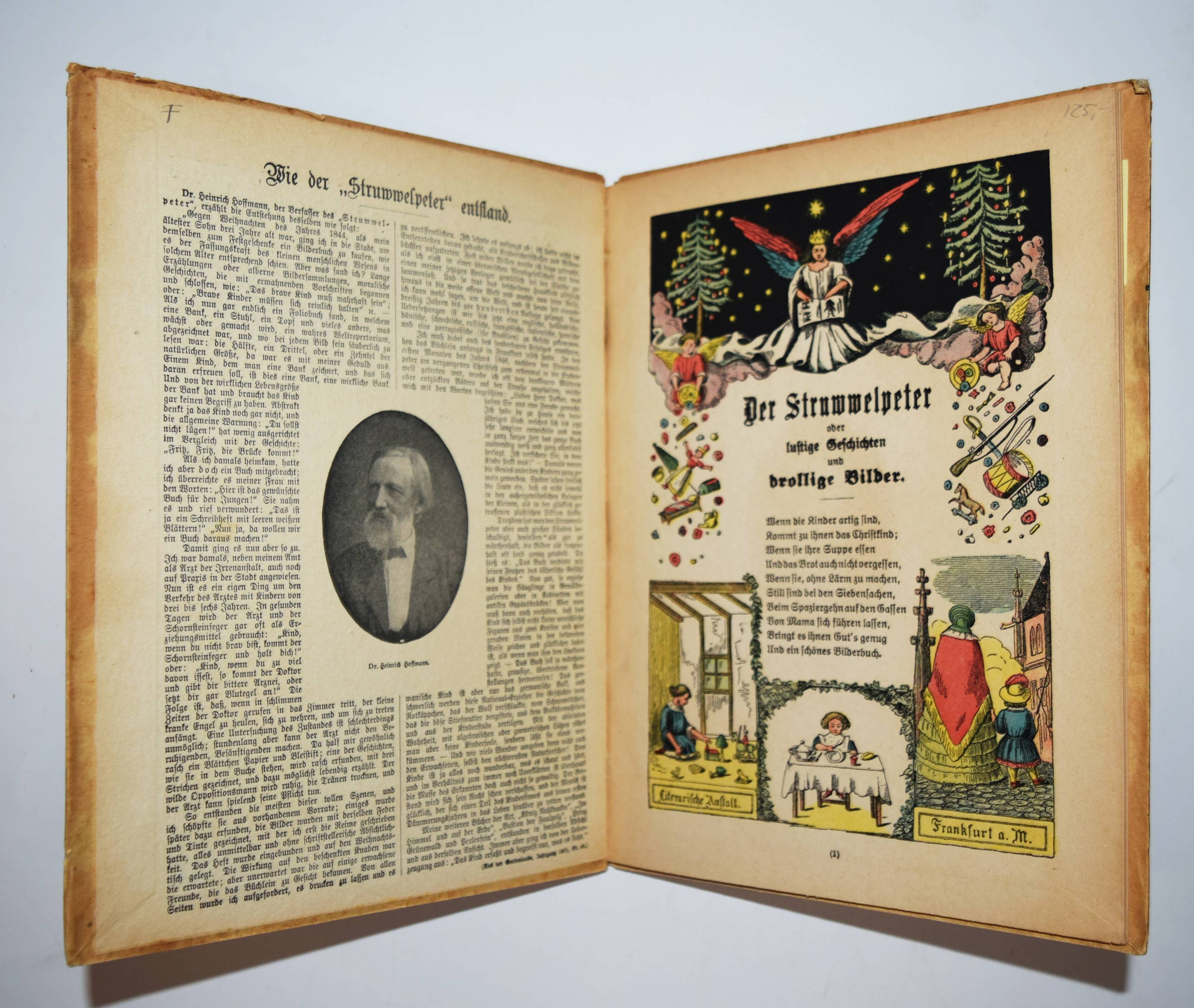 Struwwelpeter – Hoffmann, Heinrich. Der Struwwelpeter oder lustige Geschichten und drollige Bilder für Kinder von 3-6 Jahren. (Deckeltitel). 484. Auflage. Frankfurt am Main, Literarische Anstalt Rütten & Loening o. J. (1920). 4°. 26 eins. bedr. Bl. mit Porträt und farblithogr. Illustrationen. Farbig illustr. Orig.-Pappband. „Nach dem Weihnachtsfest 1844 präsentierte Heinrich Hoffmann das von ihm für seinen dreijährigen Sohn gemalte und getextete Vorleseheft den Freunden des Vereins der Künstler-, Gelehrten und Schriftstellergesellschaft „Tutti Frutti und ihre Bäder im Ganges“ mit großem Erfolg. Anwesend war auch sein künftiger Verleger, der jüdische Verleger Zacharias Löwenthal aus Mannheim. Er erkannte den Wert dieses neuen Kinderbuchkonzeptes, übernahm es von Hoffmann für 80 Gulden und ließ die 1. Auflage unter dem Pseudonym „Der lustige Reimerich Kinderlieb“ erscheinen, die von der 2. bis zur 4. Auflage unter dem Pseudonym „Heinrich Kinderlieb“ herauskam. Im Herbst 1845 erschienen die ersten 3000 Exemplare unter dem Titel ‚Lustige Geschichten und drollige Bilder mit 15 schön colorirten Tafeln für Kinder von 3-6 Jahren mit sechs Geschichten‘; sie waren schnell ausverkauft, Die 2. Auflage enthielt zwei weitere Geschichten, die 3. und 4- Auflage erschienen unter dem Titel Der Struwwelpeter. In der 5. Auflage 1847 folgten die letzten zwei Geschichten und Heinrich Hoffmann wurde als Autor auf der Titelseite genannt. Der Umfang des Buches stand nun fest, doch die Titelfigur war noch im Wandel.1859 schuf Hoffmann in der 27. Auflage einen neuen Struwwelpeter mit langen Haaren, neuen Bildern sowie minimalen Textänderungen. Mit der 31. Auflage wurde die Haarpracht wieder in den bekannten „Strahlenkranz“, auch als „Afro-Look“ bekannt, geändert“ (Hasso Böhme, Zürich, aus dessen Sammlung das vorliegende Exemplar stammt). – Einband etwas angestaubt, Rücken unauffällig restauriert, papierbedingt wie immer etwas gebräunt, sonst gut erhalten.