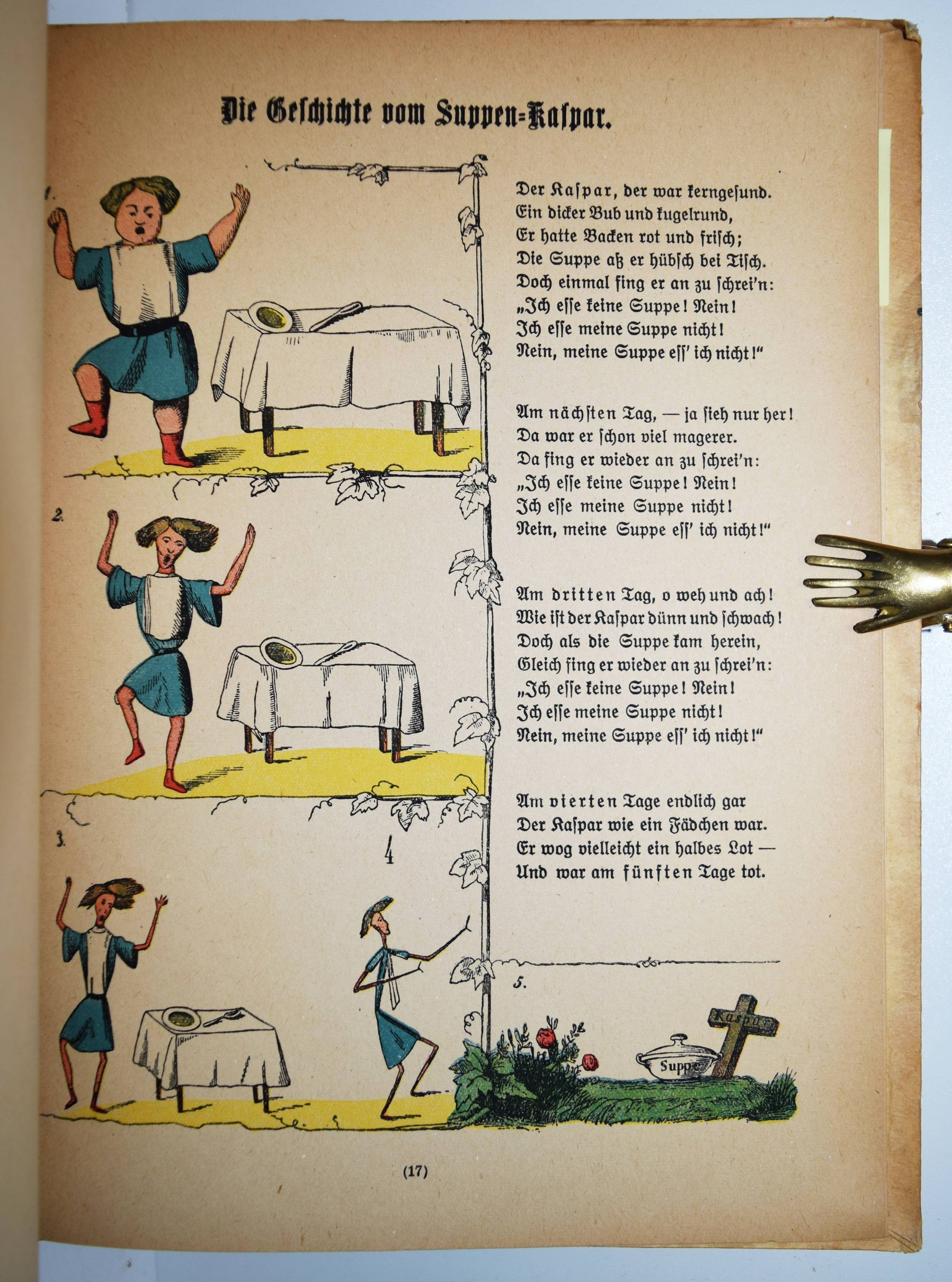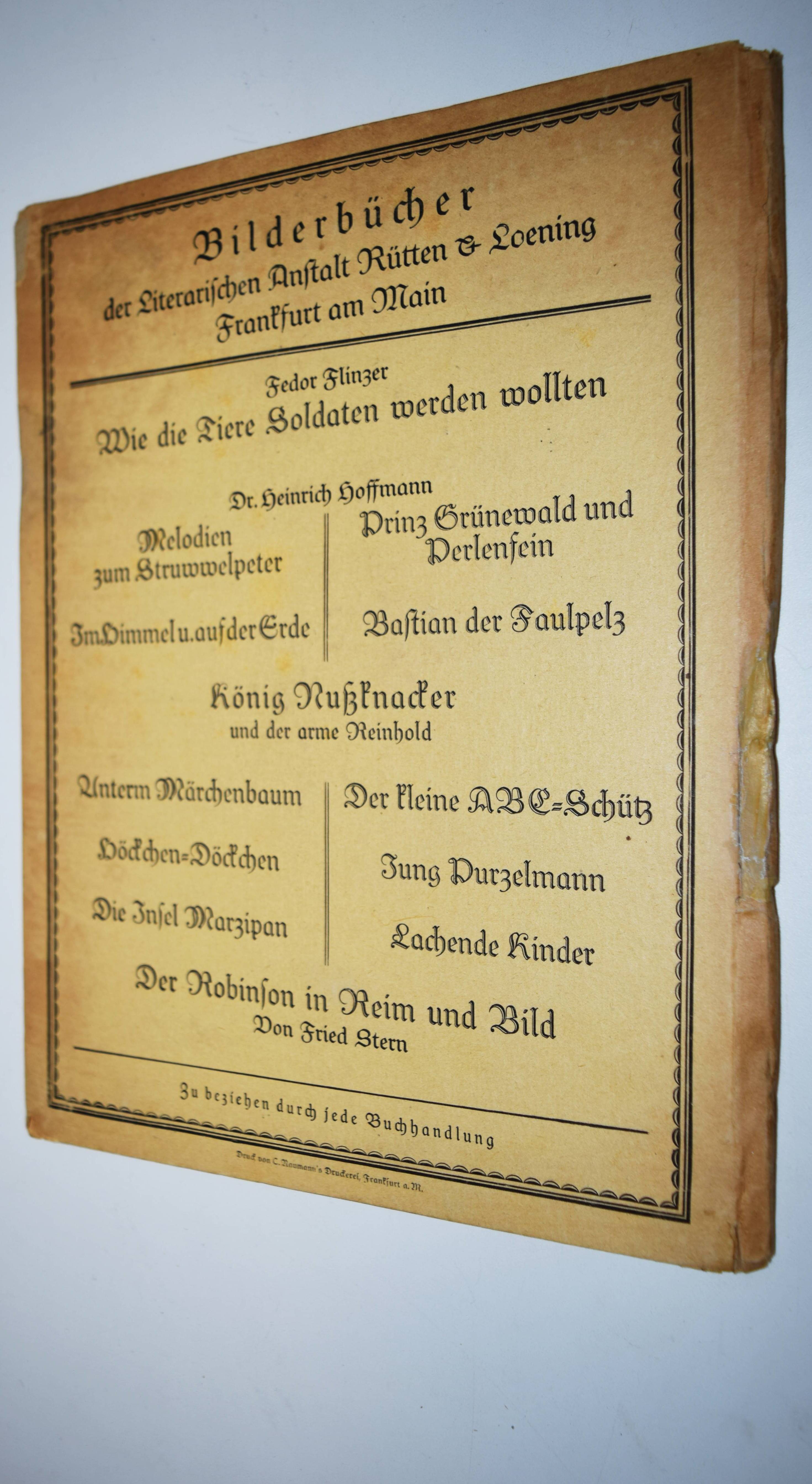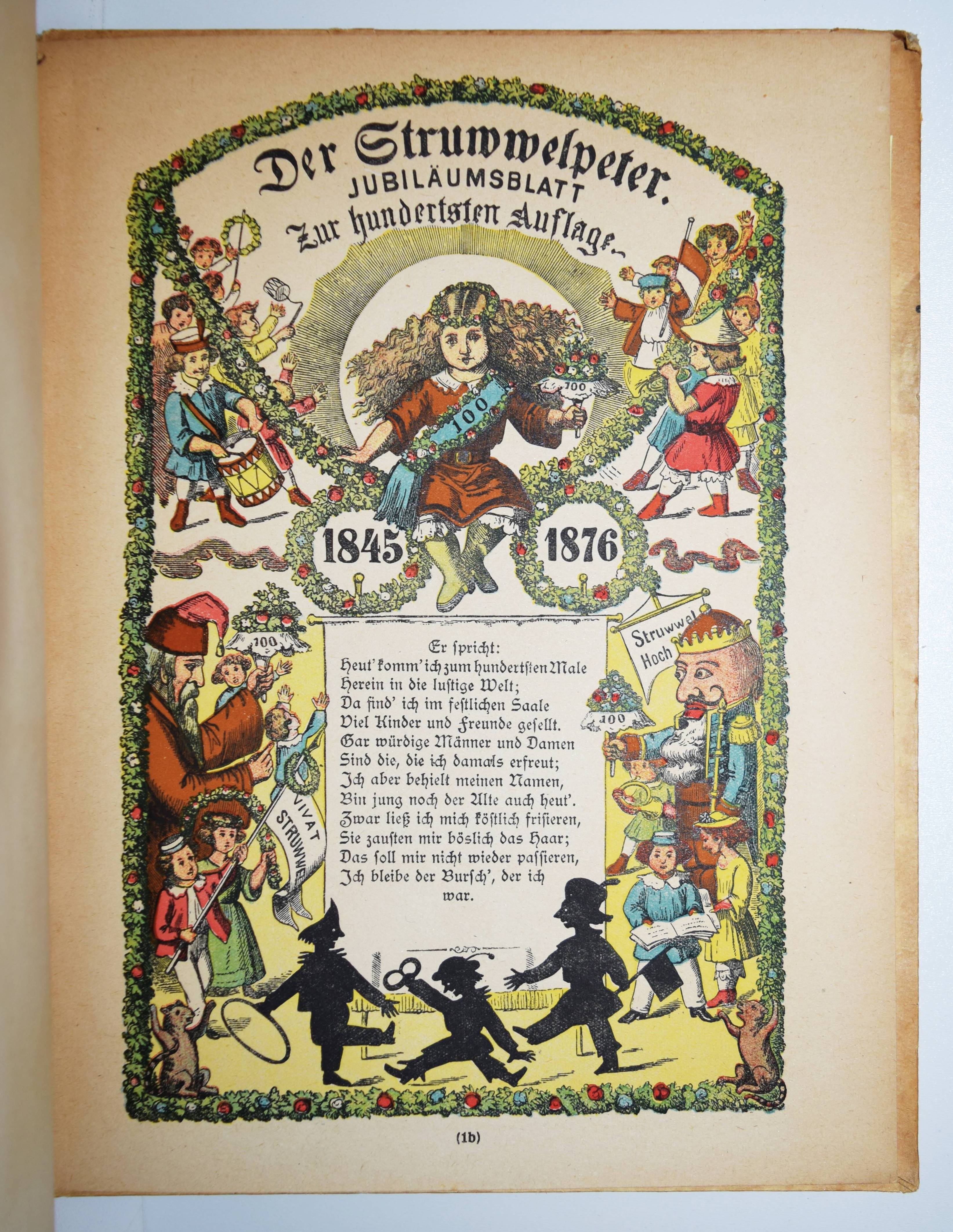 Struwwelpeter – Hoffmann, Heinrich. Der Struwwelpeter oder lustige Geschichten und drollige Bilder für Kinder von 3-6 Jahren. (Deckeltitel). 484. Auflage. Frankfurt am Main, Literarische Anstalt Rütten & Loening o. J. (1920). 4°. 26 eins. bedr. Bl. mit Porträt und farblithogr. Illustrationen. Farbig illustr. Orig.-Pappband. „Nach dem Weihnachtsfest 1844 präsentierte Heinrich Hoffmann das von ihm für seinen dreijährigen Sohn gemalte und getextete Vorleseheft den Freunden des Vereins der Künstler-, Gelehrten und Schriftstellergesellschaft „Tutti Frutti und ihre Bäder im Ganges“ mit großem Erfolg. Anwesend war auch sein künftiger Verleger, der jüdische Verleger Zacharias Löwenthal aus Mannheim. Er erkannte den Wert dieses neuen Kinderbuchkonzeptes, übernahm es von Hoffmann für 80 Gulden und ließ die 1. Auflage unter dem Pseudonym „Der lustige Reimerich Kinderlieb“ erscheinen, die von der 2. bis zur 4. Auflage unter dem Pseudonym „Heinrich Kinderlieb“ herauskam. Im Herbst 1845 erschienen die ersten 3000 Exemplare unter dem Titel ‚Lustige Geschichten und drollige Bilder mit 15 schön colorirten Tafeln für Kinder von 3-6 Jahren mit sechs Geschichten‘; sie waren schnell ausverkauft, Die 2. Auflage enthielt zwei weitere Geschichten, die 3. und 4- Auflage erschienen unter dem Titel Der Struwwelpeter. In der 5. Auflage 1847 folgten die letzten zwei Geschichten und Heinrich Hoffmann wurde als Autor auf der Titelseite genannt. Der Umfang des Buches stand nun fest, doch die Titelfigur war noch im Wandel.1859 schuf Hoffmann in der 27. Auflage einen neuen Struwwelpeter mit langen Haaren, neuen Bildern sowie minimalen Textänderungen. Mit der 31. Auflage wurde die Haarpracht wieder in den bekannten „Strahlenkranz“, auch als „Afro-Look“ bekannt, geändert“ (Hasso Böhme, Zürich, aus dessen Sammlung das vorliegende Exemplar stammt). – Einband etwas angestaubt, Rücken unauffällig restauriert, papierbedingt wie immer etwas gebräunt, sonst gut erhalten.