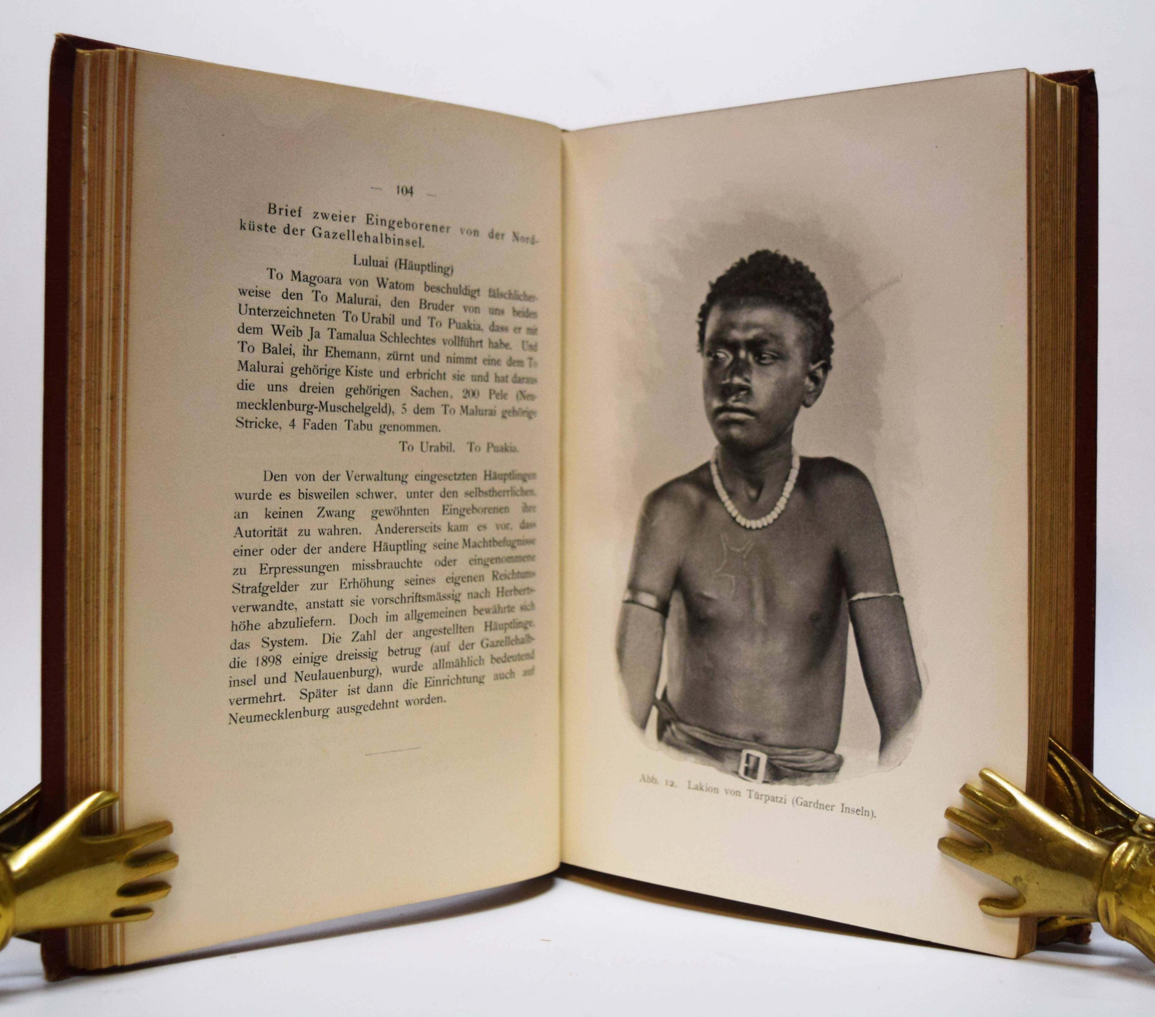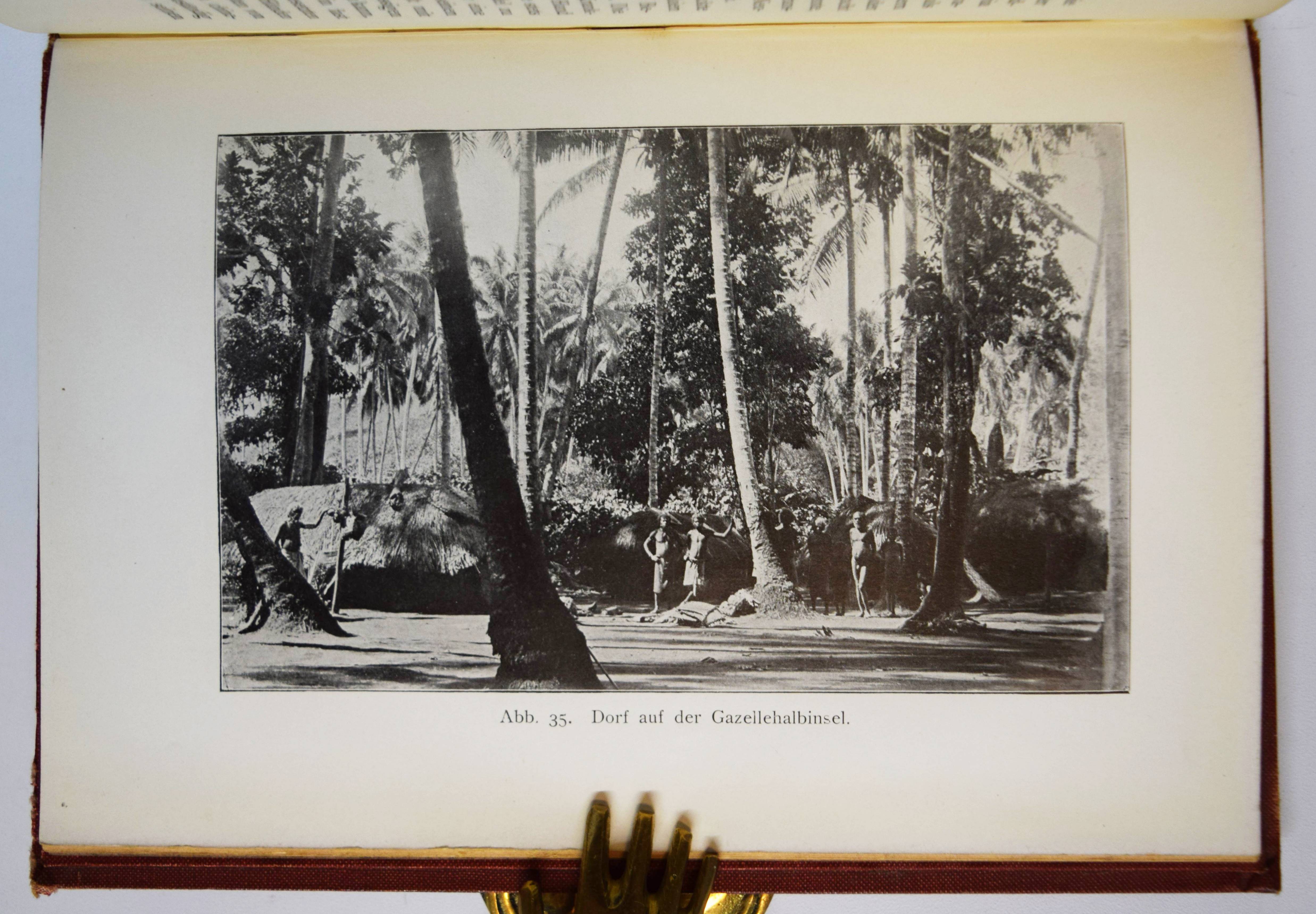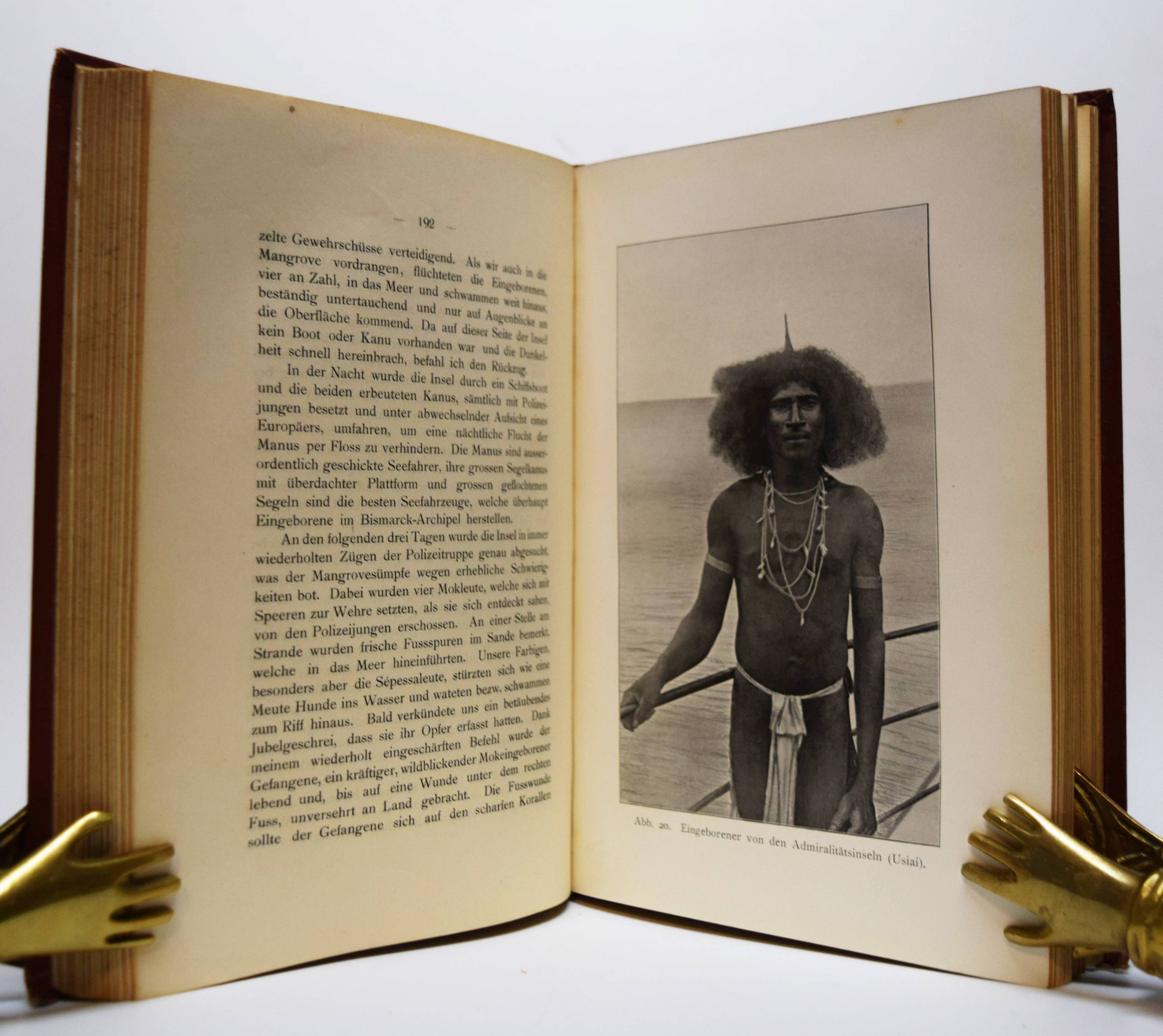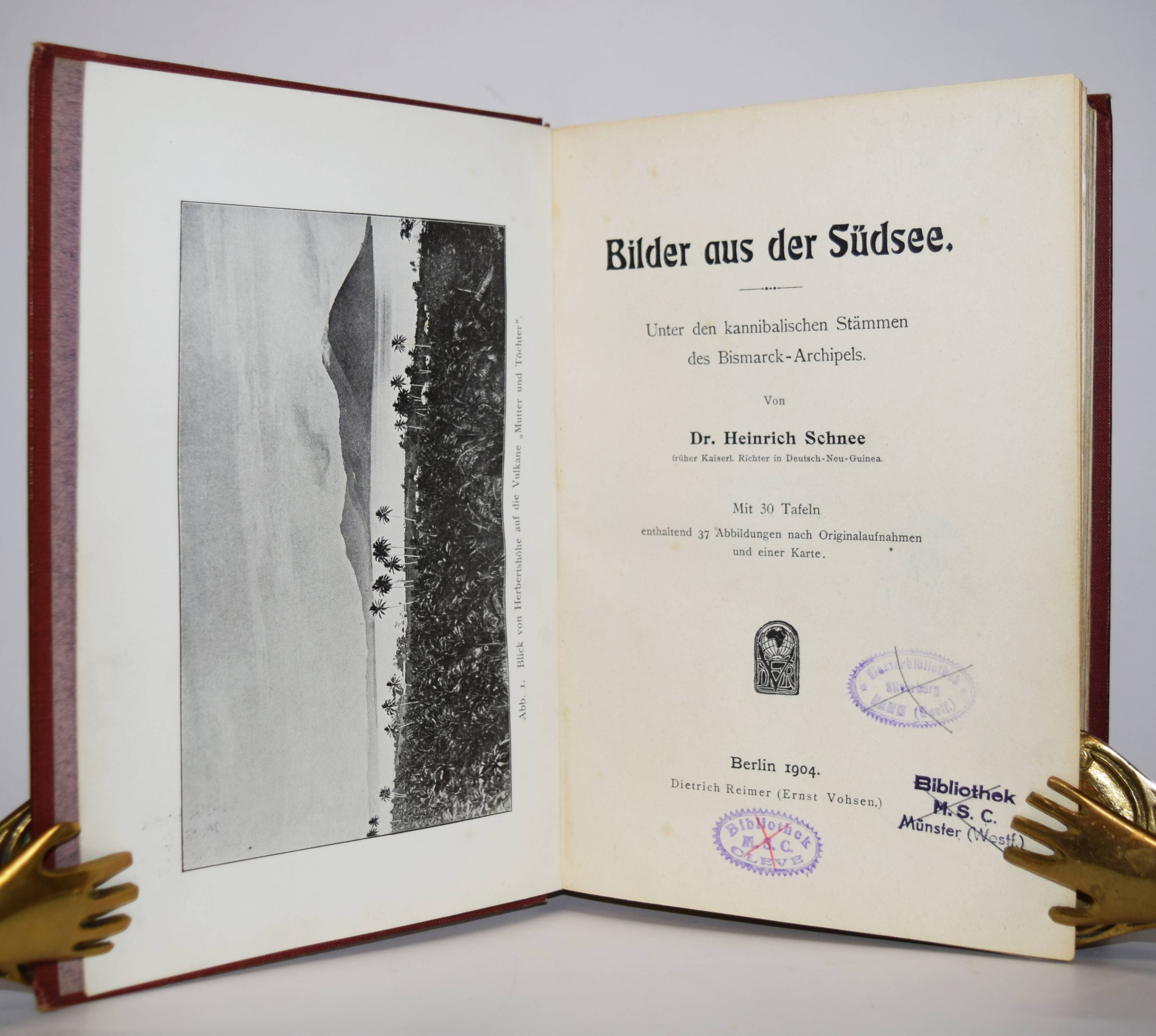 Schnee, H(einrich). Bilder aus der Südsee. Unter den kannibalischen Stämmen des Bismarck-Archipels. Mit 30 Tafeln enthaltend 37 Abb. nach Originalaufnahmen und einer Karte. Berlin, Dietrich Reimer 1904. 8°. XIII, 394 S. mit 30 Tafeln und 37 Abbildungen nach Fotografien. Illustr. Orig.-Leinenband mit goldgepr. Rücken- und Deckeltitel. NDB XXIII, 280. – Erste Ausgabe. – Das Werk enthält folgende Kapitel: Über Neu-Guinea nach Herbertshöhe. Herbertshöhe und die Blanchebucht. Der Bismarck-Archipel und seine eingeborene Bevölkerung. Verwaltung und Rechtsprechung auf der Gazellehalbinsel. Zug gegen die Napaparleute. Fahrt nach den Salomoninseln. Am Varzin. Nach den Admiralitätsinseln und den St. Matthiasinseln. Strafexpeditionen in den Admiralitätsinseln. In den Bainingbergen. Fahrt nach der Südküste Neupommerns. Amokläufer. Einiges über Fauna und Flora, von Dr. Paul Schnee. Sprachliches. Aberglaube, Zauberei. Kämpfe und Kannibalismus. Die wirtschaftliche Entwicklung des Bismarck-Archipels. – Heinrich Schnee (1871-1949) deutscher Kolonialpolitiker, war stellvertretender Gouverneur in Deutsch-Neuguinea, Bezirksamtsrat und Stellvertretender Gouverneur in Samoa und später Gouverneur von Deutsch-Ostafrika. – Einband etwas berieben, St.a.V.u.T., ohne die Karte, sonst gut erhalten.