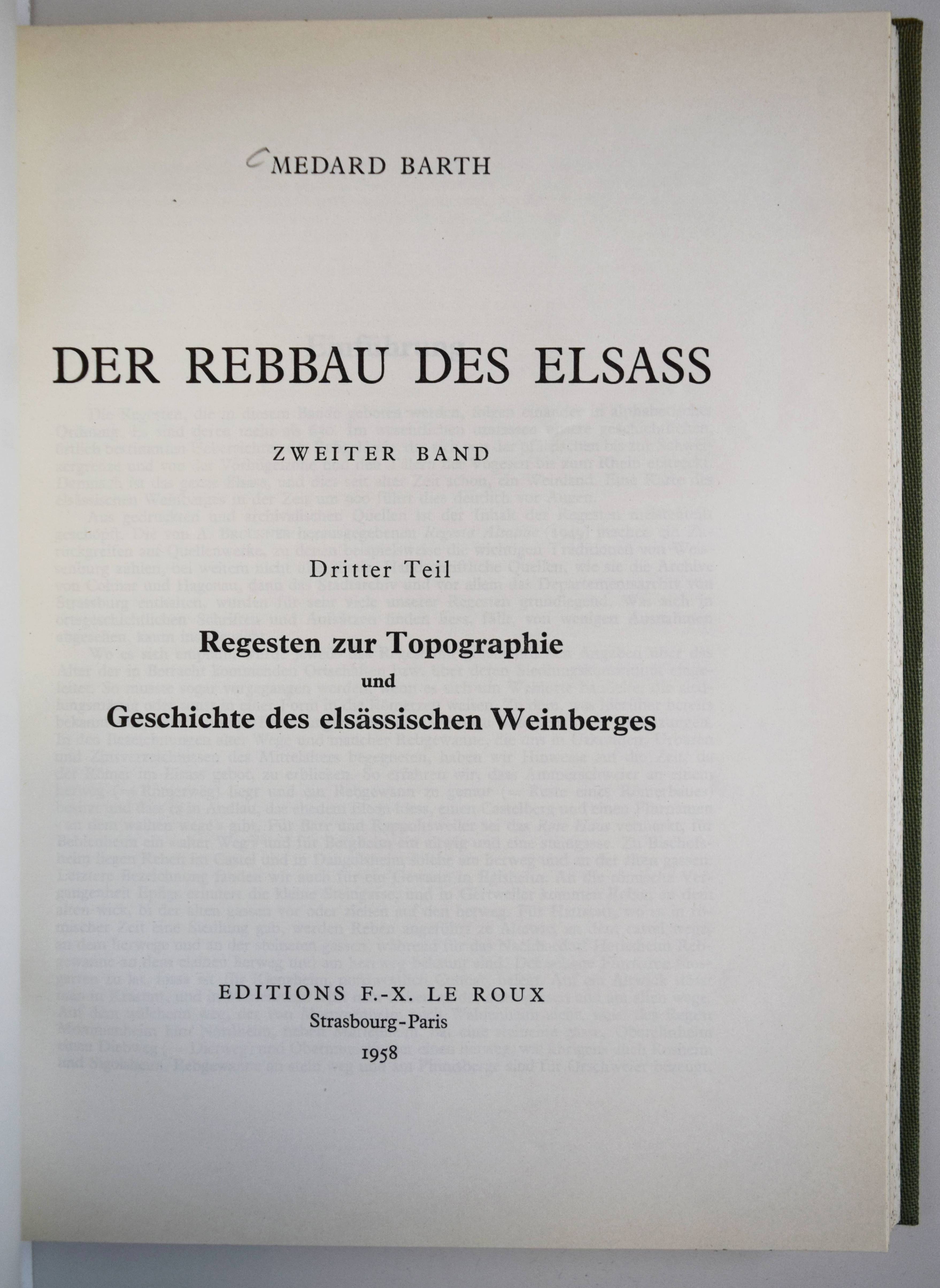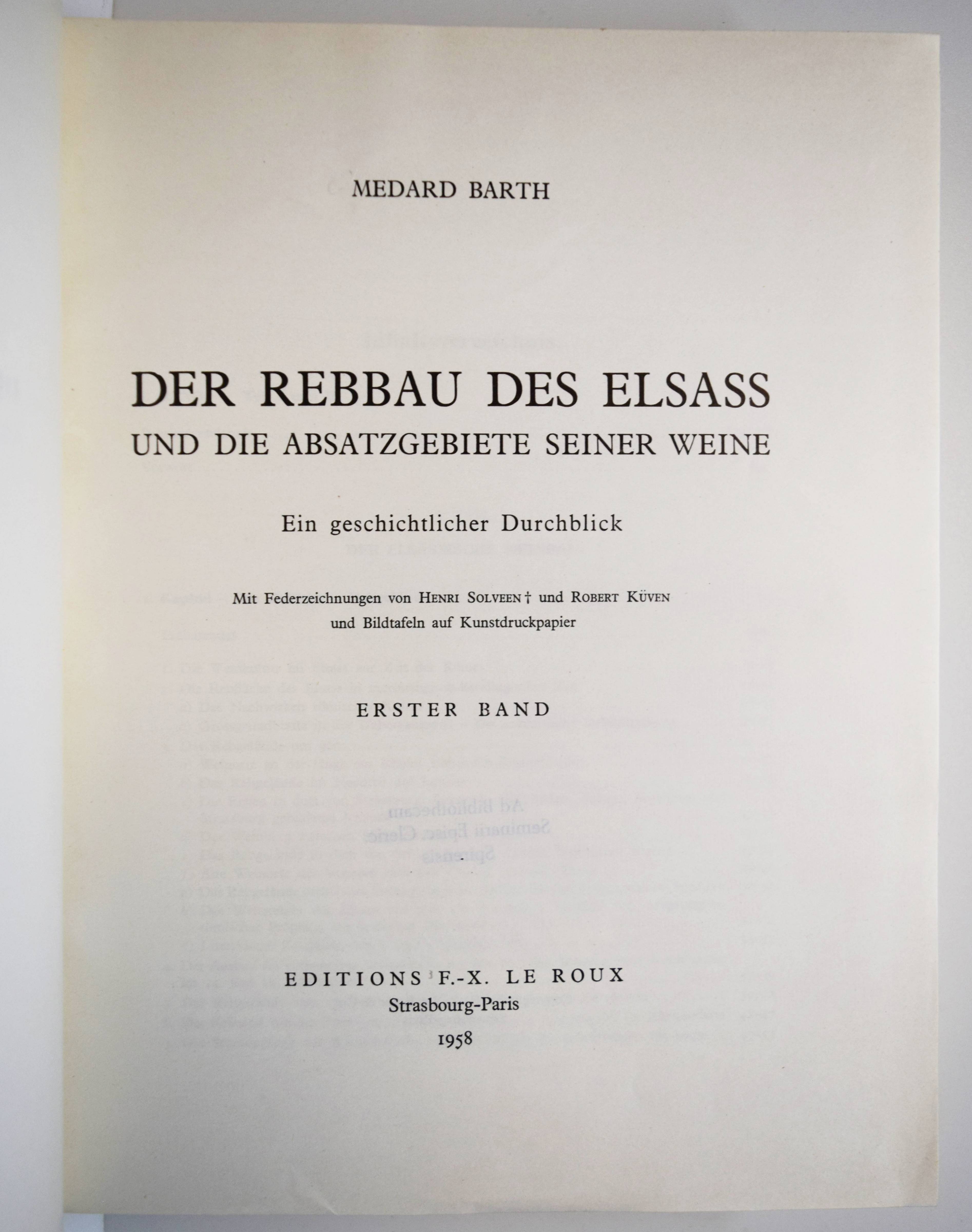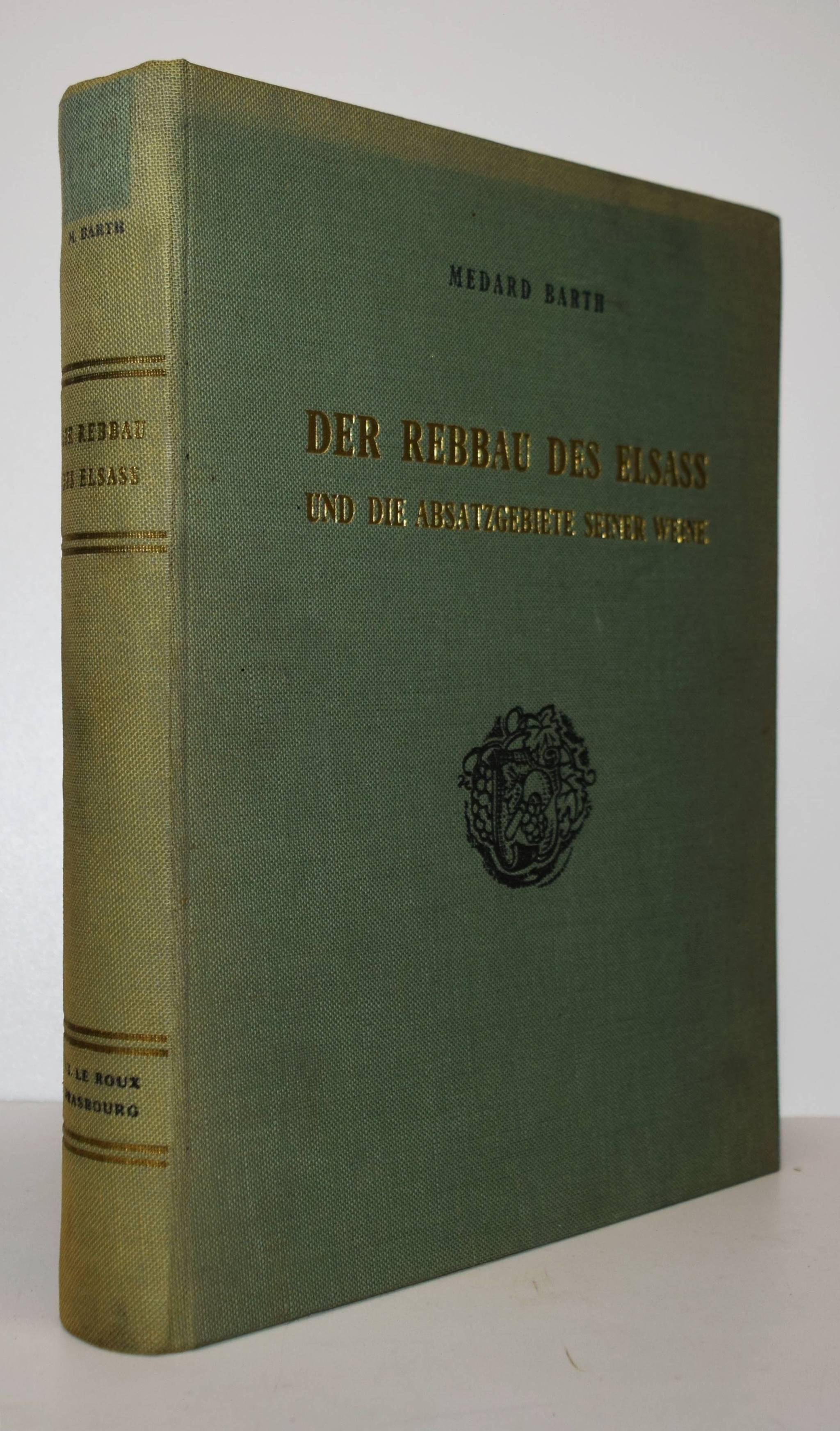 Barth, (H. Chanoine) Médard. Der Rebbau des Elsass und die Absatzgebiete seiner Weine. Ein geschichtlicher Durchblick. 2 Bände in 1. Strasbourg, Éditions F.-X. Le Roux 1958. 4°. XVI, 509, (1) S.; 225 S. mit Federzeichnungen von Henri Solveen und Robert Küven und Bildtafeln auf Kunstdruckpapier. Orig.-Leinenband mit goldgepr. Rücken- und Deckeltitel. Schoene-online, Persönlichkeiten der Weinkultur. – Einzige Ausgabe der ausführlichen Darstellung des Elsässer Professors und Theologen H. C. M. Barth (1886-1976). – „Seiner unvergleichlichen Arbeitskraft und großen Liebe zur elsäss. Heimat verdanken wir das große Werk über den Rebbau im Elsass“ (C. Geisenheim in Schoene). – Rücken etwas aufgehellt, Stempel und private Widmung auf dem Vorsatz, sehr gutes Exemplar der gebundenen Ausgabe.