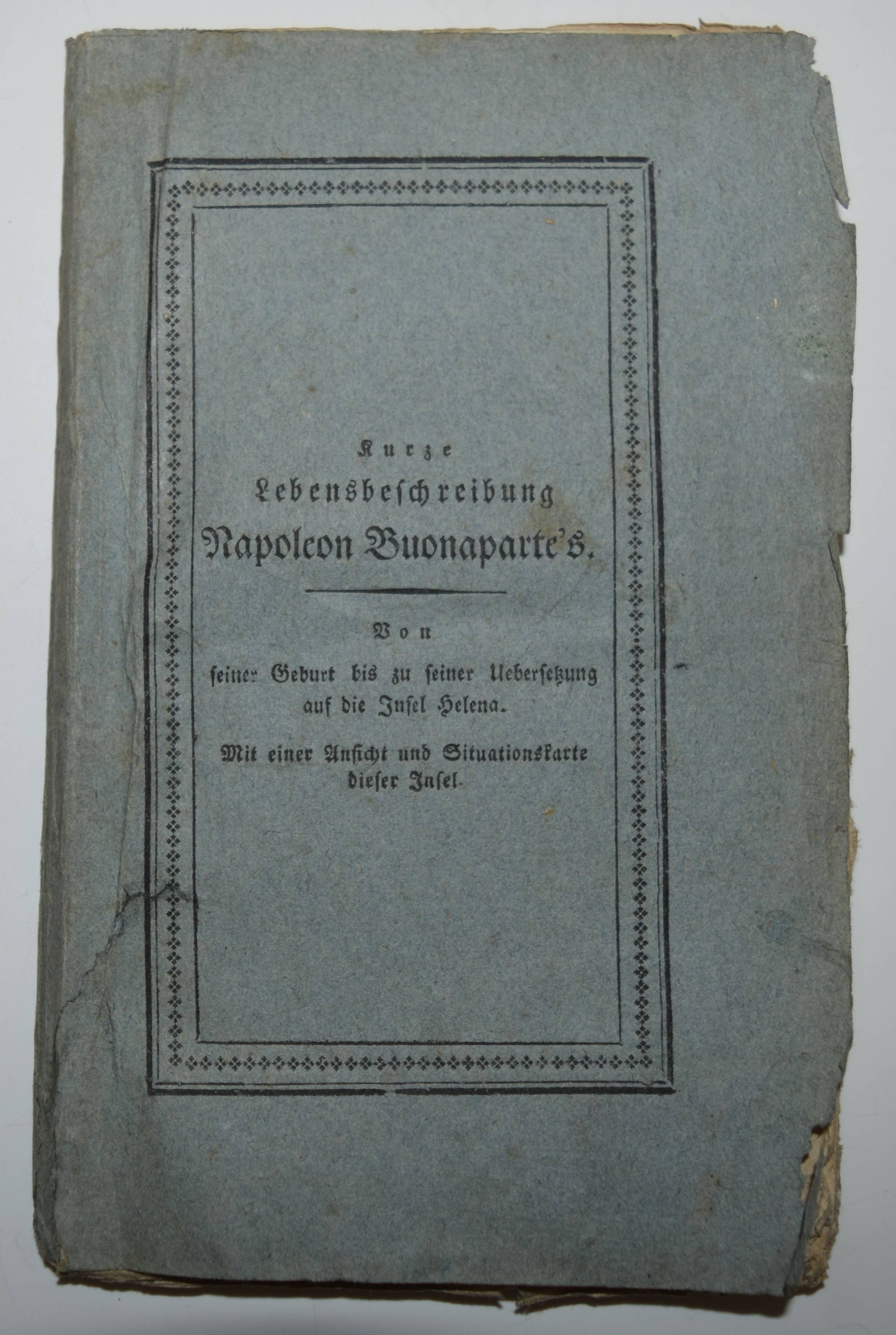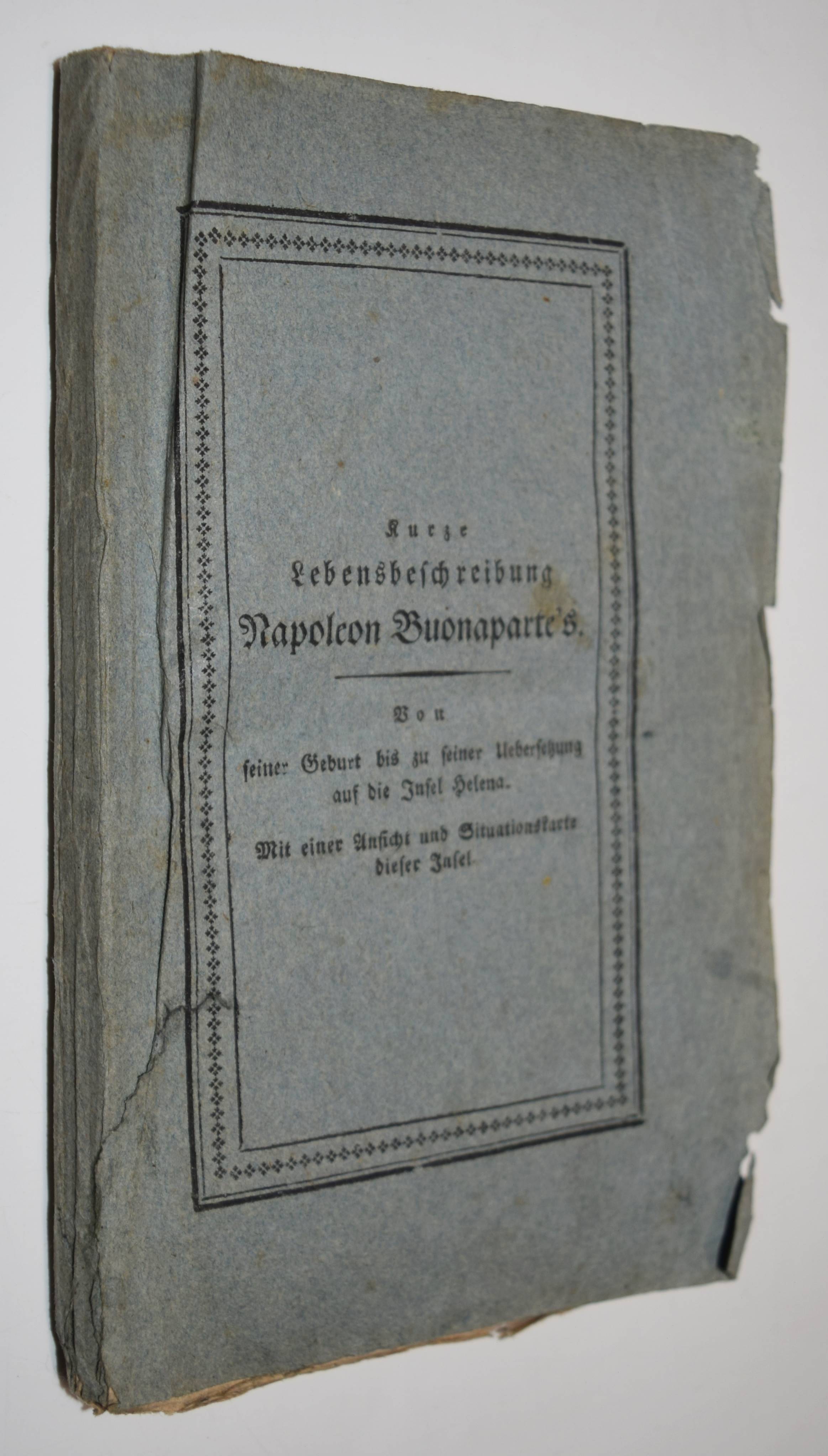 Napoleon I. – Kurze Lebensbeschreibung Napoleon Buonaparte’s. Von seiner Geburt an bis zu seiner Ankunft auf der Insel Elba. 2. verm. Aufl. Frankfurt u. Leipzig, o. Dr. 1816. 8°. 144 S. mit gefalt. gestoch. Frontispiz (Ansicht u. Karte von St. Helena). Typogr. Orig.-Broschur. Nicht bei Holzmann-Bohatta. – Gegenüber der ersten Ausgabe von 1815 (70 S.) wesentlich erweiterte 2. Ausgabe. – Das Frontispiz mit einer Ansicht des Hafens der Insel und einer Karte des Atlantiks. – Umschlag leicht fleckig und Knickspuren, dier ersten Bl. etwas eselsohrig, nur vereinzelt leicht braunfleckig, gutes unbeschnittenes Exemplar.