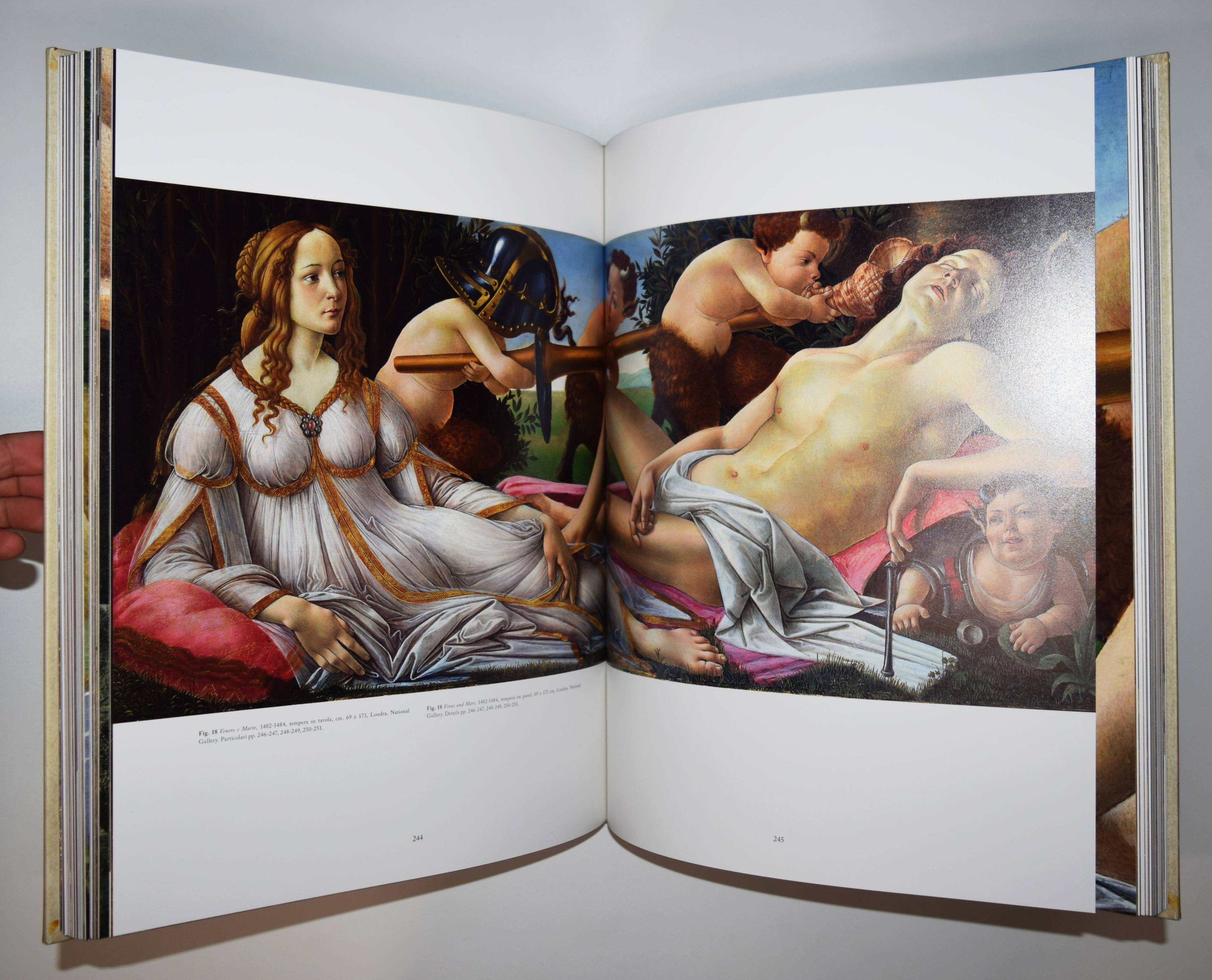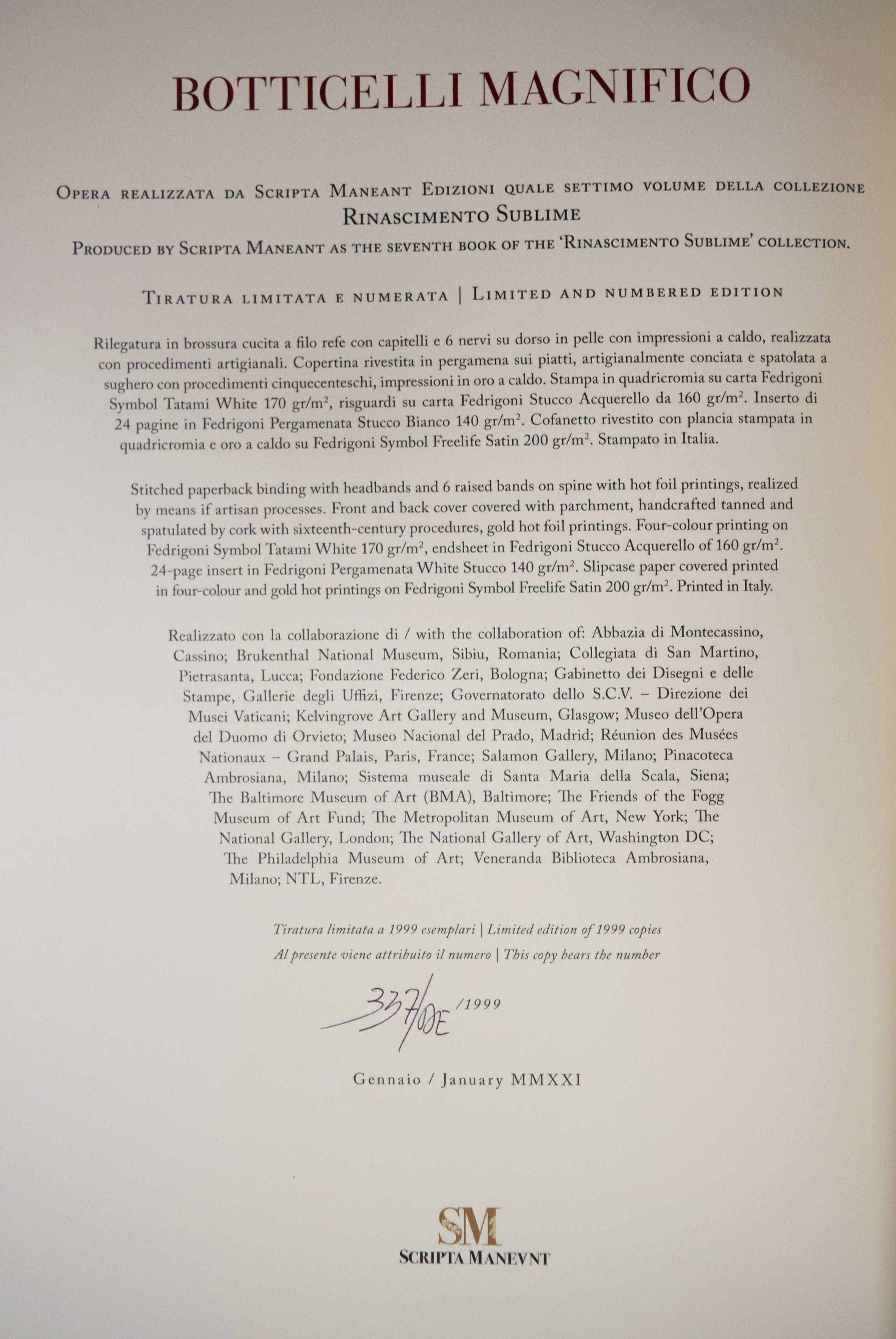 Botticelli – Benevolo, Giancarlo. Botticelli Magnifico. (Traduzione in lingua inglese / English translation by Sarah Elizabeth Cree). Bologna, SM Scripta Maneant (2020). Folio (41,5 x 31,5 cm.). 403, (2) S. mit 260 teils doppelblattgr. farb. Abbildungen. Orig.-Halblederband mit Pergamentdeckeln, goldgepr. Rücken- und Deckeltitel und Deckelillustration in illustr. Halbleinenschuber. Eines von 1999 num. Exemplaren. – Text in Italienisch und Englisch. – Opulent ausgestattete Monographie über den bedeutendsten italienischen Maler und Zeichner der frühen Renaissance Sandro Botticelli (1445-1510). – Den engen Zusammenhang mit dem humanistischen Gedankengut der Zeit und die schöpferische Phantasie des Künstlers zeigen seine reiferen Meisterwerke nach 1475, insbesondere seine allegorischen Darstellungen Der Frühling, auf dem das Erwachen der Natur durch blumenbekränzte Mädchen in einer paradiesischen Landschaft verkörpert wird, und Die Geburt der Venus, auf dem die aus dem Meeresschaum geborene Liebesgöttin in einer Muschel zur Küste treibt. Letztere stellte den ersten fast lebensgroß gemalten Frauenakt seit der Antike dar. Nur im privaten Rahmen, so Elke Linda Buchholz, sei solch ein erotisch unverblümtes, mythologisch aufgeladenes Bildprogramm möglich und mit seinem literarisch inspirierten Antikebezug auch nur einem elitären Kreis von Kennern vermittelbar gewesen. … Zwischen 1481 und 1482 wurde Botticelli von Papst Sixtus IV. nach Rom berufen. In einem Team u. a. mit Perugino, Ghirlandaio und Signorelli stattete er die neu errichtete Sixtinische Kapelle mit großen Wandgemälden, welche Ereignisse aus dem Leben Jesu und des Moses darstellen, und mit Porträts früherer Päpste aus“ (Wikipedia). – Neuwertiges Exemplar.