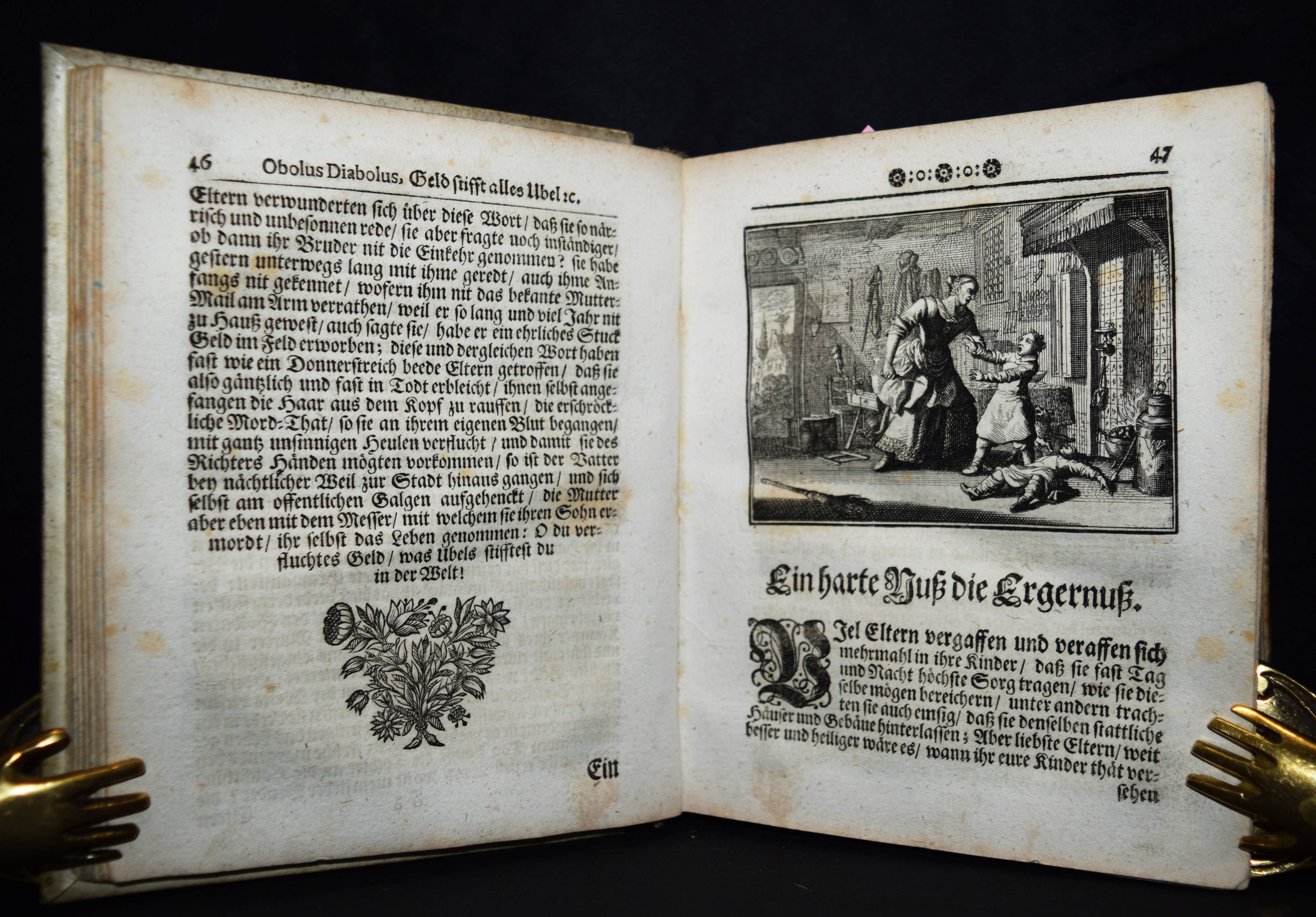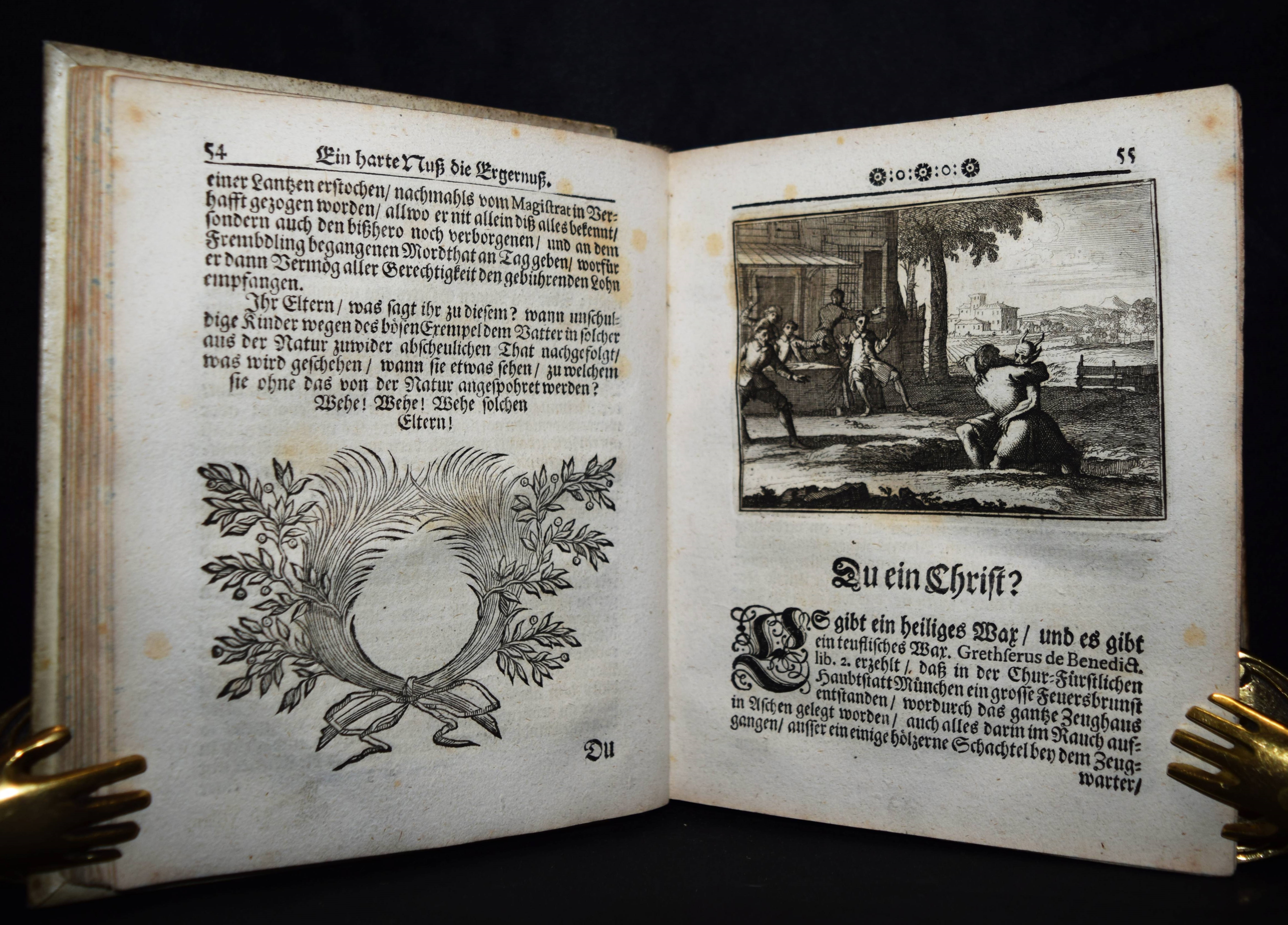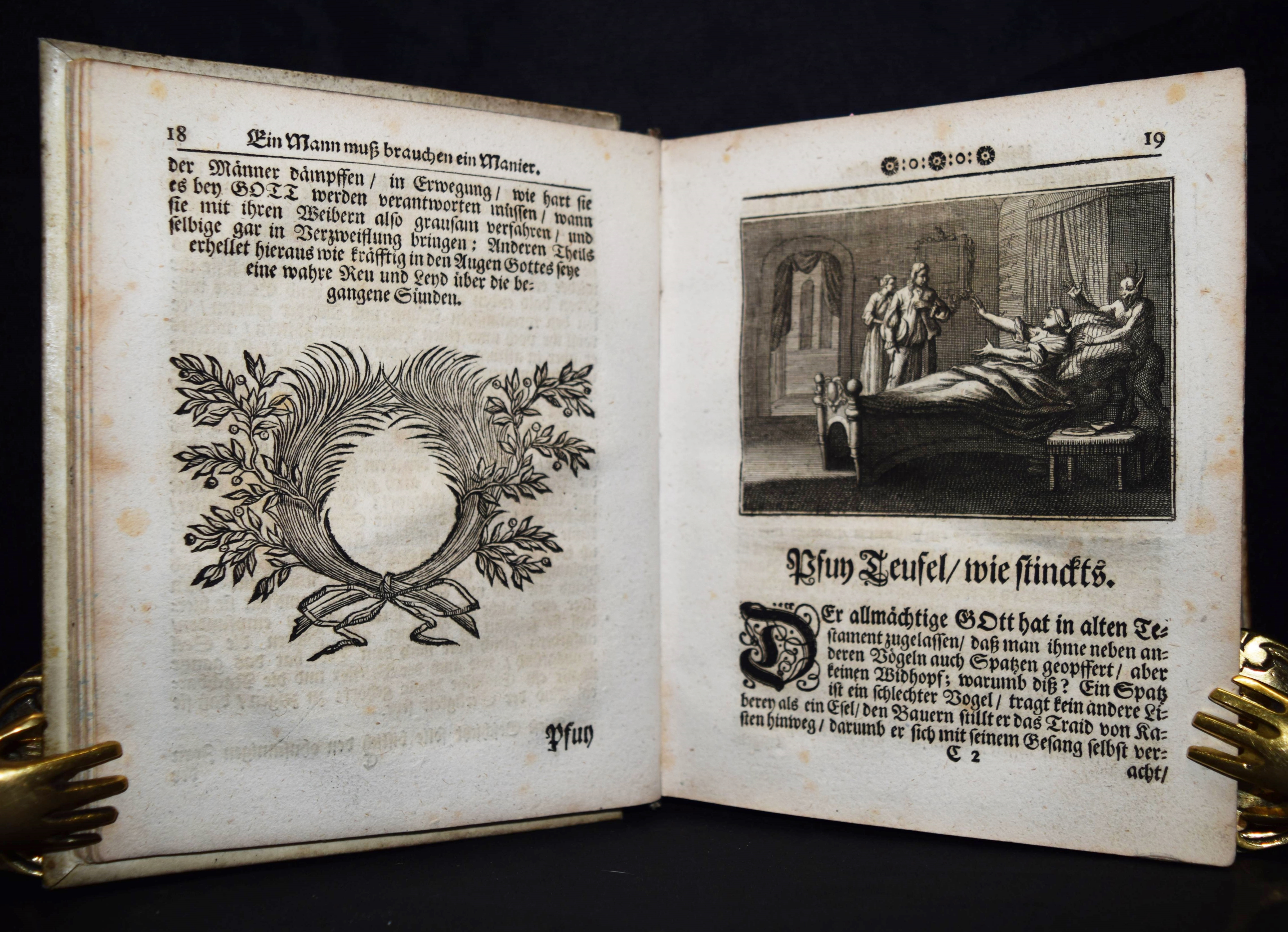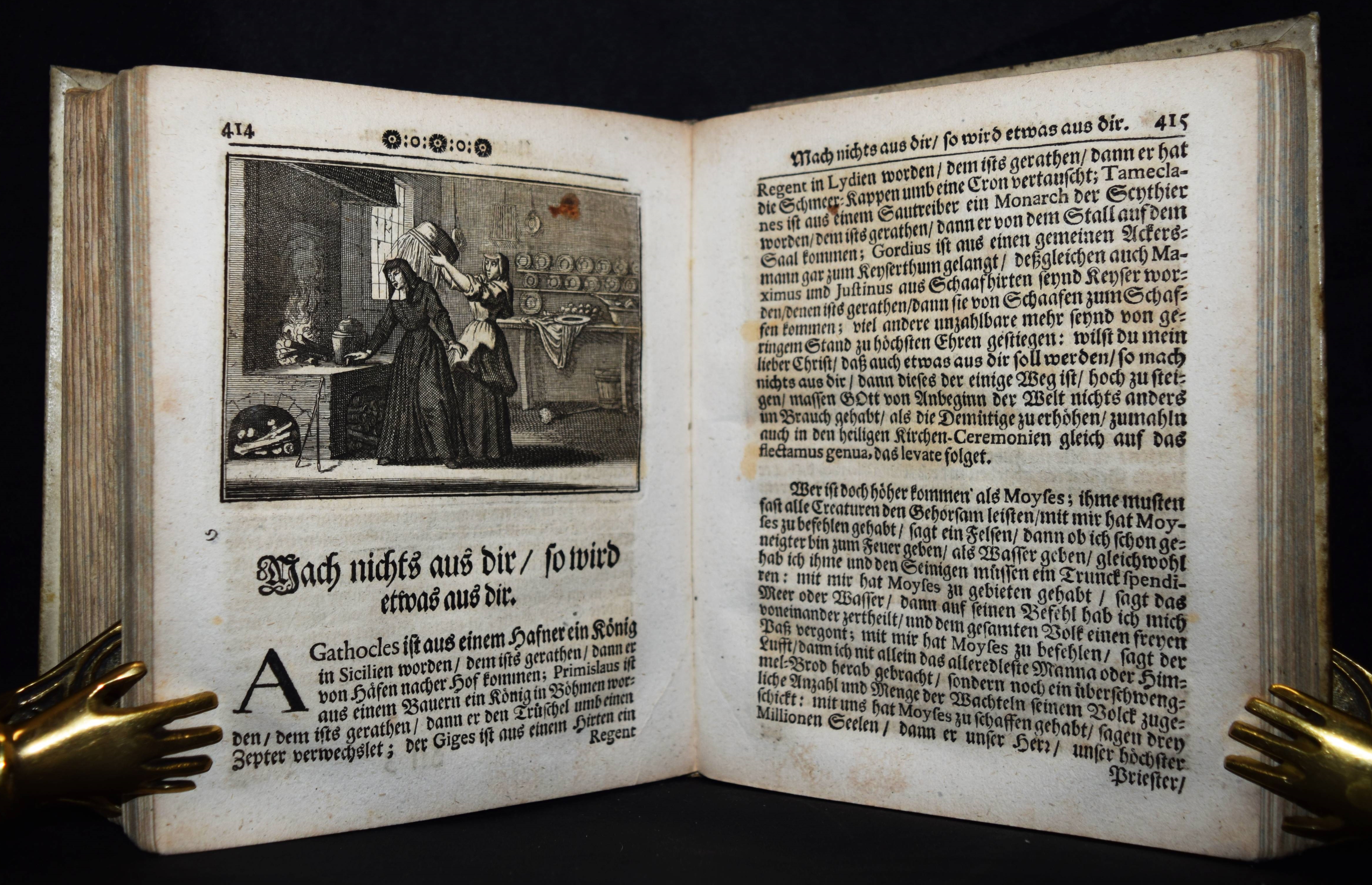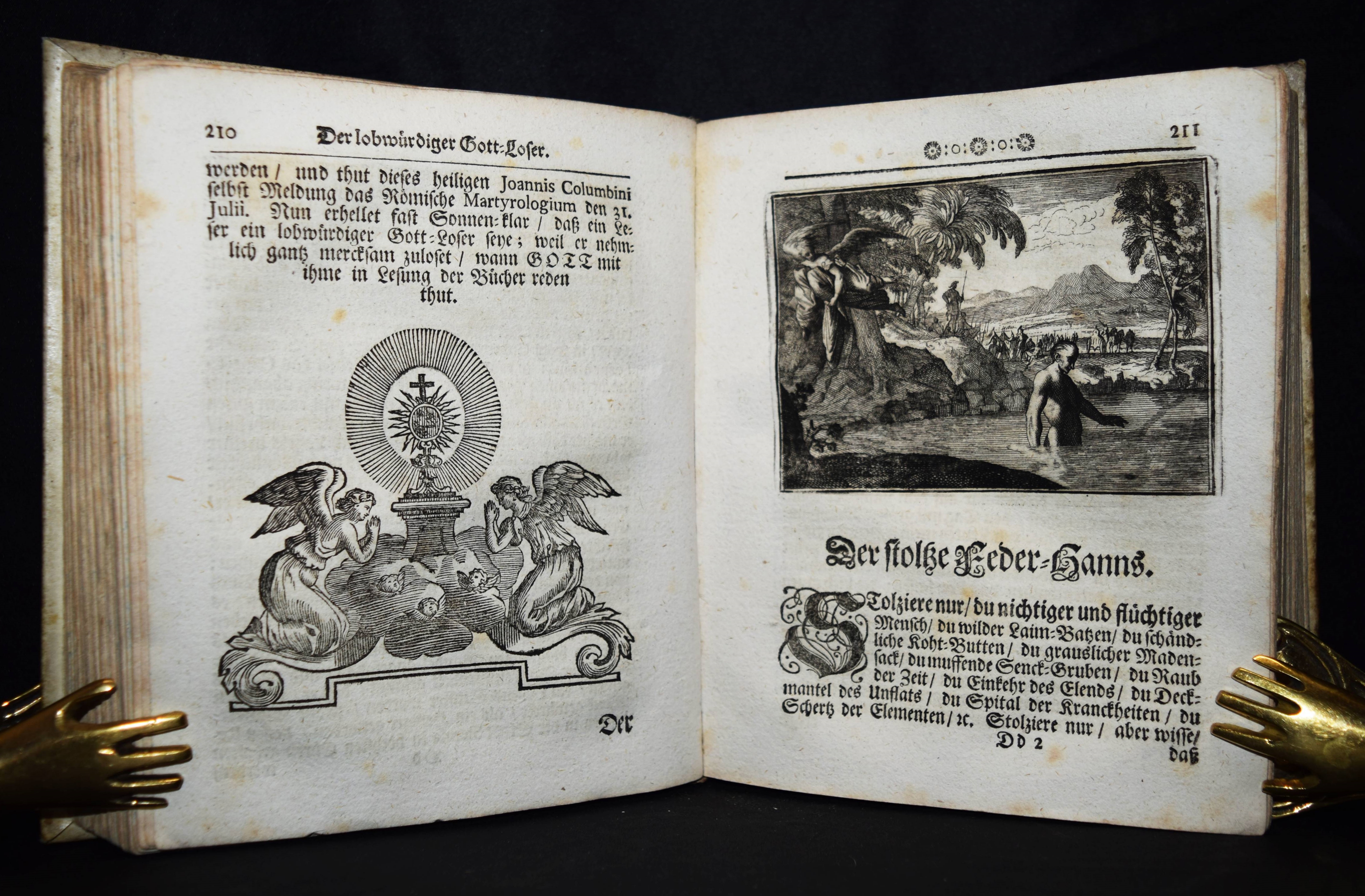Abraham à Sancta Clara (d. i. Ulrich Megerle). Heilsames Gemisch-Gemasch. Das ist: Allerley seltsame und verwunderliche Geschichten, Mit vielen Concepten und sittlichen Lehren unterspickt, wie auch mit Kupfern vermengt, Worinnen einem jedem nach eigenem Belieben ein Bescheid-Essen vorgesetzt, Meistens aber denenjenigen, so vorlieb nehmen mit einer Speiß, die weder gesotten, noch gebraten. Nürnberg, Christoph Weigel 1704. 8°. [6] Bl., 538 S., [4] Bl. mit Titel in Rot und Schwarz, gestoch. Frontispiz, 50 halbseitigen Kupferstichen von Christian Luyken und zahlr. Schmuck-Vignetten in Holzschnitt. Pergamenteinband der Zeit. Bertsche 46a 1. Dünnhaupt 43.2. Faber du Faur 1124. Goedeke III, 240, 24. Seebaß-Edelmann III, 16. VD18 14375931. – Erster Druck der ersten Ausgabe (S. 244 beginnt mit „tere“; beim zweiten Druck „Säck“); „Zu finden aber bey Jacob Koll, Buchbinder zu Wien, bey dem Stock am Eysen. Würzburg, gedruckt bey Hiob Hertzen“. – „To the stories offered, Abraham adds entertaining admonitions written in the tone of popular sermons … What he meant to provide was a devotional book, prious at the same time entertaning, indeed entrancing“ (Faber du Faur). – „Das Frontispiz ist unterschrieben „Die Wahrheit ohne Fuchs-Scepter“; es stellt eine ins Schreiben vertiefte Frau dar, an deren Seite ein kl. Kind einem Fuchs den Schwanz abschneidet. Die einzelnen Kapitel sind meist schon durch drastische Überschriften gekennzeichnet: Pfuy Teufel wie stinckts, Pagatell führt in die Höll, Das Tau förscht der Wauwau, Behüt mich Gott vor der alten Hexen, Gute Creditores seyd grosse Debitores, Das geistliche Kräuter-Buch, Rosimunda du hertziger Schatz, u. ä. Die figurenreichen Kupfer passen gut zum Text und zeichnen sich durch hübsche Landschaften und Durchblicke aus“ (Seebaß-Edelmann). – Einband etwas angestaubt und am Kapital leicht eingerissen, stellenweise etwas braunfleckig und gebräunt, sehr gutes Exemplar.