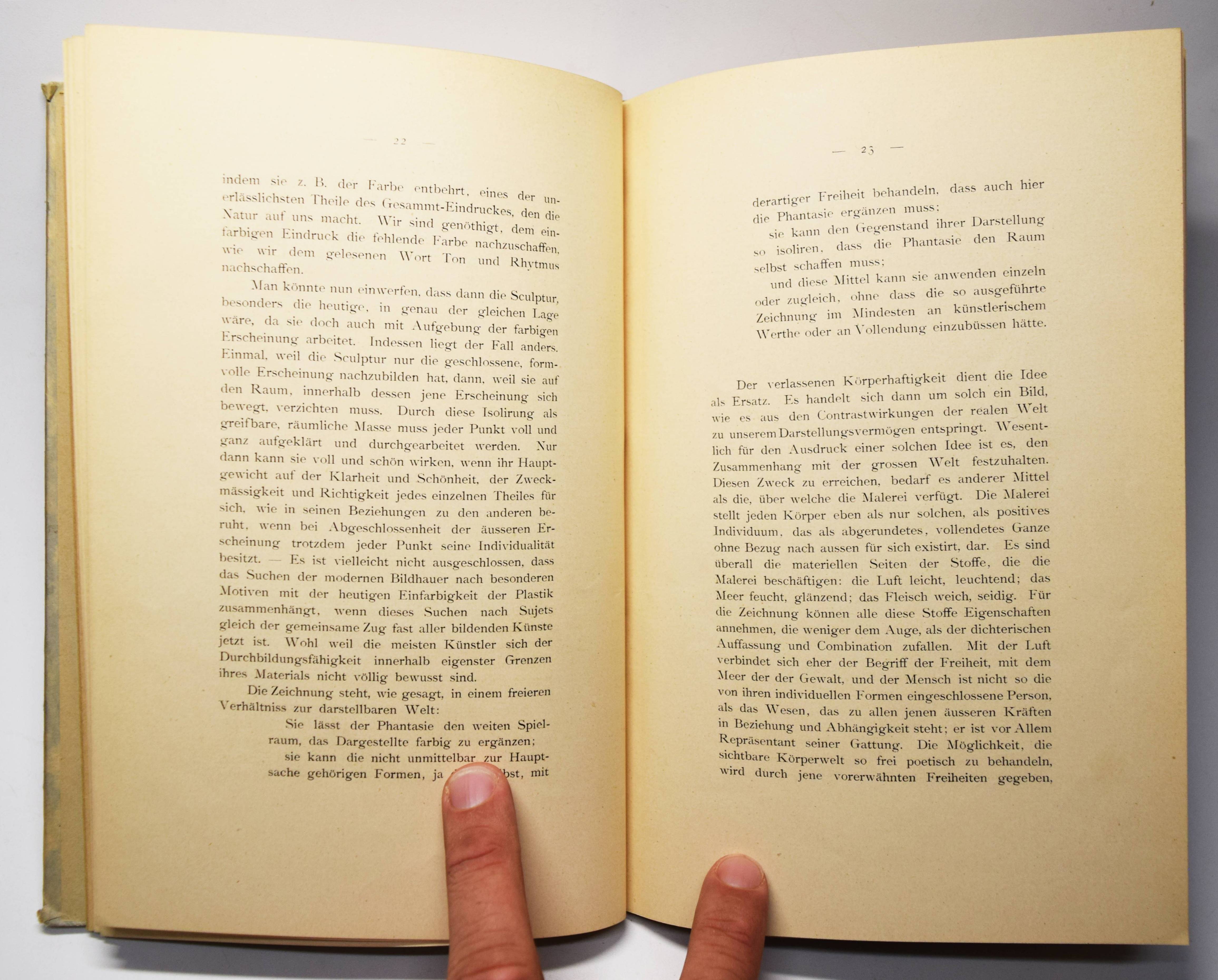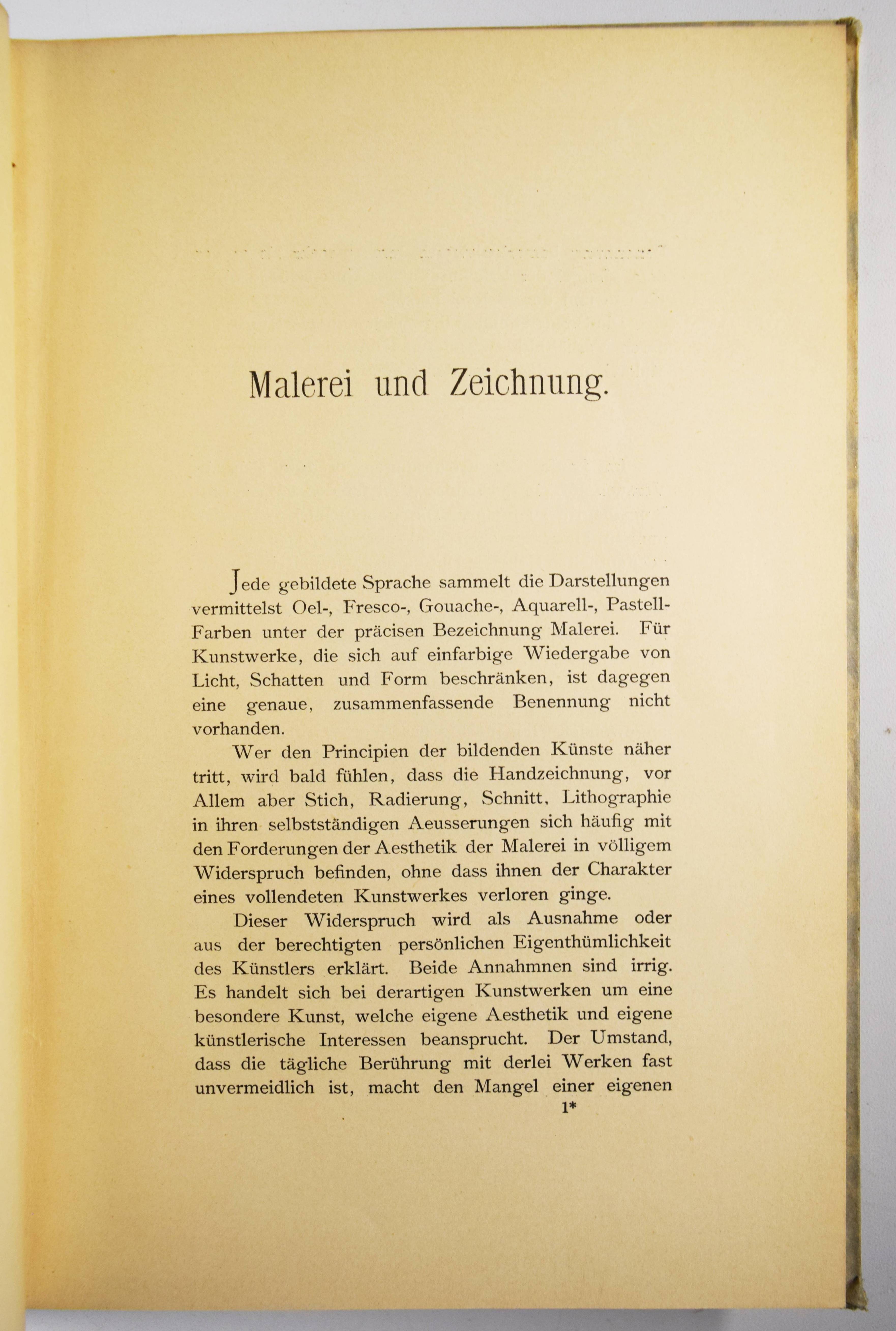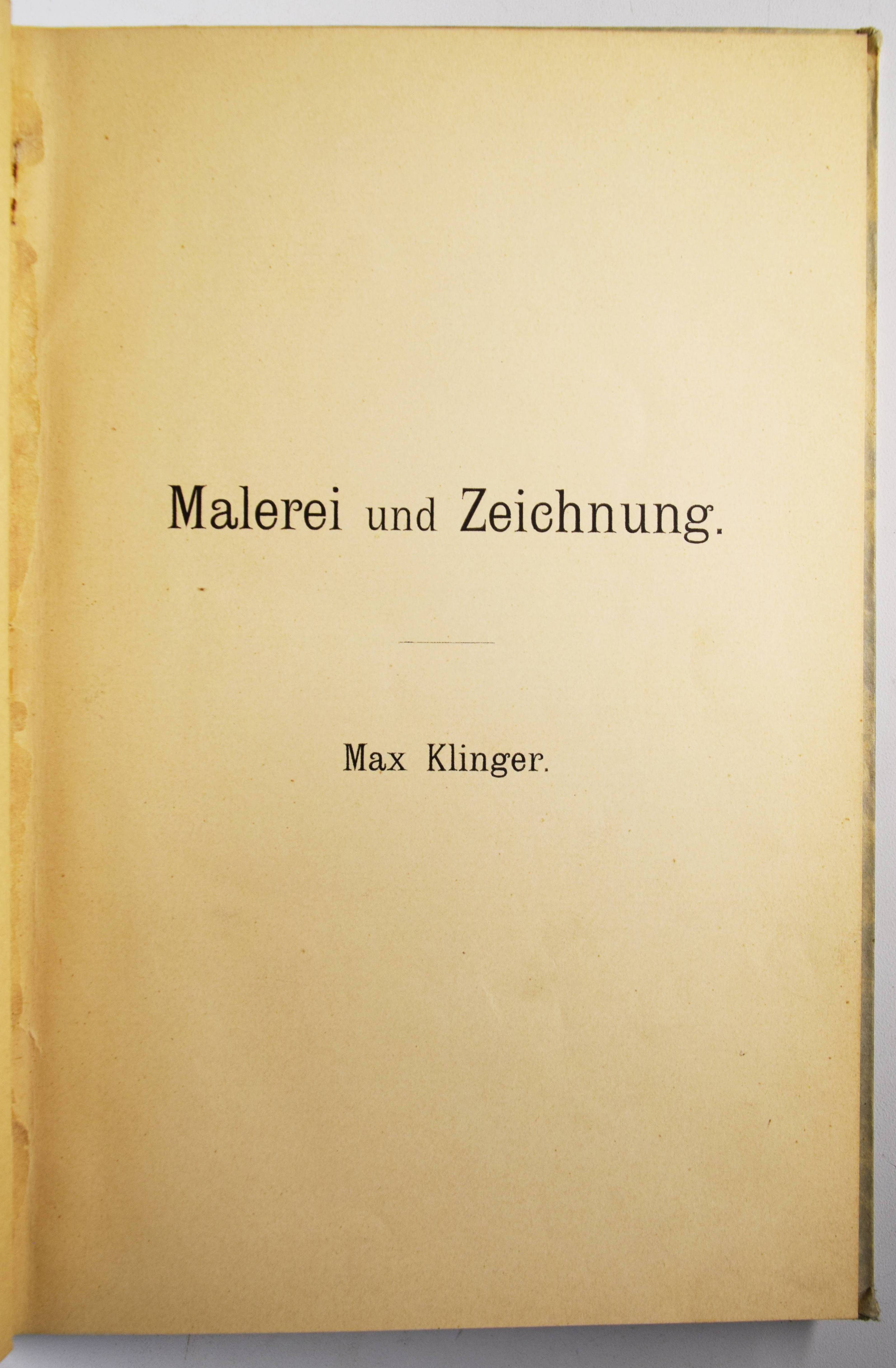 Klinger, Max. Malerei und Zeichnung. Leipzig, (Druck: G. Reusche) 1891. Gr.-8° (24,5 x 17 cm.). 46 S., [1] Bl. Moderner Halbleinenband (typogr. Orig.-Umschlag beigebunden). Sehr seltene erste Ausgabe der kunsttheoretischen Arbeit des bedeutenden Vertreters des deutschen Symbolismus Max Klinger (1857-1920). Klinger verteidigt die Darstellung des nackten menschlichen Körpers. In der Tradition von Antike und Renaissance sah er darin die höchste Aufgabe der Kunst. – „Die zu Lebzeiten mehrfach aufgelegte, 46 Druckseiten umfassende Schrift gehört zu den frühen kunsttheoretischen Texten der deutschen Moderne und hat zur internationalen Anerkennung des damals erst 34jährigen Künstlers maßgeblich beigetragen. … Trotz ihrer kunstwissenschaftlichen Bedeutung hat die Schrift im Vergleich zu den Graphiken, Gemälden und Skulpturen des wohl bekanntesten deutschen Symbolisten nur wenig Beachtung in der Forschung gefunden … im Rahmen der Studie (wird) die Entstehungsgeschichte der Schrift neu aufgerollt und u. a. der Frage nachgegangenen, ob Klinger ursprünglich vielleicht ein umfangreicheres Malerei-Traktat nach dem Vorbild des 1882 erstmals in deutscher Übersetzung erschienenen „Trattato della Pittura“ von Leonardo da Vinci geplant hat. Warum änderte er seine Absichten und veröffentlichte schließlich anstelle eines Lehrbuchs einen eher selbstreferentiellen Essay?“ (Felix Billeter und Conny Simone Dietrich, Forschungs-Projekt im Auftrag der Fritz Thyssen Stitung, fritz-thyssen-stiftung(dot)de/fundings/max-klinger-und-seine-kunsttheoretische-schrift-malerei-und-zeichnung-1892-wissenschaftlich-bearbeitete-und-kommentierte-neuauflage-unter-beruecksichtigung-der-erhaltenen-manuskripte). – Sehr gutes Exemplar.