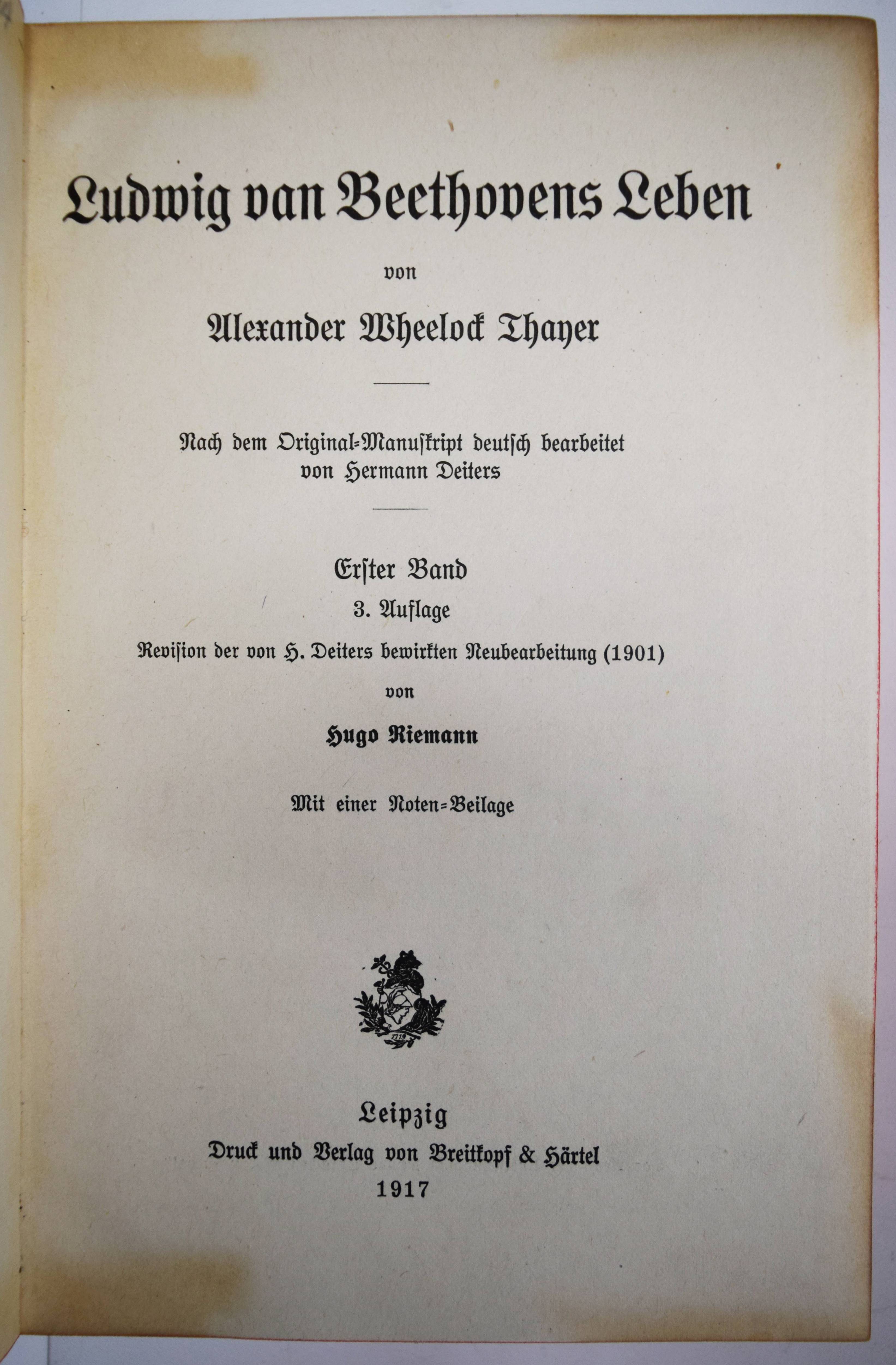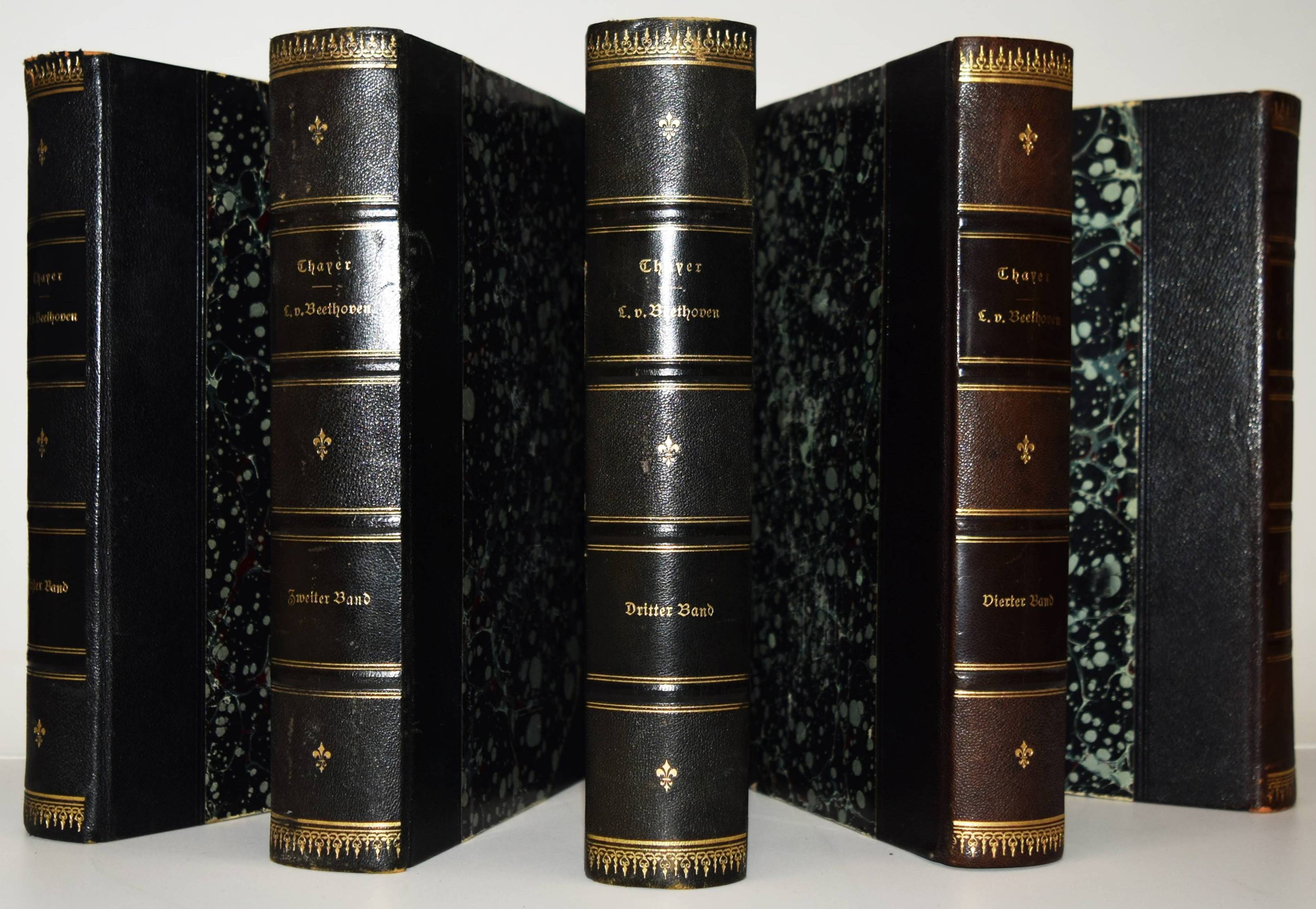 Beethoven – Thayer, Alexander Wheelock. Ludwig van Beethovens Leben. Nach dem Original-Manuskript deutsch bearbeitet von Hermann Deiters. Misch-Auflage, Revision der von H. Deiters bewirkten Neubearbeitung (1901) von Hugo Riemann. 5 Bände. Leipzig, Breitkopf & Härtel 1908-1917. Gr.-8°. Mit zahlr. Musik-Beispielen. Orig.-Halblederbände mit goldgepr. Rückentiteln und Rückenvergoldung. MGG I, 1563. NDB III, 572 f. (Deiters). Kat. Wolffheim II, 449. – „Vor allem … die deutsche Bearbeitung der damals noch nicht im englischen Original erschienenen Beethovenbiographie des Amerikaners Alexander Wheelock Thayer (1817-1897) seit 1866 (in 3 Bänden, denen, von Hugo Riemann betreut, noch 2 weitere folgten) sind Gipfelleistungen in der Geschichte der neueren Musikerbiographie geworden“ (NDB). – Band I am Kapital geringfügig beschädigt, schönes Exemplar der dekorativen Halblederausgabe.