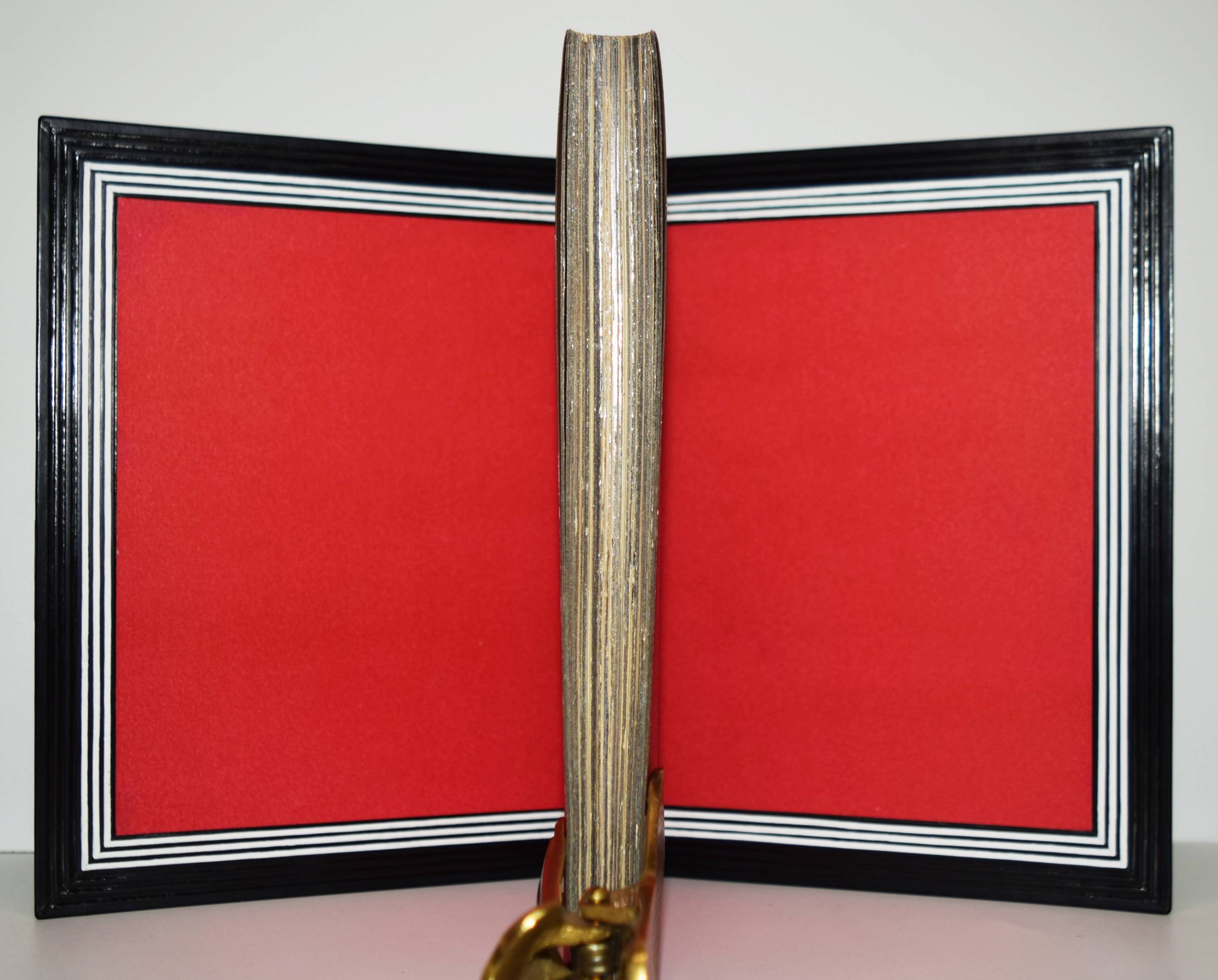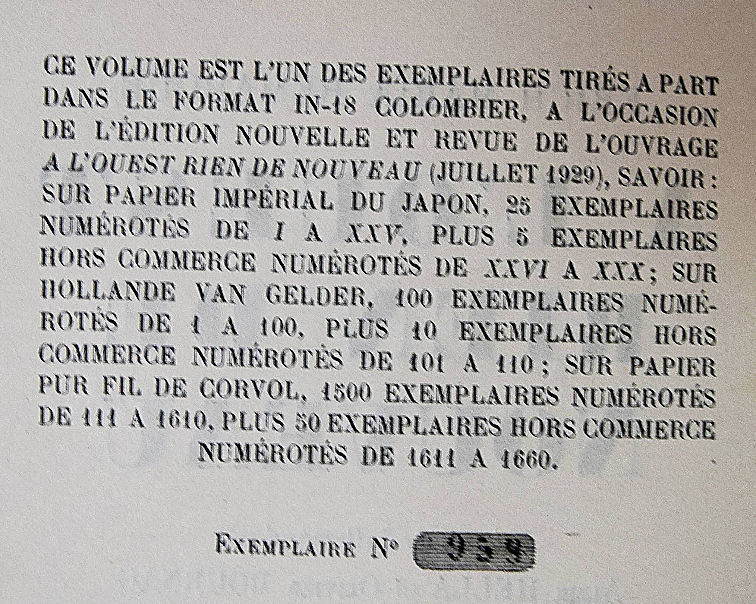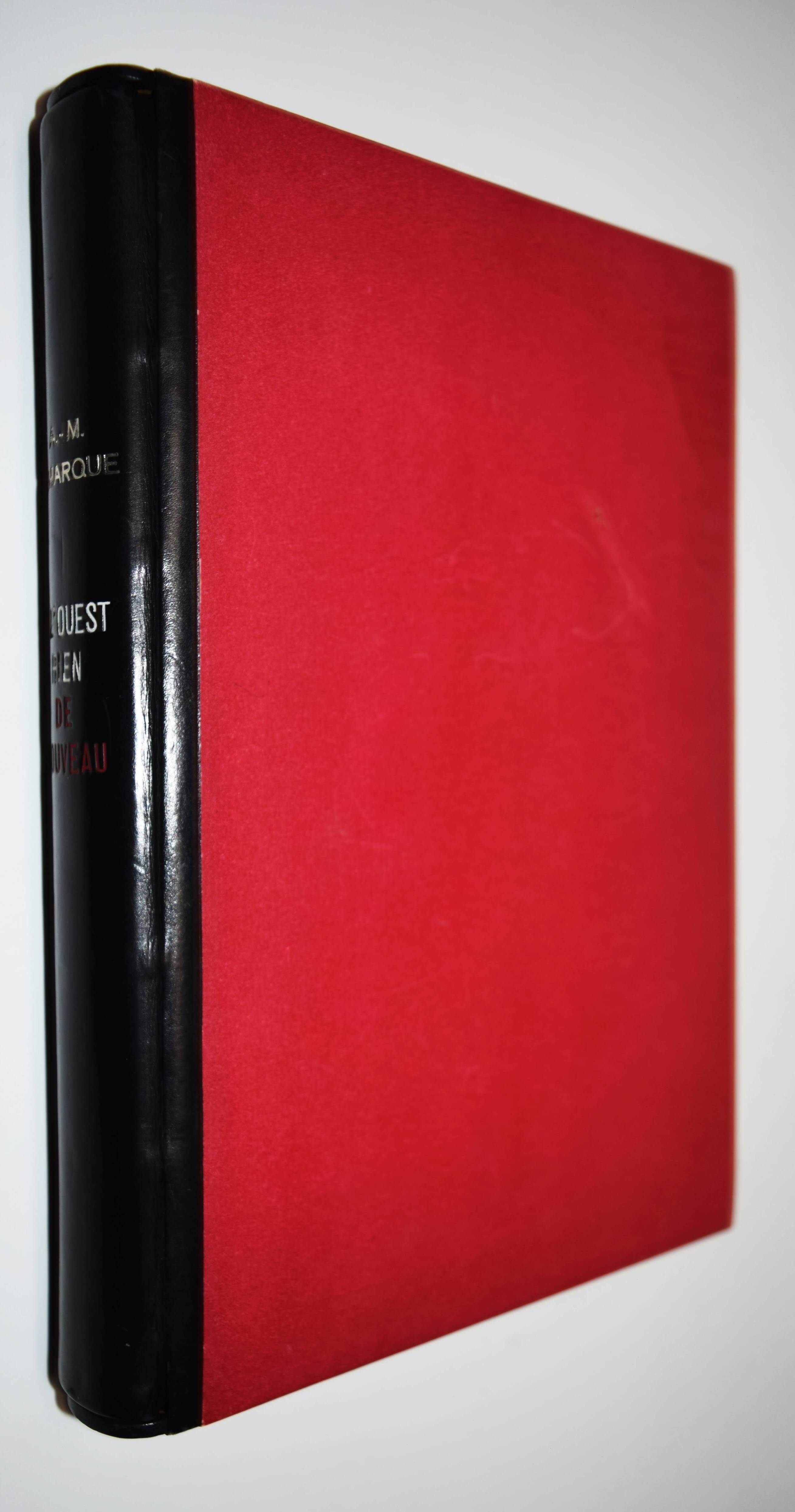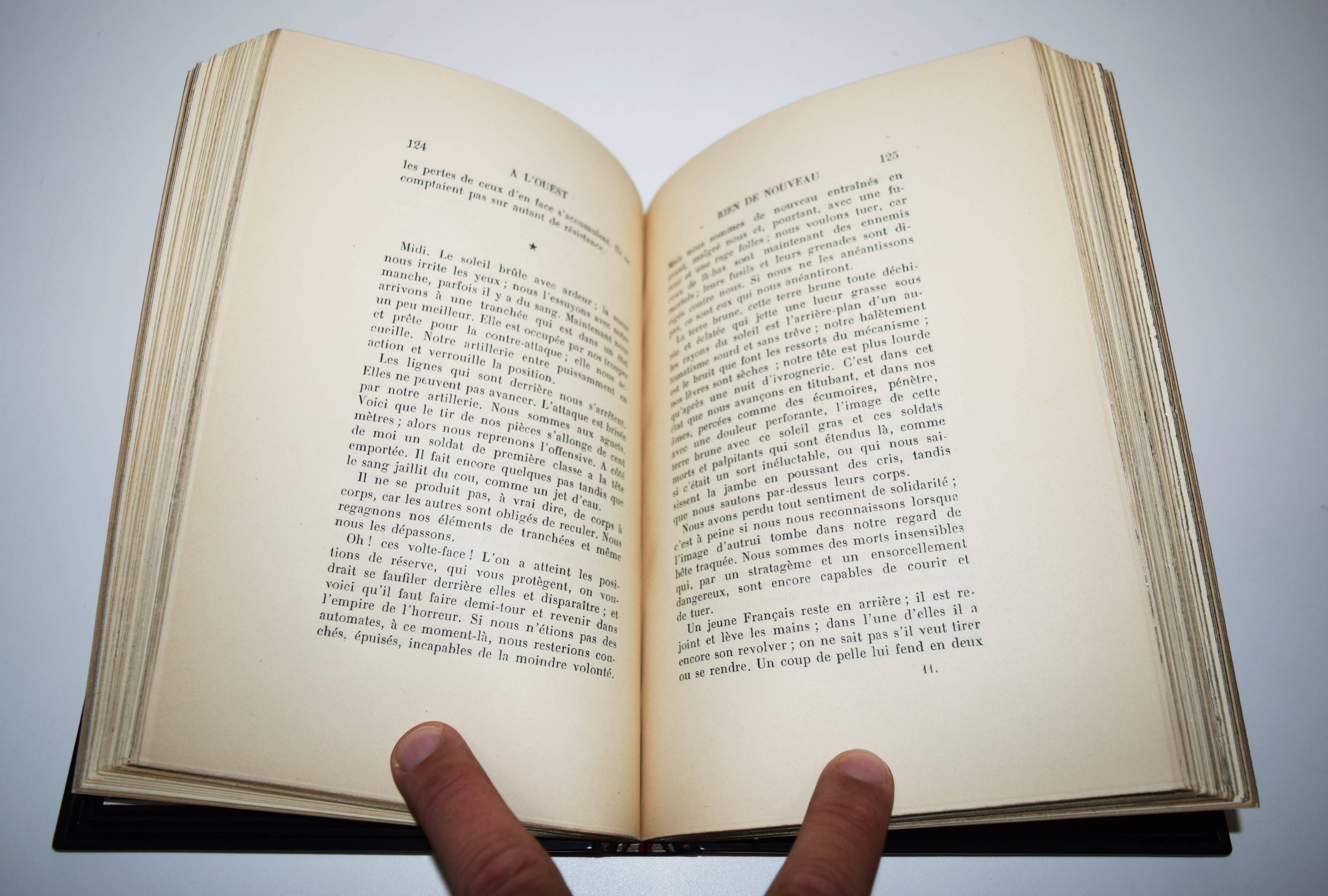 Remarque, Erich Maria (d. i. Erich Paul Remark). A l’ouest rien de nouveau. Traduit de l’allemand par Alzir Hella et Olivier Bournac. Édition nouvelle. Paris, Librairie Stock (Delamain et Boutelleau) 1929. 8°. 303, (1) S. Schwarzer Kalbslederband um 1940 mit Rückentitel in Silber, Weiß und Rot, figürliche Ledereinlagen auf dem Vorderdeckel in grau Schwarz und Gold (deutsche Soldaten mit Pickelhauben in einem Schützengraben), Spiegel mit blind- und weiß geprägten Rahmen und Silberschnitt in gefüttertem Pappschuber (Orig.-Umschlag beigebunden). Erste französische Ausgabe, im Jahr der ersten Ausgabe. Eines von 1550 num. Exemplaren auf „Papier pur Fil de Corvol“ (Gesamtauflage 1660 Exemplare). – Außergewöhnlich schönes Exemplar in einem stimmigen Künstler-Einband mit „Schützengraben“-Motiv.