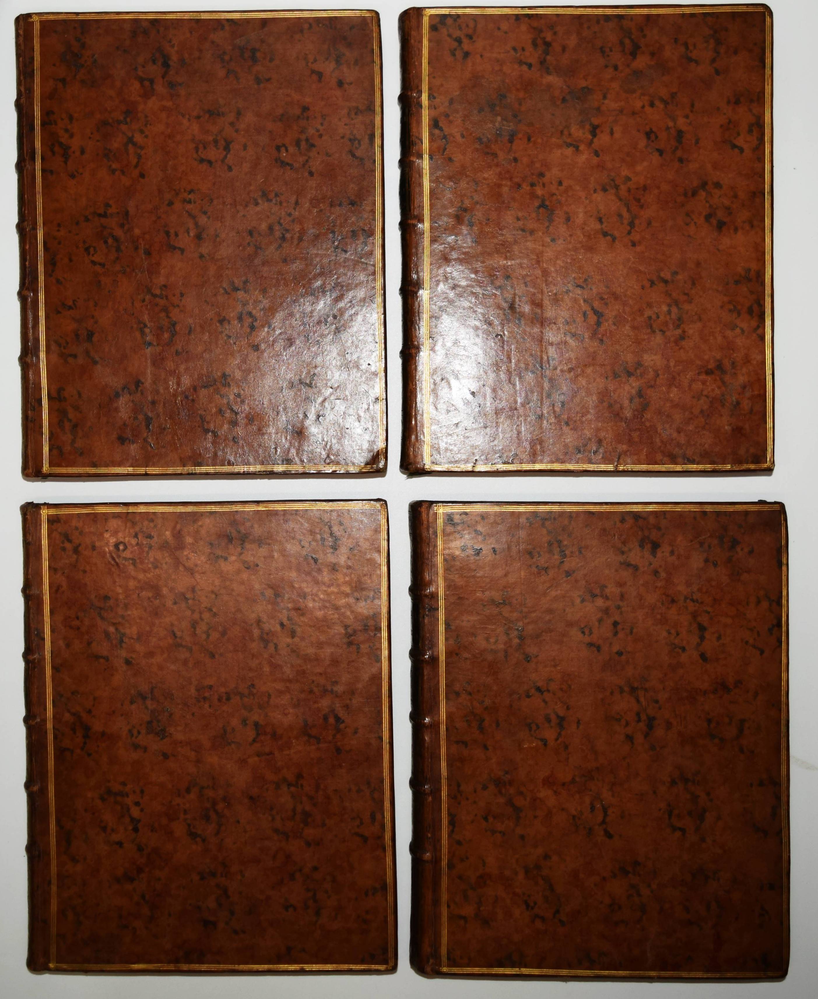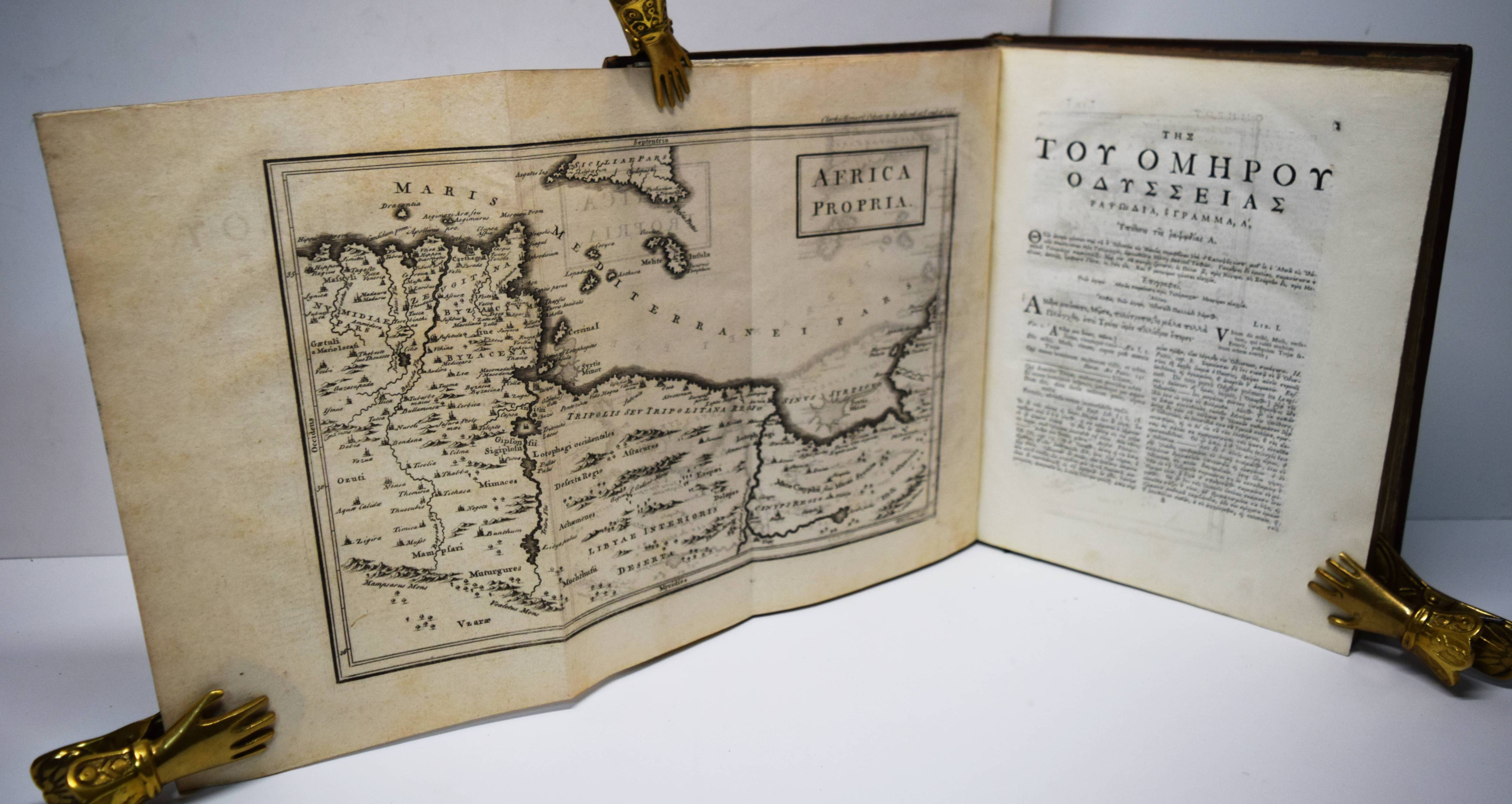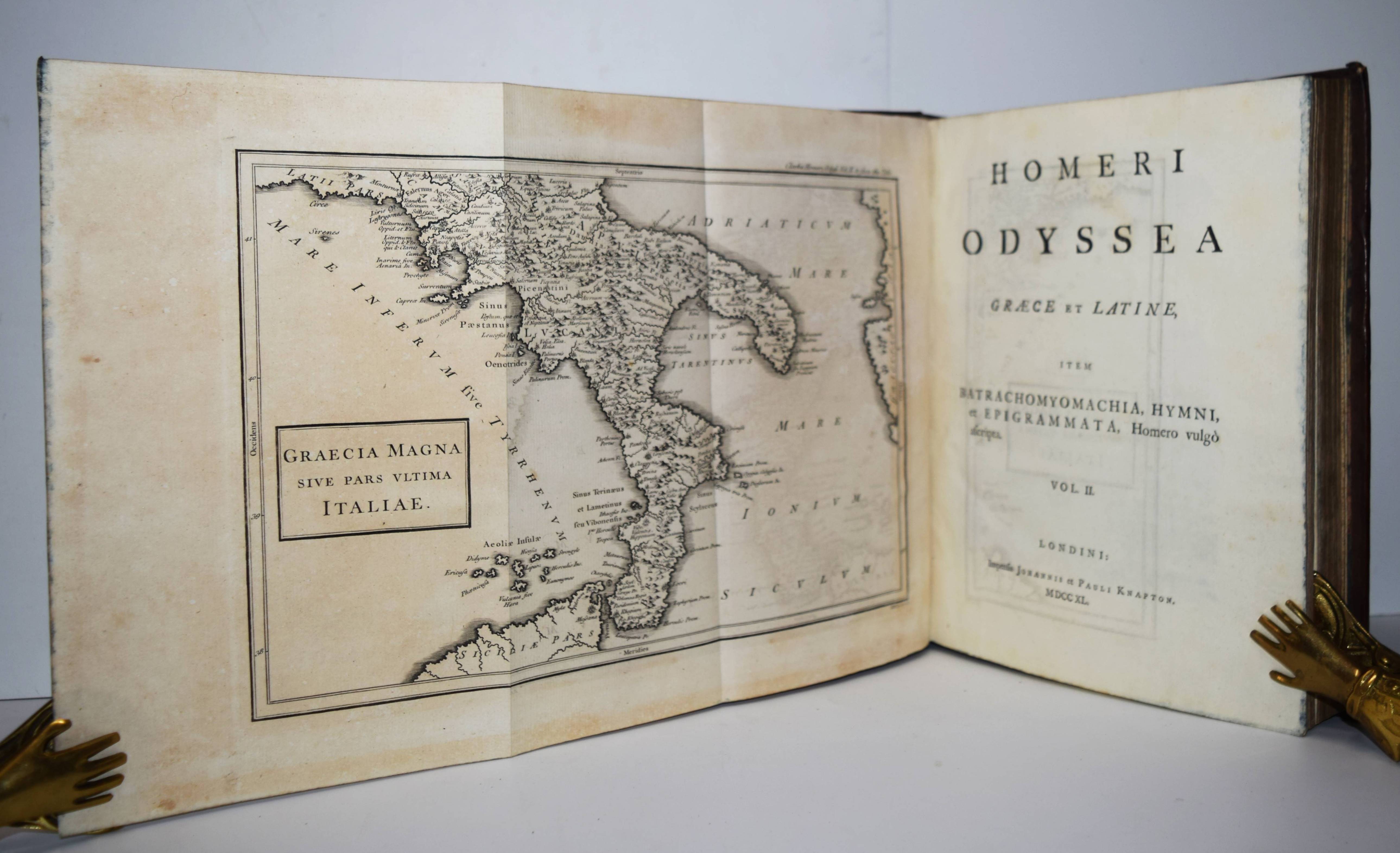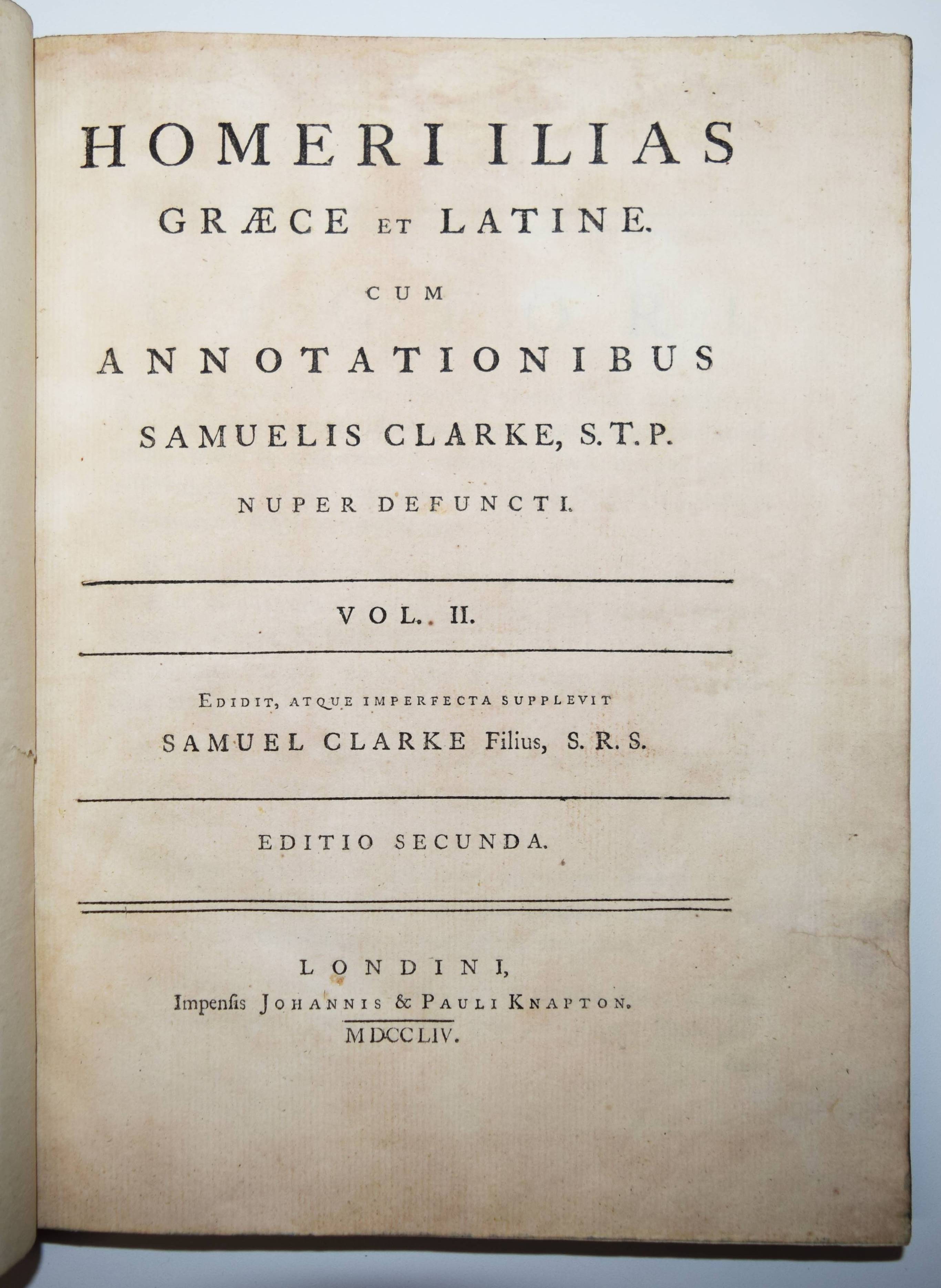 Homer (Hómeros). Odyssea (et) Ilias. Graece et Latine. Edidit, annotationesque, ex notis nonnullis MStis… adjecit Samuel Clarke. Editio prima (Odyssea) et editio secunda (Ilias). 4 Bände. London, Johannis et Pauli Knapton 1740-1754. 4° (26 x 19,5 cm.). [4] Bl., 370 (statt 374) S.; Titel, S. 375-784, [18] Bl.; [3] Bl., 344 S.; [2] Bl., 347 S., [6] Bl. mit 4 gefalt. gestoch. Karten. Kalbslederbände der Zeit mit goldgepr. Rückenschildern, reicher floraler Rückenvergoldung, Deckelfiletten und Goldschnitt. Schweiger S. 158. – Berühmte zweisprachige Gesamtausgabe des Klassikers mit dem altgriechischen Text und der lateinischen Übersetzung des bedeutenden britischen Philologen, Theologen und Philosophen Samuel Clarke (1675-1729), Freund und Übersetzer von Isaac Newton. Das Werk wurde posthum von seinem Sohn Samuel Clarke herausgegeben und vervollständigt. – „In 1729 he published the first twelve books of Homer’s Iliad. This edition, dedicated to William Augustus, Duke of Cumberland, was praised by Bishop Hoadly. Three years after his death appeared also the last twelve books of the Iliad, published by his son Samuel Clarke, the first three of these books and part of the fourth having, as he states, been revised and annotated by his father“ (C. Hugh, Encyclopaedia Britannica, 1911, Vol. VI). – 2 Bl. (S. 219-220) in Band I fehlen (waren wohl nie beigebunden), gestoch. Exlibris, außergewöhnlich schönes, sauberes und dekorativ gebundenes Exemplar.