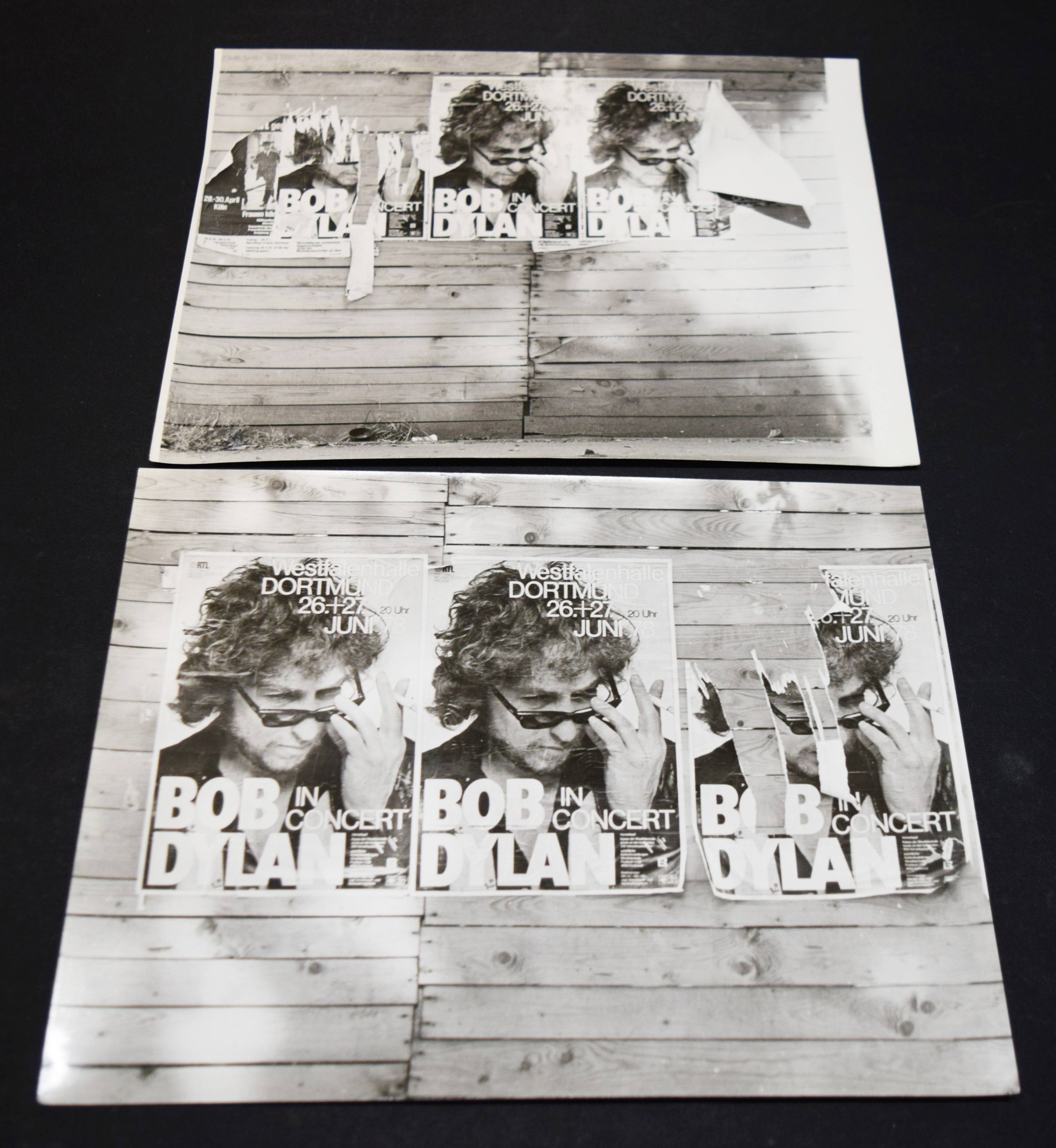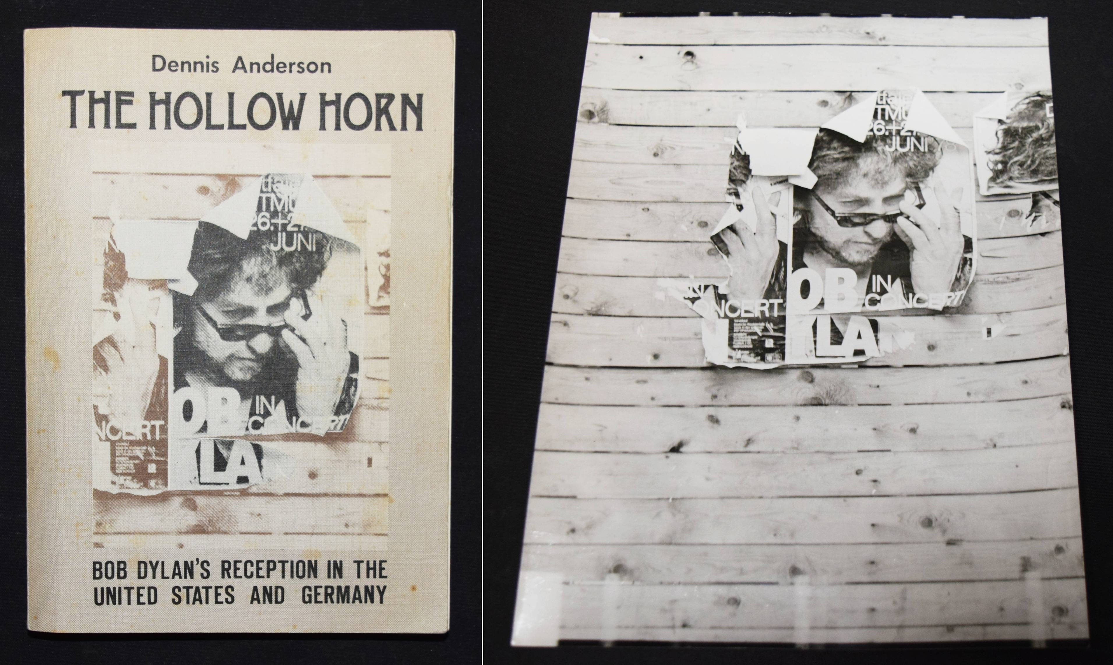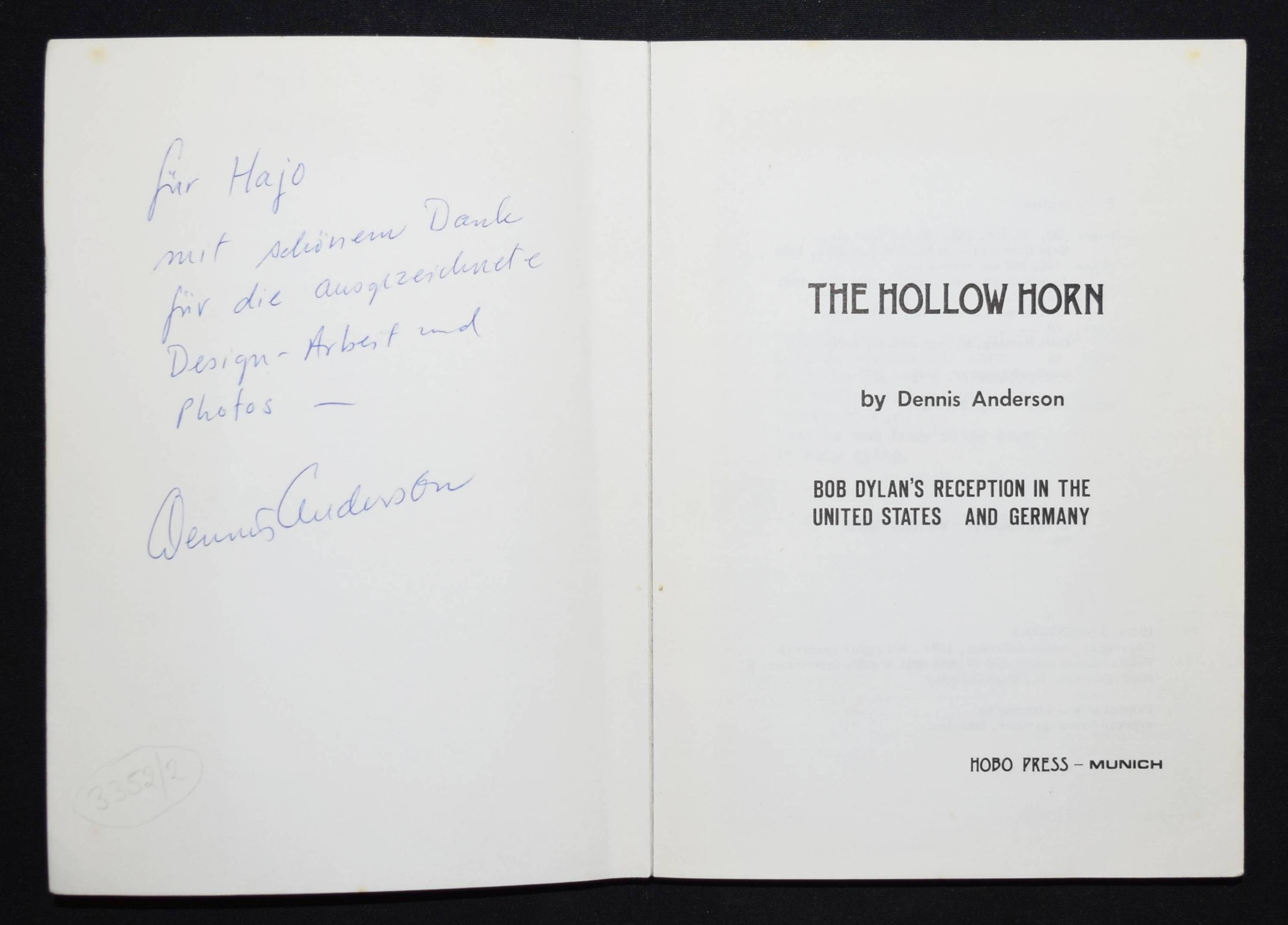 Dylan – Anderson, Dennis. The hollow horn. Bob Dylan’s reception in the United States and Germany. München, Hobo Press (1981). 8°. IX, 280 S. mit 13 Abb. von Hajo Bernhard (6, inkl. Umschlag), Angela Dierks (3), Carl Harding (4) und Gerfried Zwicker sowie 11 Orig.-Photographien (Silbergelatine, jeweils 18 x 24 cm.) von Hajo Bernhard. Illustr. Orig.-Kartonumschlag (Entwurf: Hajo Bernhard). (Dylanology – Whatever that is, vol. 1). Mit eigenhändiger Widmung von D. Anderson „Für Hajo (Bernhard) mit schönem Dank für die ausgezeichnete Design-Arbeit und Photos – Dennis Anderson“. – Die beiligenden Orig.-Fotos zeigen Konzert-Plakate des legendären Dylan-Konzerts in der Westfalen-Halle in Dortmund im Juni 1978 (5 verschiedene Abzüge, wovon einer für das Cover-Bild verwendet wurde). Von zwei beiliegenden Konzert-Fotos, ist eines im Buch abgedruckt. Die anderen Aufnahmen, meist bei Interviews oder Pressekonferenzen entstanden, sind nicht im Buch abgedruckt. Das Buch enthält Aufnahmen von Konzerten in München, Bonn und Berlin; eine Aufnahme zeigt Dylan am Flughafen in Sydney. – Umschlag und Schnitt etwas braunfleckig, sonst gut erhalten.