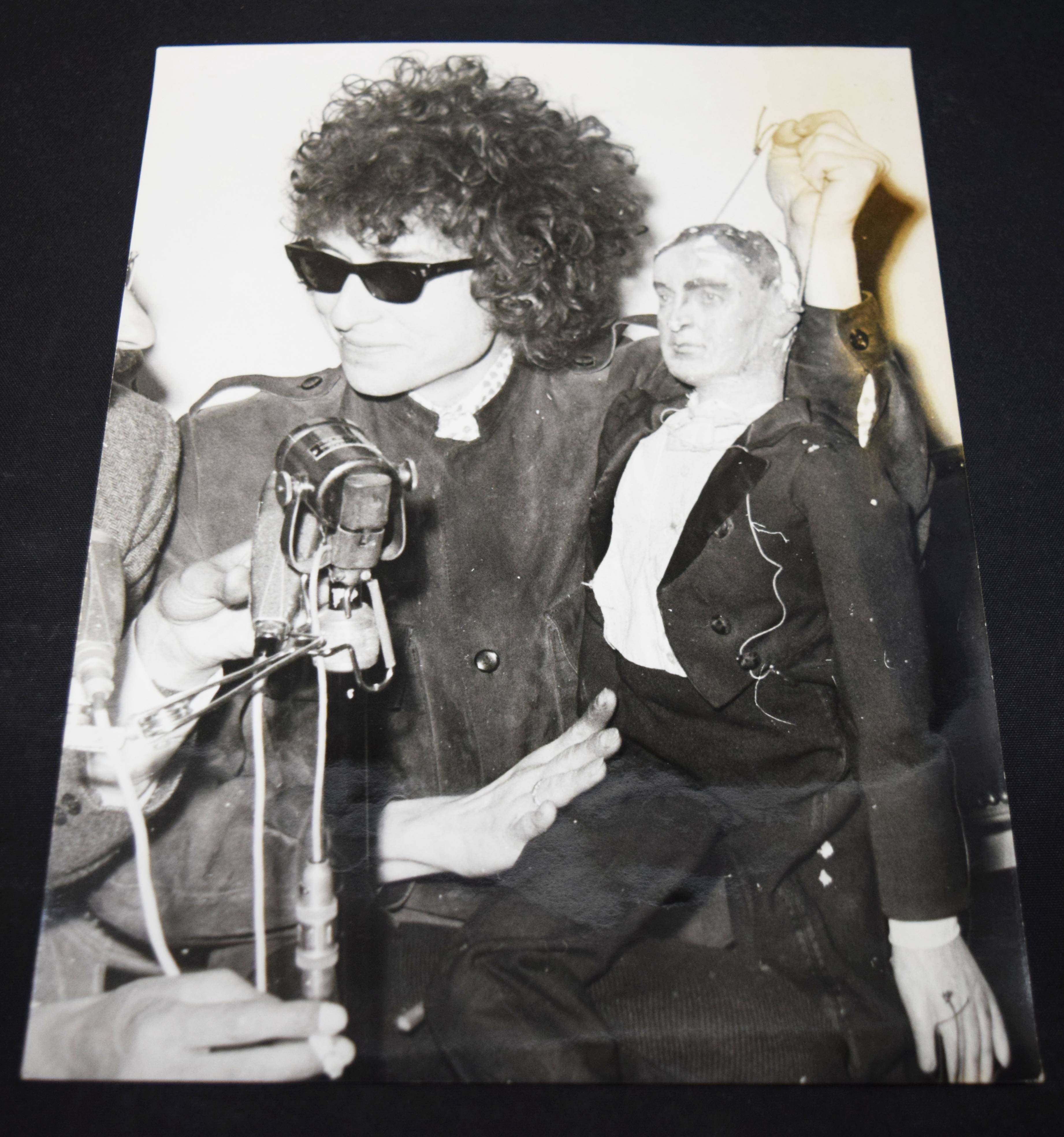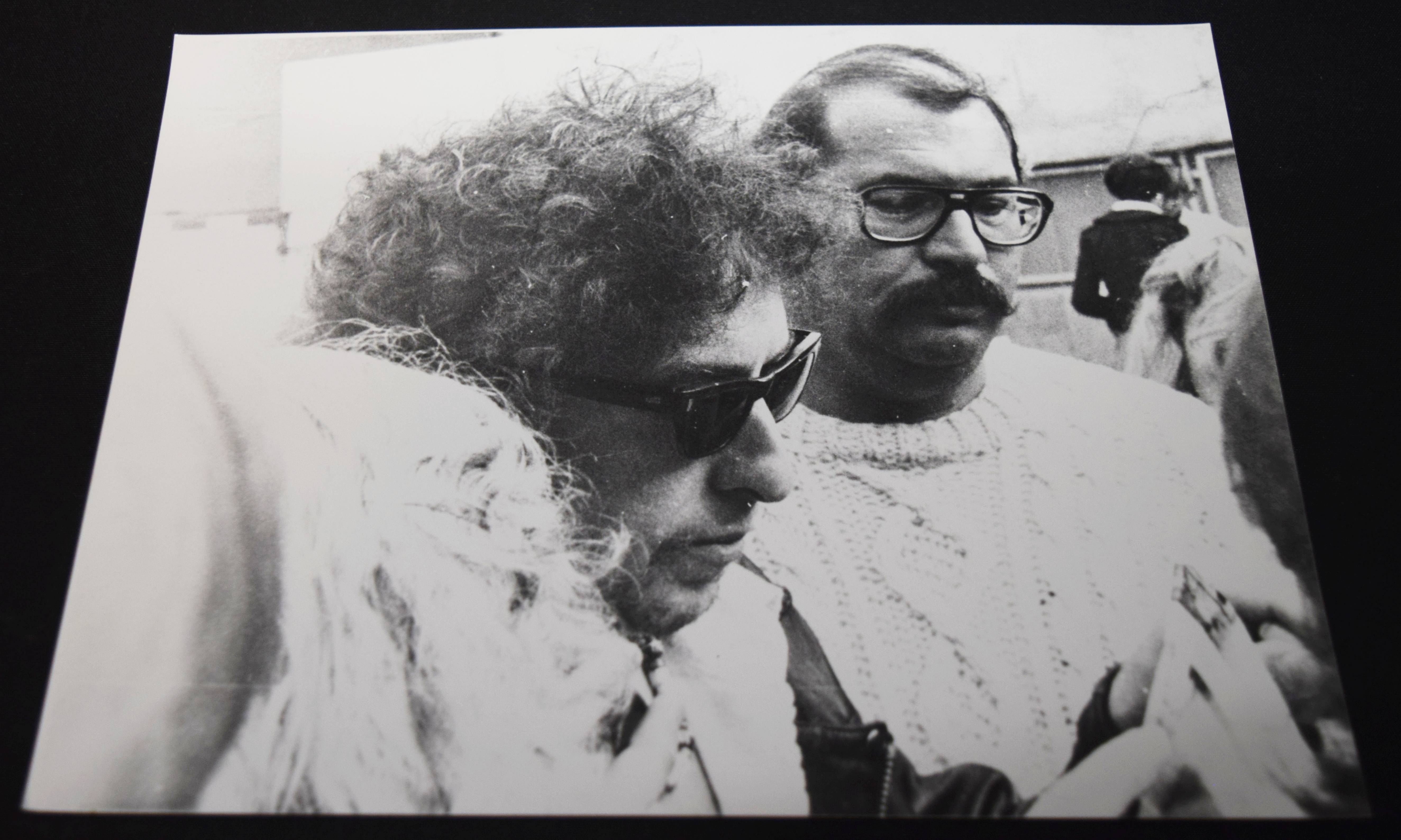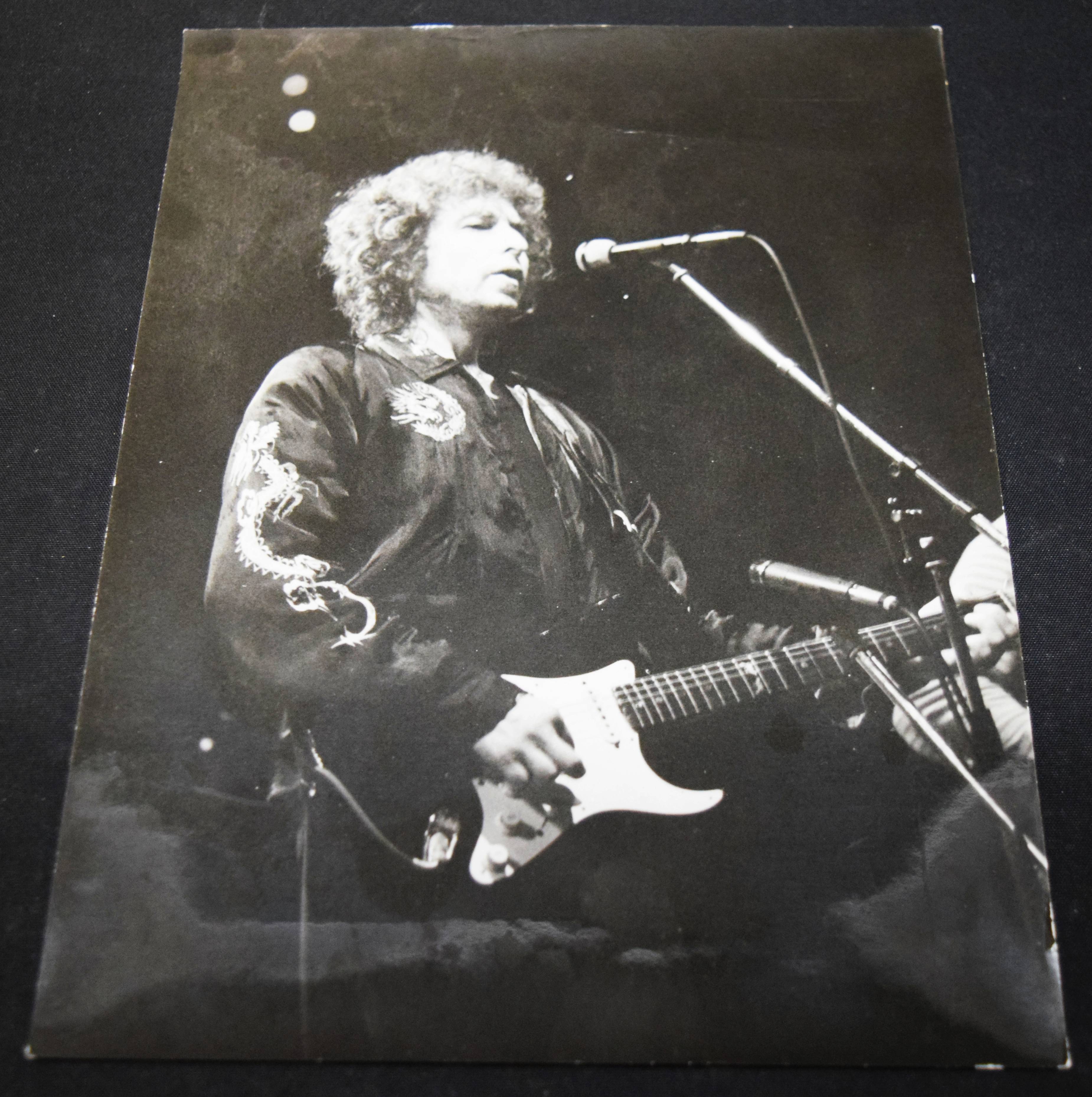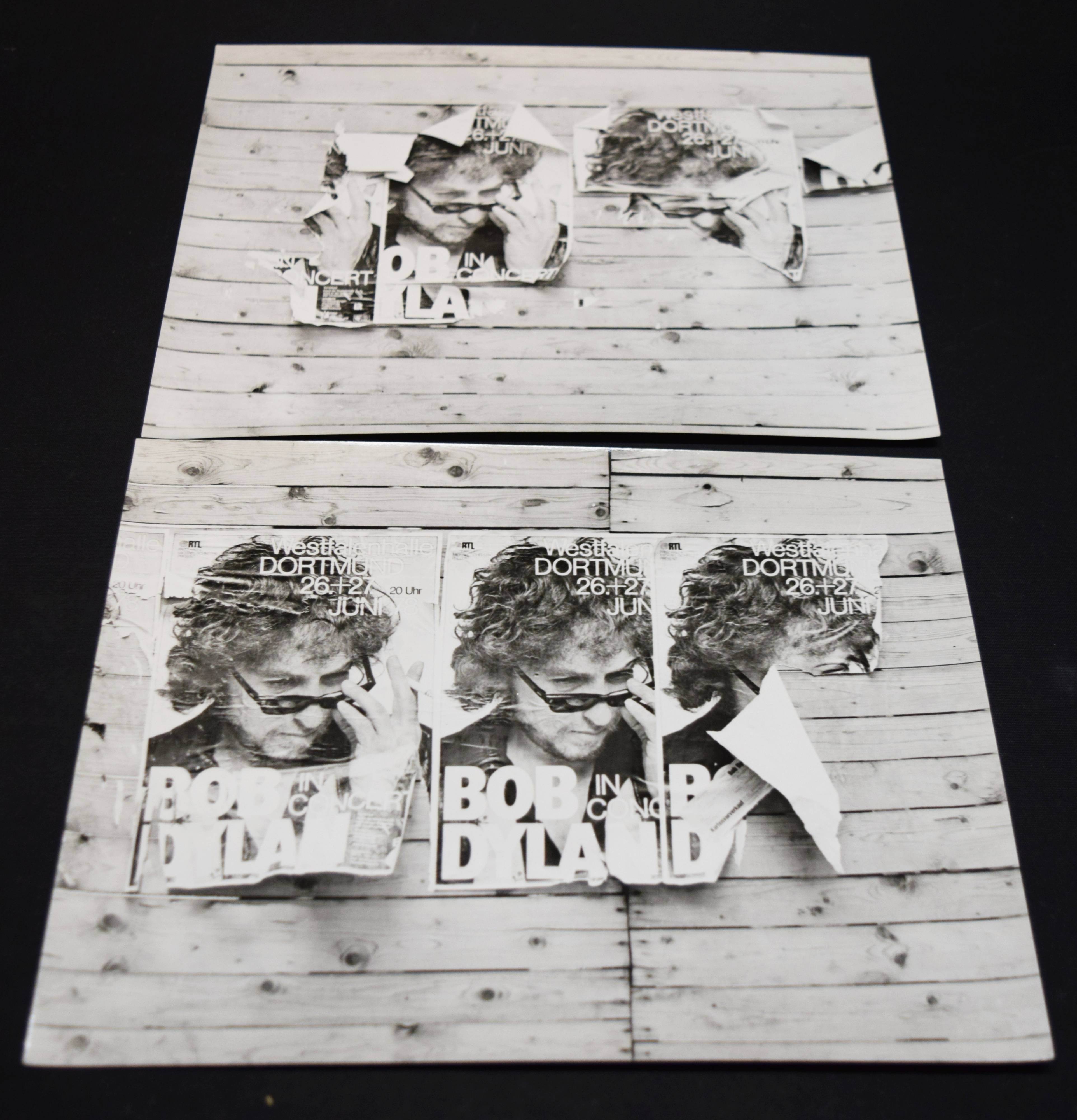 Dylan – Anderson, Dennis. The hollow horn. Bob Dylan’s reception in the United States and Germany. München, Hobo Press (1981). 8°. IX, 280 S. mit 13 Abb. von Hajo Bernhard (6, inkl. Umschlag), Angela Dierks (3), Carl Harding (4) und Gerfried Zwicker sowie 11 Orig.-Photographien (Silbergelatine, jeweils 18 x 24 cm.) von Hajo Bernhard. Illustr. Orig.-Kartonumschlag (Entwurf: Hajo Bernhard). (Dylanology – Whatever that is, vol. 1). Mit eigenhändiger Widmung von D. Anderson „Für Hajo (Bernhard) mit schönem Dank für die ausgezeichnete Design-Arbeit und Photos – Dennis Anderson“. – Die beiligenden Orig.-Fotos zeigen Konzert-Plakate des legendären Dylan-Konzerts in der Westfalen-Halle in Dortmund im Juni 1978 (5 verschiedene Abzüge, wovon einer für das Cover-Bild verwendet wurde). Von zwei beiliegenden Konzert-Fotos, ist eines im Buch abgedruckt. Die anderen Aufnahmen, meist bei Interviews oder Pressekonferenzen entstanden, sind nicht im Buch abgedruckt. Das Buch enthält Aufnahmen von Konzerten in München, Bonn und Berlin; eine Aufnahme zeigt Dylan am Flughafen in Sydney. – Umschlag und Schnitt etwas braunfleckig, sonst gut erhalten.