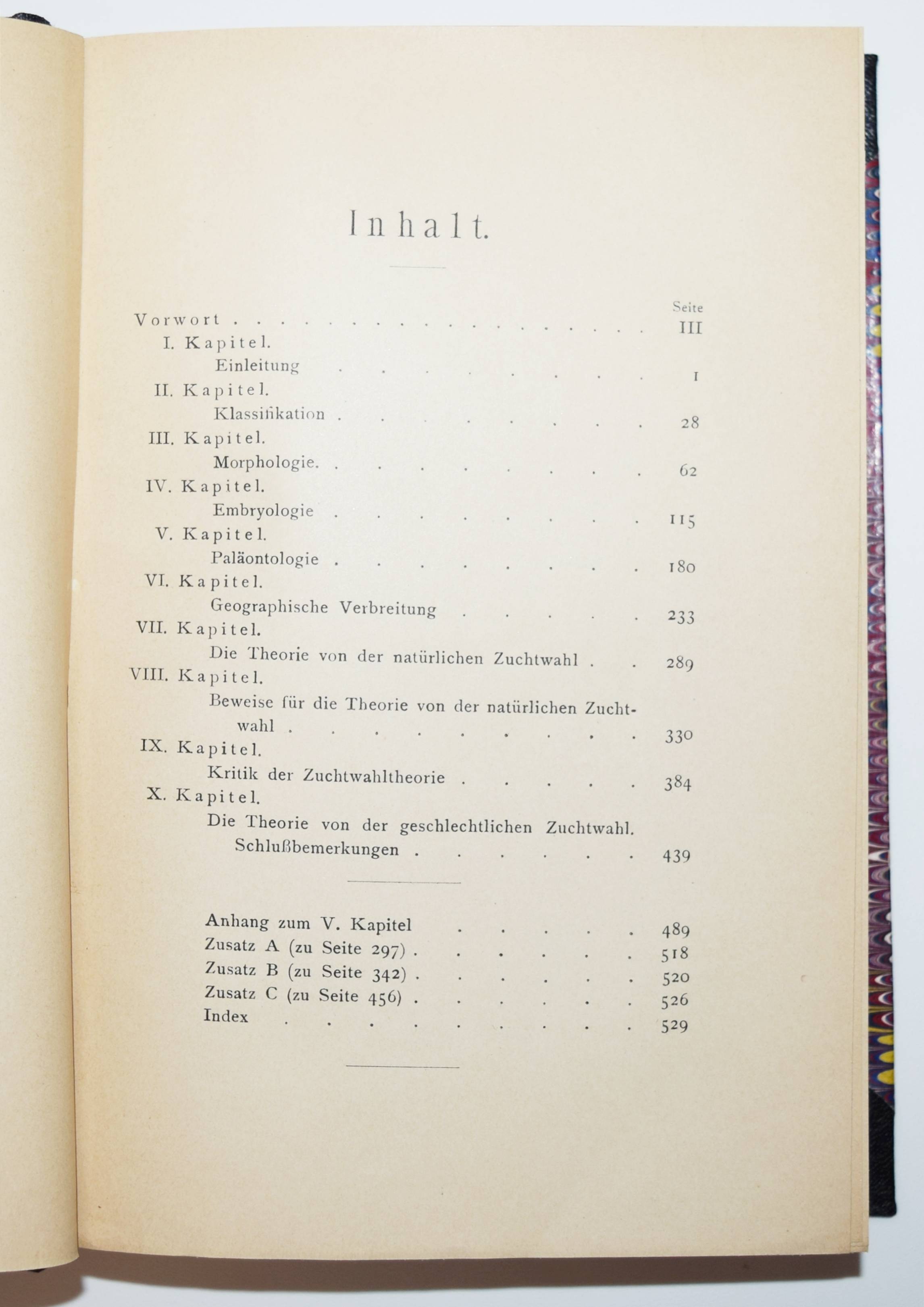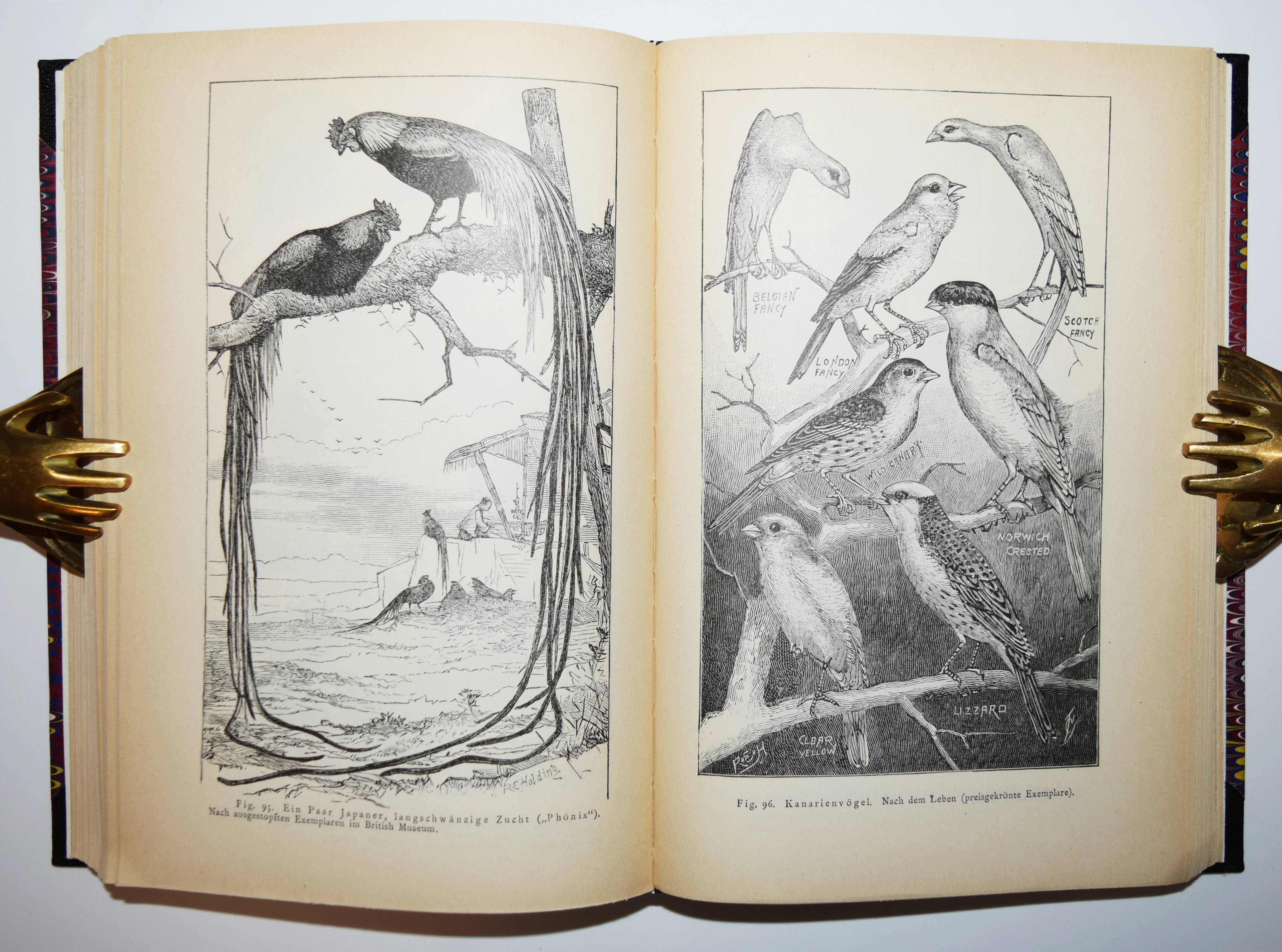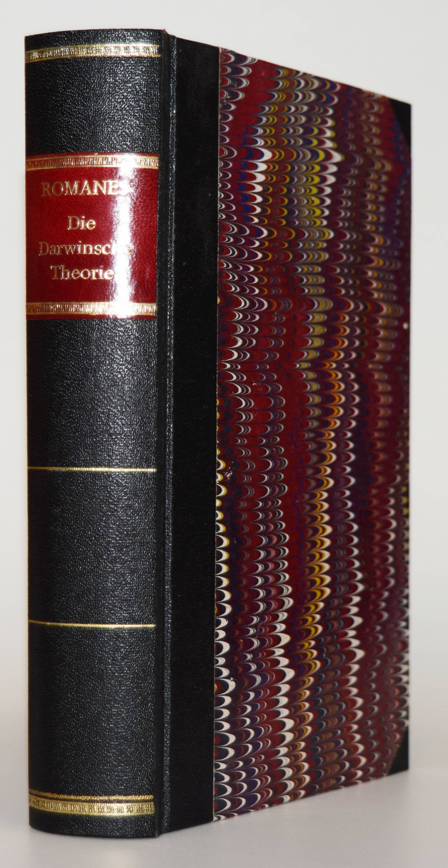 Romanes, George John. Darwin und nach Darwin. Eine Darstellung der Darwinschen Theorie und Erörterung Darwinistischer Streitfragen. I. Band. Die Darwinsche Theorie. Mit Bewilligung des Verfassers aus dem Englischen übersetzt von B. Vetter. Leipzig, Wilhelm Engelmann 1892. 8°. V, [1] Bl., 542 S. mit 1 Portrait und 124 Holzstichen im Text. Moderner Halbleinenband mit goldgepr. Rückenschild und Linienvergoldung. Seltene erste deutsche Ausgabe des ersten Teils der wichtigen Abhandlung über Darwins Evolutions-Theorie. 1895 und 1897 erschienen noch weitere Bände „Darwinistische Streifragen. Vererbung und Nützlichkeit“ und „Darwinistische Streitfragen. Isolation und physiologische Auslese“. – Der britische Evolutionsbiologe G. J. Romanes (1848-1894) „legte den Grundstein für die Tierpsychologie und sagte Ähnlichkeiten zwischen den kognitiven Prozessen bei Menschen und Tieren voraus, schrieb Tieren jedoch auch in weit stärkerem Maß menschliche Eigenschaften zu als dies wissenschaftlich gesichert war (Anthropomorphismus). Er war der jüngste von Charles Darwins akademischen Freunden. Seine Sicht auf die Evolution hat historische Bedeutung. Romanes führte den Begriff Neodarwinismus ein, der heute noch genutzt wird, um eine neuere Form des Darwinismus zu bezeichnen. Sein früher Tod stellte einen Verlust für die britische Evolutionsbiologie dar. Innerhalb von sechs Jahren wurden die mendelschen Arbeiten wiederentdeckt und neue Ansichten zur Debatte gestellt“ (Wikipedia). – Sehr gutes Exemplar.