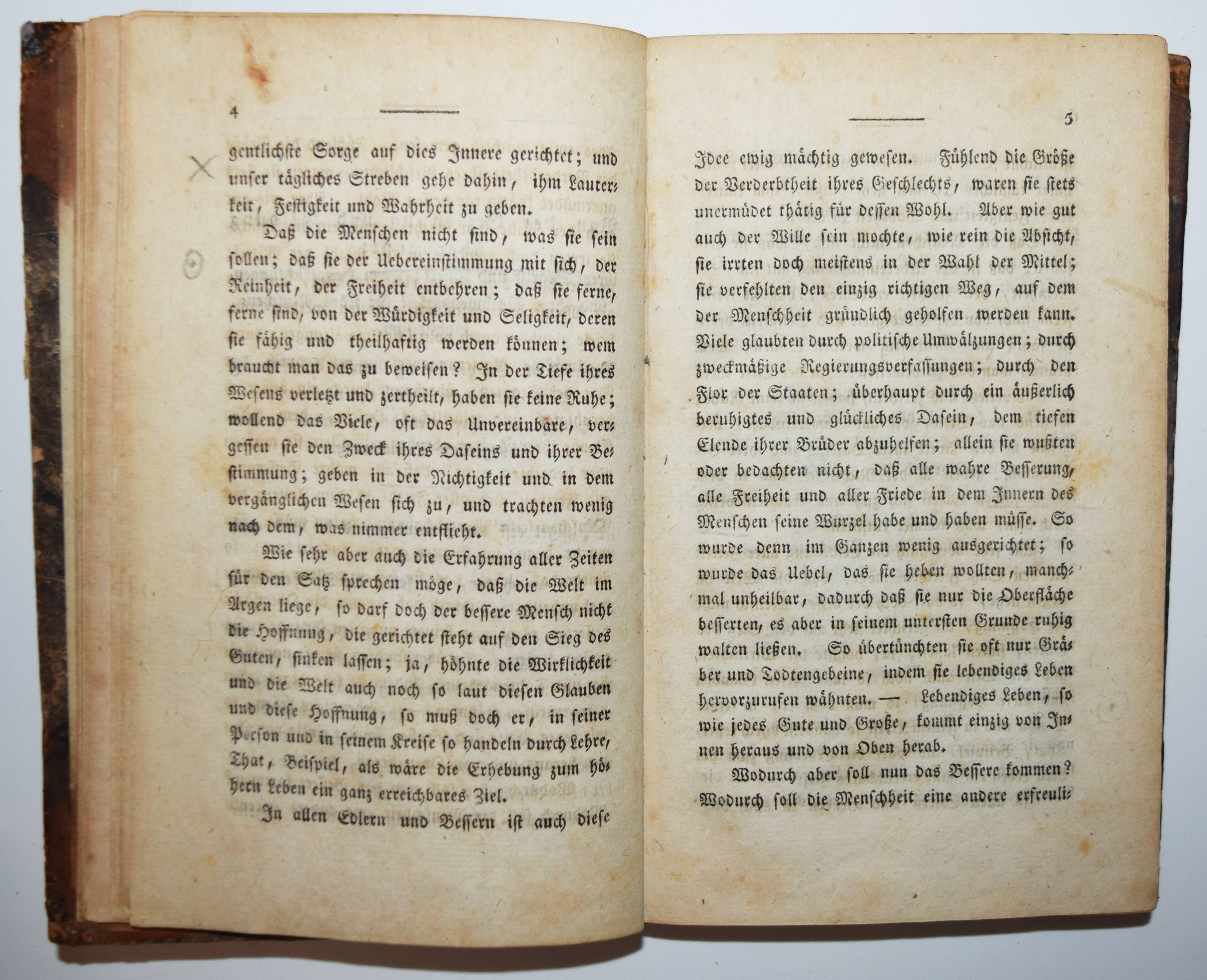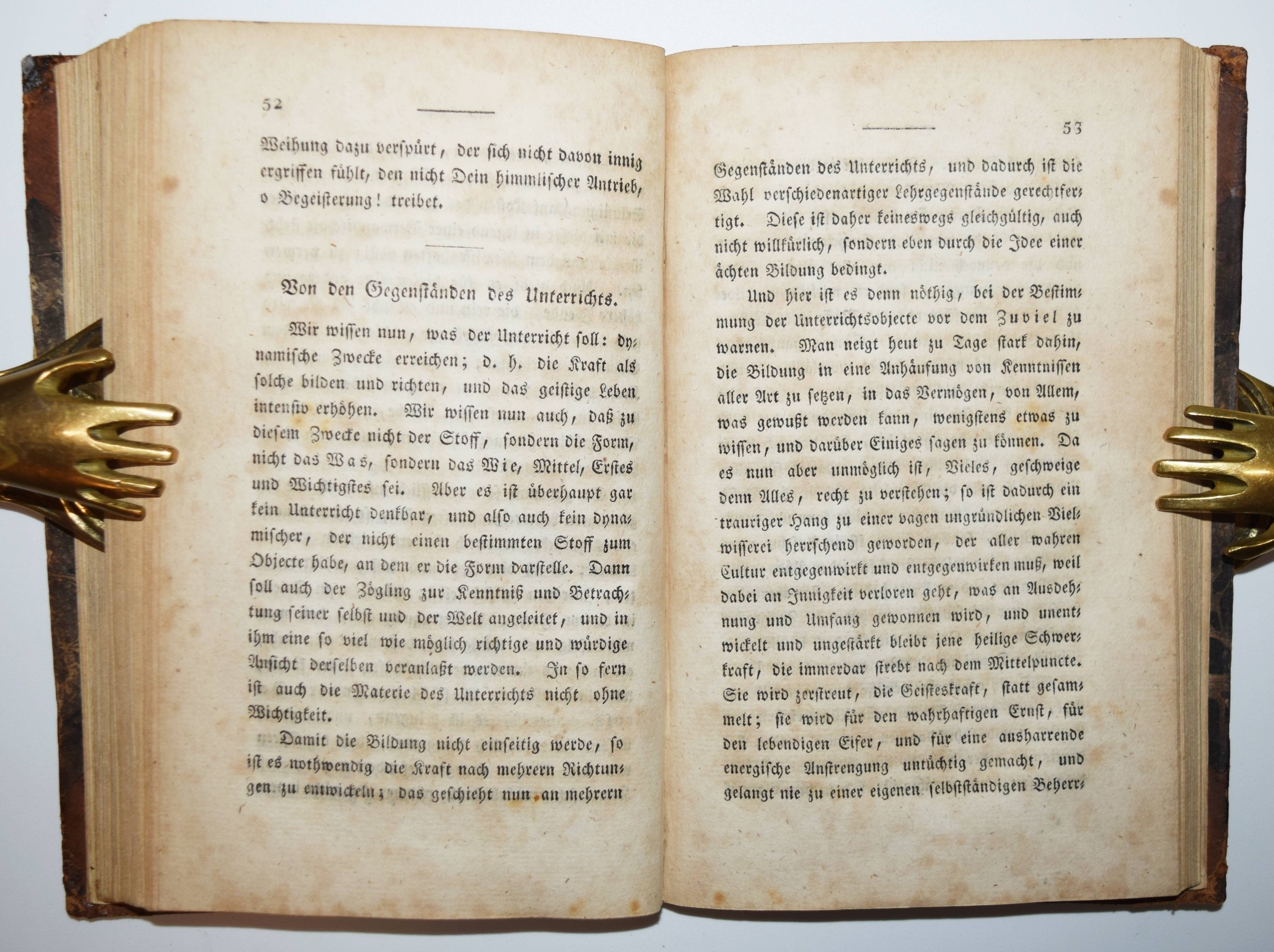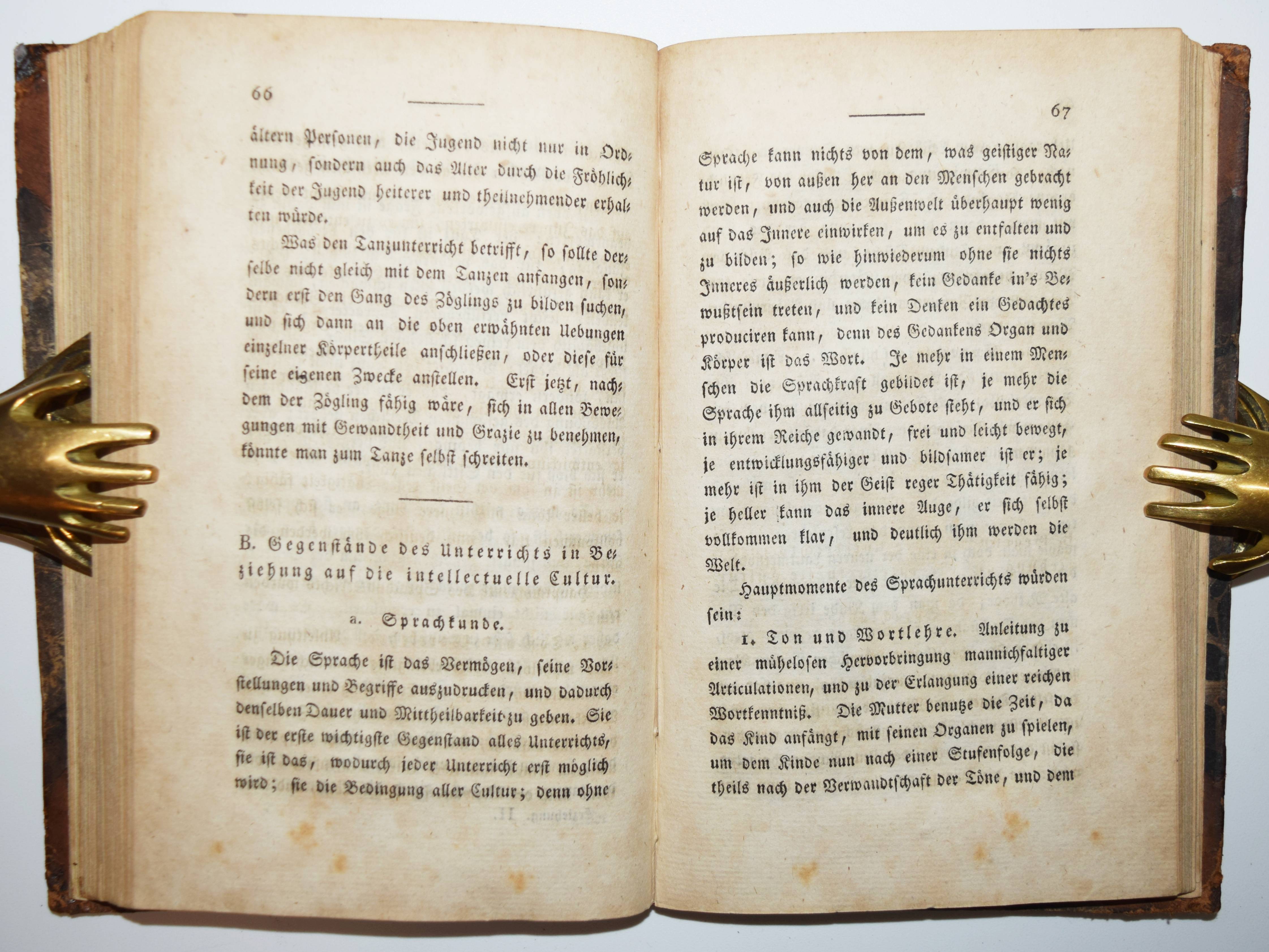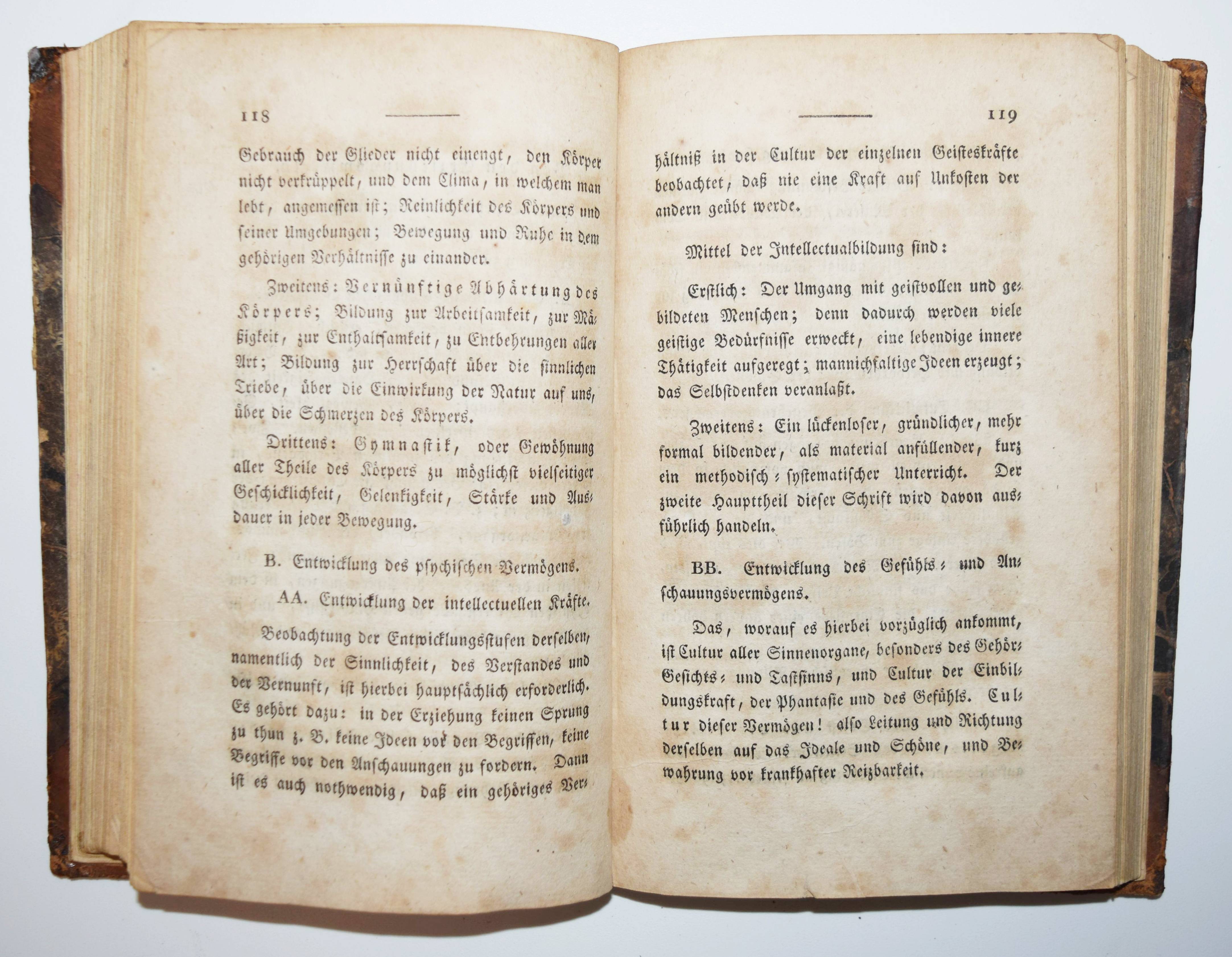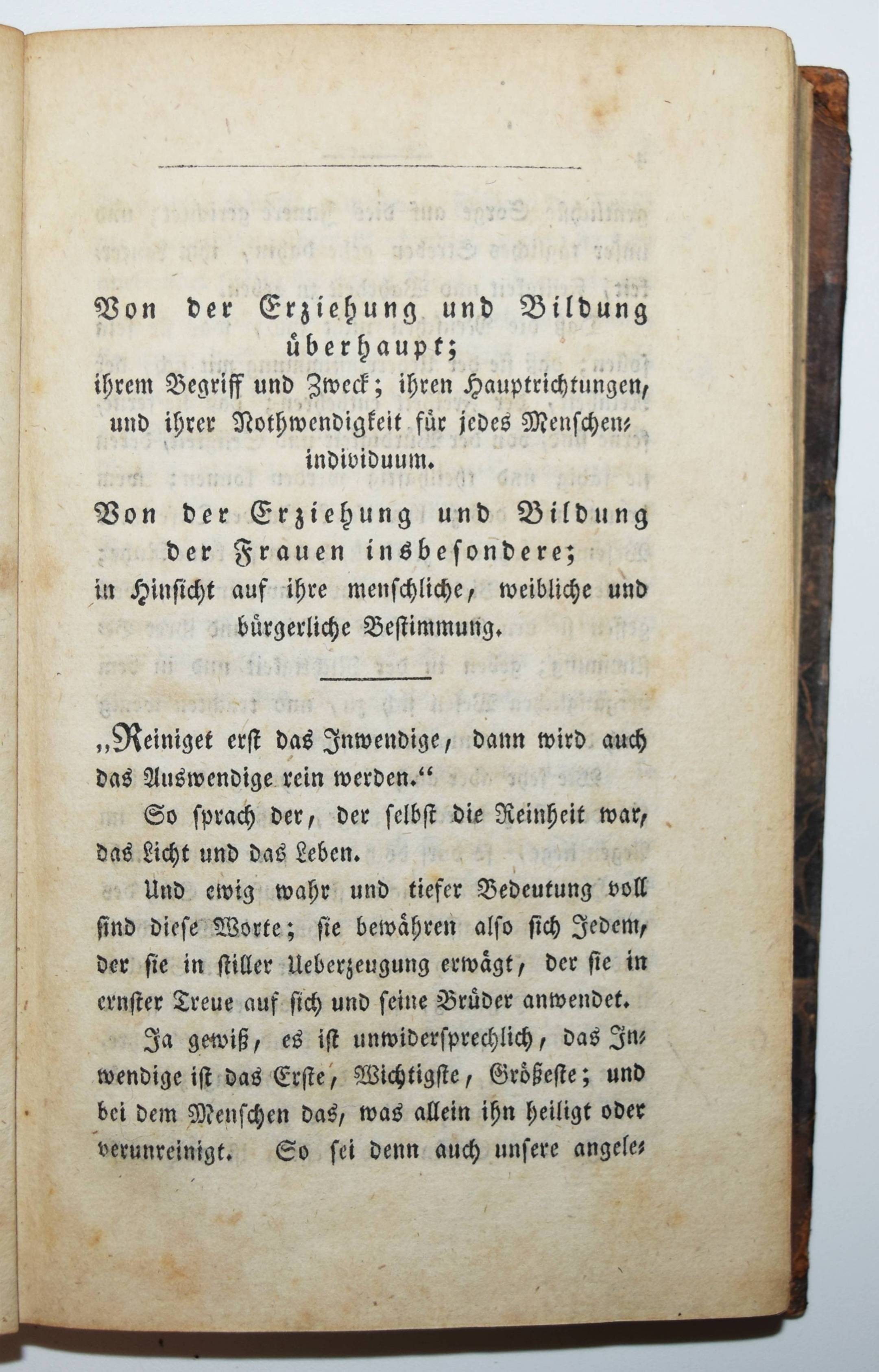 Gleim Betty. Erziehung und Unterricht des weiblichen Geschlechts. Ein Buch für Eltern und Erzieher 2 Teile in 1 Band. Leipzig, G. J. Göschen 1810. Kl.-8°. Titel mit gestoch. Vignette, XVI, 162 S.; 154 S. [2] Bl. Halblederband der Zeit. Kosch VI, Sp. 393. Lexikon der Frau I, Sp. 1241. Nicht bei Pataky I, 260 (erwähnt nur das Bremer Kochbuch von B. Gleim). – Erste Ausgabe des seltenen pädagogischen Hauptwerkes von Betty Gleim (1781-1827), einer Nichte des Dichters J. W. L. Gleim. Sie wuchs in einem angesehenen und weltoffenen Bremer Elternhaus auf. Durch zwei Geistliche, die für eine Reform des Bremer Unterrichtswesens im Geiste Pestalozzis wirkten, wurde sie für dessen Ideen begeistert und gründete 1805 eine eigene Mädchenschule. Das vorliegende Lehrbuch „ist sozusagen der ausführliche Commentar zu dem Lehrplane der Gleim’schen Schule und verdient durchaus das gleiche Lob wie dieser. Man ist erstaunt, wie fast modern-social … Betty Gleim die Frauenfrage erörtert – ein schlagender Beweis für den neuerdings mit Recht betonten socialen Charakter der Pestalozzi’schen Pädagogik als deren wenngleich selbständige und eigenartige Anhängerin sie zu bezeichnen ist“ (Sander in ADB 49, 392). – Einband etwas berieben und am Kapital geringfügig beschädigt, Rückenschild fehlt, durchgehend teils stärker braunfleckig, vereinzelt Bleistiftanstreichungen, insgesamt jedoch gutes Exemplar aus der Bibliothek des bedeutenden Pädagogen August Kippenberg (1830-1889) mit dessen Exlibris und eigenhändigem Besitzvermerk.
