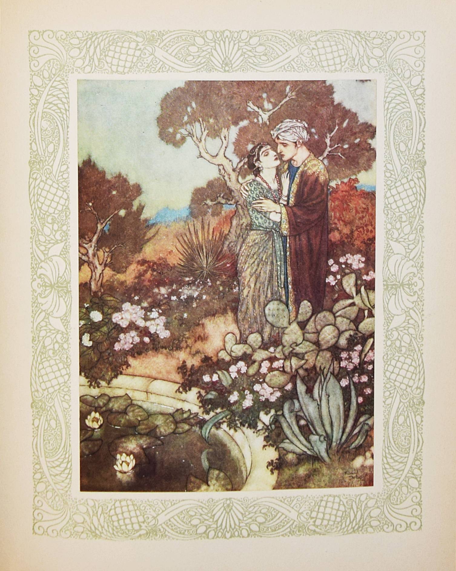 Kháyyám, Omar. Rubaiyat de Omar Kháyyám. Illustrations de Edmond Dulac. Paris, L’Edition d’Art H. Piazza o. J. (1910). 4° (30 x 23,5 cm.). [64] Bl. mit illustr. Titelbordüre und 20 montierten Farbtafeln. Orig.-Halbpergamentband mit goldgepr. Rückentitel. Erste französische Ausgabe. – „Cette traductio à été faite par Edmond Dulac d’après la version poétique de Edward Fitzgerald.“ – Jede Textseite und die Farbtafeln mit dekorativer Bordüre in Olivgrün. – Rücken leicht fleckig, Besitzvermerk auf dem Vortitel, gutes sauberes Exemplar.