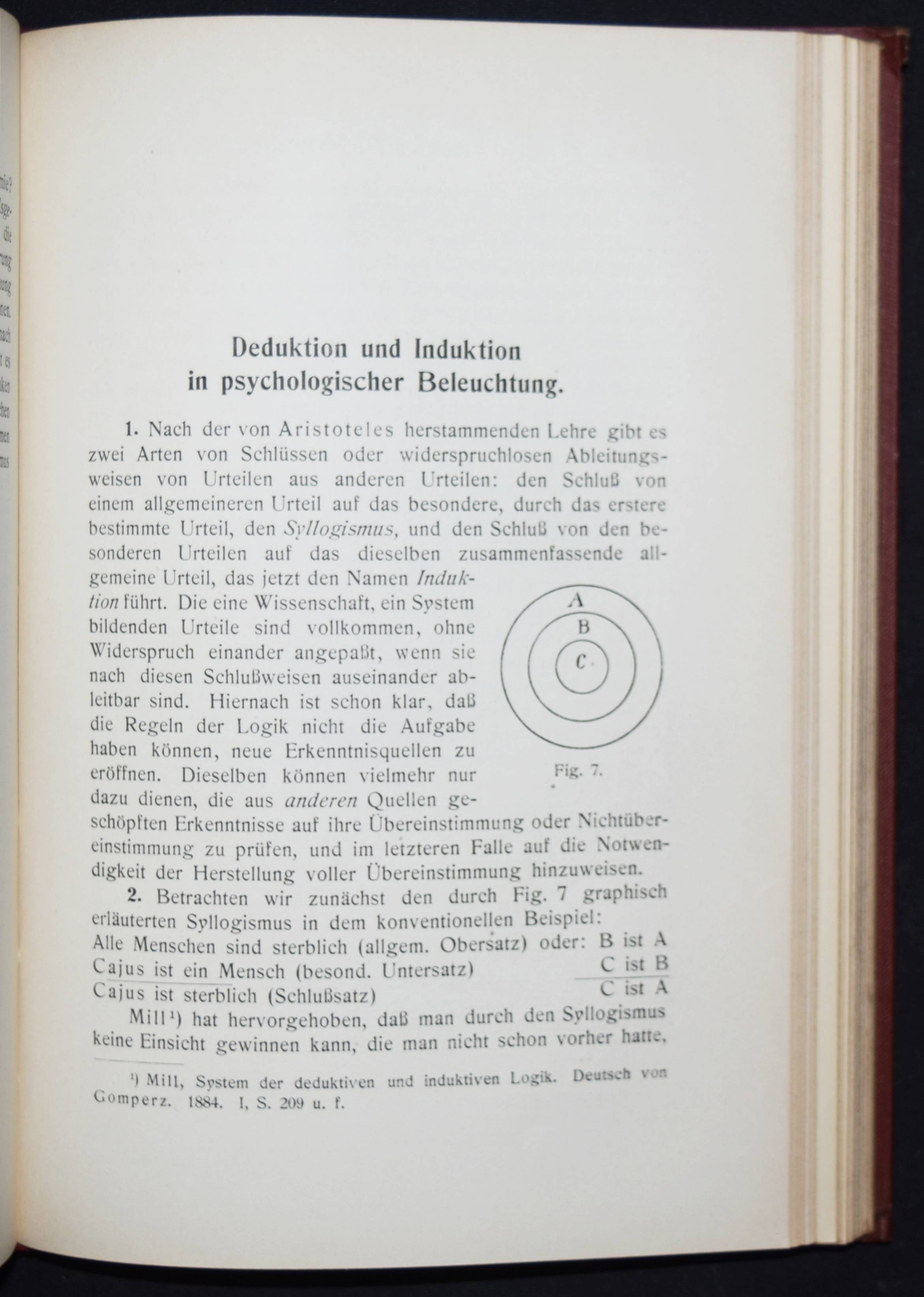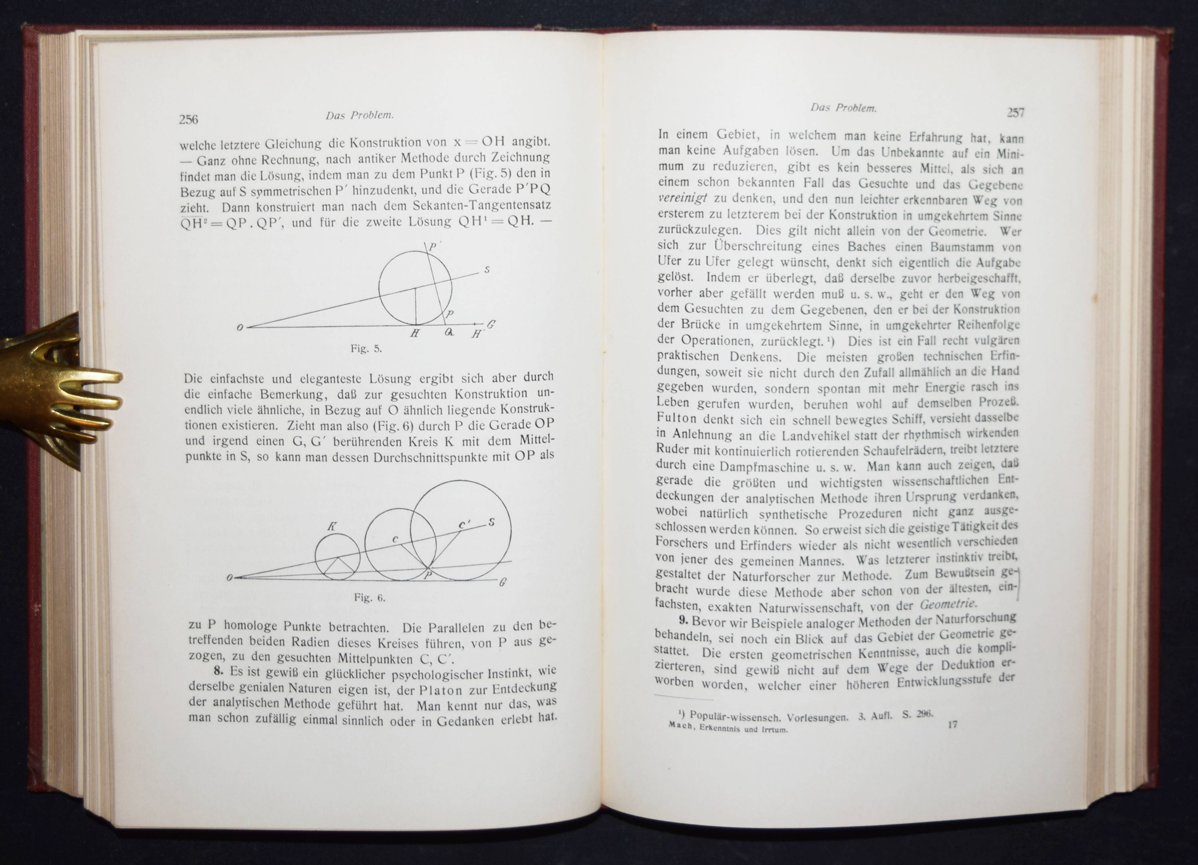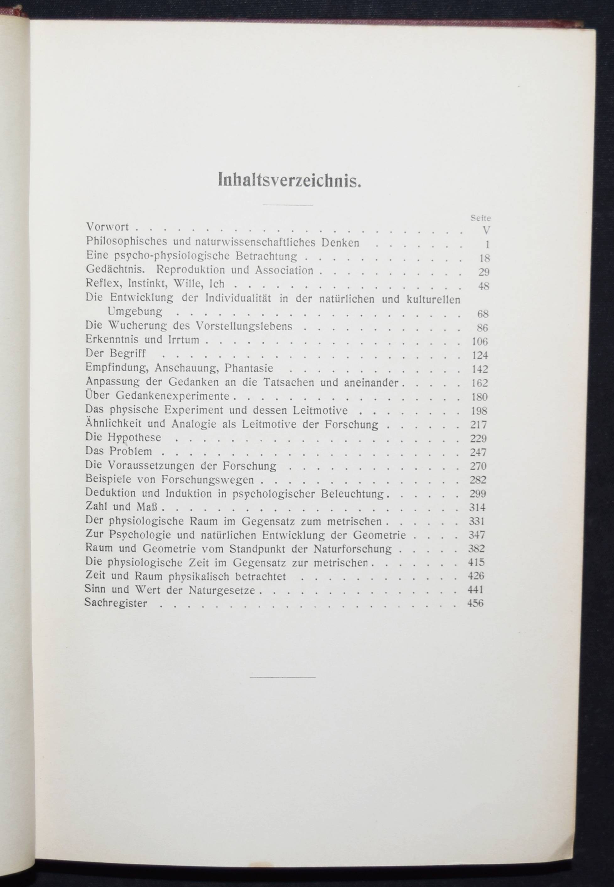Mach, E(rnst). Erkenntnis und Irrtum. Skizzen zur Psychologie der Forschung. Leipzig, Johann Ambrosius Barth 1905. 8°. IX, [1] Bl., 461, (3) S. mit 35 Figuren im Text. Orig.-Leinenband mit goldgepr. Rücken- und Deckeltitel und Jugendstil-Ornamentik. NDB XV, 605 ff. Ziegenfuß II, 95. – Erste Ausgabe des philosophischen Hauptwerks des bedeutenden österr. Physikers und Philosophen E. Mach (1838-1916). – „Eine positivistische Grundhaltung war charakteristisch für die Wissenschaftstheorie des frühen 20. Jh. M.s Wiener Lehrstuhl, den nach ihm u. a. A. Stöhr und M. Schlick innehatten, wurde zum institutionellen Angelpunkt für den „logischen Empirismus“ des „Wiener Kreises“ (Schlick, Neurath, Carnap, Waismann), der sich ebenso wie der verwandte „Berliner Kreis“ (Reichenbach, Petzoldt) und der „Operationalismus“ (Dingler, Bridgman) vom älteren Positivismus durch stärkere Berücksichtigung der Mittel formaler Logik und moderner Mathematik absetzte („Neopositivismus“). Mit seinem Streben nach methodologischer Einheit der Wissenschaft trotz disziplinärer Vielfalt prägte M. ein Fernziel, das bis zu den Bemühungen des logischen Empirismus um die Einheitswissenschaft weiterwirkte. Der weite Blickwinkel, unter dem M. in „Erkenntnis und Irrtum, Skizzen zu einer Psychologie der Forschung“ (1905) das faktische Vorgehen des Wissenschaftlers beim Erschließen neuer Gesetzmäßigkeiten beschrieb, verengte sich im Übergang von seiner Forschungspsychologie zur Forschungslogik Carnaps und Poppers und wurde in seiner Tragweite immer wieder gewürdigt. Die Reaktionen auf M.s philosophische Thesen reichten allein im Rahmen des Materialismus von polemischer Kritik des „Empiriokritizismus“ durch Lenin (1909) bis zu emphatischer Zustimmung seitens Friedrich Adlers (1918)“ (K. Hentschel in NDB). – Sehr gutes sauberes Exemplar.