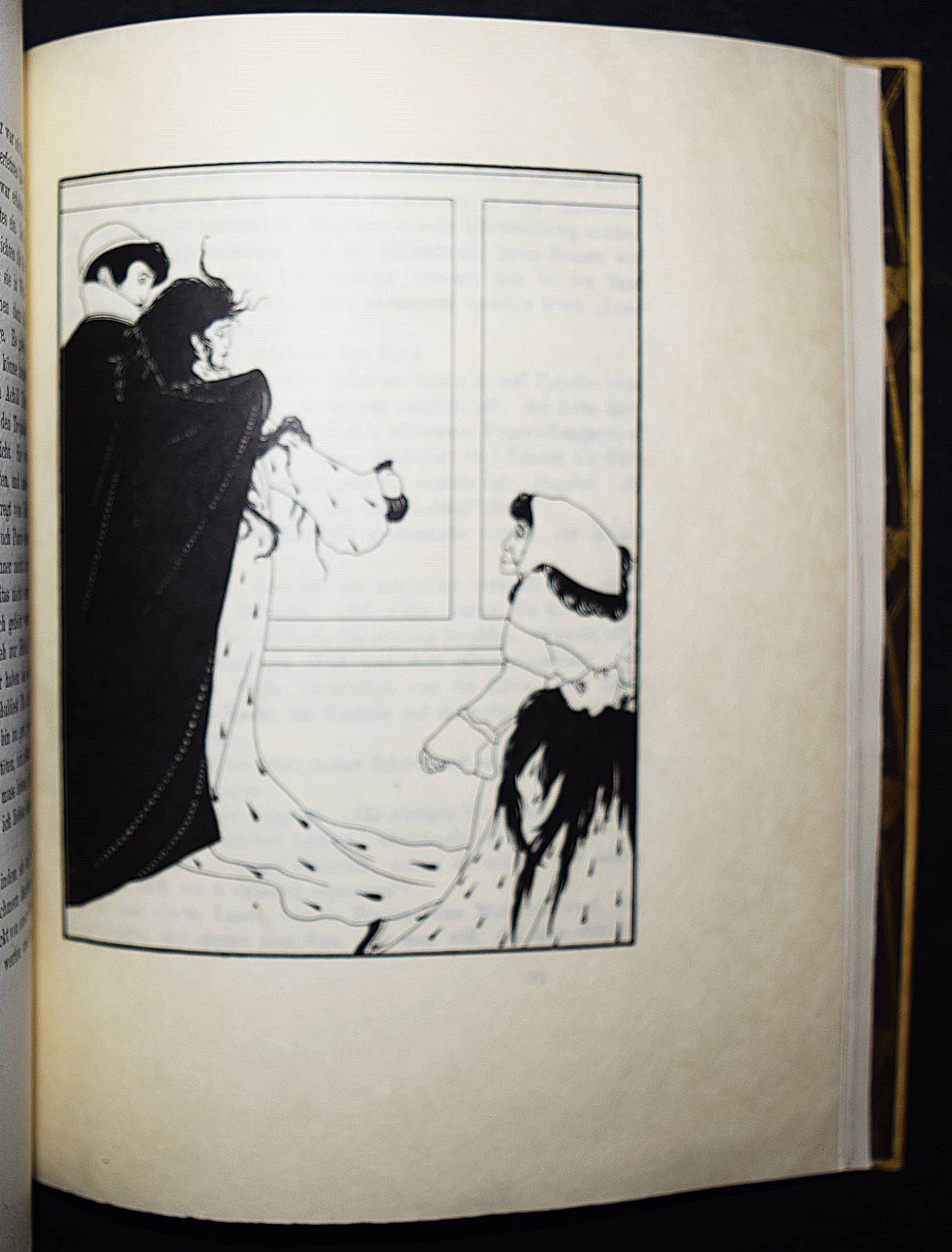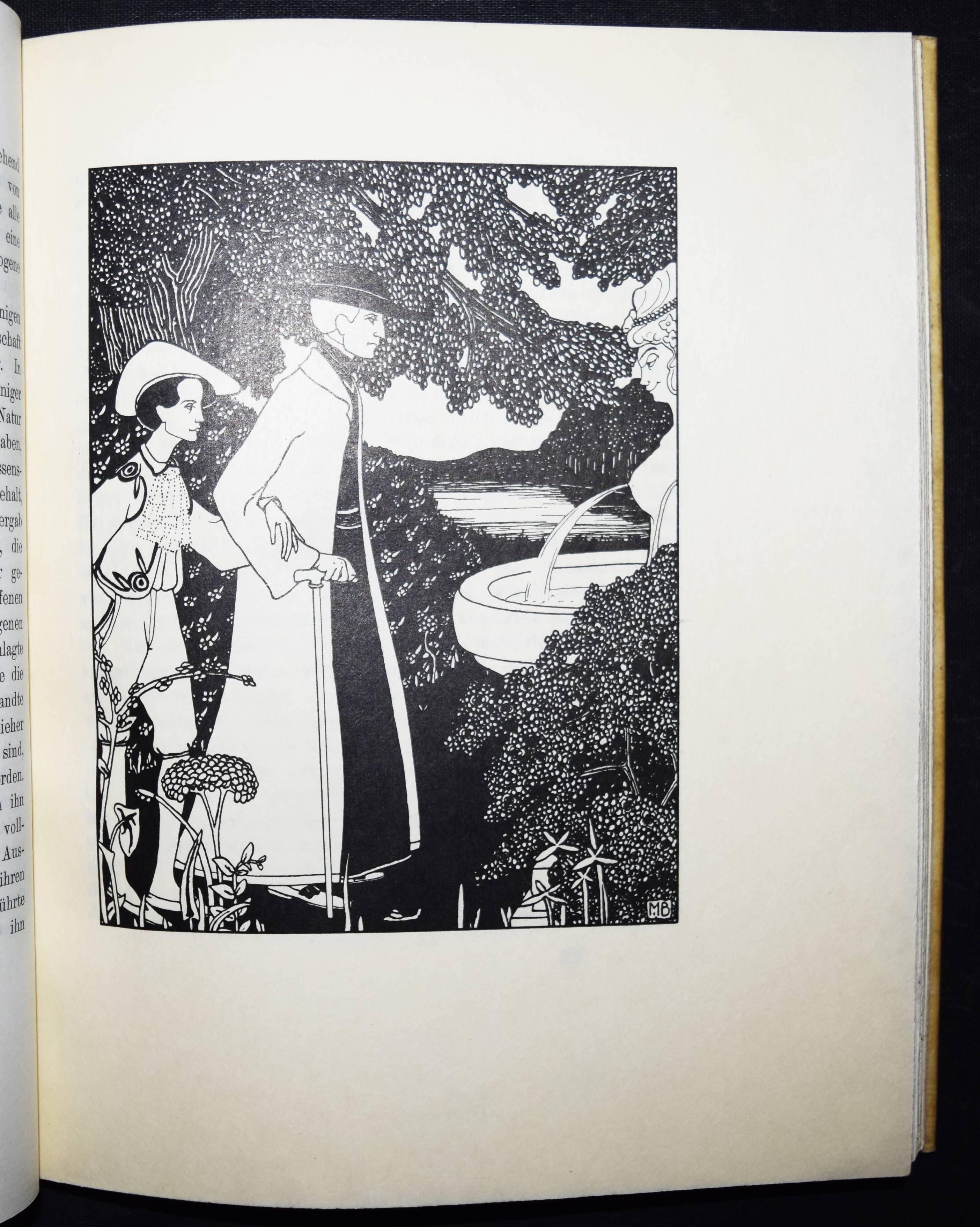 Balzac, Honoré de. Das Mädchen mit den Goldaugen. Deutsche Übertragung von Ernst Hardt. Zeichnungen von Marcus Behmer. Leipzig, Insel-Verlag 1904. Gr.-8°. 91, (1) S., 1 Bl. mit 10 Tafeln und Buchschmuck nach Zeichnungen. Orig.-Pergamentband mit goldgepr. Rückentitel, goldgepr. Deckelvignette, Vorsätze in floraler Jugendstil-Ornamentik in Braun und Gold und Kopfgoldschnitt (Ausführung: A. Köllner, Leipzig). Fromm 1533. Haucke 5. Sarkowski 86. Schauer II, 45. – Eines von 500 Exemplaren. – Gedruckt bei Poeschel & Trepte auf Van Gelder-Bütten, die Illustrationen als Zinkographien auf Japan. – Behmer entwarf auch die große Deckelvignette und die schönen braun-gold gedruckten Vorsatzpapiere. – Nach Oscar Wildes „Salome“ die zweite umfangreiche und selbständige buchkünstlerische Arbeit des damals gerade 25jährigen Behmer. – Ohne den Schuber, schönes sauberes Exemplar aus der Bibliothek des Schriftstellers Leo Sternberg (1876-1937) mit dessen schönen Jugendstil-Exlibris (signiert: Kirchbach).