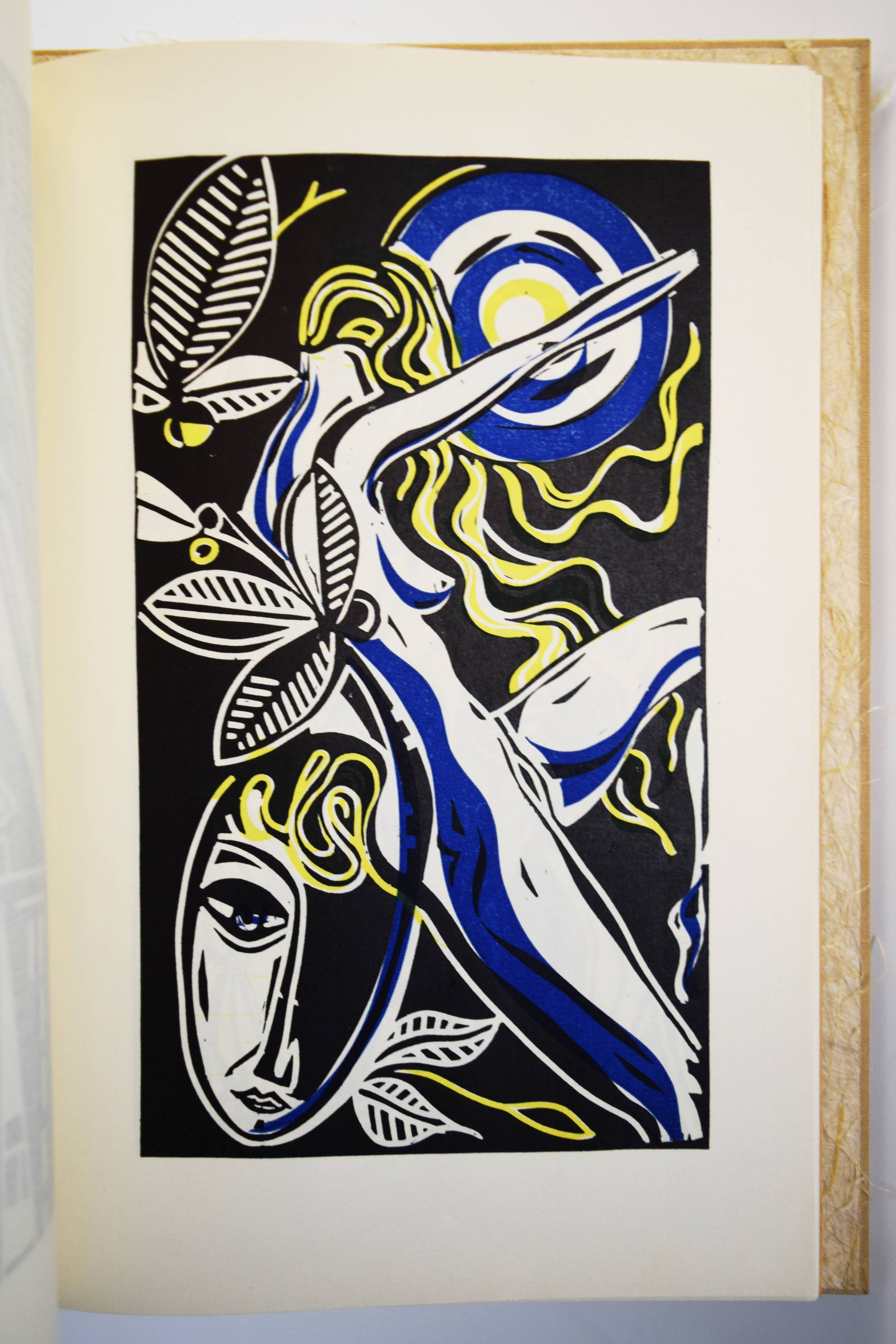 Wilczynski, Karl. Mond in Sommernacht. Schnitte von Roland Forster. Viernheim, Zürich, Verlag Viernheim 1957. 4°. [14] eins. bedr. Bl. (Text) und 11 (5 farbige) Orig.-Linolschnitte. Orig.-Broschurumschlag in Halbleinen-Schuber mit Japanpapier-Bezug. Eines von 150 num. Exemplaren; im Druckvermerk von K. Wilczynski und R. Forster signiert. – Sehr gutes Exemplar.