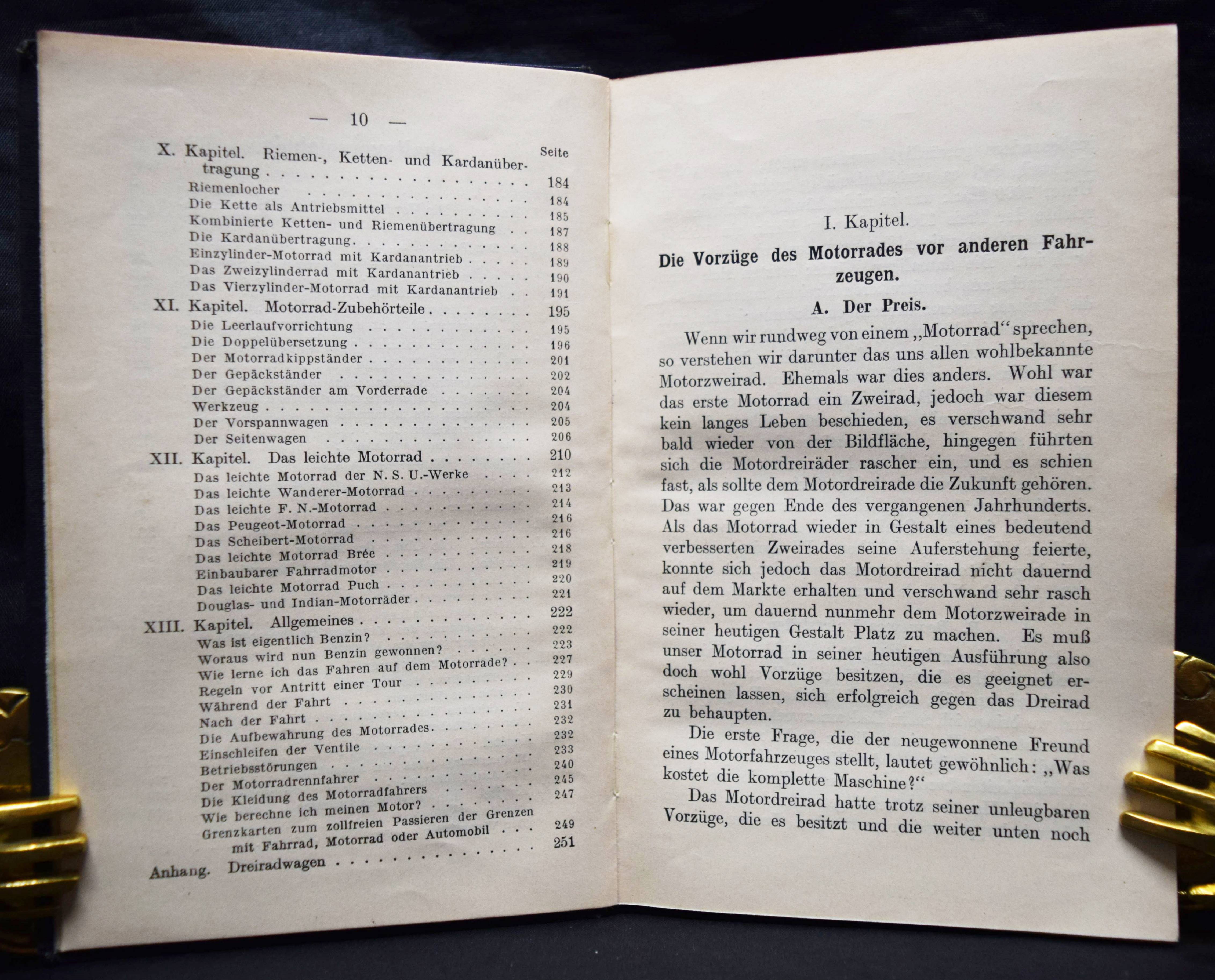 Schuricht, Walter. Das Motorrad und seine Behandlung. 3., verb. Aufl. Berlin, R. C. Schmidt 1913. Kl.-8°. 260 S., [6] Bl. (Anzeigen) mit 197 Abbildungen. Farbig illustr. Orig.-Leinenband. (Autotechnische Bibliothek, Band 18). Frühe Ausgabe des noch bis in die 1950er Jahre aufgelegten Handbuchs. – Gelenke etwas berieben, stellenweise etwas fleckig, gutes Exemplar.