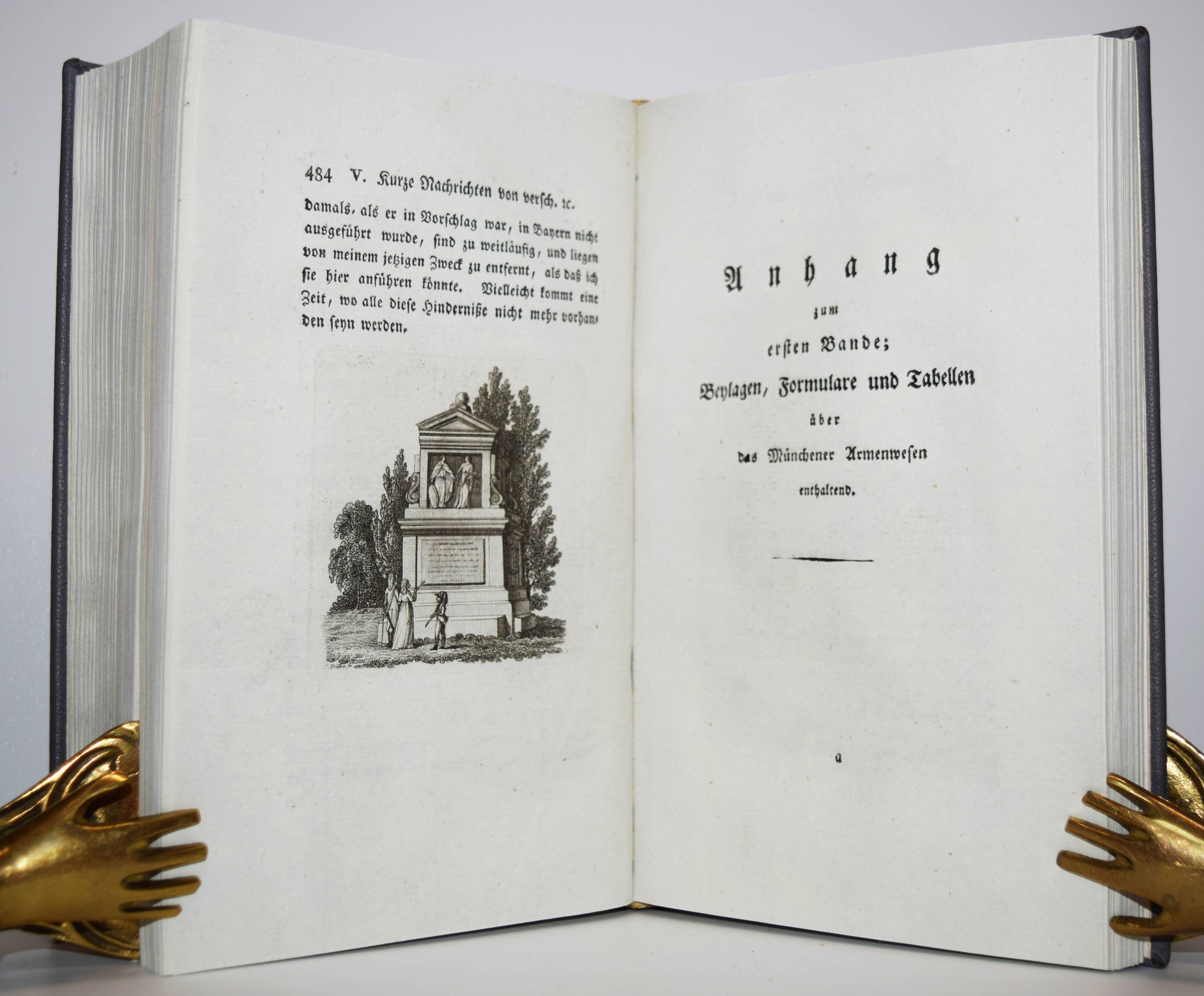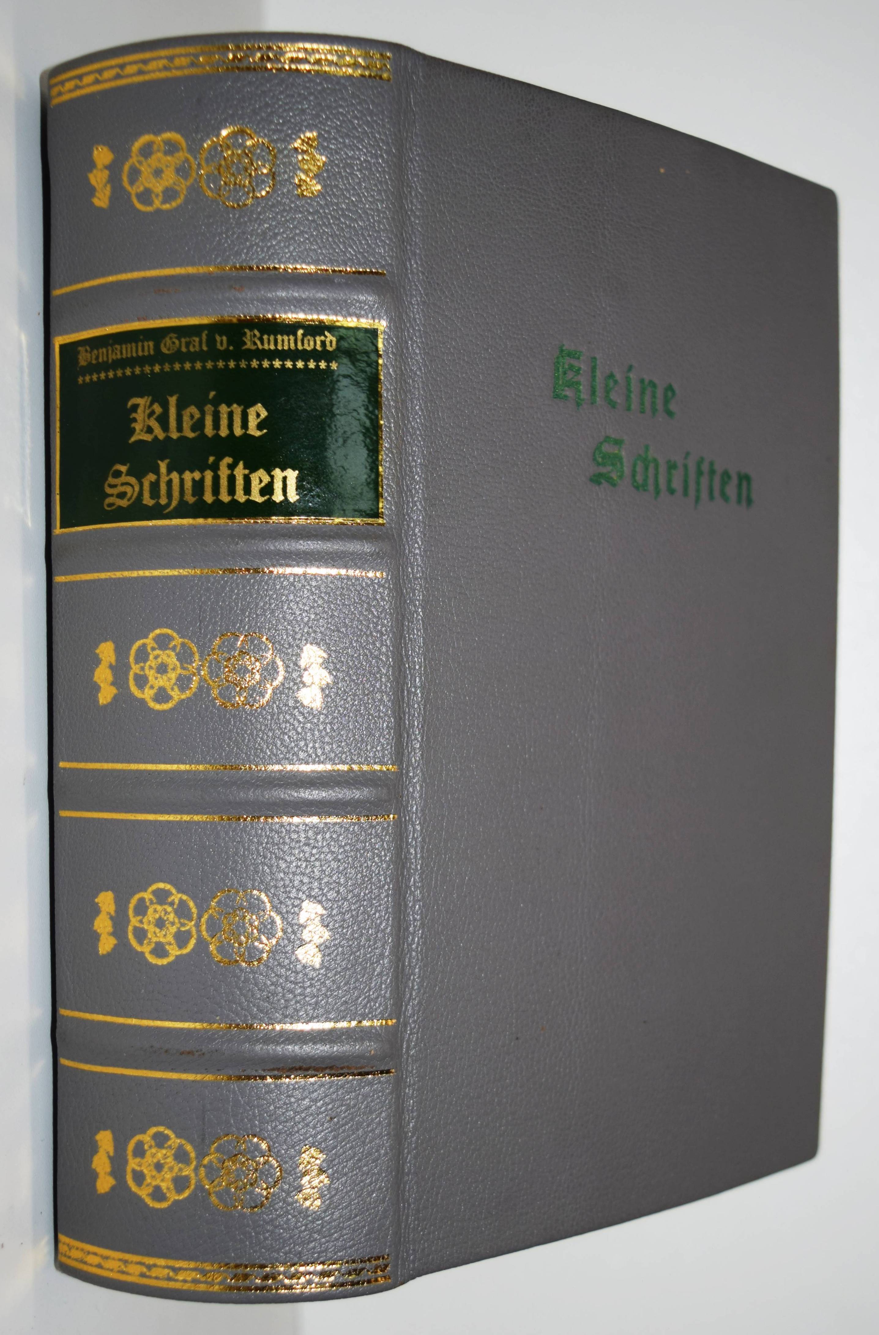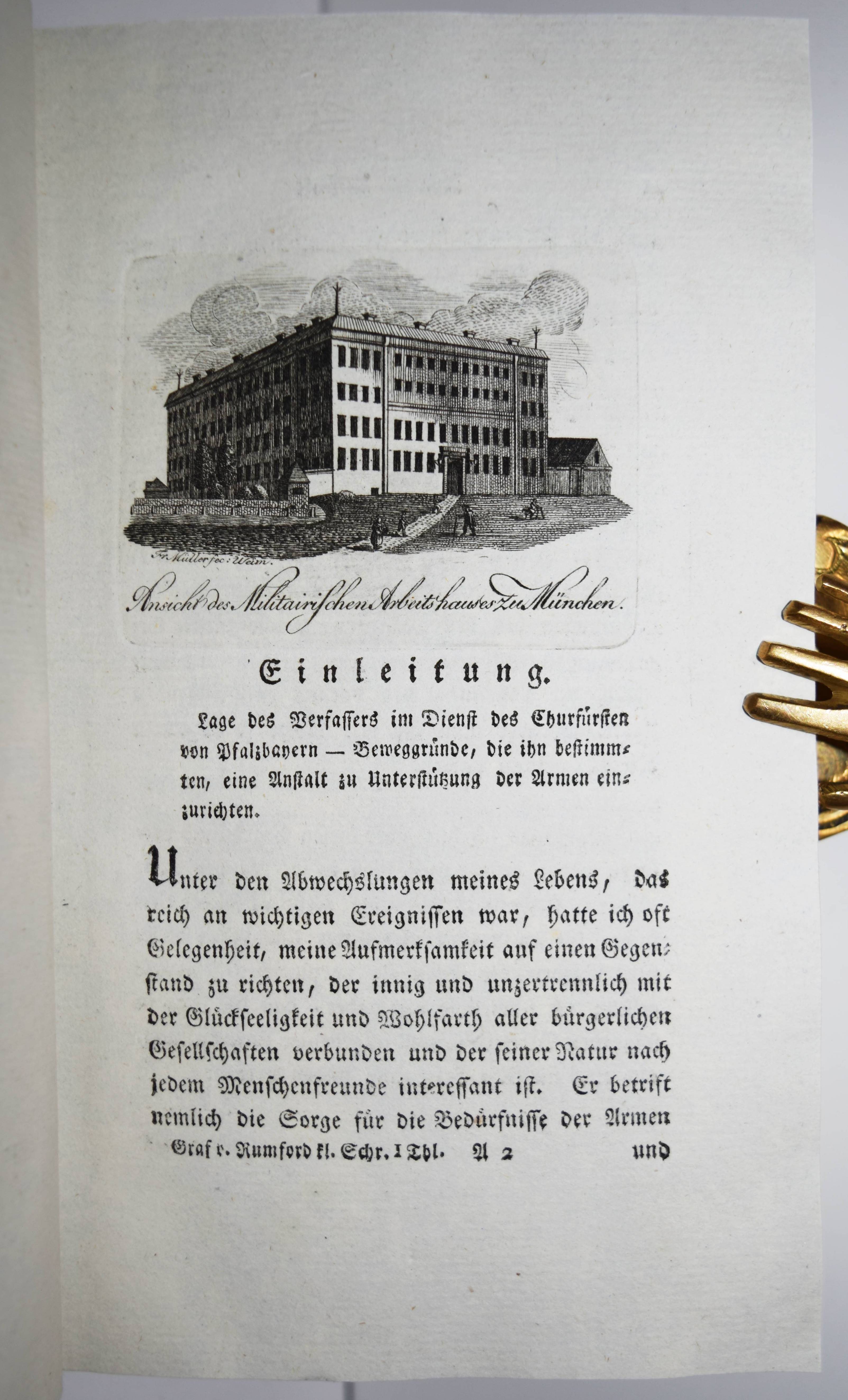 Rumford, Benj(amin) (Thompson) v. Kleine Schriften politischen, ökonomischen und philosophischen Inhalts. Nach der zweyten vermehrten Ausgabe aus dem Englischen übersetzt, und mit neuen Beylagen bereichert. Erster Band (von 5). Weimar, Verlag des Industrie-Comptoirs 1797. 8°. Gestoch. Frontispiz, XX, 484 S. mit gestoch. Titelvignette und 2 gestoch. Vignetten im Text, [61] teils gefalt. Bl. (Tabellen) und 4 gefalt. Kupfertafeln. Moderner Lederband mit goldgepr. Rückenschild und Rückenvergoldung. Horn/Arndt 329. Humpert 13112. Poggendorff II, 718. VD18 80438776. Slg. Walterspiel 438. – Erste Ausgabe des ersten Teils der Sammlung überwiegend technologischer und physikalischer Schriften des amerikanischen Physikers, der etwa die Hälfte seines Lebens im bayerischen Staats- und Militärdienst verbrachte. Er führte die Kartoffel in Bayern ein, gründete fortschrittliche Armenhäuser, reorganisierte das Heer und legte den Englischen Garten in München an. – Im vorliegenden Band berichtet Rumford von der Einrichtung „einer Armen-Anstalt zu München“, „Von der in Bayern herrschenden Betteley zu der Zeit, als die Maasregeln zu deren Abschaffung im Werke waren“ etc. – „Ueber die allgemeinen Grundsätze, welche allgemeine Armen-Anstalten in allen andern Ländern gebauet werden müssen“ – „Ueber Speiße und verzüglich über Beköstigung der Armen“ – „Ueber Camin-Feuerheerde, nebst Vorschlägen zur Verbeßerung, derselben, um Brennstoff zu spahren, die Wohnhäuser angenehmer und gesünder zu machen und das Rauchen der Schornsteine ganz zu verhüthen“ – „Kurze Nachrichten von verschiedenen neuerlich in Bayern gemachten nützlichen öffentlichen Anstalten“. – Sehr gutes sauberes und dekorativ gebundenes Exemplar.