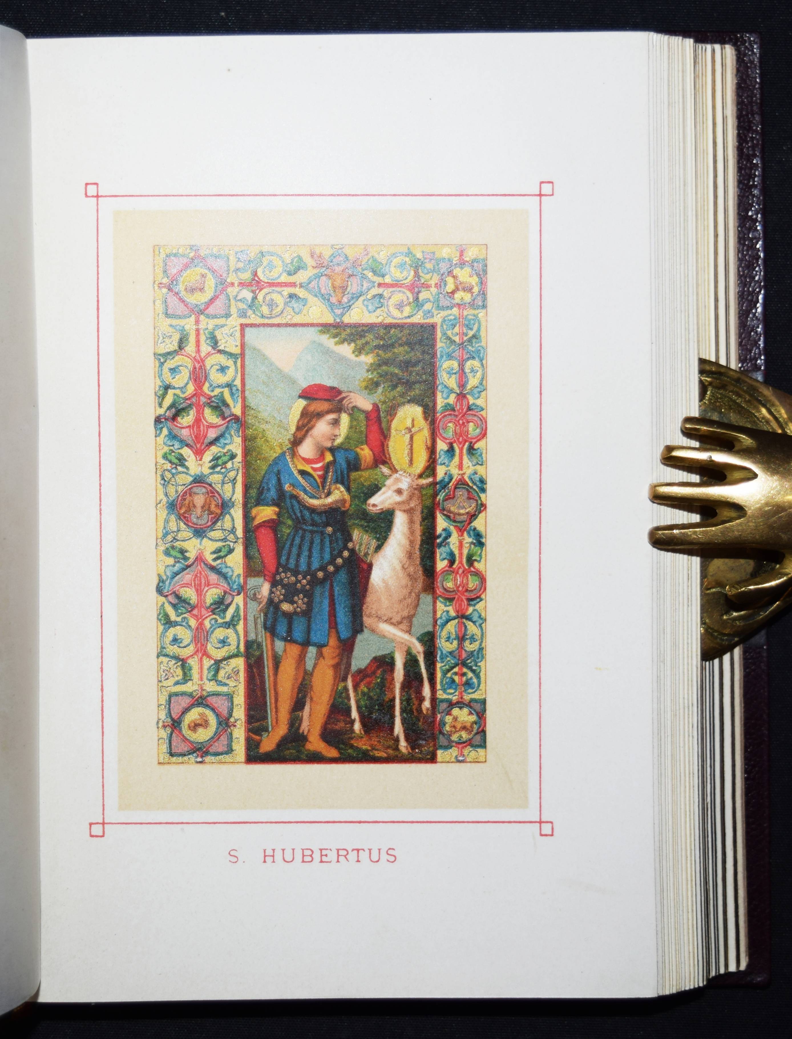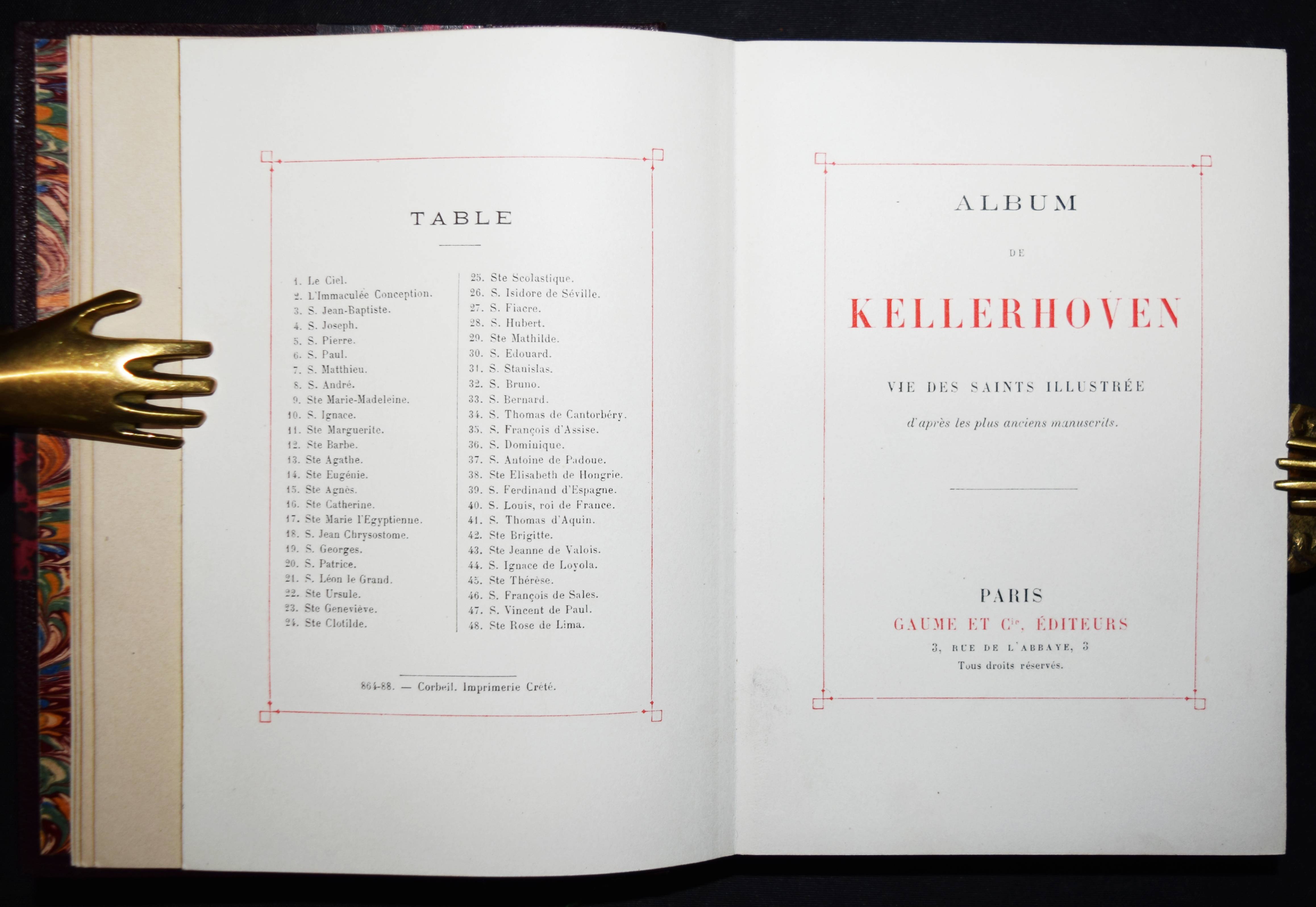 Kellerhoven, (Franz). Album de Kellerhoven. Vie des Saints Illustrée d’après les plus anciens manuscrits. Paris, Gaume et Cie. s. d. (um 1870). 8°. [2] Bl., 48 mont. chromolithogr. Tafeln auf dünnem Karton. Dunkelroter Halblederband der Zeit mit goldgepr. Rückentitel und Goldschnitt und marmoriertem Pappschuber. Mit hervorragenden Portraits berühmter Heiliger nach mittelalterlichen Miniaturen, lithographiert von dem deutschen Graphiker F. Kellerhoven (1814-1872), der seit 1859 in Paris arbeitete. Die dekorativen Chromo-Lithographien wurden von A. Lemercier in Paris gedruckt. – Sehr schönes sauberes und dekorativ gebundenes Exemplar.