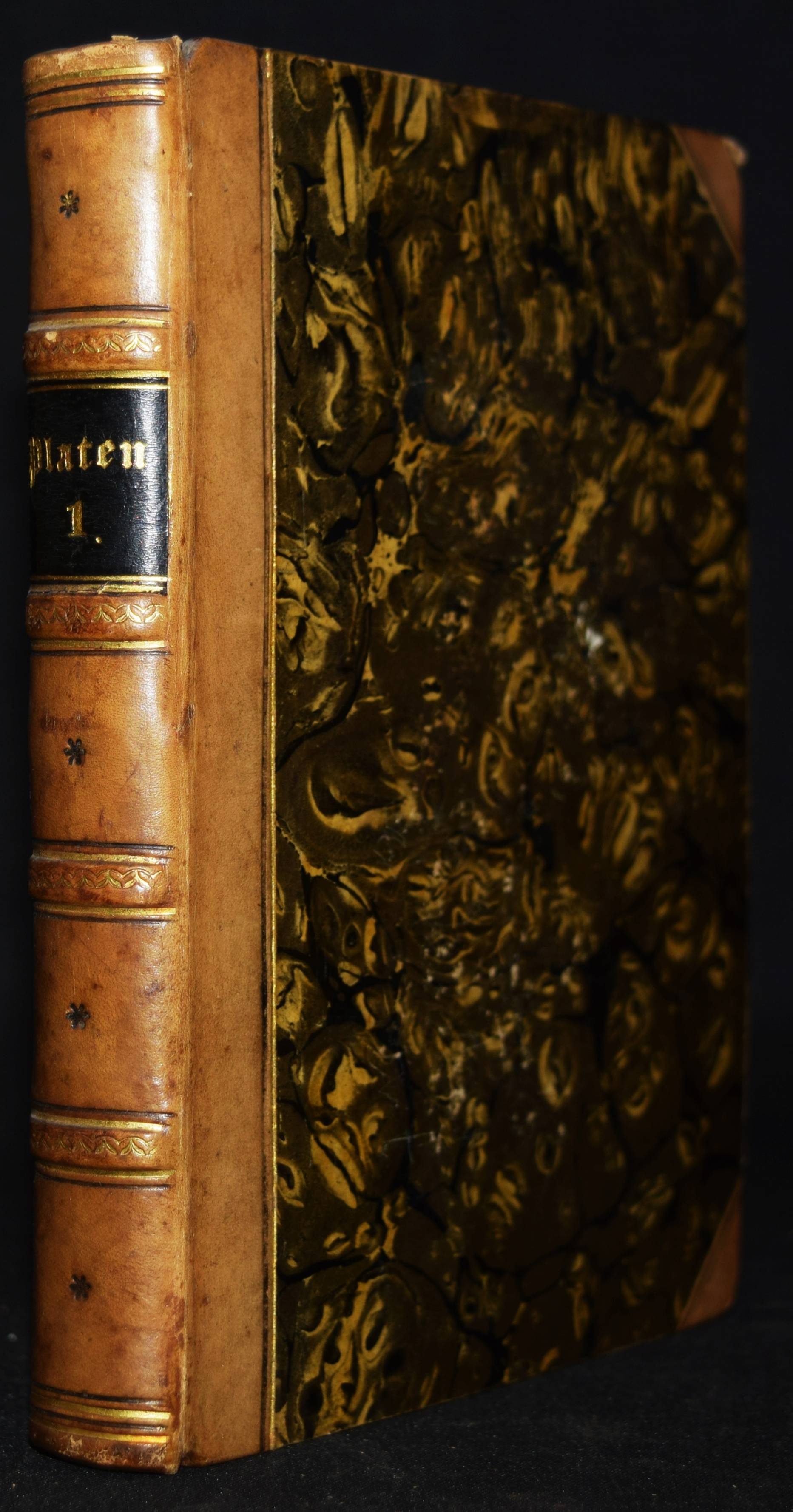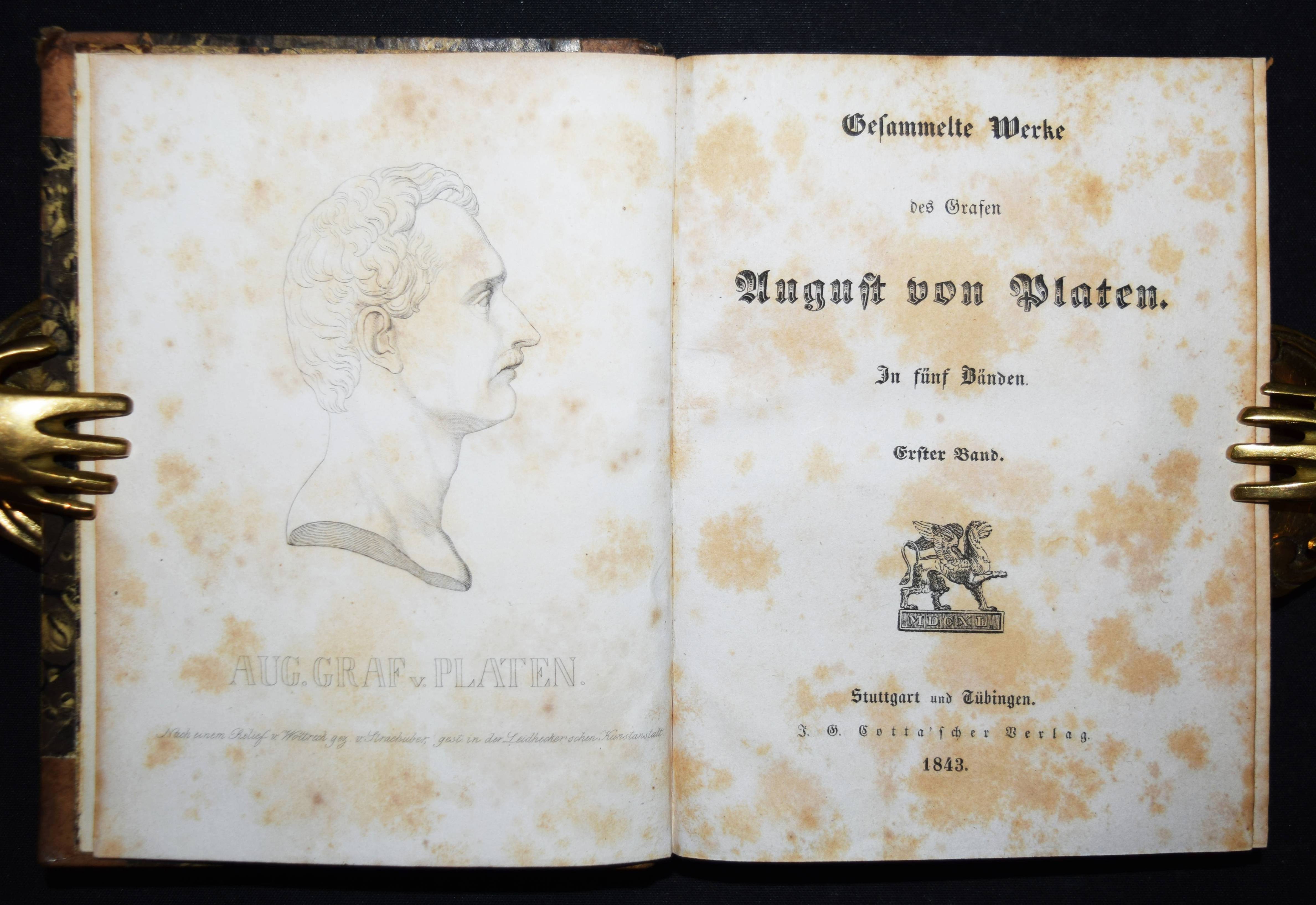 Platen(-Hallermünde), August Graf v. Gesammelte Werke. (Herausgegeben und eingeleitet von Karl Goedeke). 5 Bände. Stuttgart und Tübingen, J. G. Cotta 1843. Kl.-8°. Mit gestoch. Portrait in Band I. Halblederbände der Zeit mit goldgepr. Rückenschildern und dezenter Rückenvergoldung. Goedeke VIII, 696, 51. – Erste vollständige Gesamtausgabe. – „Der literarische Rang P.s basiert auf seiner Lyrik, deren spezifischen Charakter die von J. Link geprägte Formel „Sinngebung durch artistische Form“ genau bezeichnet. Neben Liedern (Tristan) und Balladen (Das Grab im Busento; Der Pilgrim vor St. Just) sind vor allem Ghaselen zu nennen, eine pers. Gedichtform, die P. gemeinsam mit Rückert für die deutsche Literatur gewonnen hat. Die „Sonette aus Venedig“ beeinflußten die Venedig-Dichtung bis hin zu Rilke und Thomas Mann. P.s Versepen und die schon zu Lebzeiten des Autors kaum aufgeführten Dramen sind weitgehend vergessen. Die umfangreichen Tagebücher, die sich über weite Strecken als Journal intime erweisen, können ein starkes kultur- und mentalitätsgeschichtliches Interesse beanspruchen“ (G. Och in NDB XX, 510 f.). – Durchgehend teils stärker braunfleckig, sonst gutes Exemplar.
