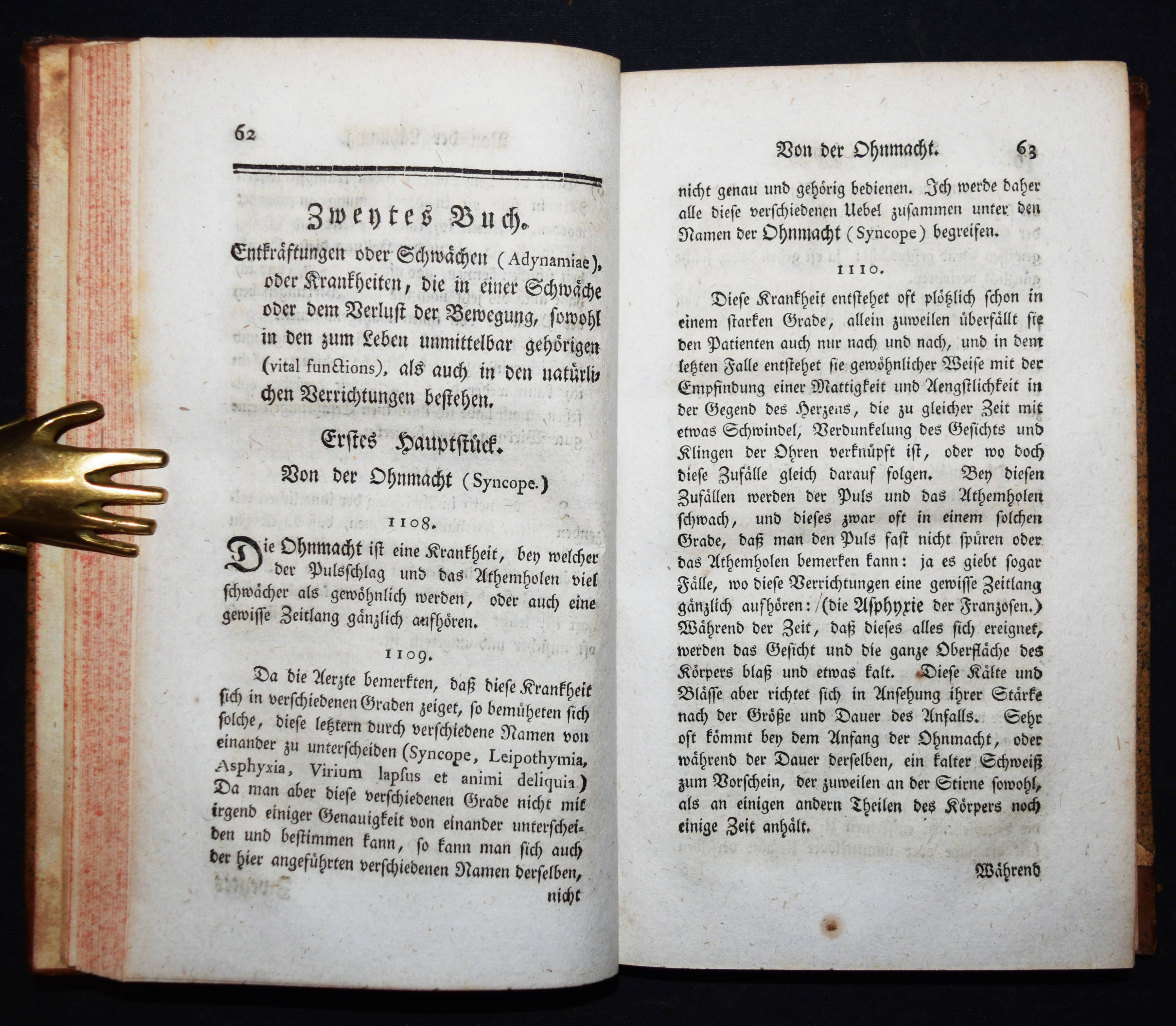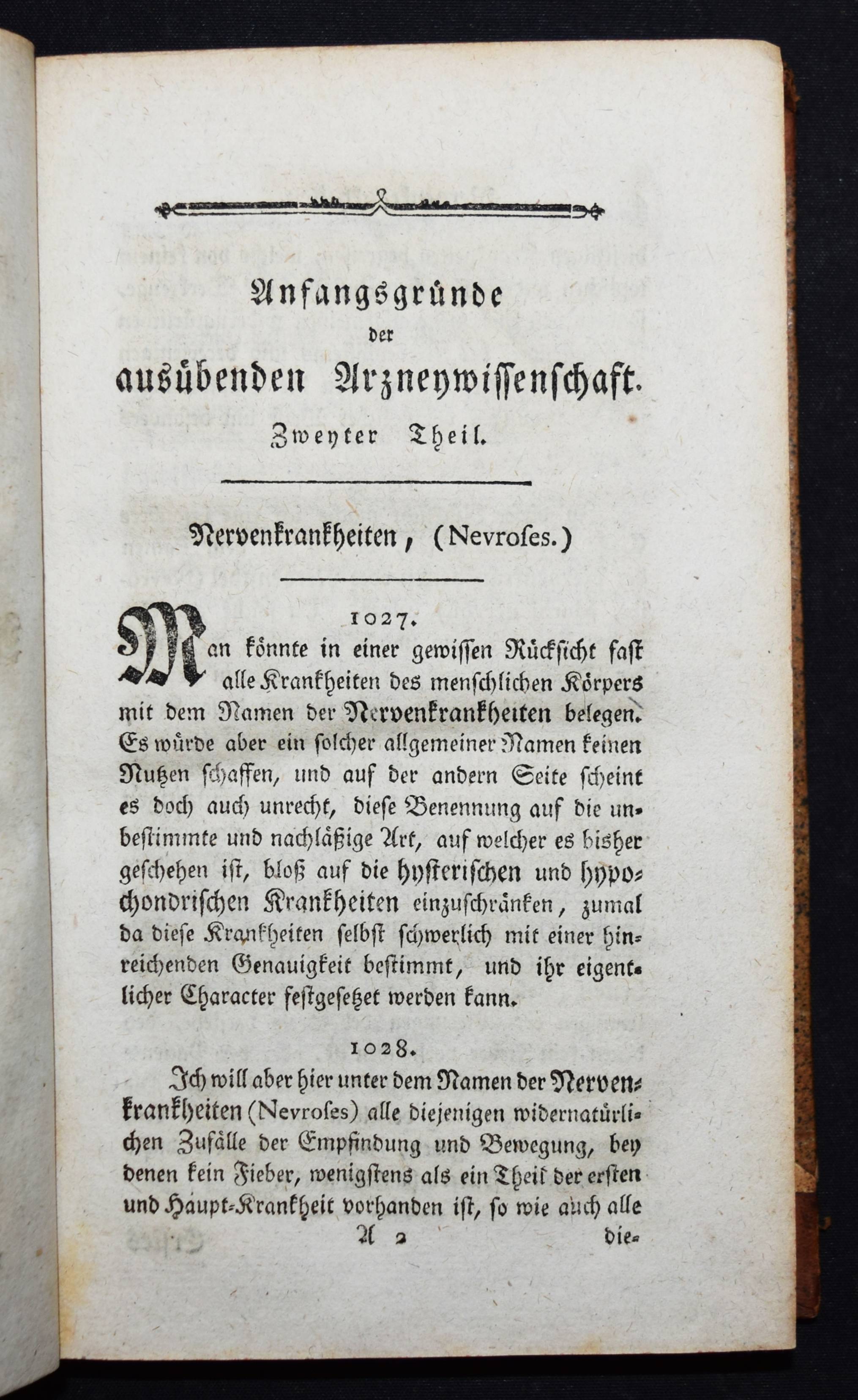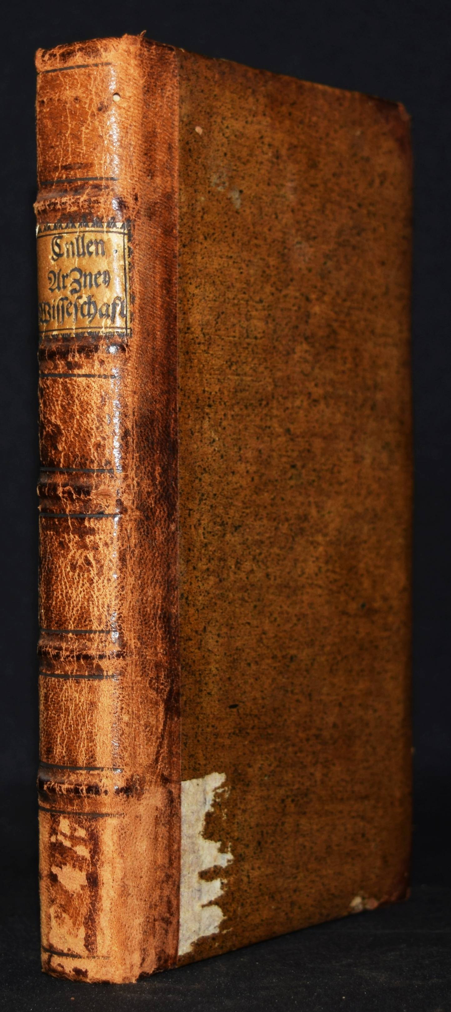 Cullen, William. Anfangsgründe der praktischen Arzneywissenschaft. Dritter Theil, welcher die Nervenkrankheiten enthält. (Nach der vierten englischen Ausgabe übersetzt und mit Anmerkungen und Zusätzen vermehret von Christian Erhard Kapp). Leipzig, Carpar Fritsch 1784. 8°. [3] Bl., 336 S. mit Titelvignette in Holzschnitt. Halblederband der Zeit mit Rückenschild. Hirsch/Hüb. II, 153. VD18 90384172. Vgl. Waller 2234 u. Garrison-Morton 4920.1. – Erste deutsche Ausgabe des in sich abgeschlossenen dritten Teils von Cullens Hauptwerk. – Mit einem Anhang „Von den Mitteln, ertrunkene und dem Anschein nach todte Personen wiederherzustellen“. – Zeitgenöss. Besitzvermerk, Deckel unten mit Fehlstellen am Bezugspapier, durchgehend etwas braunfleckig, gutes Exemplar.