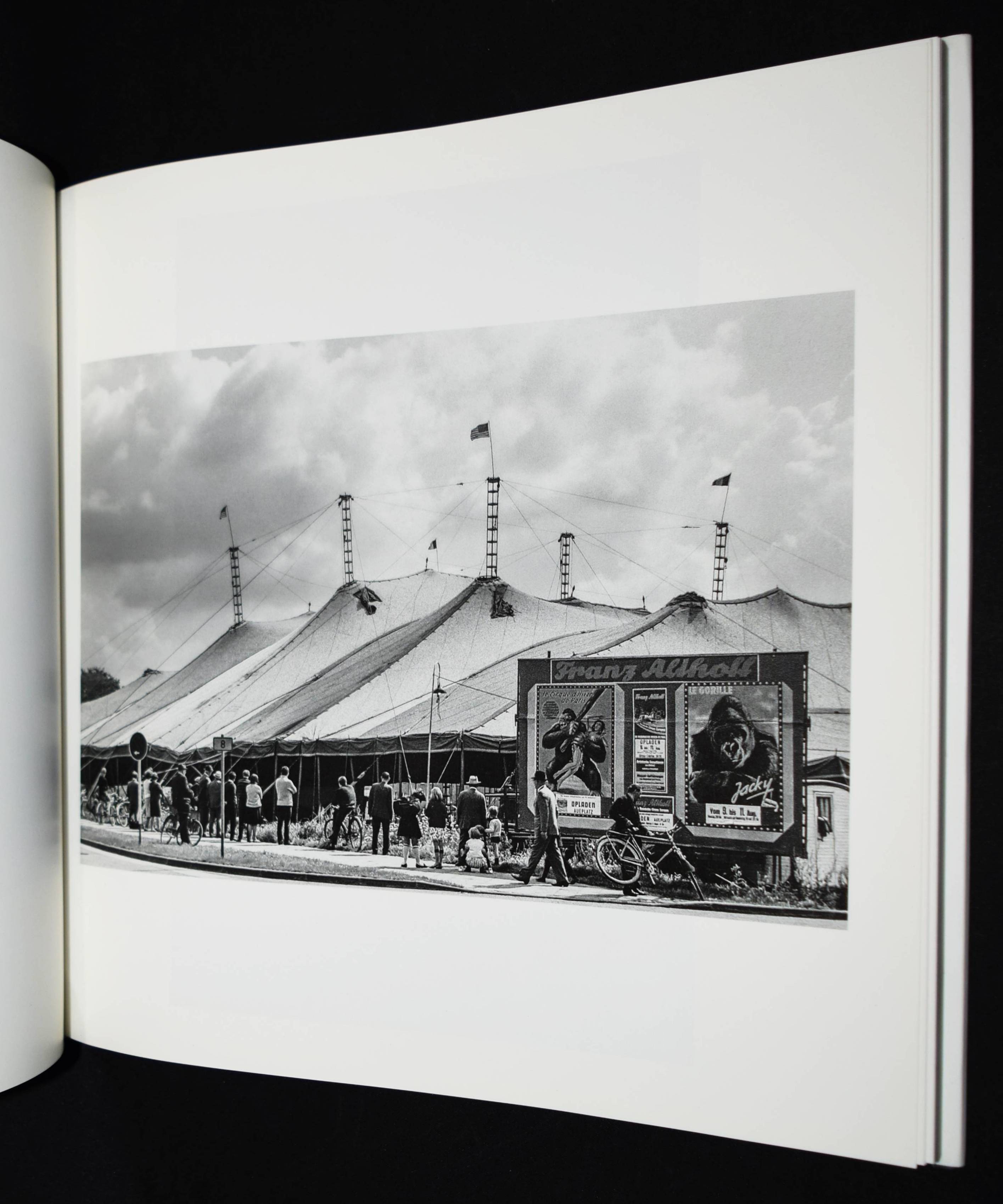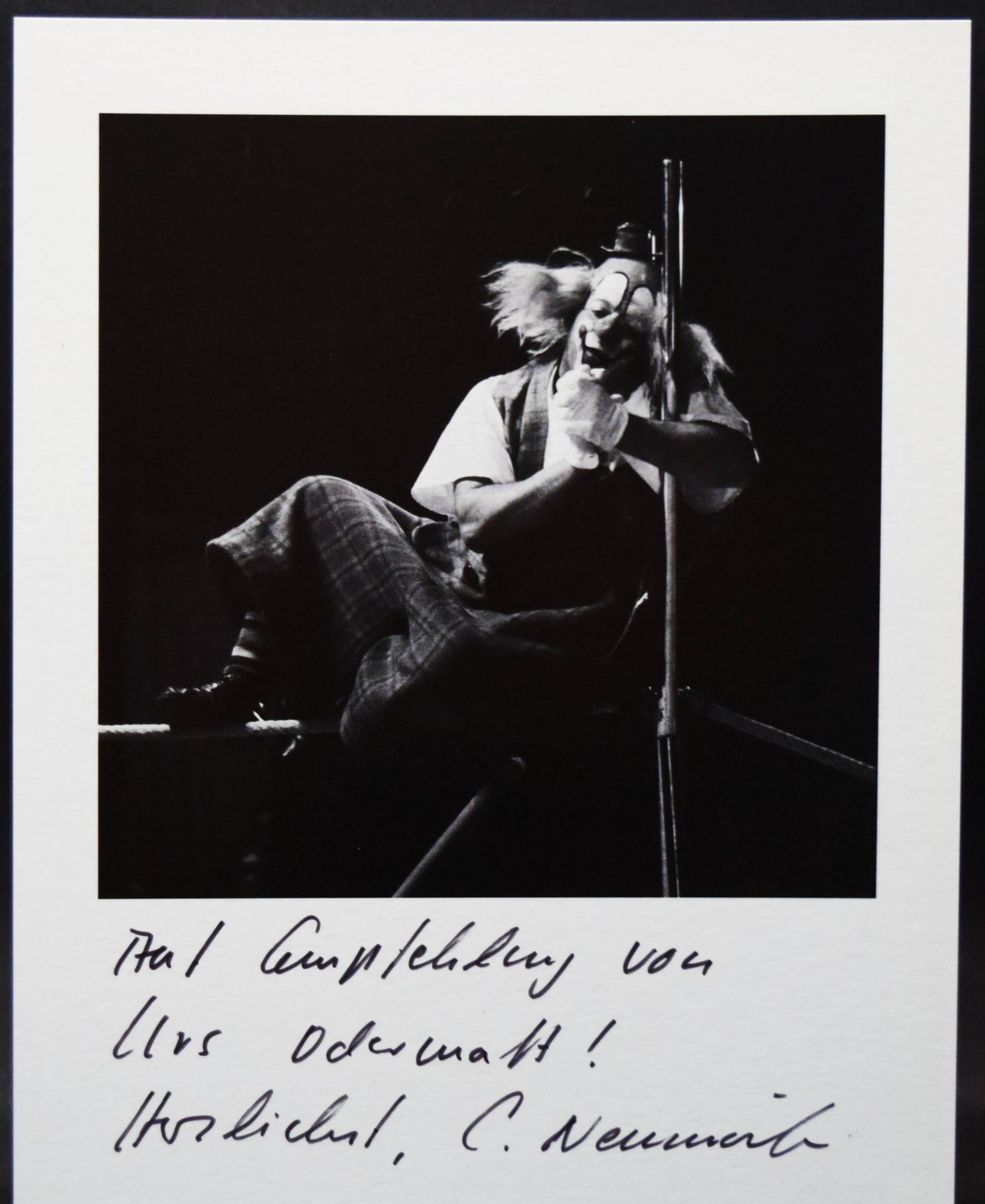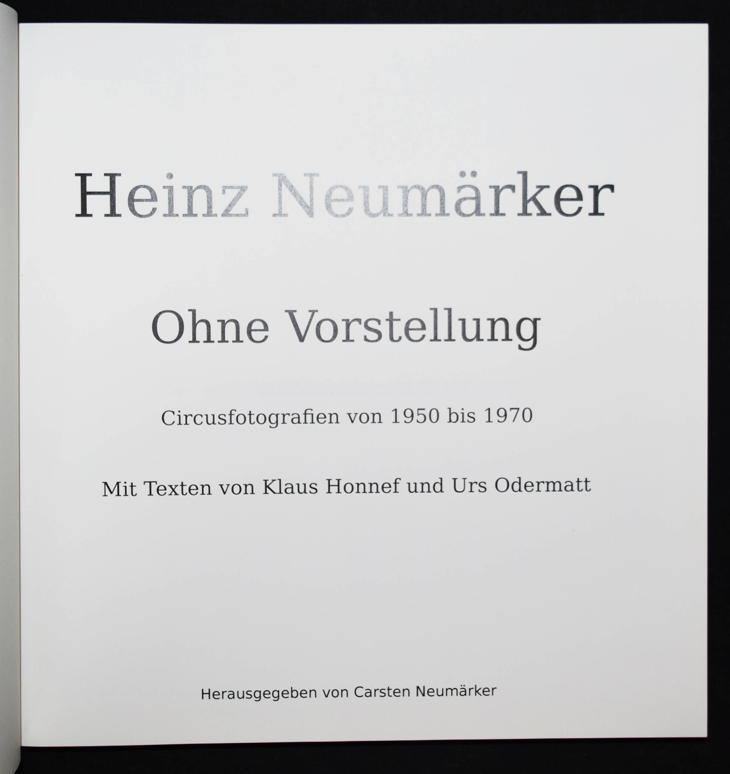 Neumärker, Heinz. Ohne Vorstellung. Circusfotografien von 1950 bis 1970. Mit Texten von Klaus Honnef und Urs Odermatt. Herausgegeben von Carsten Neumärker. Köln, Vision Eins UG (2023). Gr.-4° (32 x 32 cm.). [6] Bl. und 120 Duotone-Tafeln. Orig.-Leinenband mit illustr. Schutzumschlag. Mit eigenhändiger Widmung von Carsten Neumärker „Auf Empfehlung von Urs Odermatt! Herzlichst, C. Neumärker“ auf beiliegender Widmungskarte mit der Aufnahme eines Clowns. – „Ohne Vorstellung. Circusfotografien von 1950 bis 1970 lautet der Titel eines bemerkenswerten Bildbandes. Er stellt posthum das Werk eines bislang unbekannten Fotografen vor, der sich zugleich einem ungewöhnlichen Genre widmete: Der Wahl-Leverkusener Heinz Neumärker (1935 – 2017) hat 50 Jahre lang, von den 1950ern bis in die späten 2000er Jahre, vornehmlich im Rheinland den Zirkus fotografiert. Sechs Jahre nach seinem Tod publiziert nun dessen Sohn Carsten Neumärker eine Auswahl von 121 Motiven aus dem rund 200.000 Fotografien umfassenden Nachlass. Wie der Titel des Buches verrät, zeigt die von Carsten Neumärker zusammengetragene Auswahl nicht den Glanz in der Manege, sondern ausschließlich das, was um sie herum passierte“ (Verlagswerbung). – Sehr gutes Exemplar.
