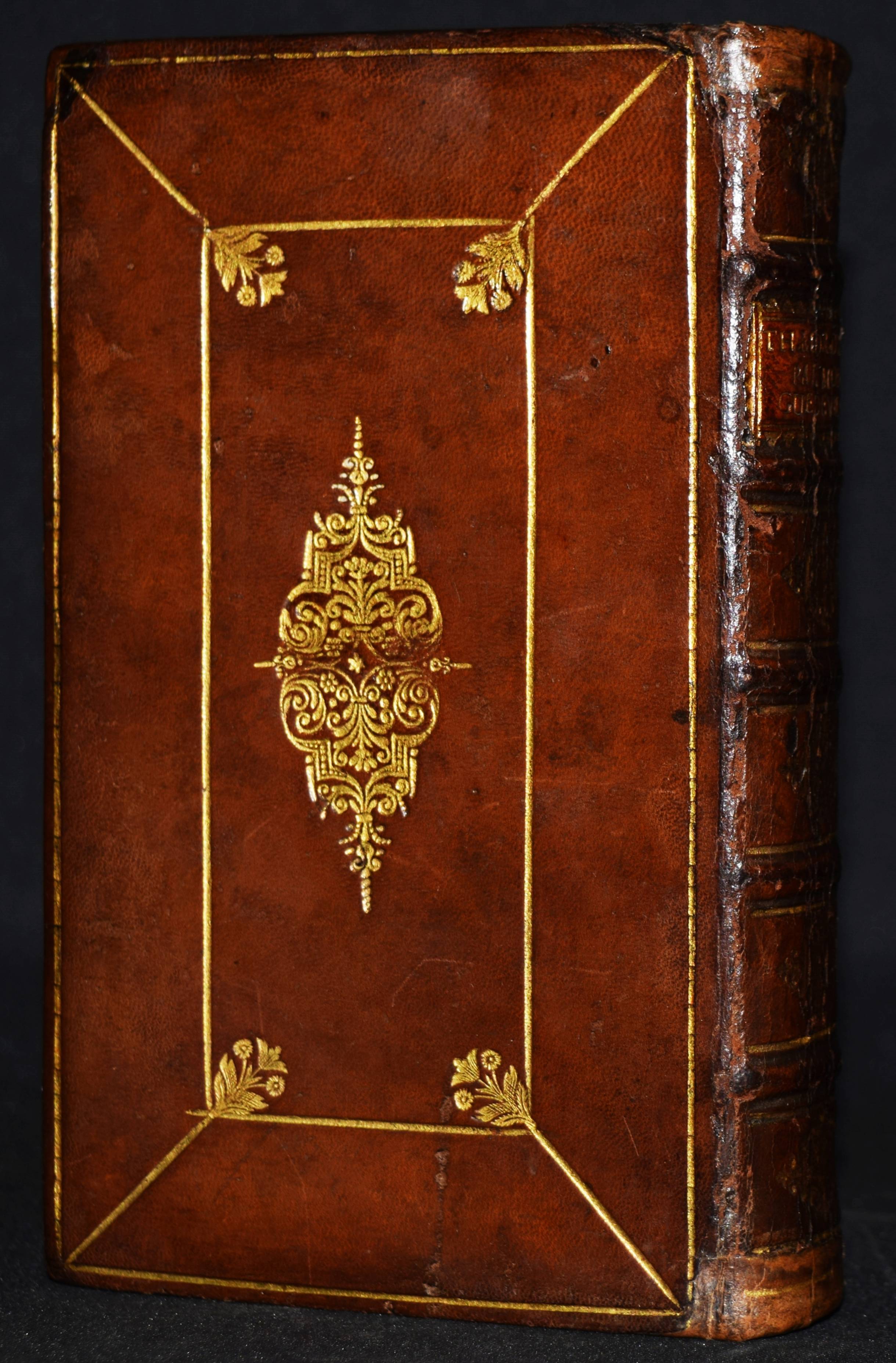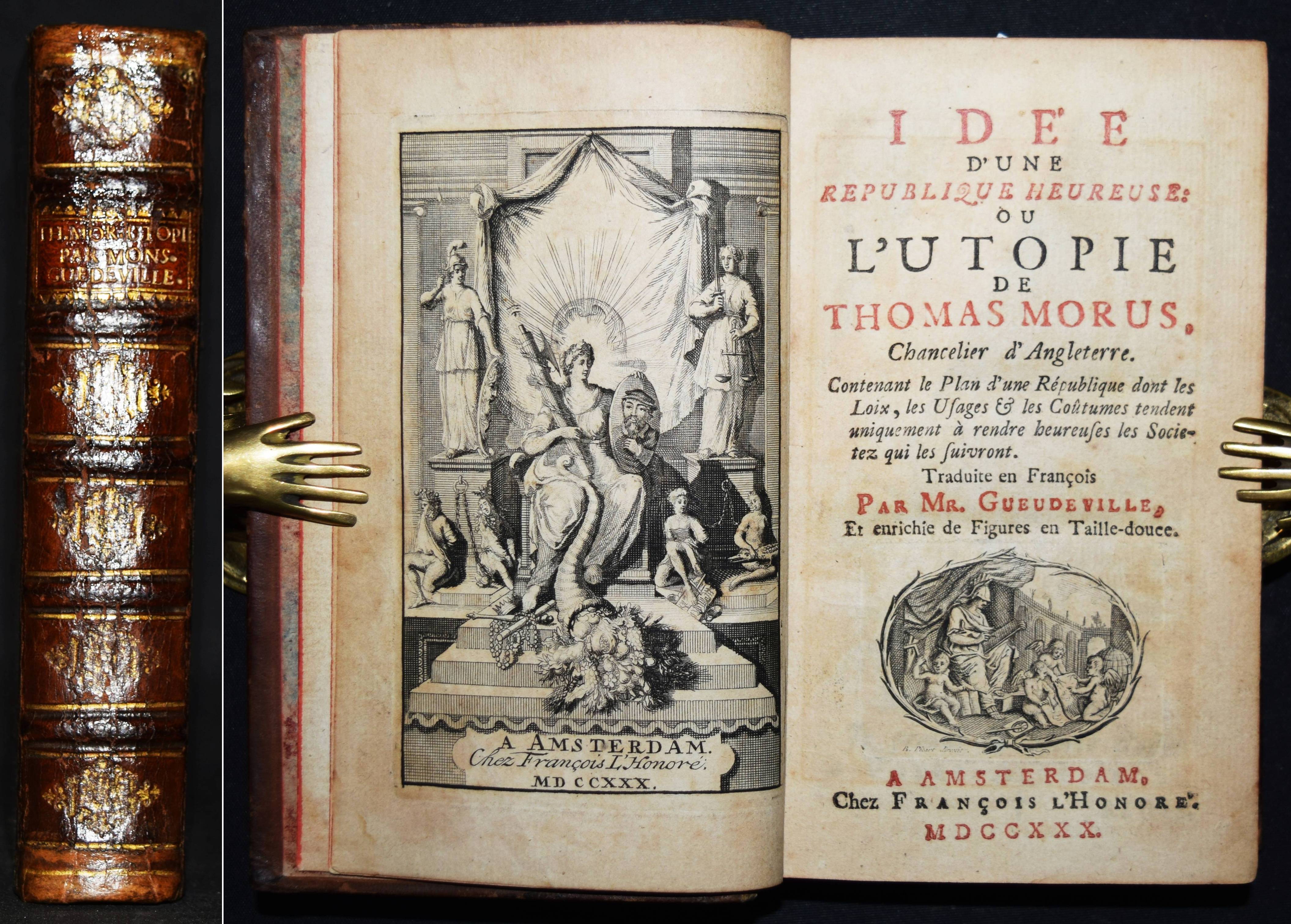 More, Thomas. Idée d’une republique heureuse: ou l’utopie de Thomas Morus, Chancelier d’Angleterre. Contenant le plan d’une république dont les loix, les usages & les coûtumes tendent uniquement à rendre heureuses les societez qui les suivront. Traduite en Francois par (Nicolas) Gueudeville et enrichie de figures en taille-douche. Amsterdam, Francois l’Honoré 1730. 8°. [4] Bl., CIV, 364 S. mit Titel in Rot und Schwarz, gestoch. Frontispiz, gestoch. Titelvignette, gestoch. Wappen und 16 Kupfertafeln von (Frans van Bleyswyck). Rotbrauner Kalbslederband der Zeit mit goldgepr. Rückenschild und dekorativer Rücken- und Deckelvergoldung. Brunet III, 1894. Cioranescu 32957. Cohen/Ricci 740. Gibson 24. Hevesi 862. Vgl. Sander 1411. – Dritte Ausgabe von Gueudevilles Übersetzung (vorher: 1715 u. 1717). – Mit schönen Illustrationen des niederl. Kupferstechers Frans van Bleyswyck (1671-1746). – Raphael Hythlodayus, der gerade von Reisen mit Amerigo Vespucci zurückgekehrt ist, erzählt von einer fernen Insel mit dem Namen Utopia. Einer Welt, wo der gesamte Besitz in gemeinschaftlichem Besitz ist, wo lediglich sechs Stunden am Tag der Arbeit gewidmet sind, wo Gold und Silber für den alltäglichen Haushalts-Gebrauch verwendet werden, und wo Sklaven (Kriminelle und Kriegsgefangene) fair behandelt werden, einer Welt, die durch das Recht geschützt ist, in Frieden zusammenzuleben. – Der berühmte von Thomas Morus (1478–1535) zuerst 1516 in Löwen veröffentlichte Roman, die Schilderung einer fernen idealen Gesellschaft, begründet das Genre der Sozialutopie. – Stellenweise gebräunt und etwas braunfleckig, schönes dekorativ gebundenes Exemplar.