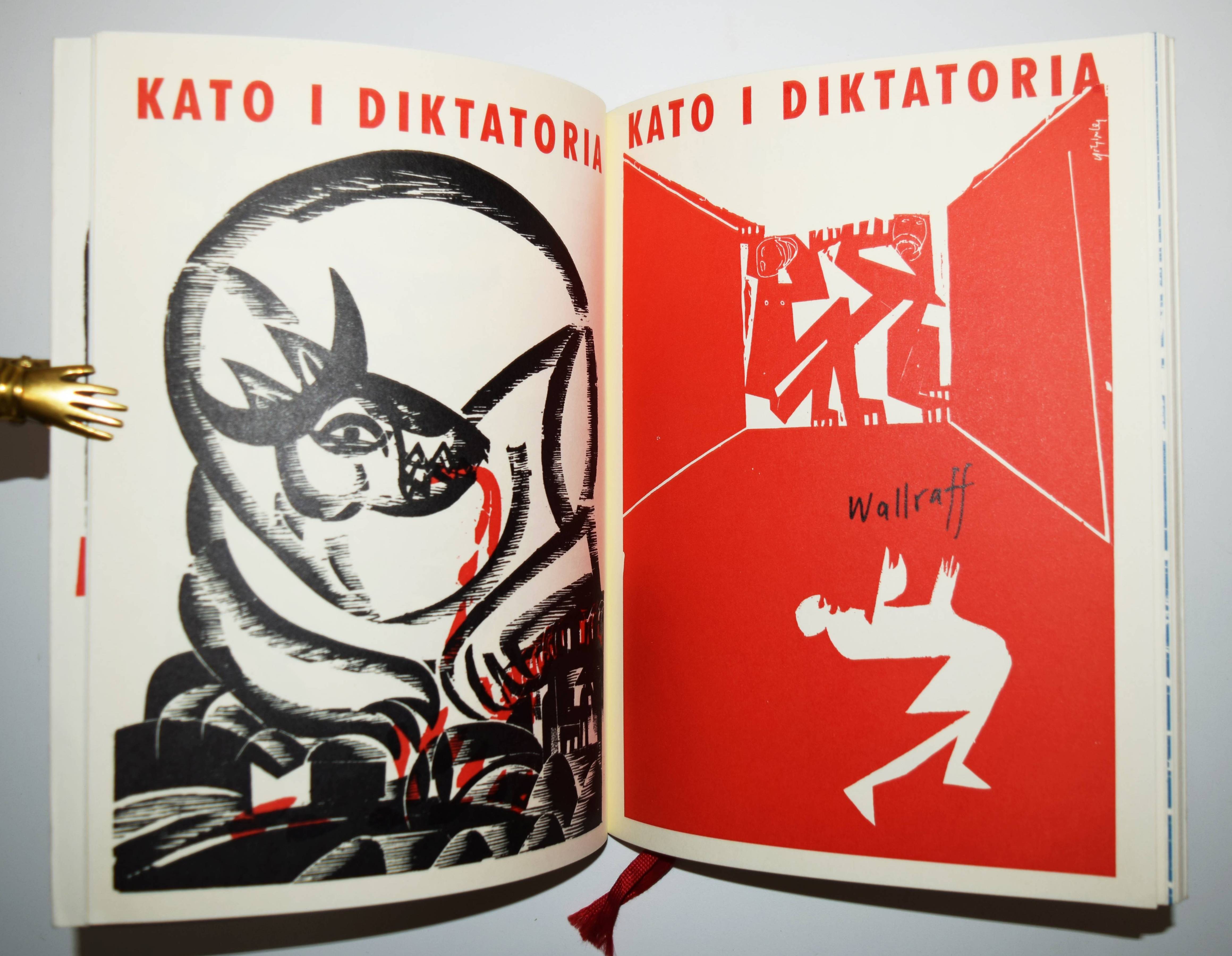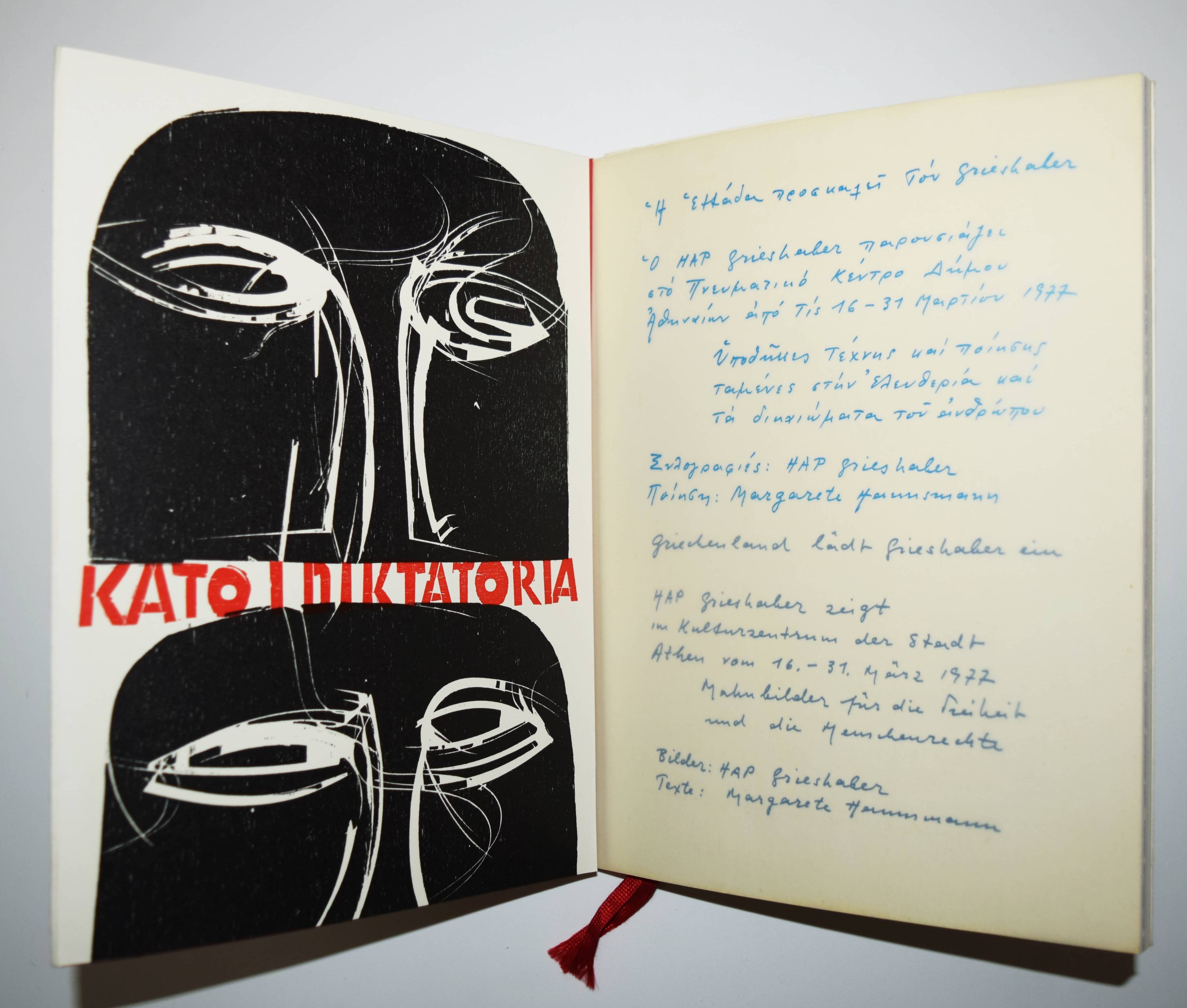 Grieshaber, H(ans) A(dreas) P(aul) und Margarete Hannsmann. Ka to i dikttoria (griechisch). Mahnbilder für die Freiheit und die Menschenrechte. Stuttgart, Galerie Valentien (1977). 4°. 86 S. mit 27 einfarbigen und 14 zweifarbigen Holzschnitten, davon wurden zwei und der Umschlag vom Stock gedruckt. Illustr. Orig.-Kartonumschlag. Eines von 2500 Exemplaren. – Sehr gutes Exemplar.