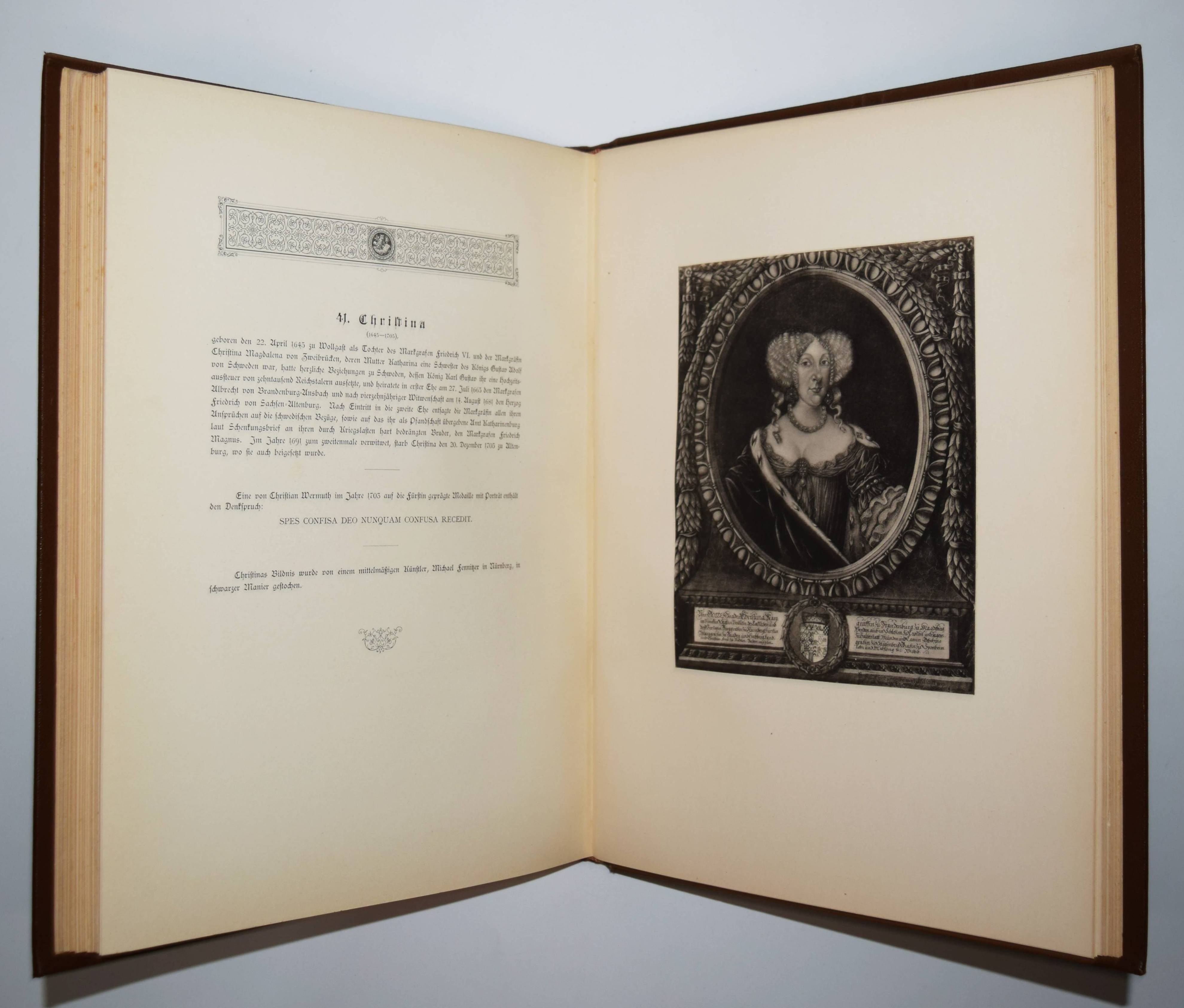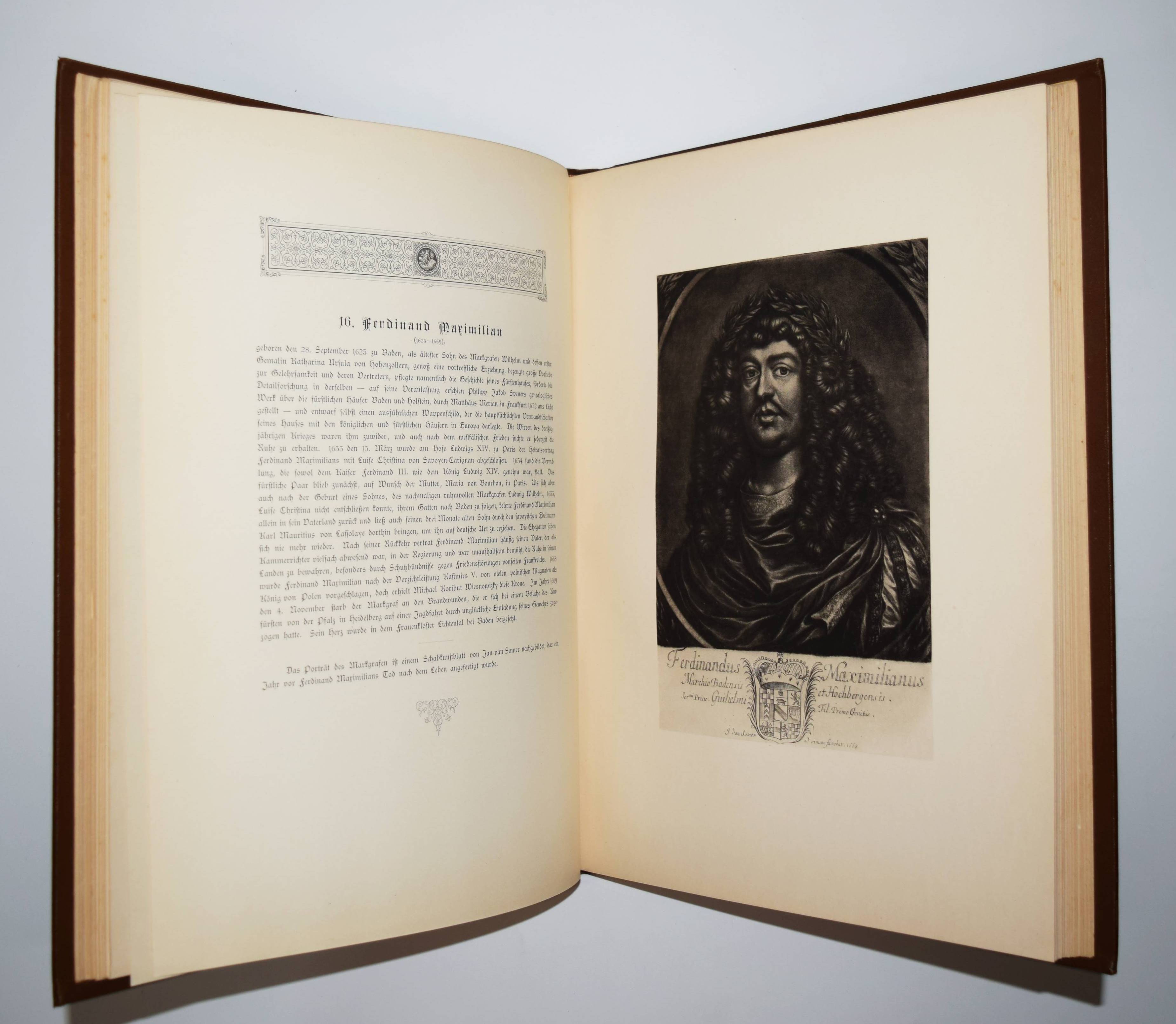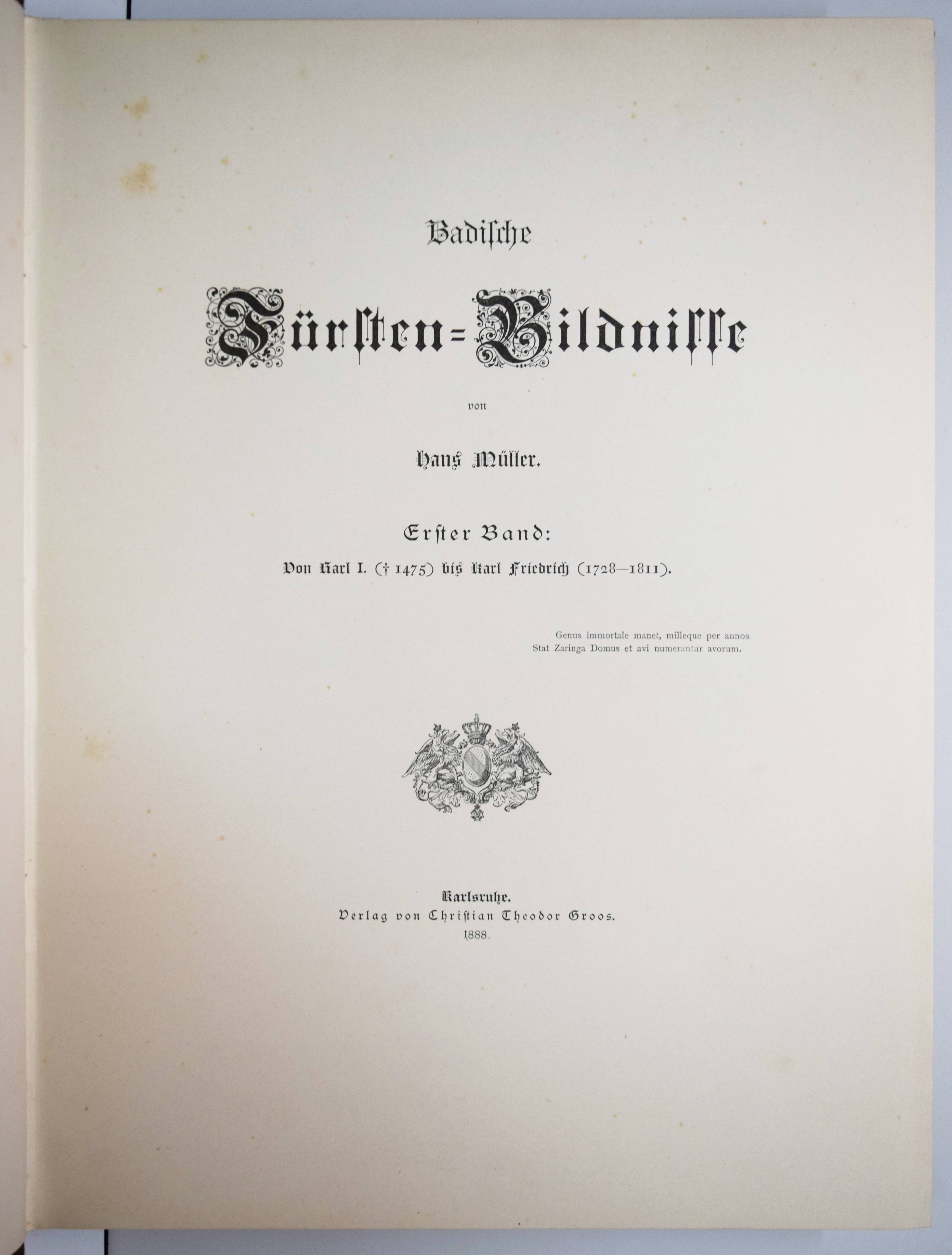 Müller, Hans (Emil Felix). Badische Fürsten-Bildnisse. I. Von Karl I. (gest. 1475) bis Karl Friedrich (1728-1811). – II. Von Markgraf Friedrich (1756-1817) bis zur Gegenwart. 2 Bände. Karlsruhe, Christian Theodor Groos 1888-1893. Folio (37 x 28 cm.). 28 S., [54] Bl.; 46 S., [32] Bl., XXI S. mit zus. 86 Lichdruck-Tafeln. Orig.-Leinenbände. Einzige Ausgabe des schön ausgestatteten Werks. – Der Musikwissenschaftler und Schriftsteller H. E. F. Müller (1854-1897), Sohn des Dichters und Arztes Wolfgang Müller von Königswinter, war seit 1885 Bibliothekar an der Badischen Landesbibliothek in Karlsruhe und wechselte noch im selben Jahre an die Musikabteilung der Königlichen Bibliothek in Berlin. Am 1. Oktober 1893 wurde er als Nachfolger von Robert Dohme Erster ständiger Sekretär der Berliner Akademie der Künste. – Sehr gutes Exemplar.