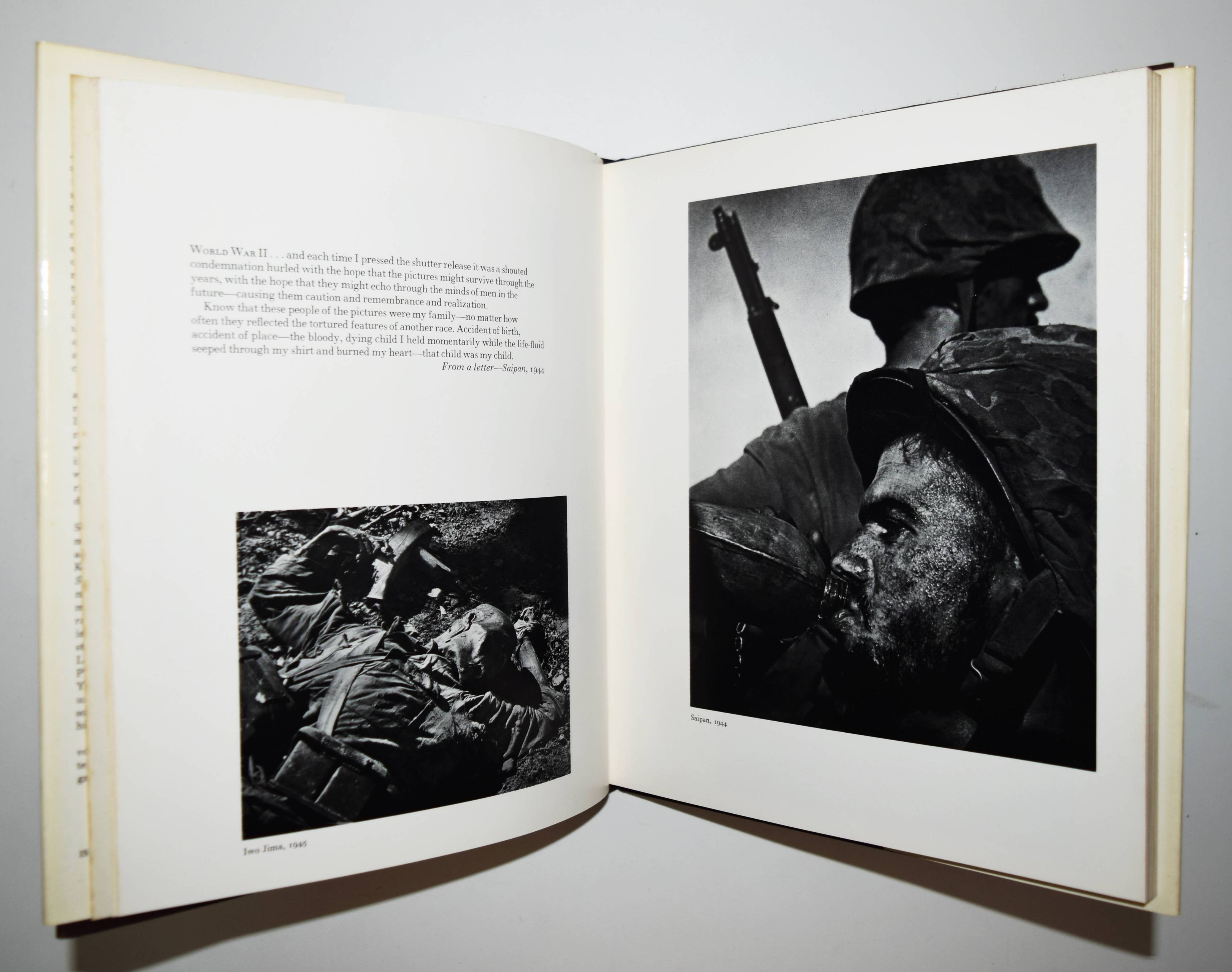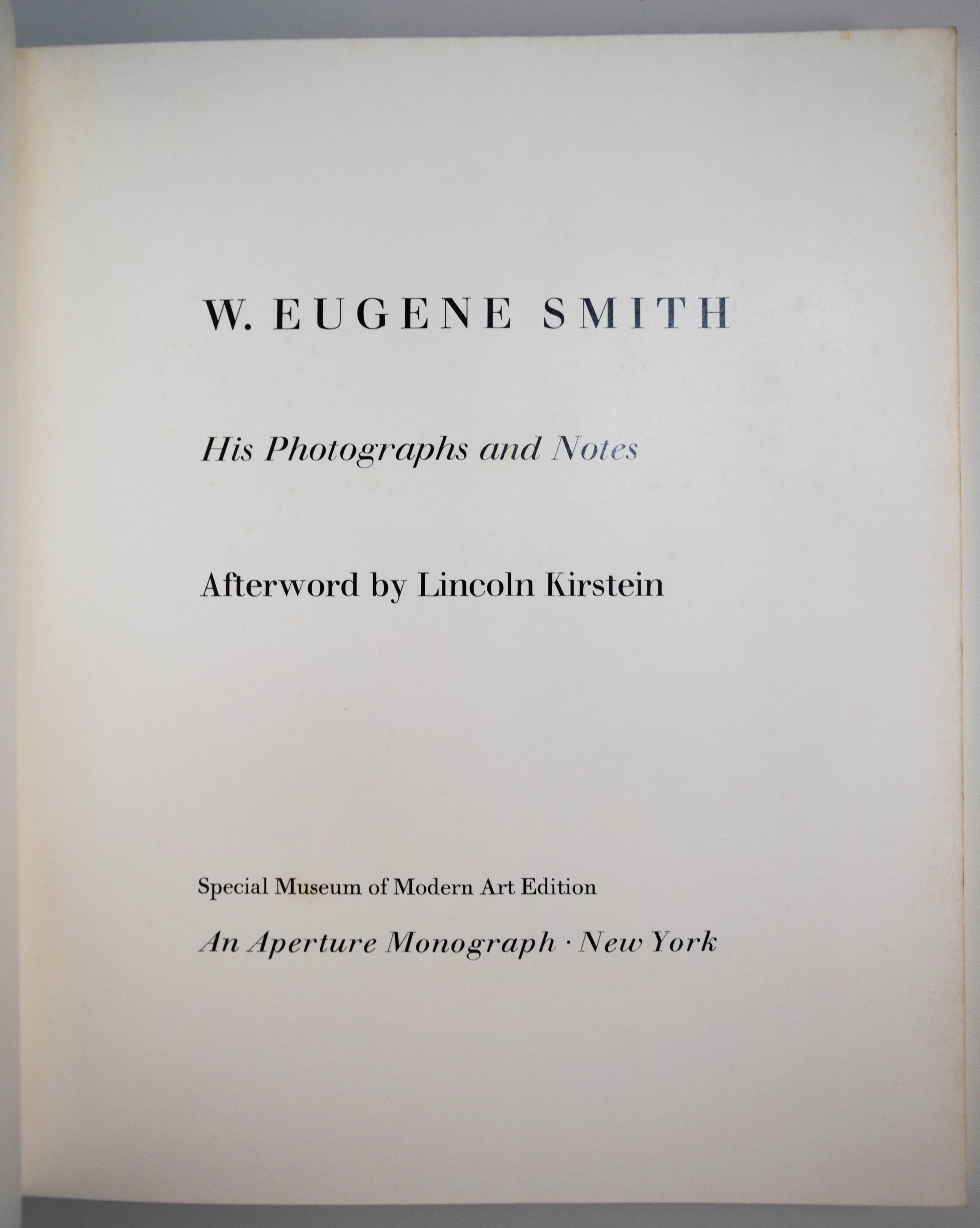 Smith, W(illiam) Eugene. His photographs and notes. Afterword by by Lincoln Kirstein. (Editor: Minor White). Special Museum of Modern Art Edition. Second printing. New York, Aperture (1973). 4° (24,5 x 21 cm.). [74] Bl. mit ca. 50 Duotone-Tafeln. Orig.-Leinenband mit illustr. Schutzumschlag. (An Aperture Monograph, Vol. 14, Nr. 3 and 4). Koetzle, Fotografen A-Z 374. – Zweiter Druck und erste gebundene Ausgabe der ersten Monographie der „Fotografenlegende der 1940er und 1950er Jahre“ (H.-M. Koetzle). – „Während seiner gesamten Karriere stand alles, was Smith produzierte, unter dem Vorzeichen der Veröffentlichung. Kein einziges Bild wurde aufgenommen oder ausgewählt, ohne dass der Fotograf ein bestimmtes Buch oder Magazin im Kopf gehabt hätte. Von seinen ersten Fotoreportagen für die Zeitschrift News-Week, für die er ab 1937 arbeitete (kurz vor ihrer Umbenennung in Newsweek), bis „Minamata“; (1972) – alle Bilder von Smith wurden narrativ in einen strukturierten Rahmen eingebettet, auf eine fortlaufende Weise, die bis dato für Pressefotografen keine Option gewesen war; dies gilt gleichermaßen für seine gelungene Serie von Fotoessays für Life zwischen 1948 und 1954 sowie für das Essay über Pittsburgh und das endlose (und unvollendete) autobiografische Fotografieprojekt „The Walk to Paradise Garden“.“ (Gilles Mora in Koetzle). – Sehr gutes Exemplar der seltenen gebundenen Ausgabe.