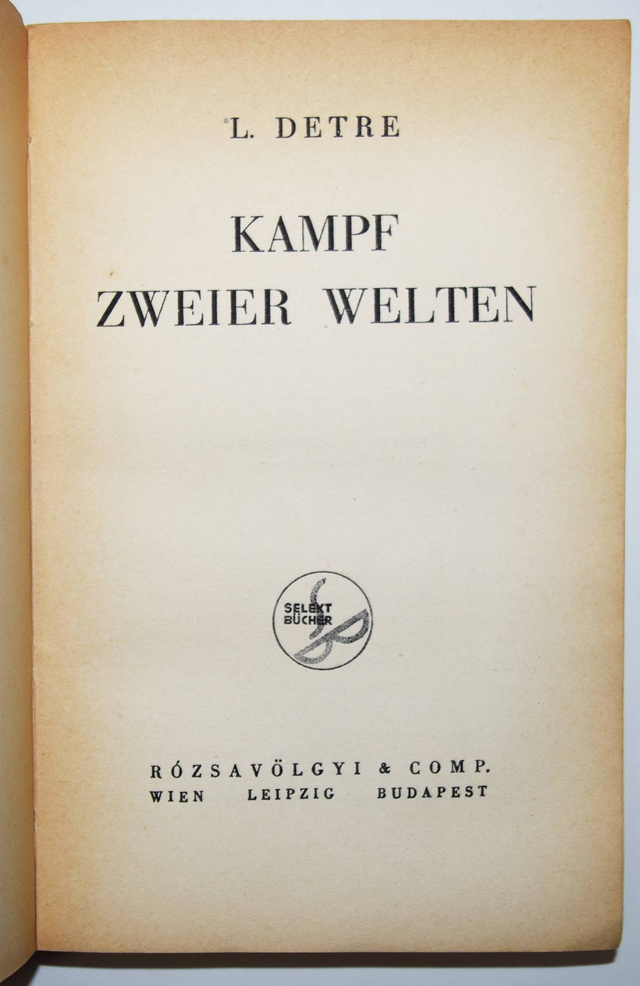 Detre, L(ászló). Kampf zweier Welten. (Ein fantastischer Roman sondergleichen. Aus dem Ungarischen übersetzt von ‚Két Világ Harca: Fantasztikus Regény‘). Wien, Leipzig, Budapest, Rózsavölgyi & Comp. 1935. 8°. 278 S. Orig.-Kartonumschlag mit farbig illustr. Schutzumschlag (von Madaras). (Selekt Bücher). Bloch² 724. Negley, Utopian Literature 278. – Erste deutsche Ausgabe. – „Intelligente Ameisen bedrohen die reglementierte und wissenschaftliche Welt des Jahres 2000.“ (Clarke, Tale of the Future S. 69). – Die Ameisen und ihre Verbündeten, die Termiten, sind keine Superinsekten mit fortschrittlichen Waffen oder überlegener Technologie. Sie sind normale (aber intelligente) Insekten, die sich zusammenschließen, um die totale Vorherrschaft der Menschheit über den Planeten zu beenden, die (als der Krieg beginnt) zur Vernichtung fast allen tierischen Lebensauf der Er de geführt hat. Die Insekten entwickeln eine wirksame Methode, um alleangebauten Nahrungspflanzen der Erde zu vernichten. Sie fordern die Hälfte der Erdoberfläche im Austausch für eine friedliche Koexistenz von Mensch und Insekt. Der Krieg en det, als die Insekten ihren Standpunkt klargemacht haben und sich mit einem Fünftel des Landes > zufrieden geben. Im Grunde eine Antikriegsliteratur. Der Roman erschien 1936 auch auf Englisch unter dem Titel „War of two worlds“. – Der ungarische Mikrobiologe L. Detre (1874-1939), Gründer und erste Direktor des Ungarischen Seruminstituts in Budapest, prägte den Begriff „Antigen“ in einem 1903 gemeinsam mit dem russischen Biologen Élie Metchnikoff verfassten französischsprachigen Artikel (in dem er sich auf „Substances Immunogens ou Antigens“ bezieht), obwohl das Wort und das Konzept in seiner Forschung bereits 1899 auftauchen. Er ist auch Mitentdecker der Wassermann-Reaktion und veröffentlichte seine Entdeckung beim Menschen nur zwei Wochen, nachdem Wassermann seine Ergebnisse bei Affen dokumentiert hatte. – Umschlag altersbedingt gebräunt, sehr gutes Exemplar.