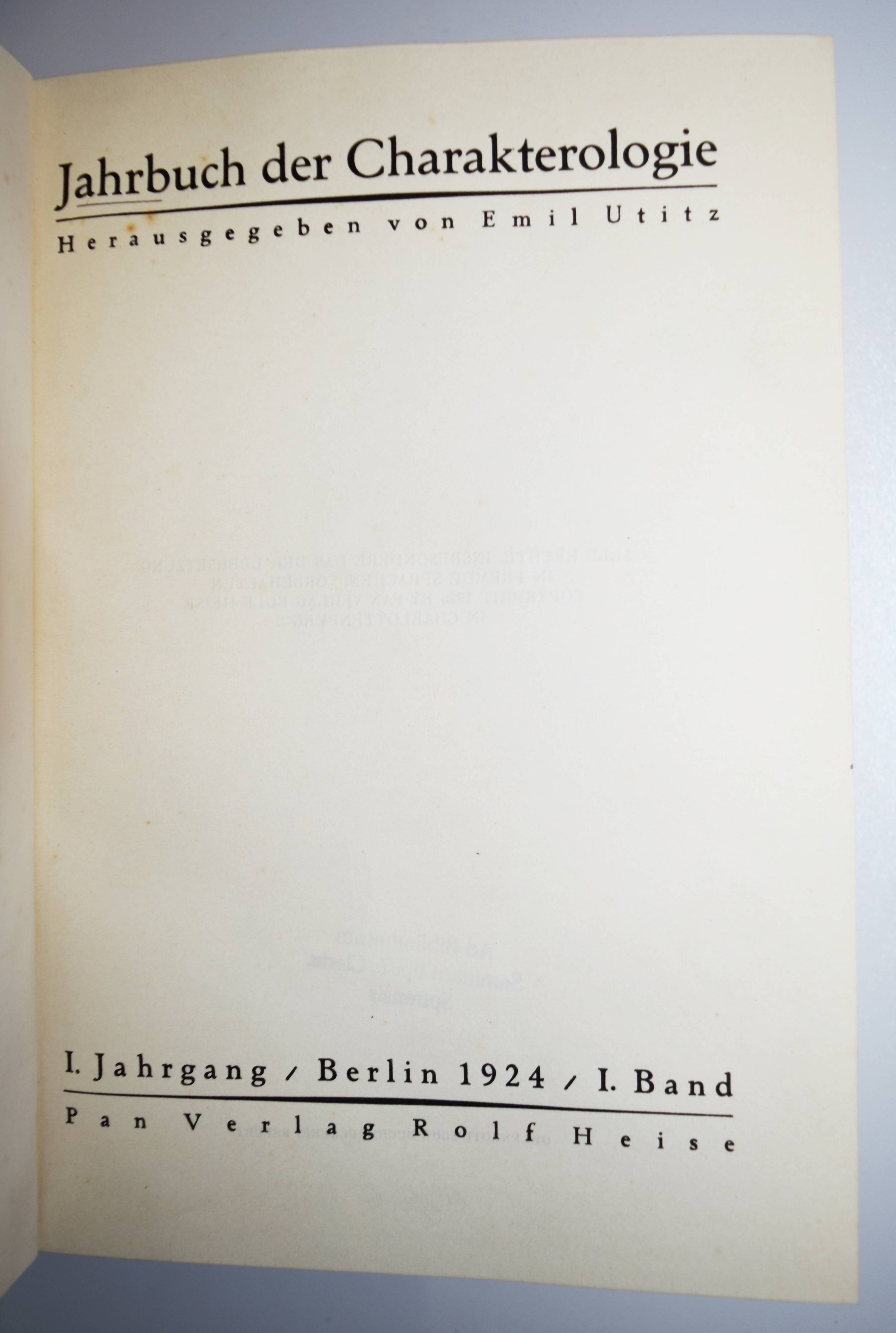 Utitz, Emil (Hrsg.). Jahrbuch der Charakterologie. I.-VI. Jahrgang (alles erschienene). 5 Bände. Berlin, Pan-Verlag Rolf Heise 1924-29. Gr.-8°. Mit zahlr. Abb. auf Tafeln. Orig.-Leinenbände. Ziegenfuß, II, 765. – Vollständige Reihe. – Mit Beiträgen u.a. von L. Klages, R. Heindl, R. Allers, L. Marcuse, A. Lipschütz, R. Müller-Freienfels, R. Fick, St. Zweig, M. Löwy. – Einände etwas berieben und fleckig, Stempel auf den Vorsätzen, Band II/III mit etwas abweichenden Verlagseinband, sonst gut erhalten.