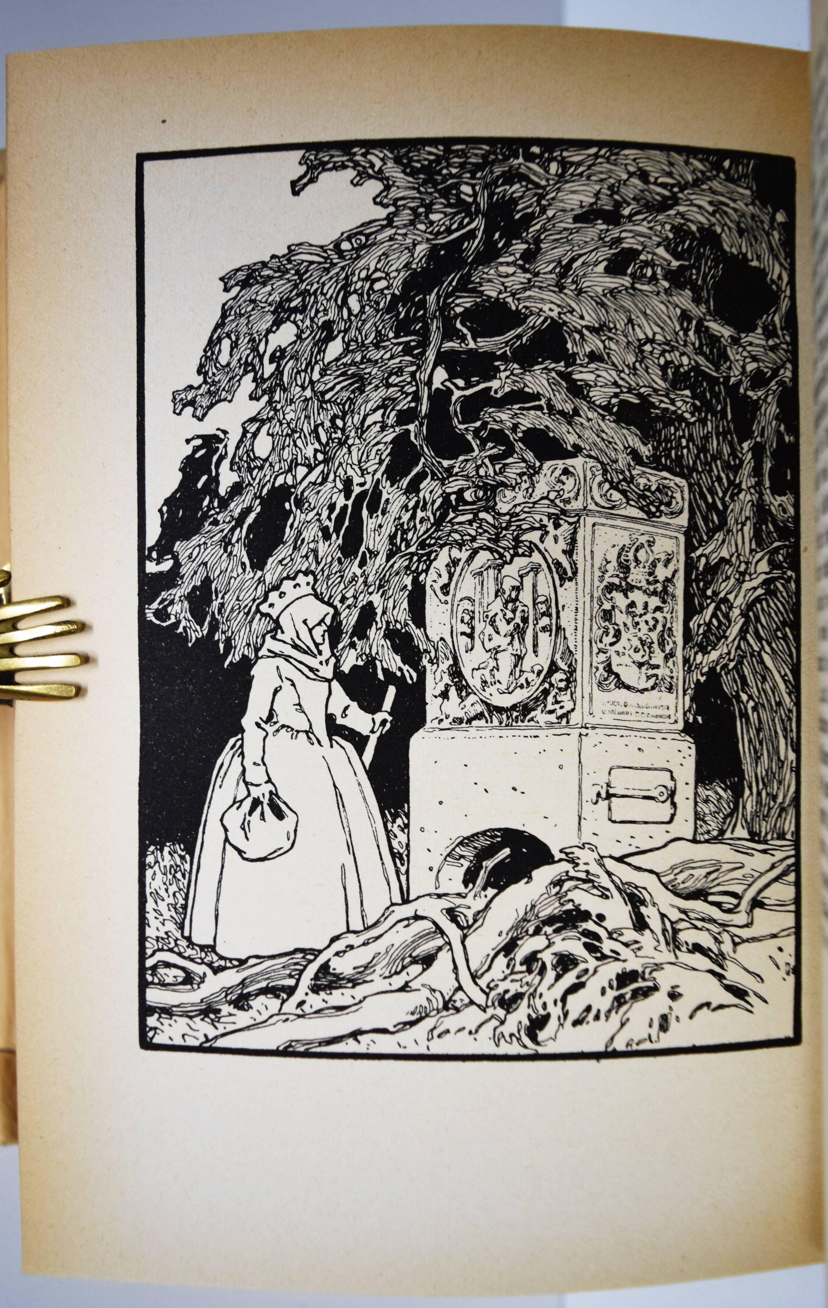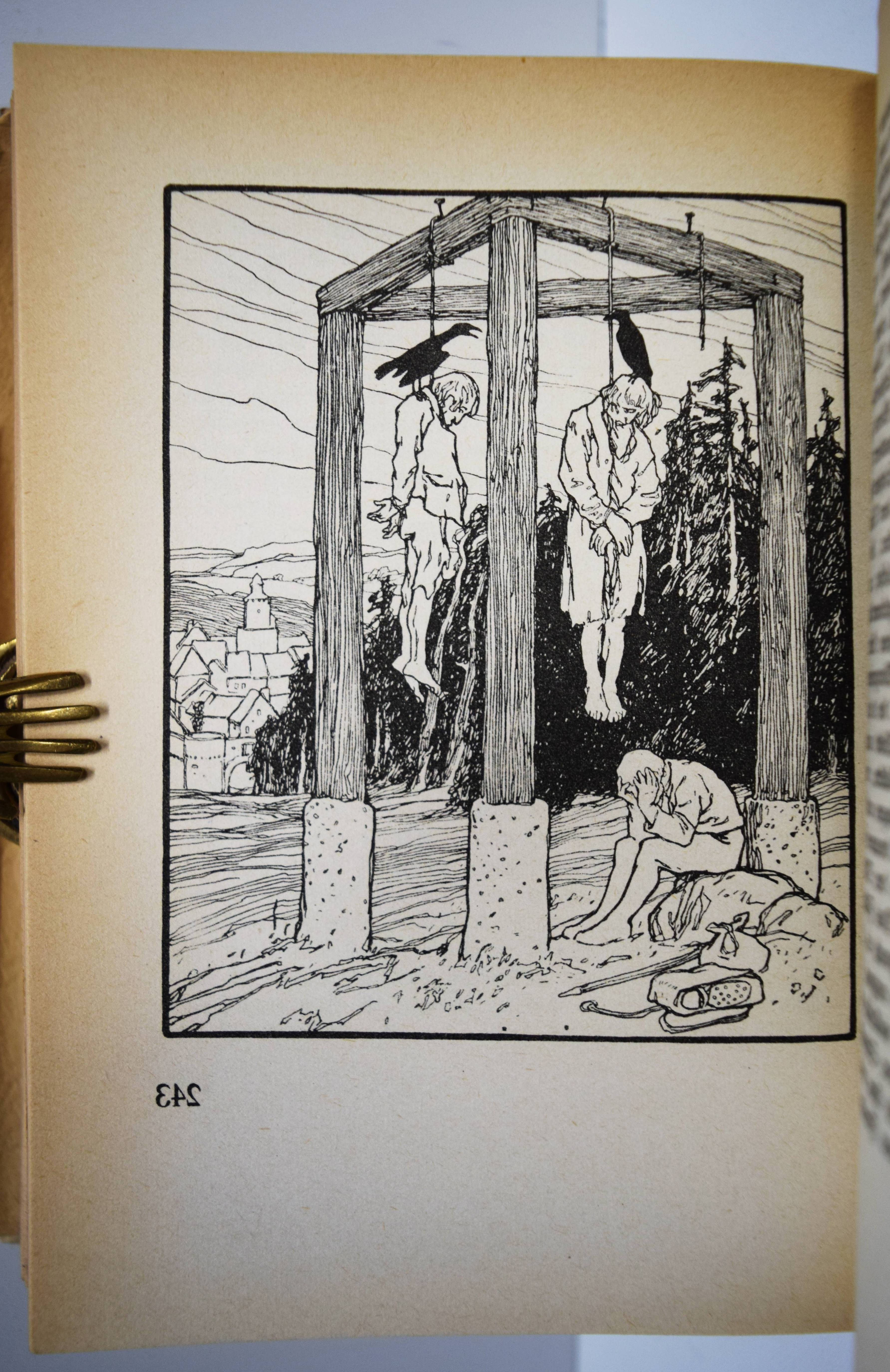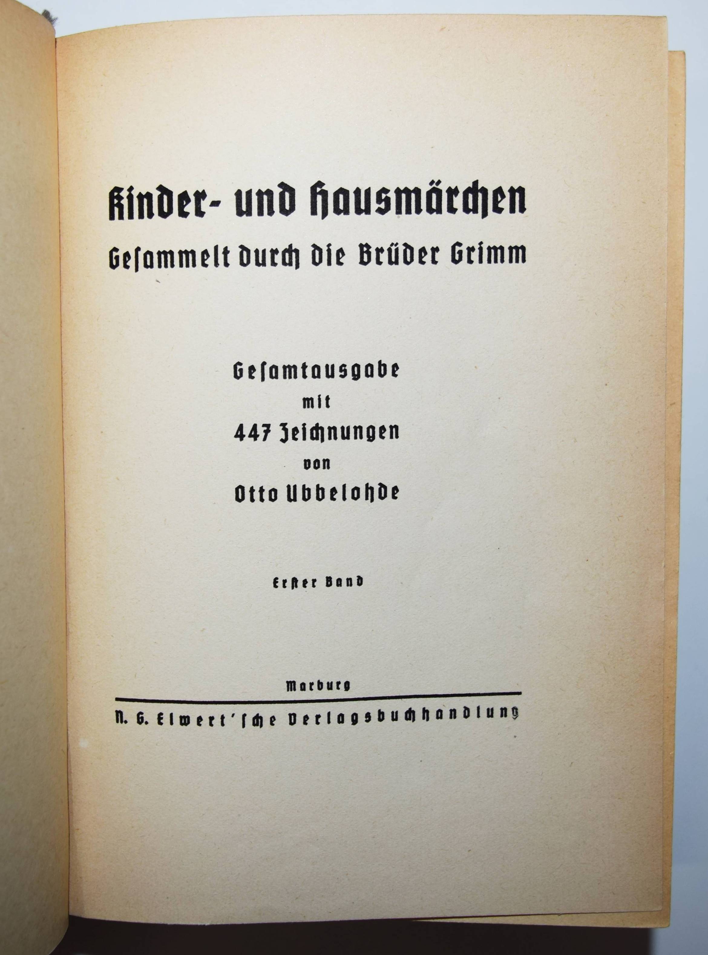 Grimm, (Jakob u. Wilhelm). Kinder- und Hausmärchen. Gesammelt durch die Brüder Grimm. Gesamtausgabe mit 446 Zeichnungen von Otto Ubbelohde. 6. Aufl. (61.-80. Tsd.). 3 Teile in 1 Band. Marburg, N. G. Elwert (1941). 8°. VI, 368 S.; [1] Bl., 380 S.; [1] Bl., 328 S. mit 446 Illustrationen. Illustr. Orig.-Halbleinenband mit illustr. Schutzumschlag. Vgl. Bang S. 99, 141 u. Abb. 230, 231. Bilderwelt 1657. Doderer-Müller S. 261 f. Köster S. 59. LKJ IV,525. Oldenburg, Künstler 14 (mit Abb.). Seebaß II,685. – Erschien zur Erinnerung an den 150. Geburtstag der Brüder Grimm (1935/36). – Otto Ubbelohde (1807-1922) ist der bedeutendste Vertreter der Heimatkunst in der Illustration. „Die strengen, im Formbestand noch dem Jugendstil verhafteten Zeichnungen Ubbelohdes werden in der Fachliteratur oft als adäquateste bildnerische Umsetzung der Kinder- und Hausmärchen bezeichnet. In der Tat hat Ubbelohde als Marburger Künstler, der vor allem umfangreiche Landschafts- und Städtebilder schuf, das Lokalkolorit des hessischen Raumes, in dem die Brüder Grimm lebten und sammelten, in seine Bilder zitathaft einfließen lassen…“ (J. Thiele in Oldenburg, Künstler). – Schutzumschlag gebräunt und mit Randläsuren, sonst nur wie immer papierbedingt gebräunt, gutes Exemplar.