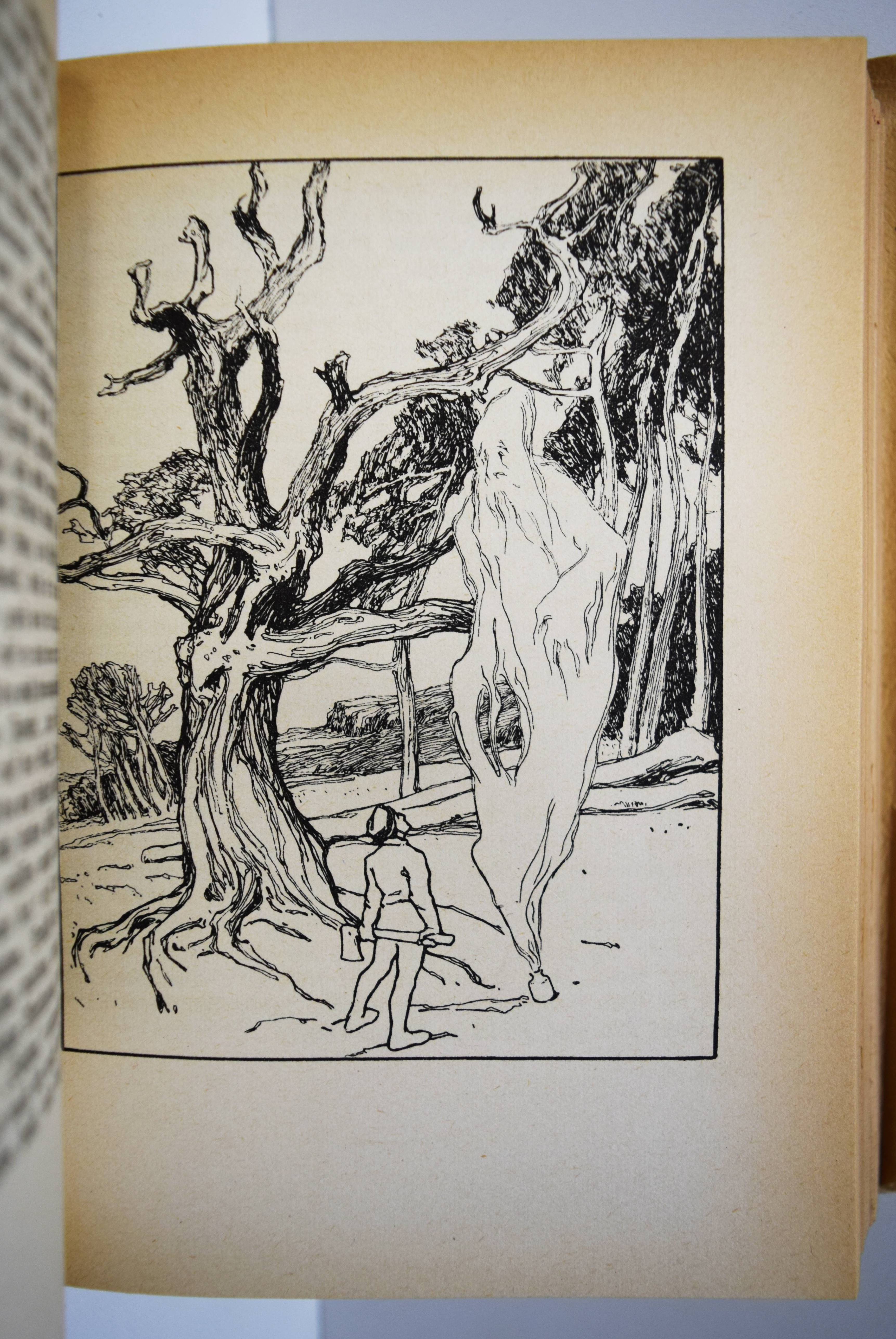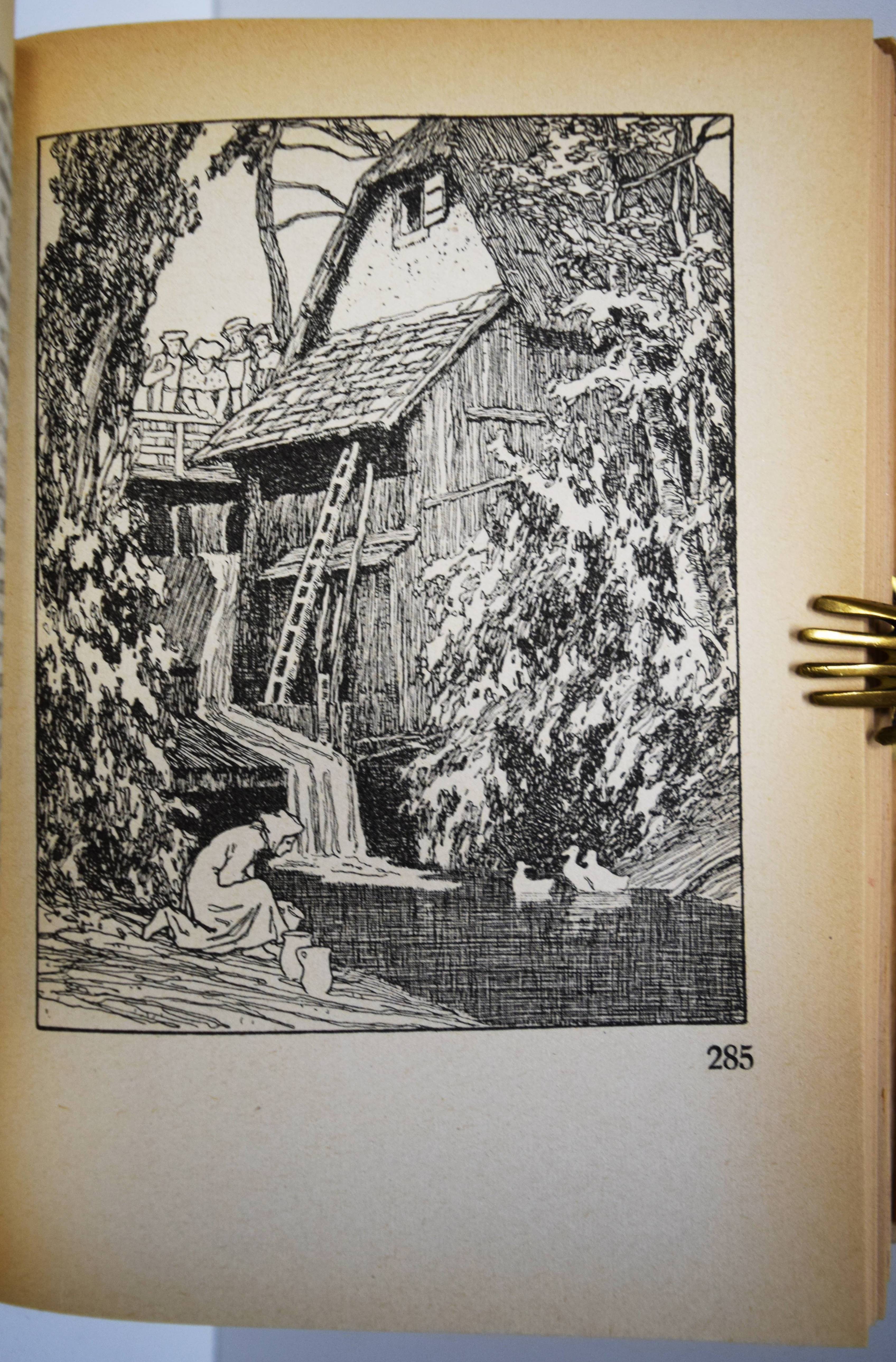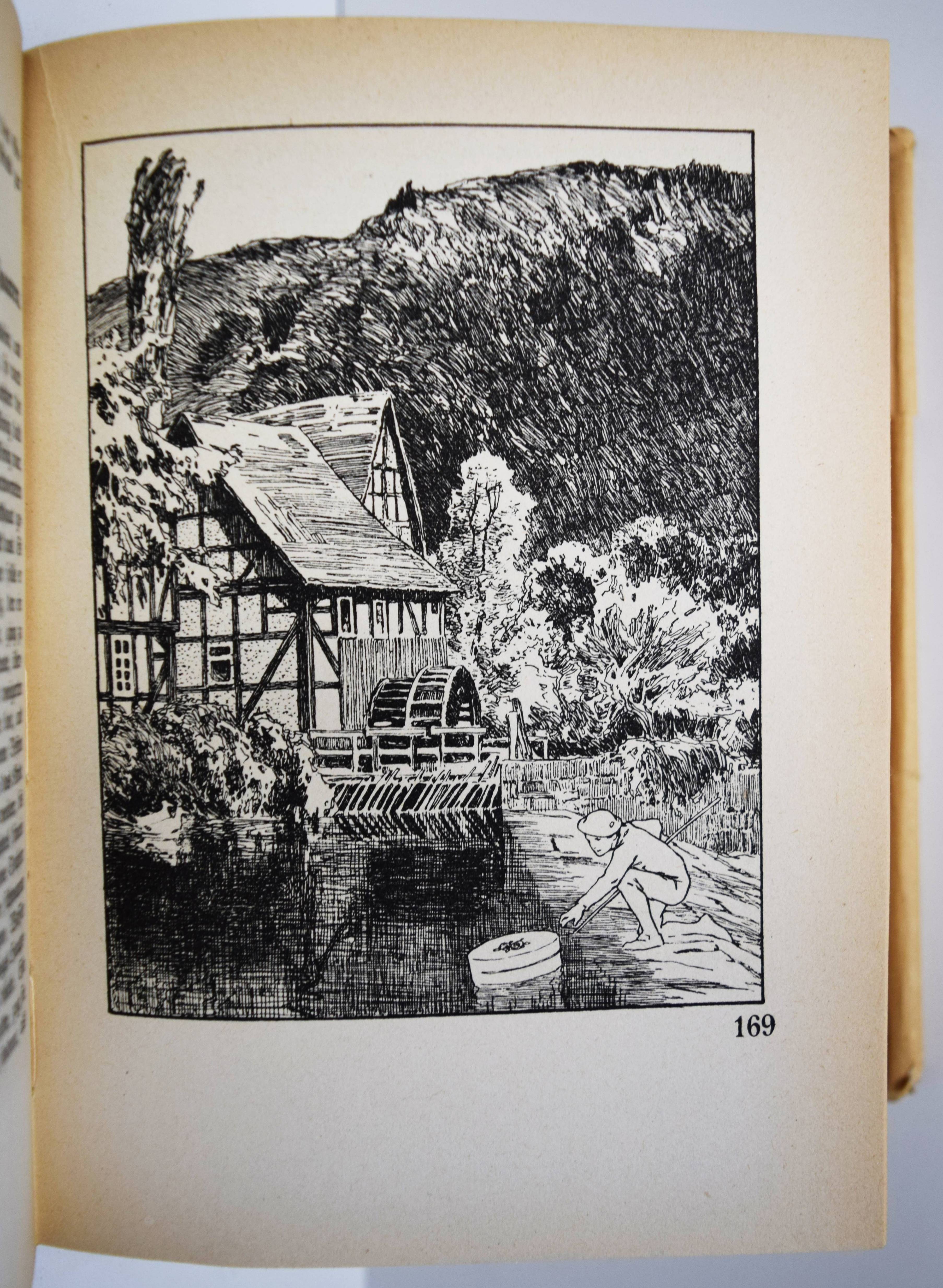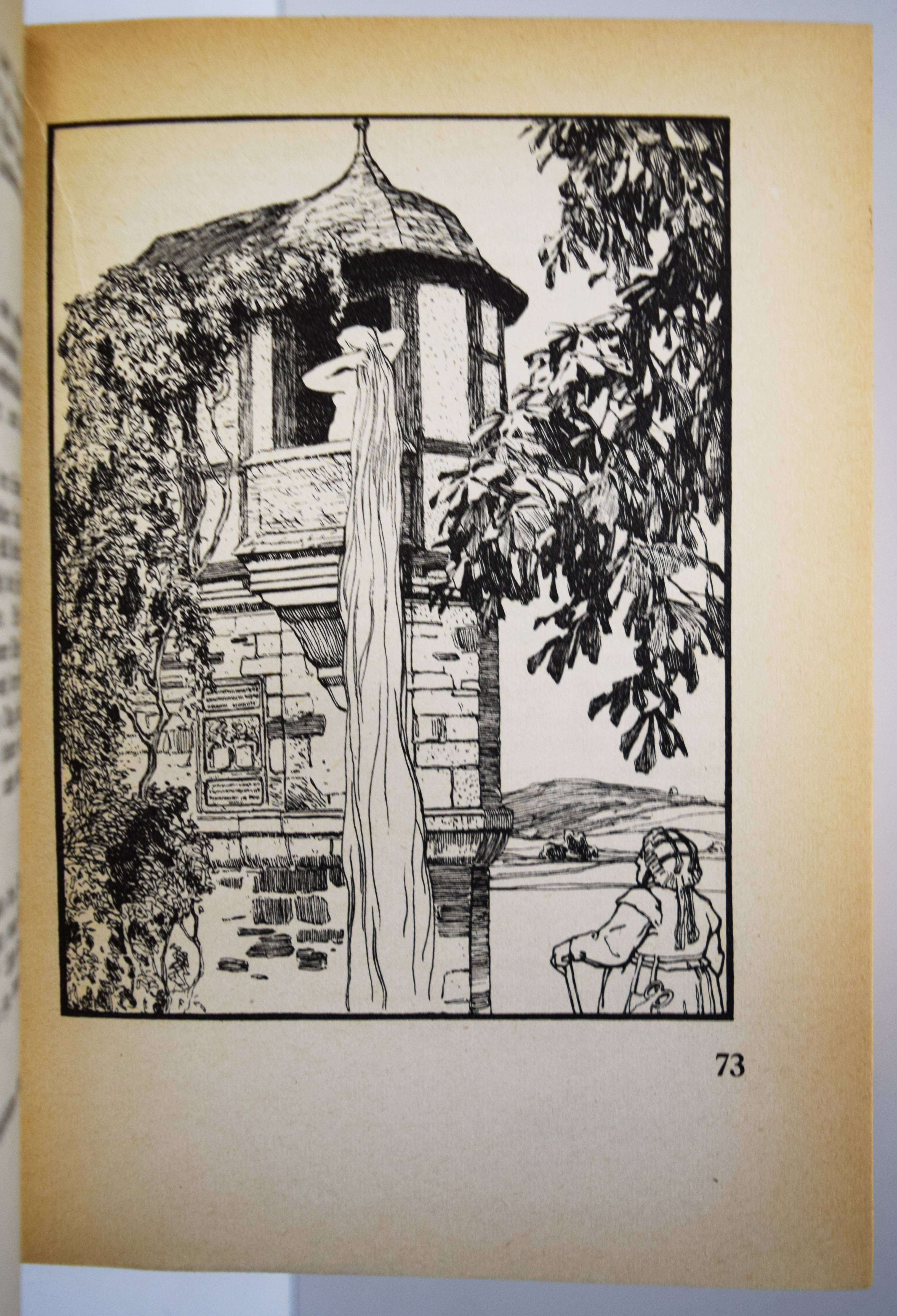 Grimm, (Jakob u. Wilhelm). Kinder- und Hausmärchen. Gesammelt durch die Brüder Grimm. Gesamtausgabe mit 446 Zeichnungen von Otto Ubbelohde. 6. Aufl. (61.-80. Tsd.). 3 Teile in 1 Band. Marburg, N. G. Elwert (1941). 8°. VI, 368 S.; [1] Bl., 380 S.; [1] Bl., 328 S. mit 446 Illustrationen. Illustr. Orig.-Halbleinenband mit illustr. Schutzumschlag. Vgl. Bang S. 99, 141 u. Abb. 230, 231. Bilderwelt 1657. Doderer-Müller S. 261 f. Köster S. 59. LKJ IV,525. Oldenburg, Künstler 14 (mit Abb.). Seebaß II,685. – Erschien zur Erinnerung an den 150. Geburtstag der Brüder Grimm (1935/36). – Otto Ubbelohde (1807-1922) ist der bedeutendste Vertreter der Heimatkunst in der Illustration. „Die strengen, im Formbestand noch dem Jugendstil verhafteten Zeichnungen Ubbelohdes werden in der Fachliteratur oft als adäquateste bildnerische Umsetzung der Kinder- und Hausmärchen bezeichnet. In der Tat hat Ubbelohde als Marburger Künstler, der vor allem umfangreiche Landschafts- und Städtebilder schuf, das Lokalkolorit des hessischen Raumes, in dem die Brüder Grimm lebten und sammelten, in seine Bilder zitathaft einfließen lassen…“ (J. Thiele in Oldenburg, Künstler). – Schutzumschlag gebräunt und mit Randläsuren, sonst nur wie immer papierbedingt gebräunt, gutes Exemplar.